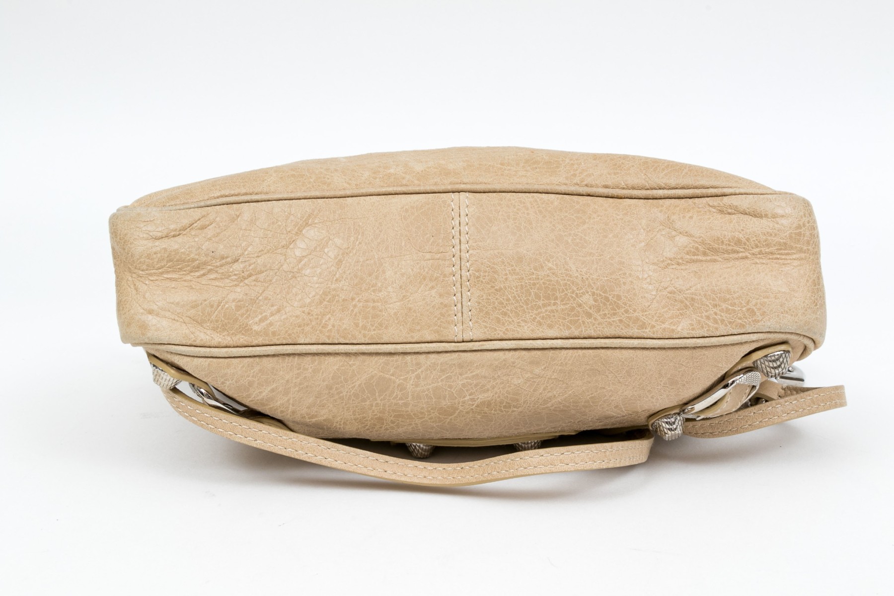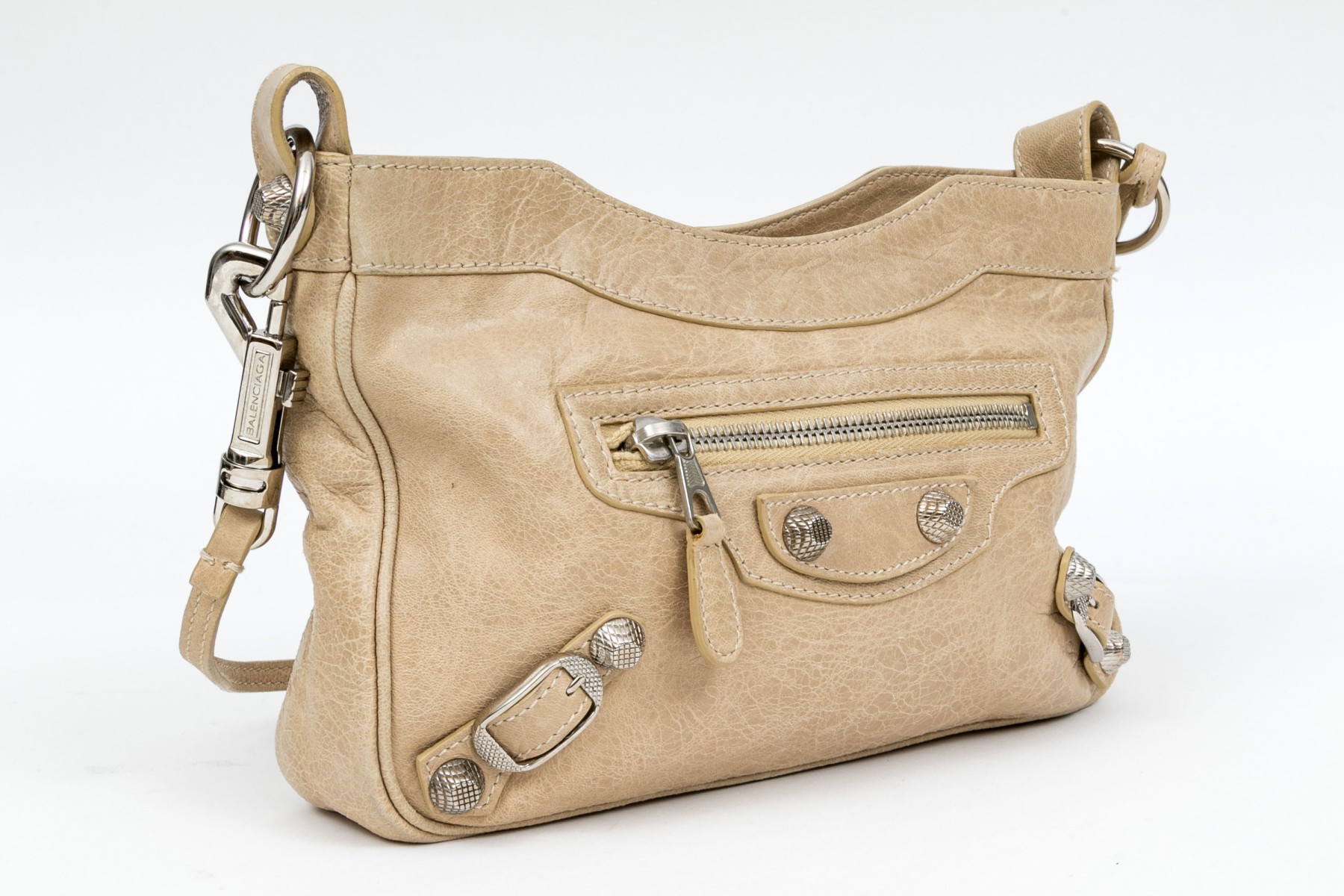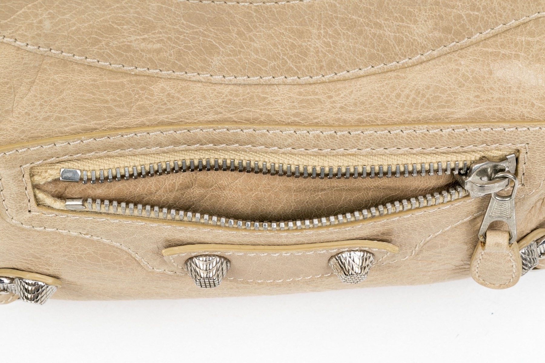 Balenciaga striking tan leather baguette top zip shoulder bag, studded accents