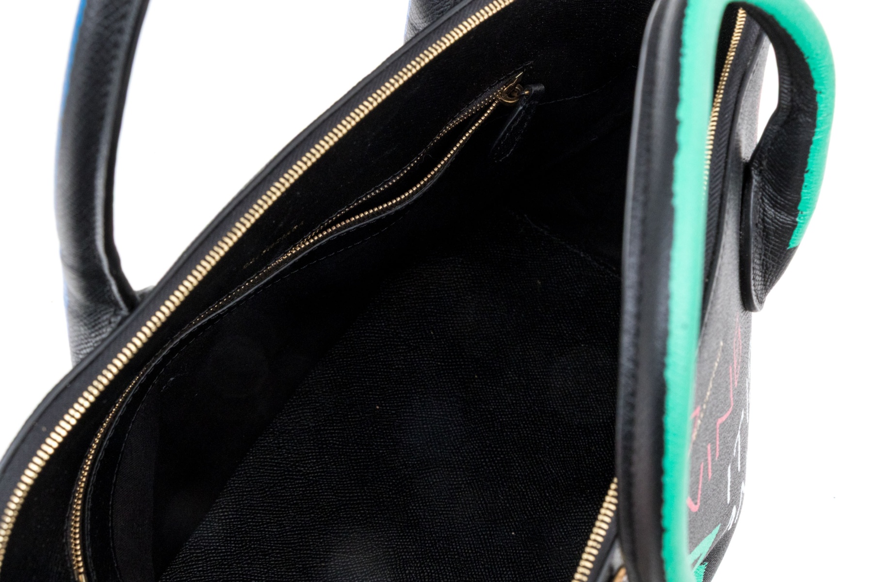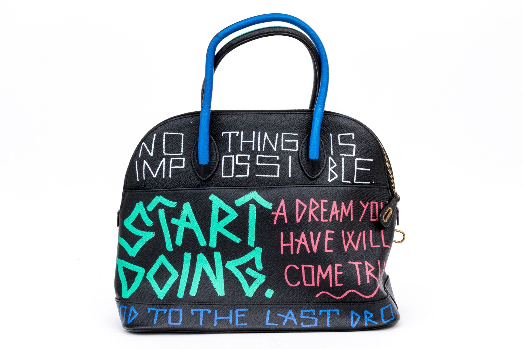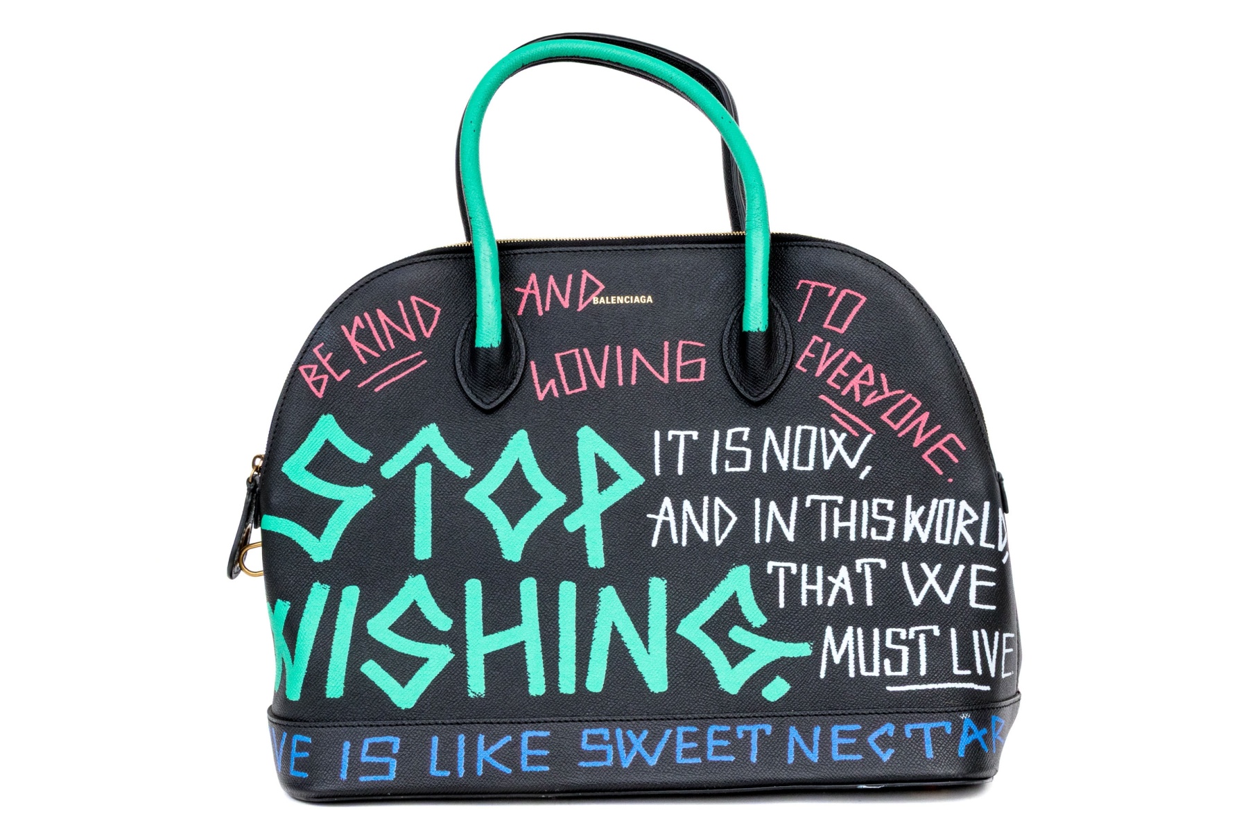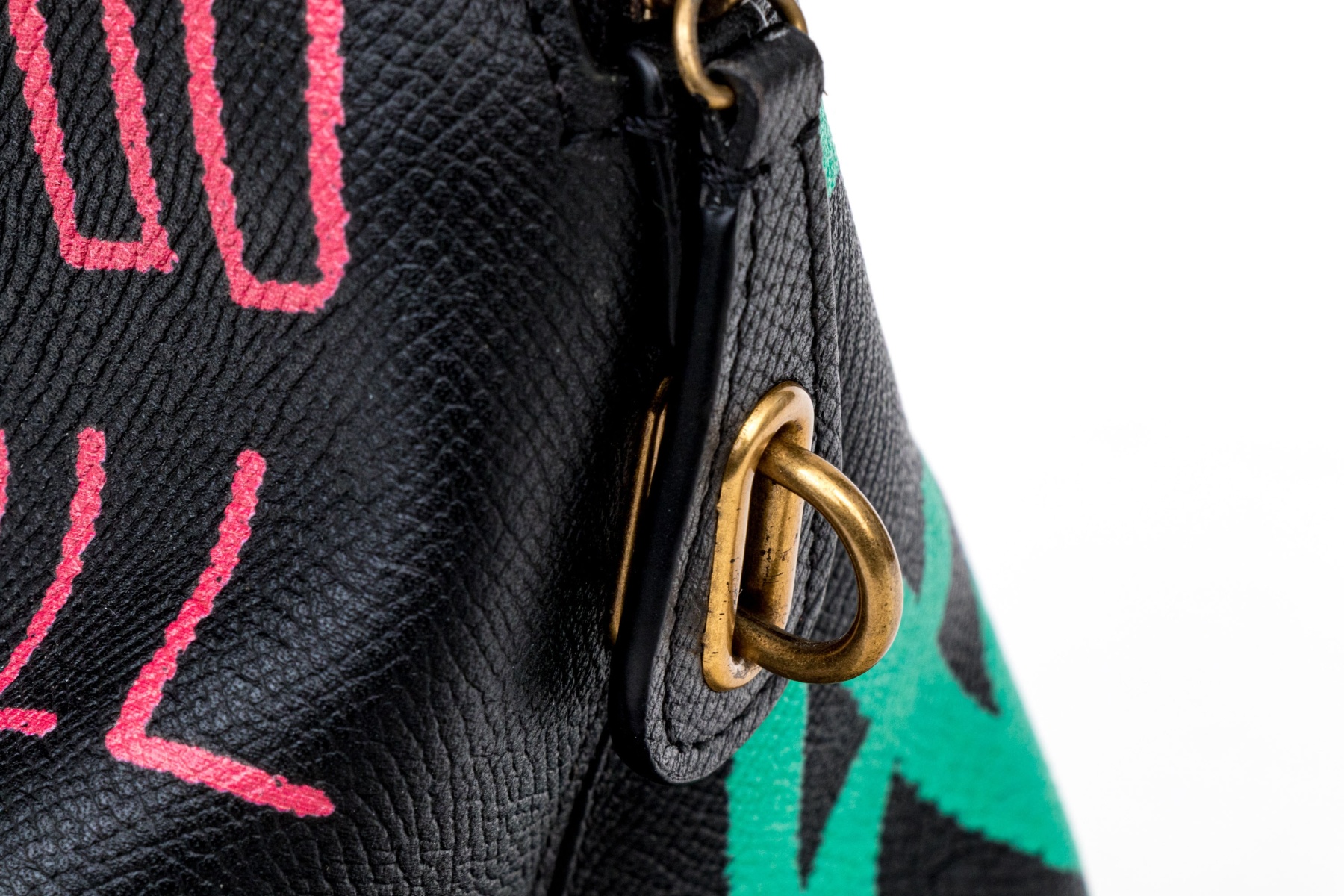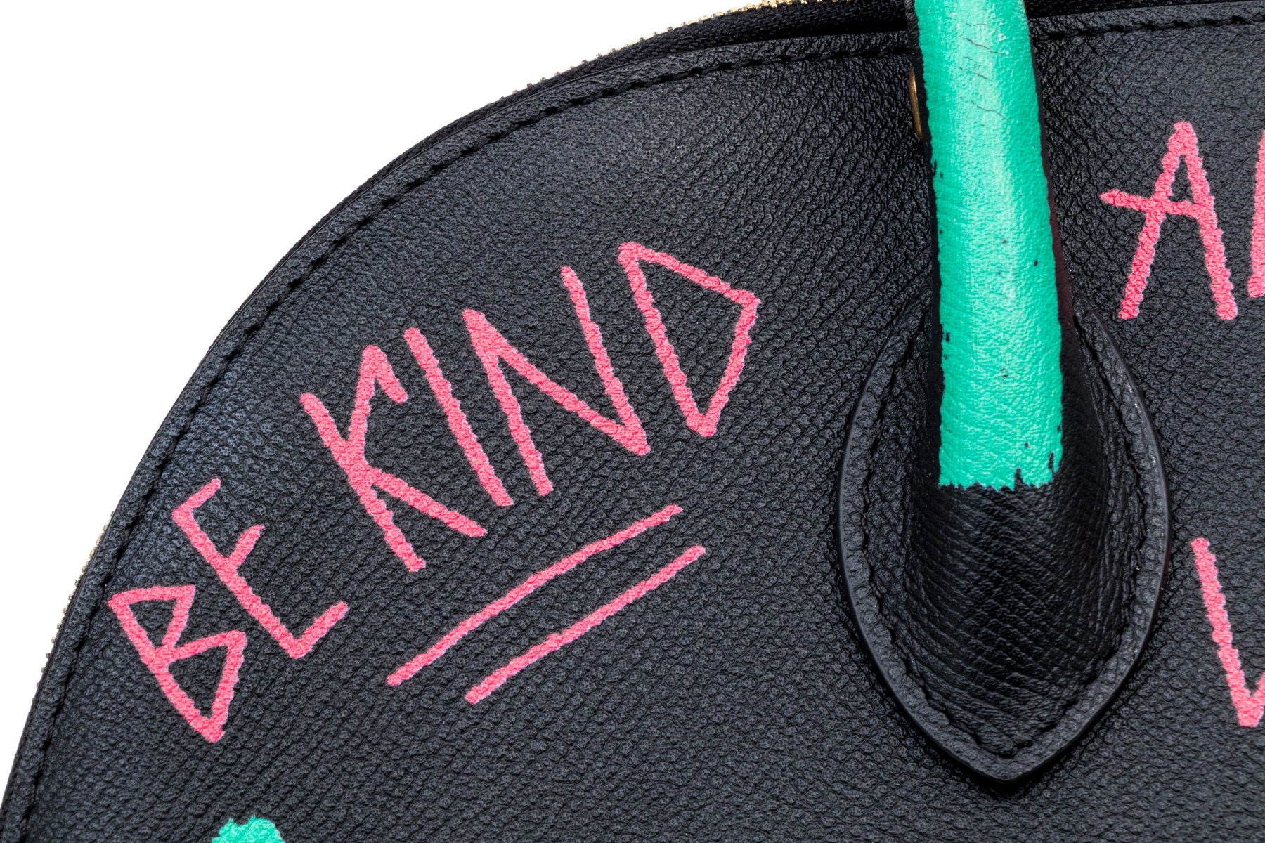 This unique bag features a domed style zip top, and features a leather body, with green, blue, red and white graffiti style decoration.