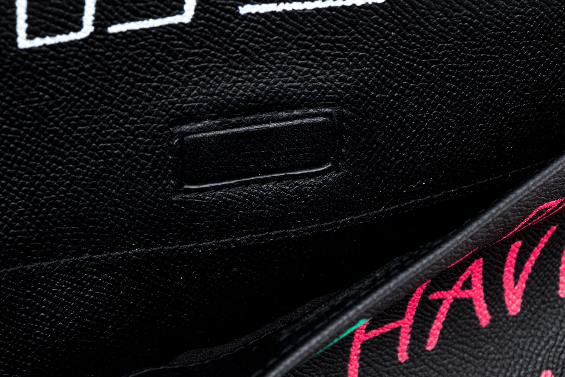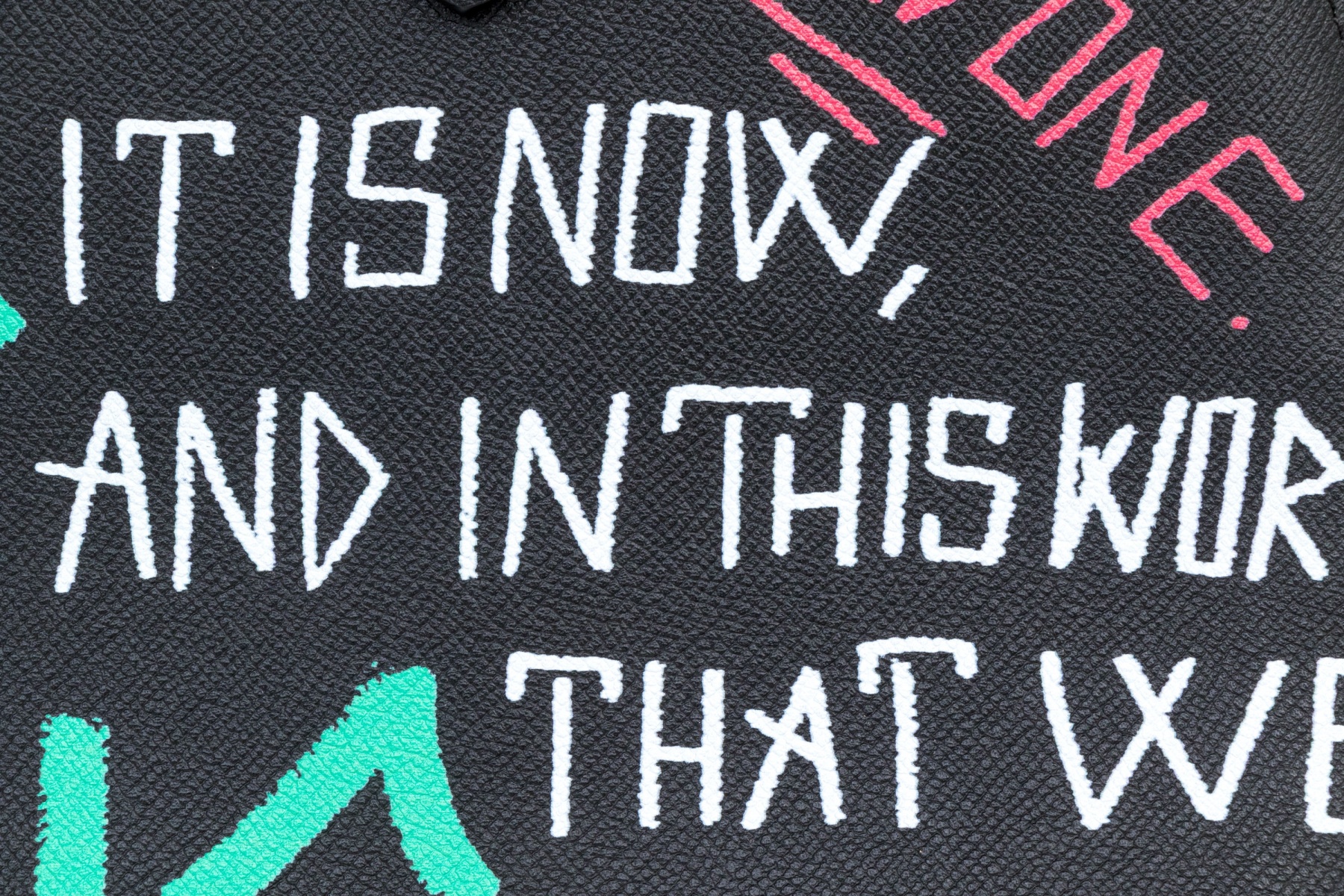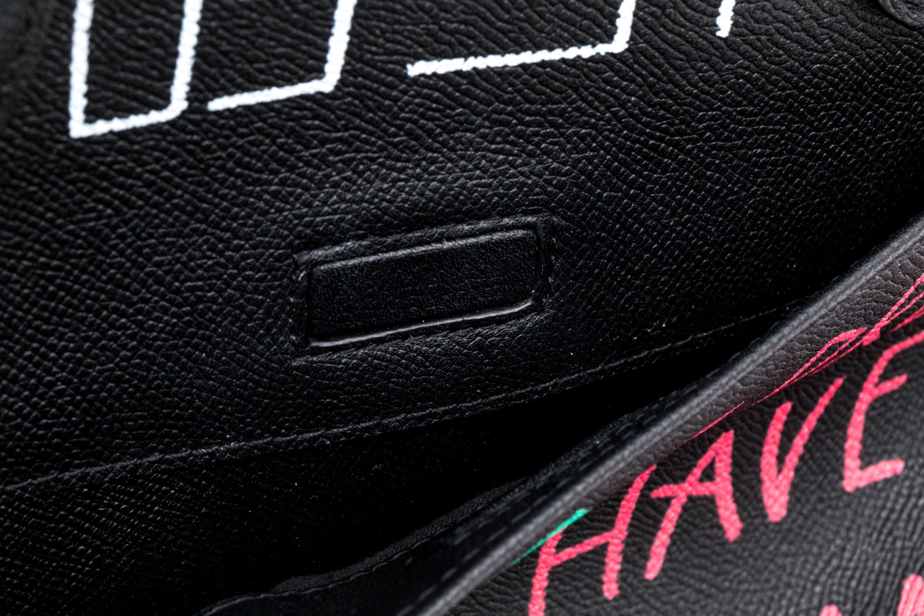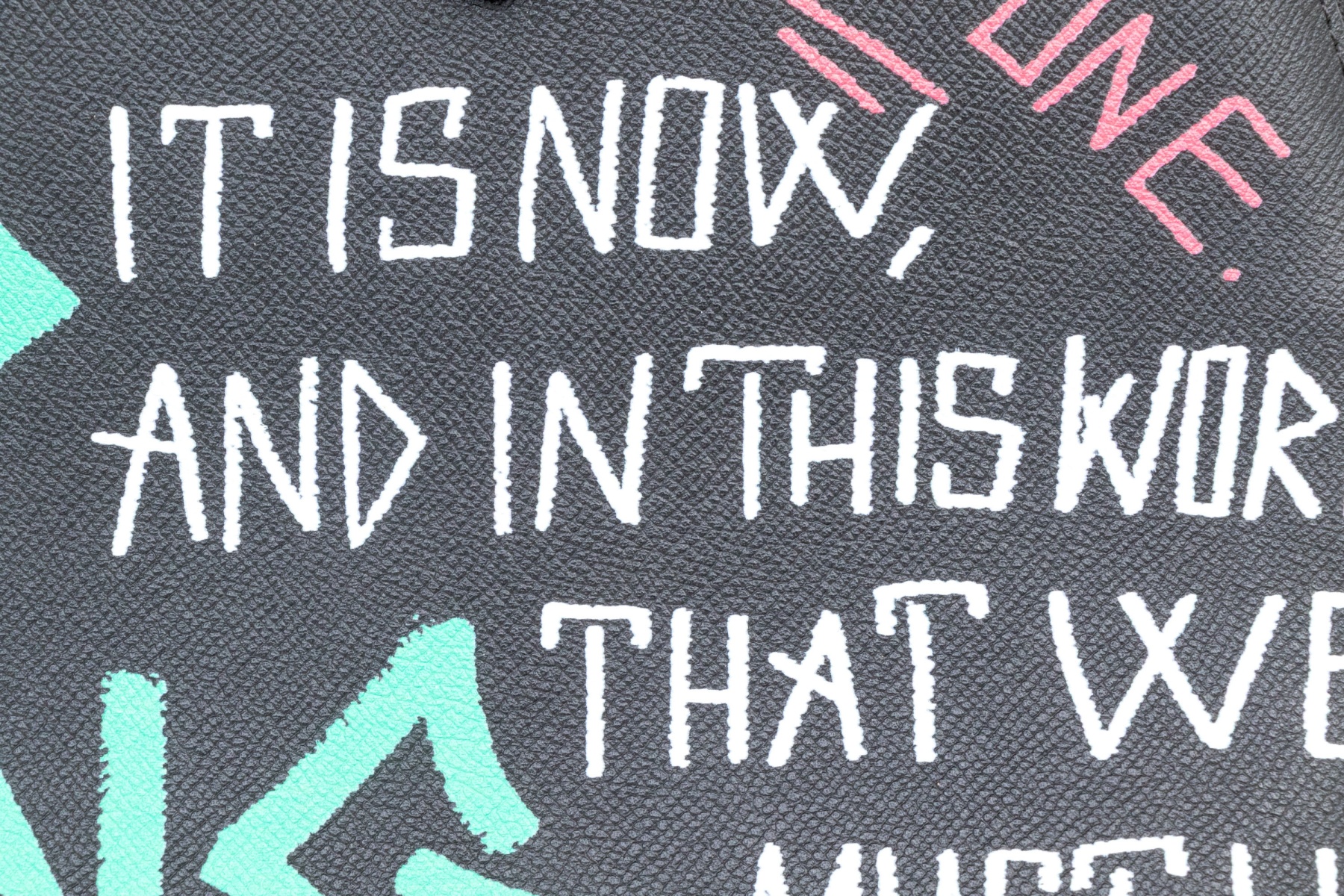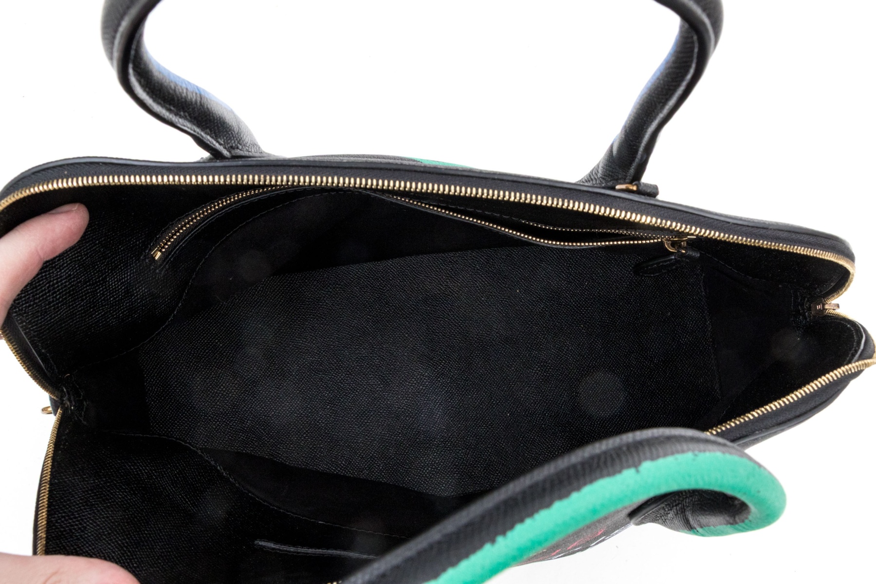 This unique bag features a domed style zip top, and features a leather body, with green, blue, red and white graffiti style decoration.
