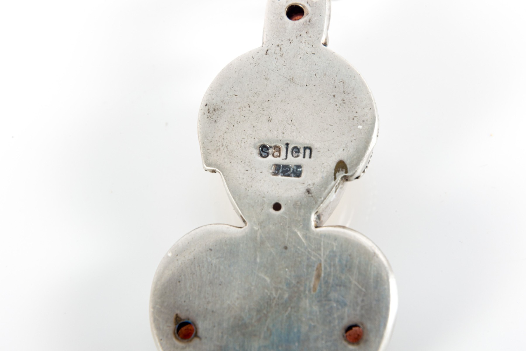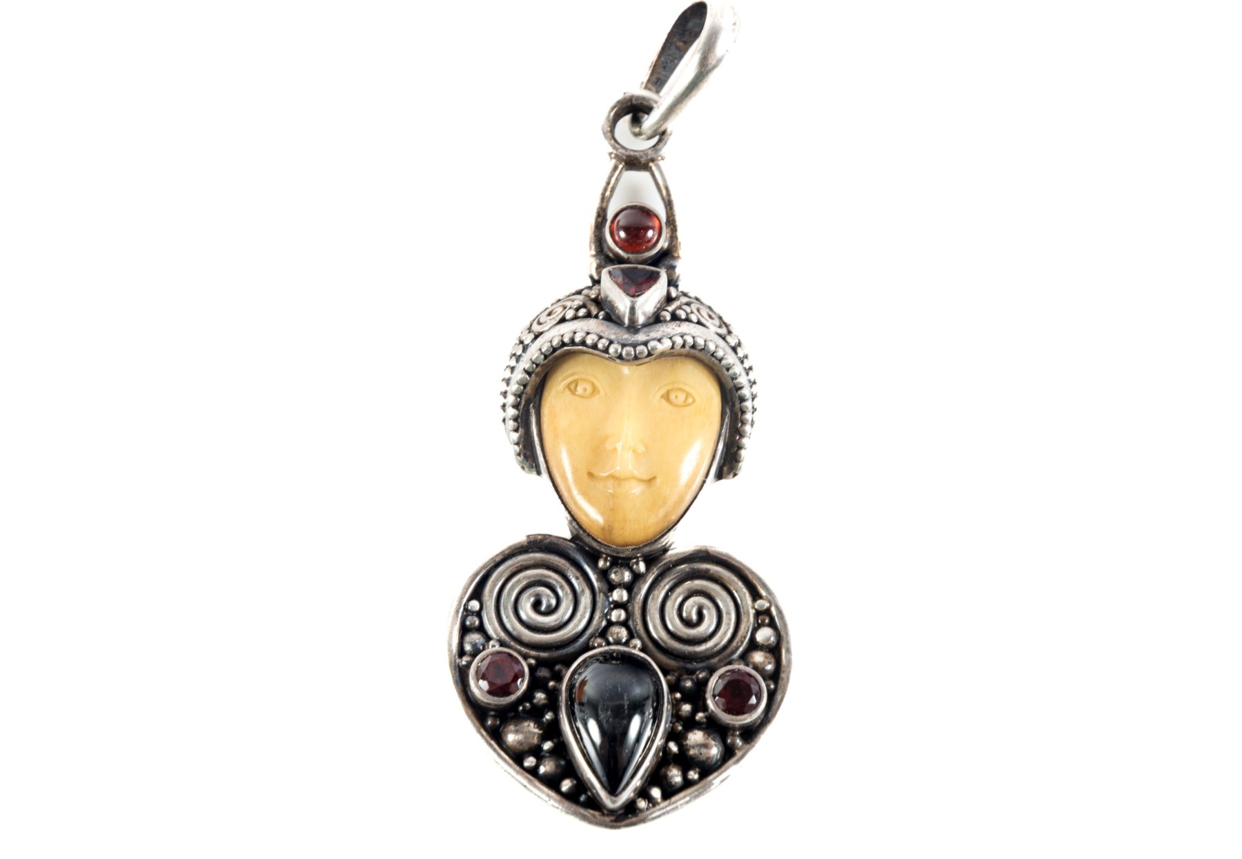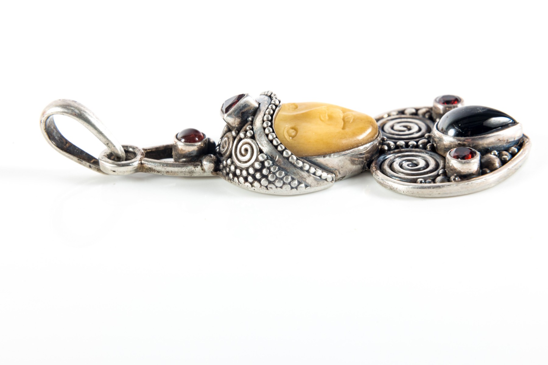 Sajen jewelry is a Balinese designer jewelry brand. Crafted of fine sterling silver, this pendant is meticulously detailed with a central carved stone face accompanied by bezel set garnets and an onyx cabochon.
