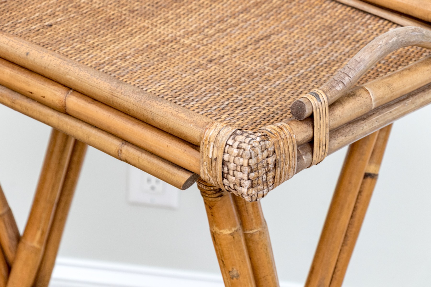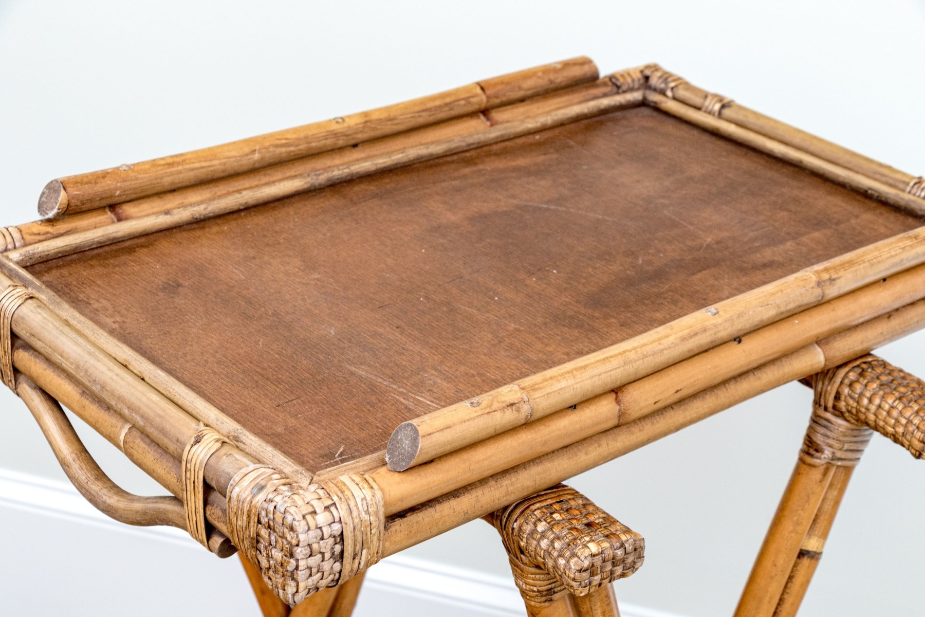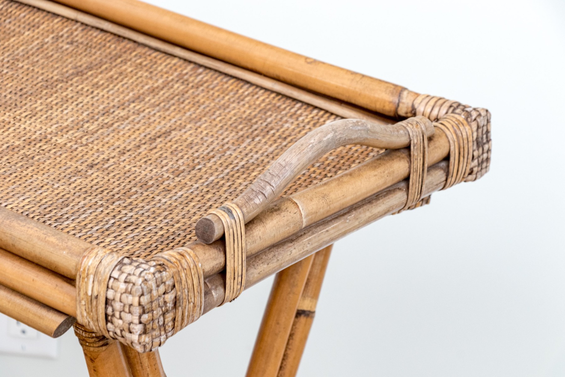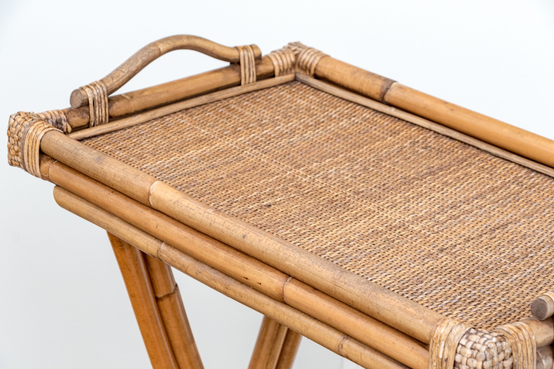 Bamboo and rattan woven frame that can collapse for storage with a removable bamboo framed twin handled tray.