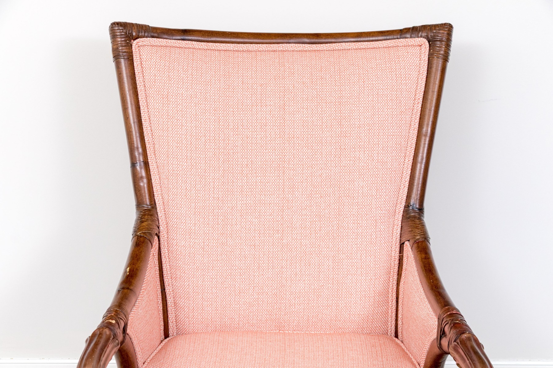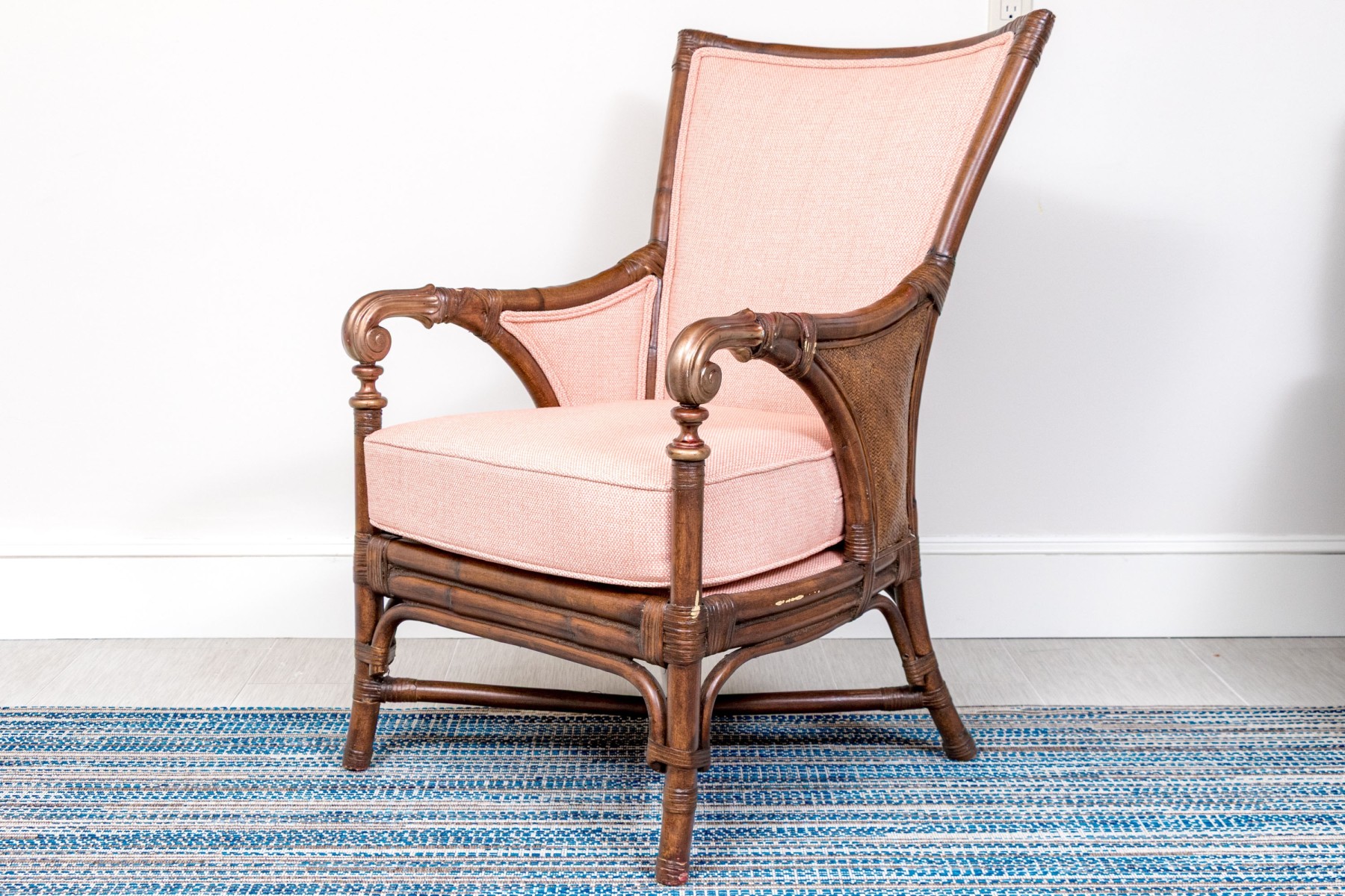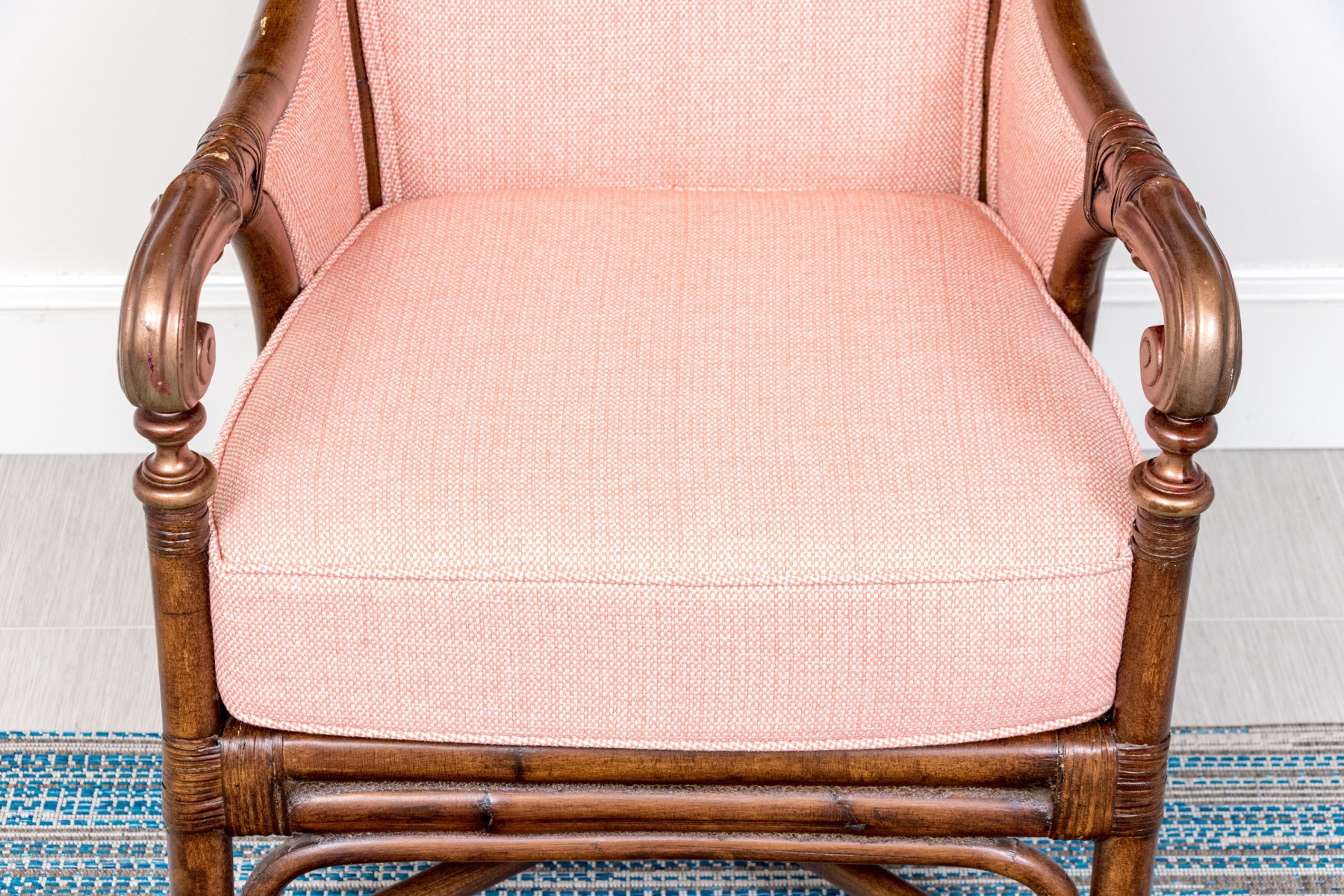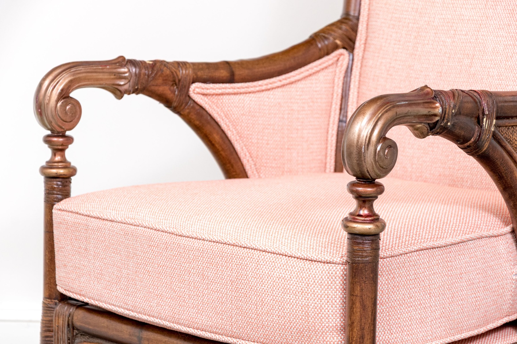 A wonderful armchair raised on four bamboo legs with X form stretcher supports underneath. Detailed with carved and gilt finished arms and custom upholstered in pretty pink fabric with a loose seat cushion.