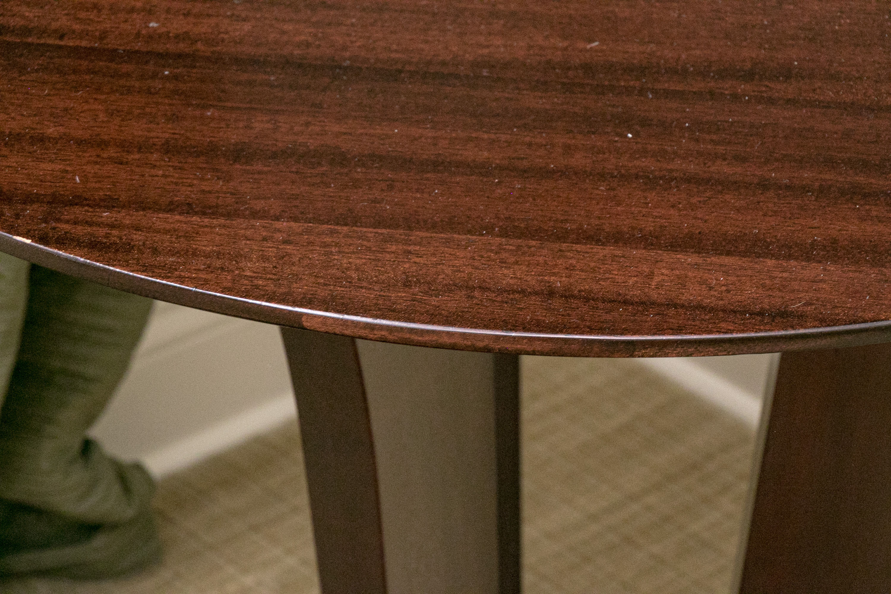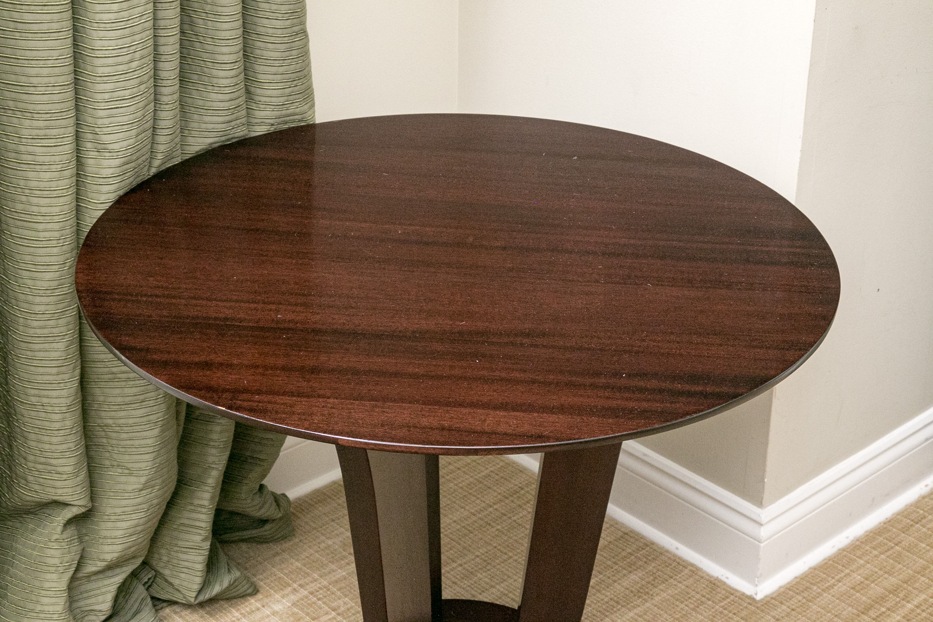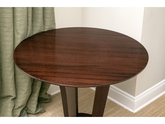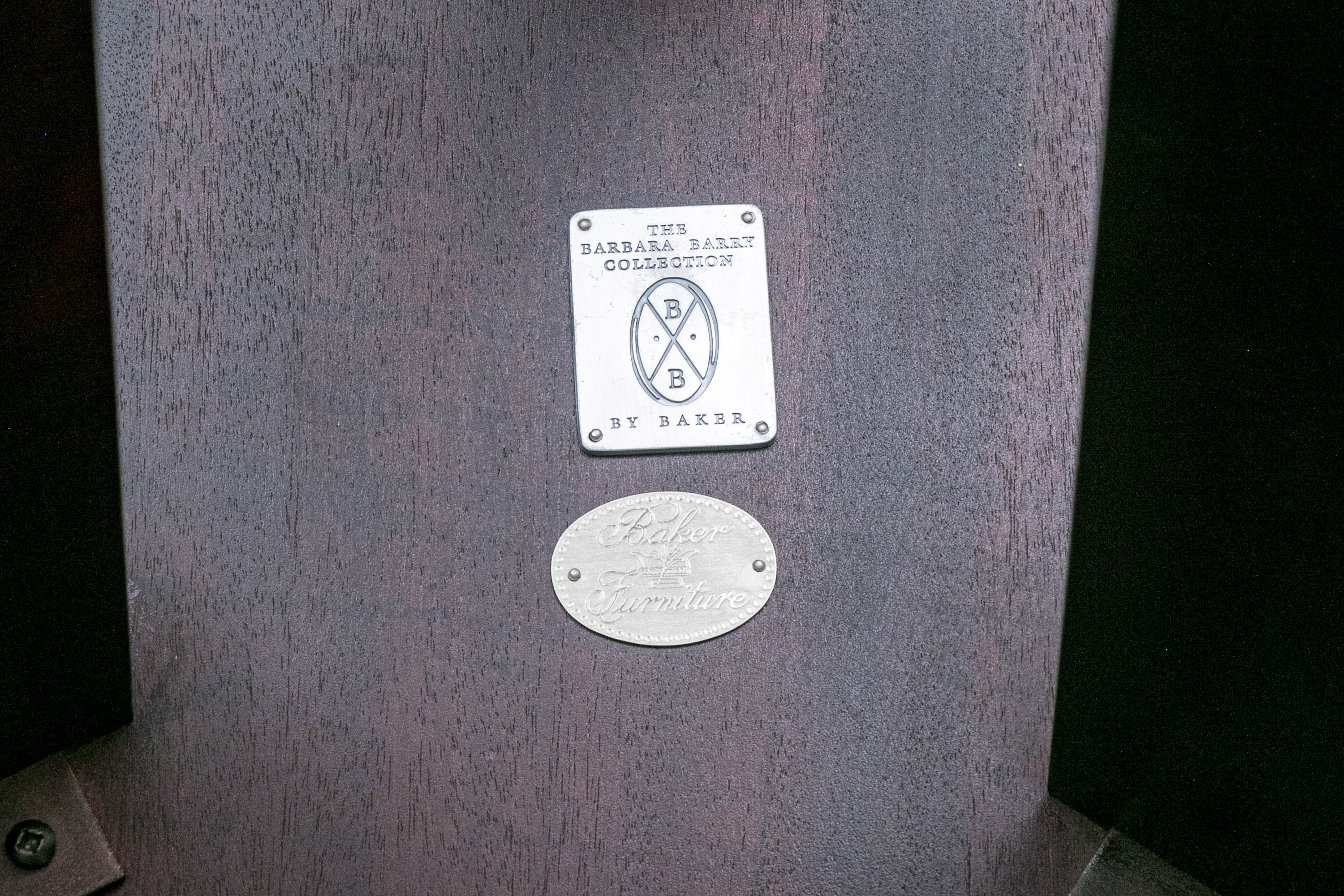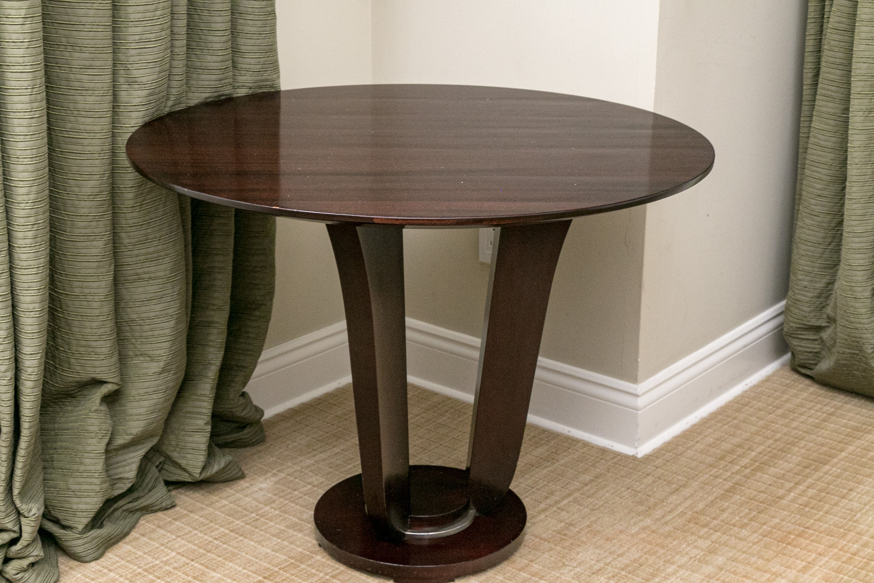 A later design by Barbara Barry for Baker Furniture. Dark Mahogany with handsome graining in a Tulip form reminiscent of the great Art Deco Era. Refined simplicity of form adds style to this piece which may be used as a Center, Occasional , End or Cocktail table.