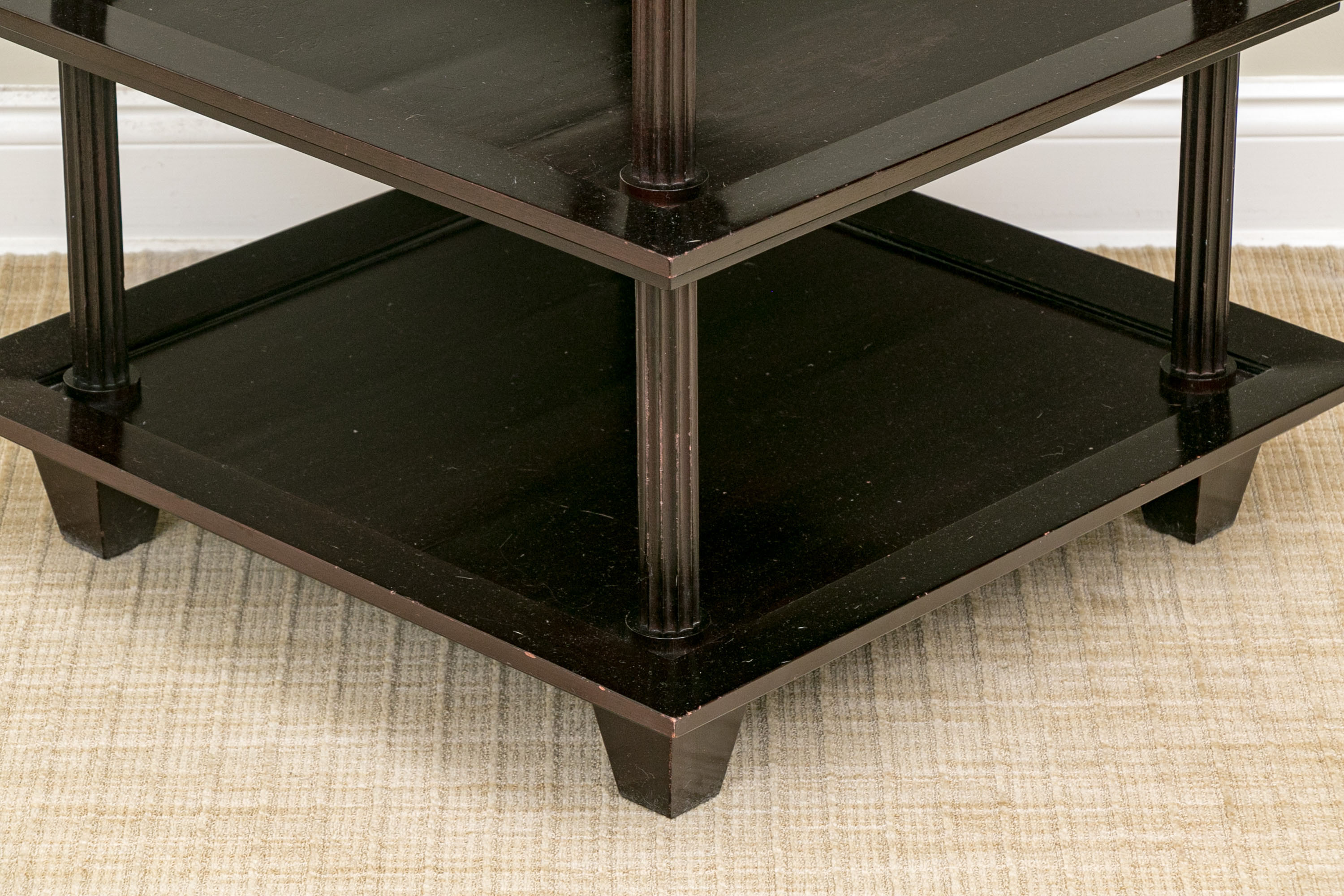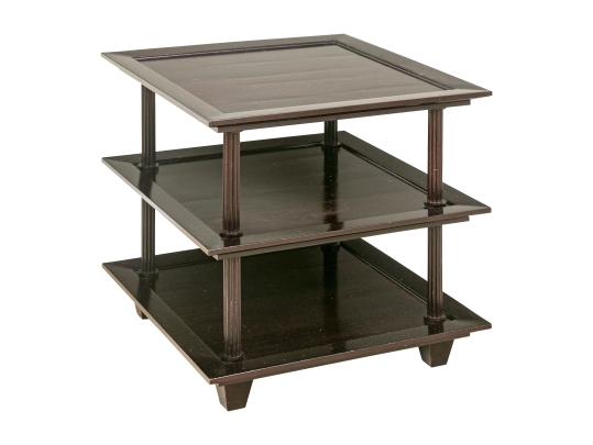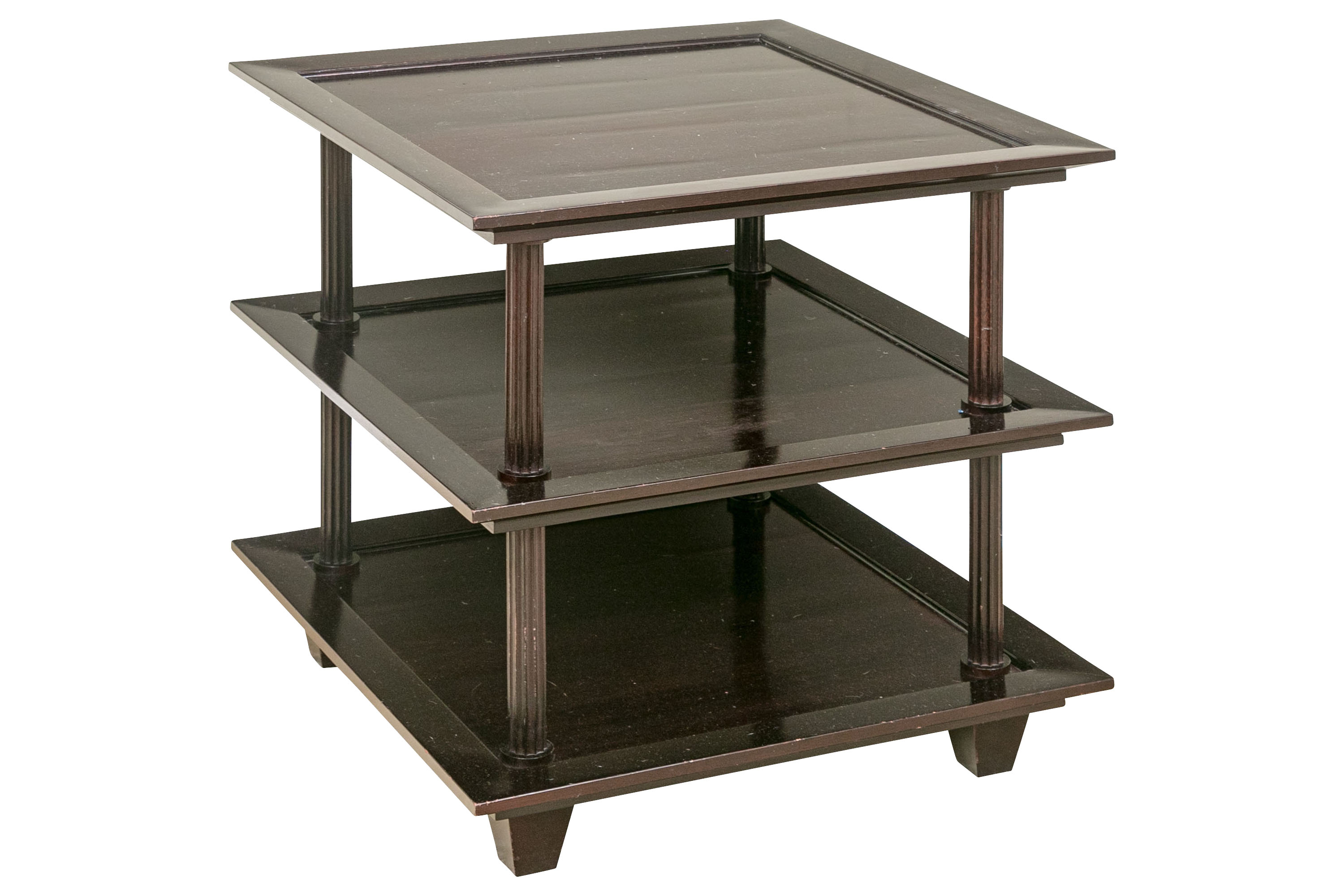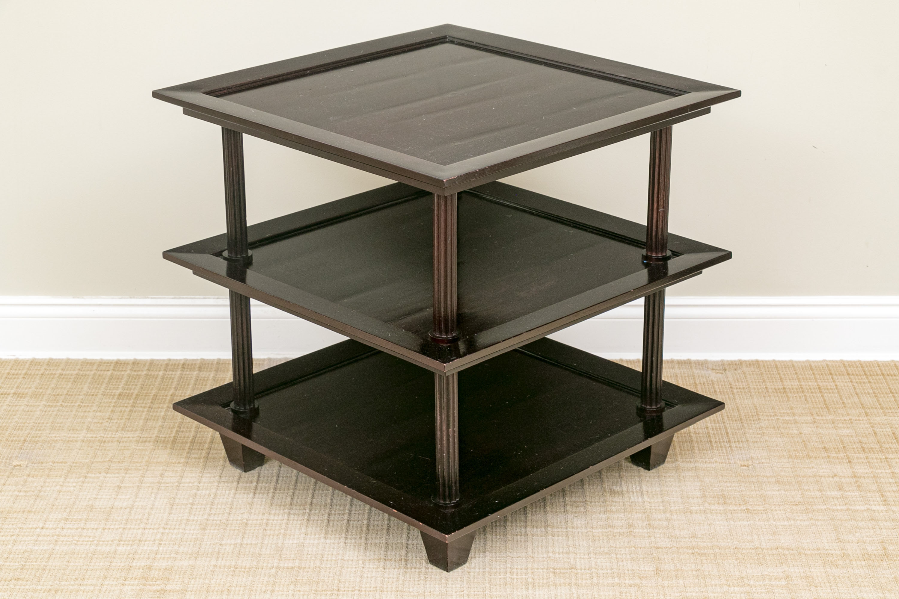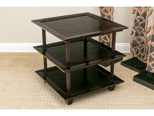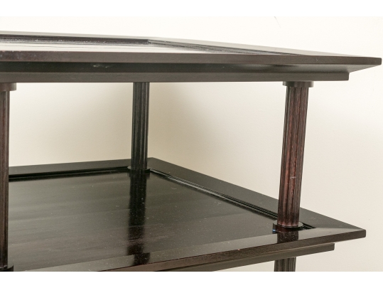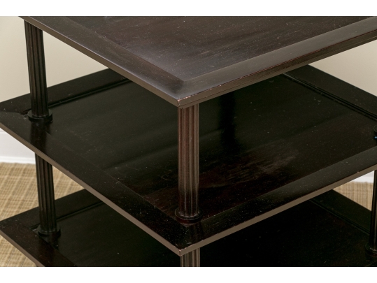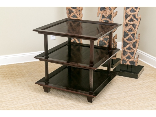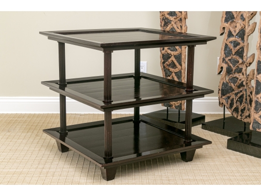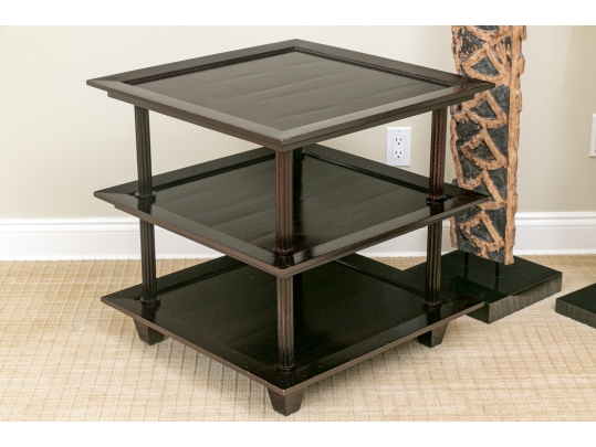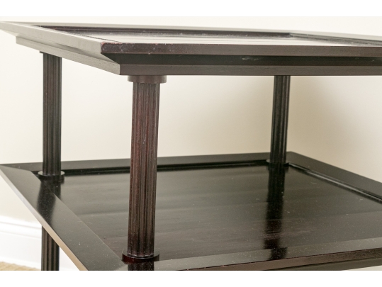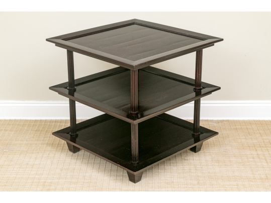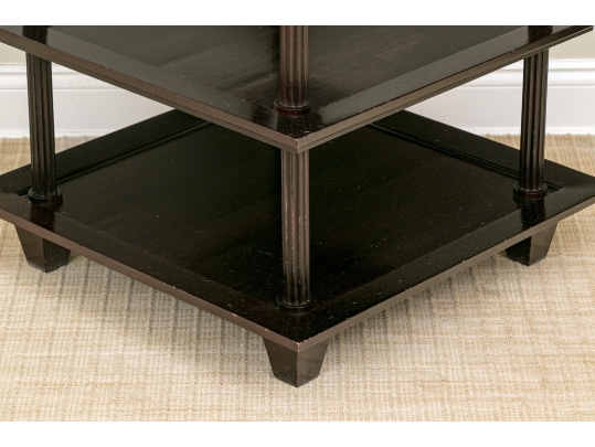 A later and very elegant design from Barbara Barry designed in the 1990’s. A square tiered Table in Barbara Barry’s Classic deep finish with fluted Column supports.