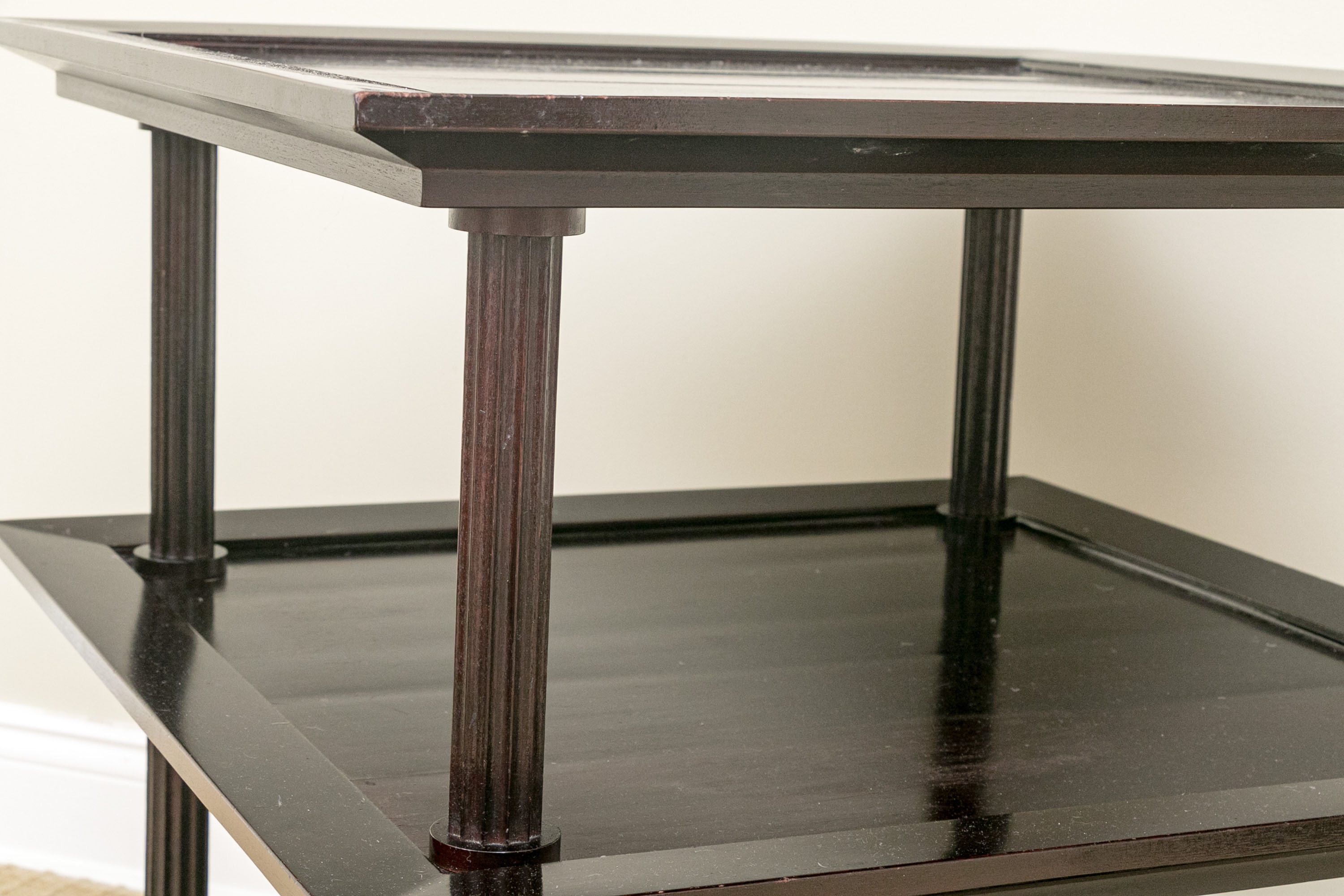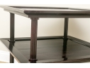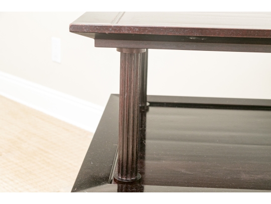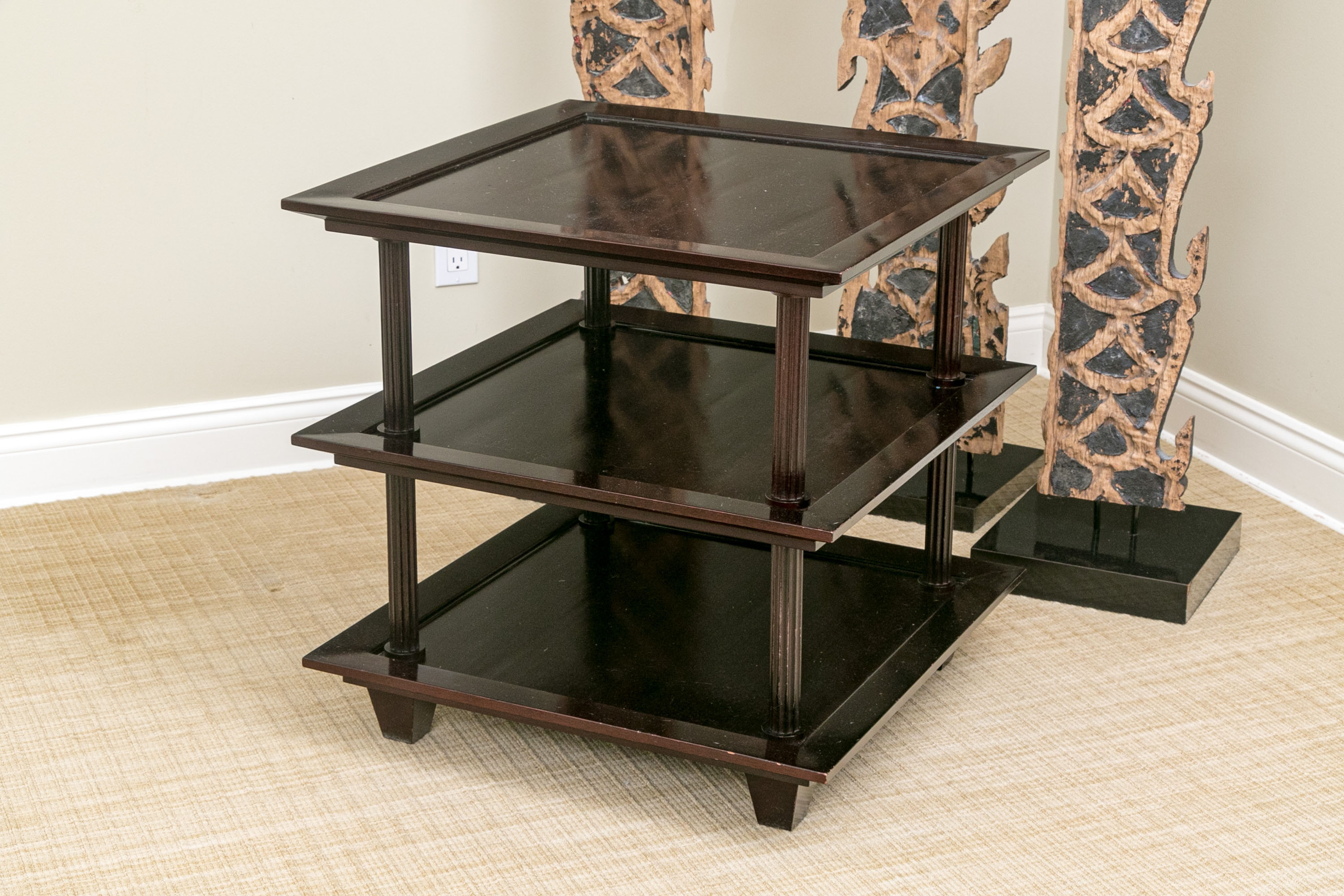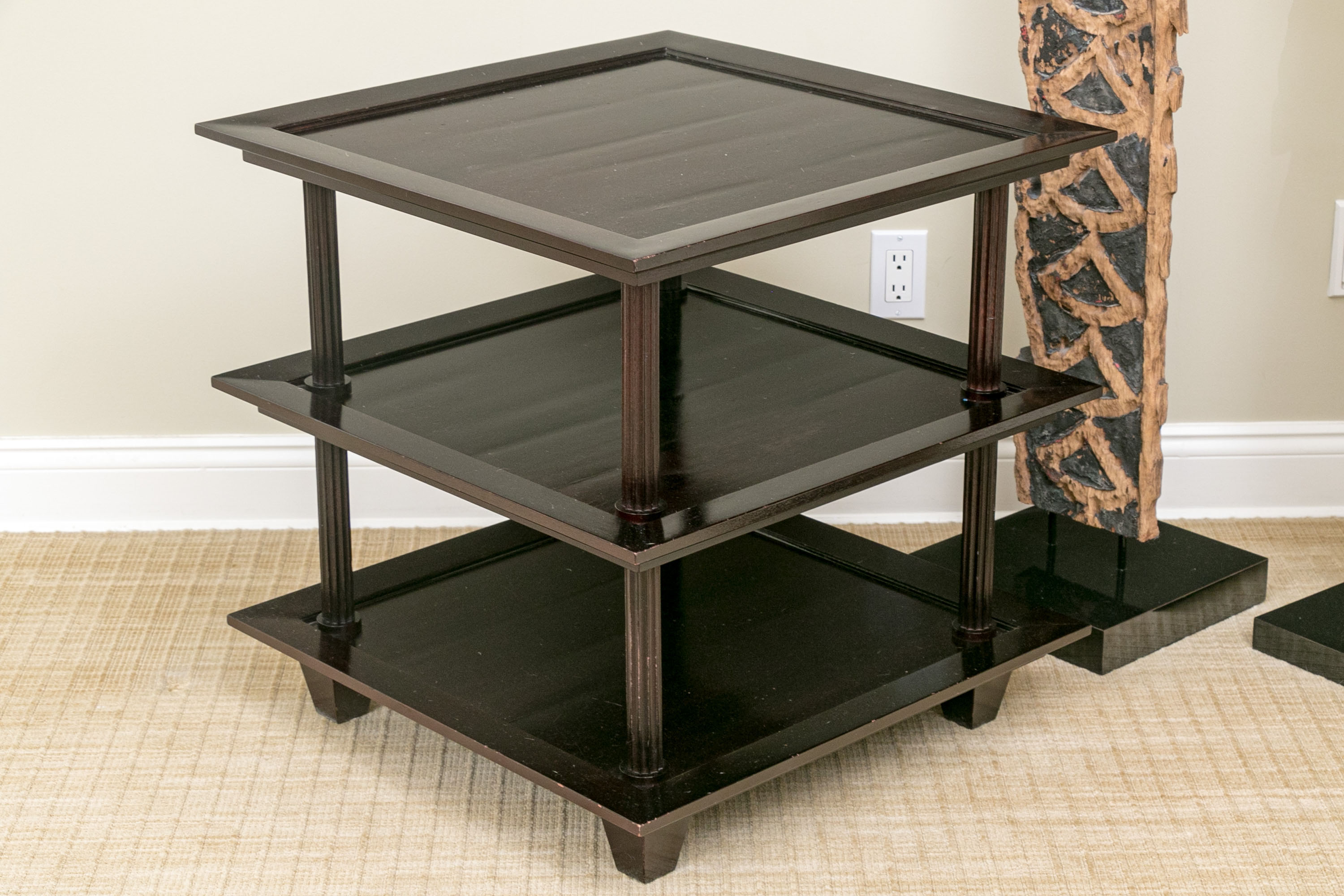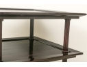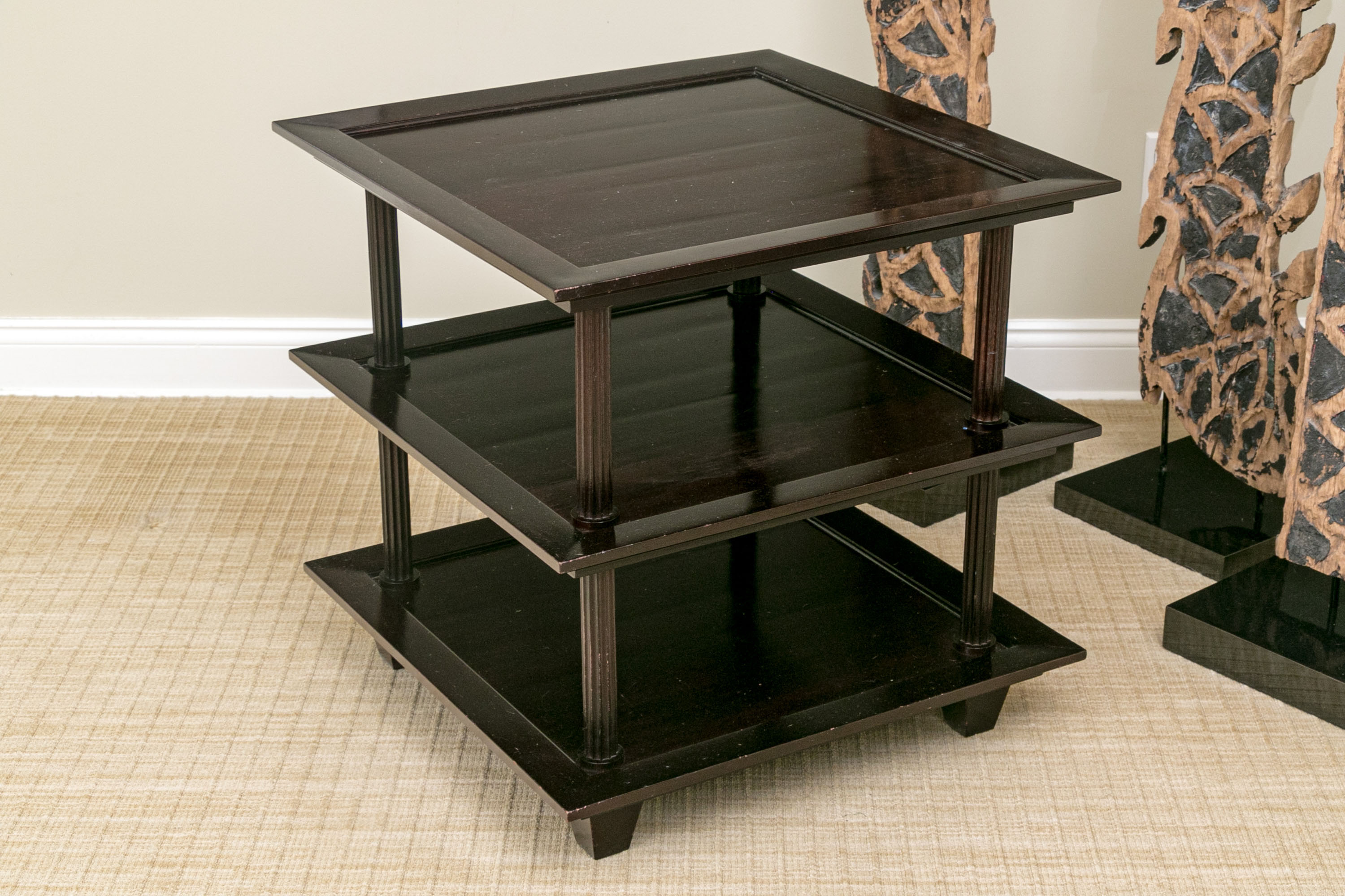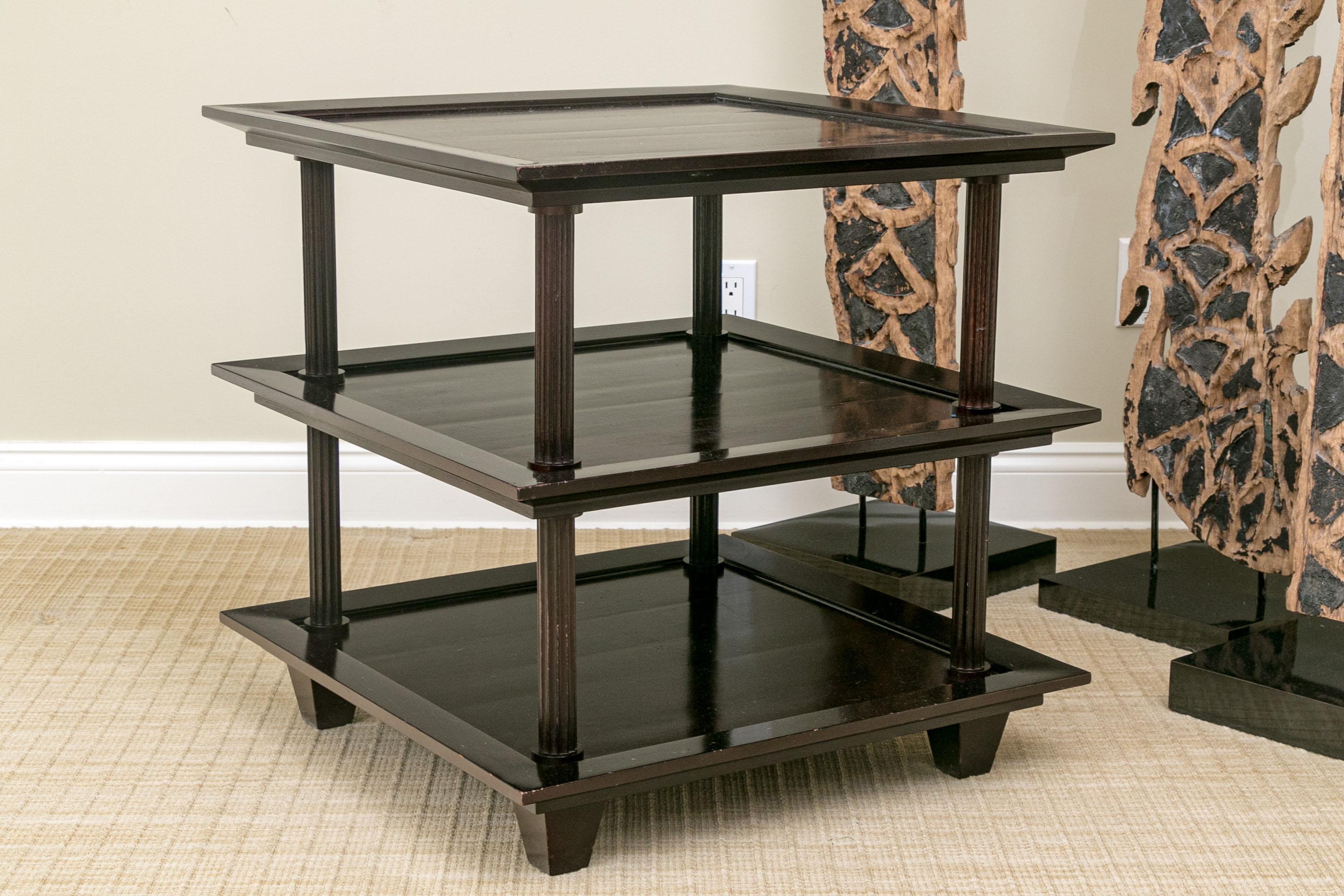 A later and very elegant design from Barbara Barry designed in the 1990’s. A square tiered Table in Barbara Barry’s Classic deep finish with fluted Column supports.