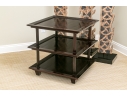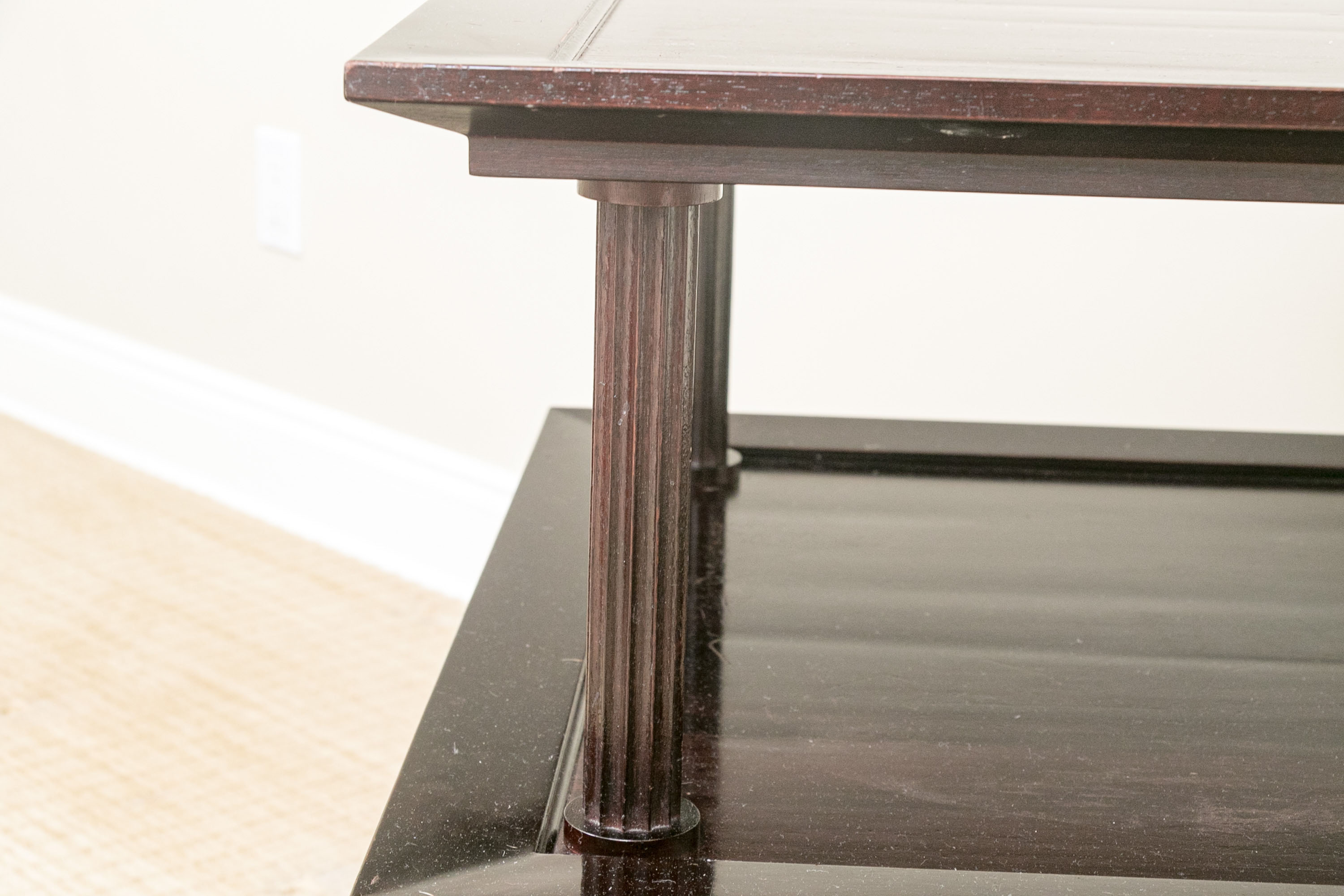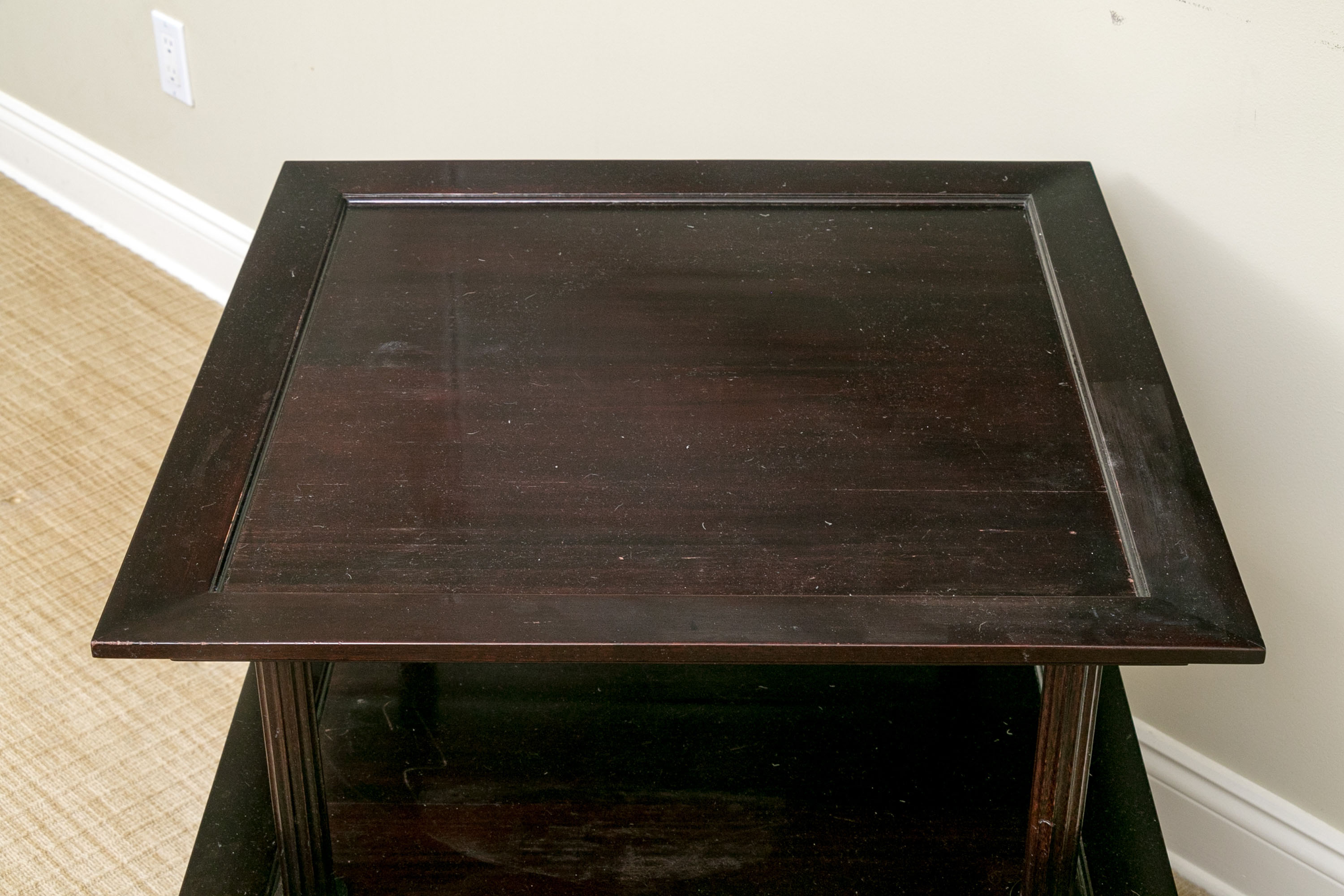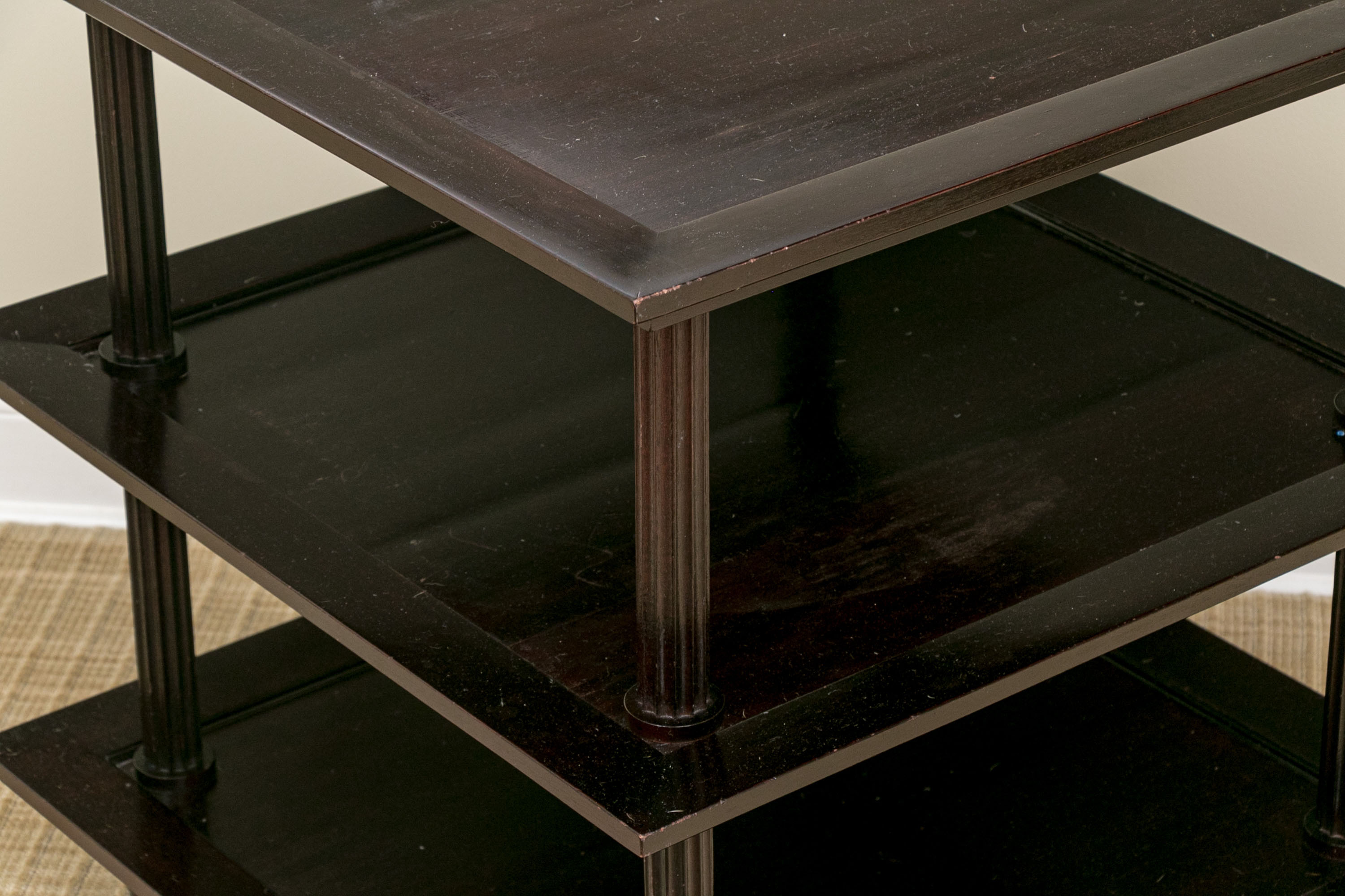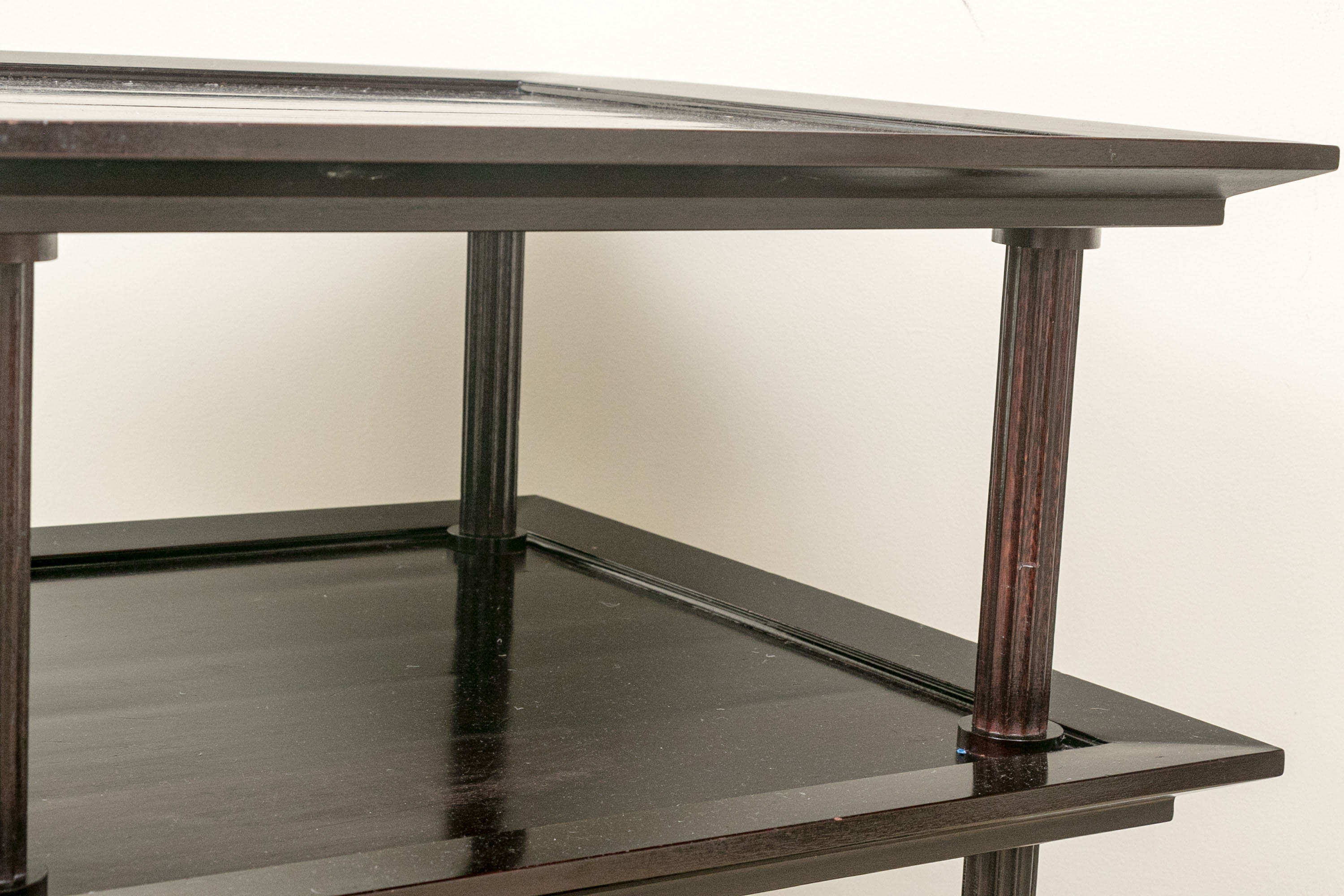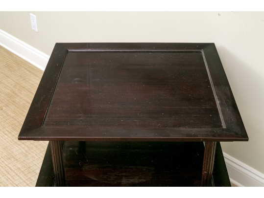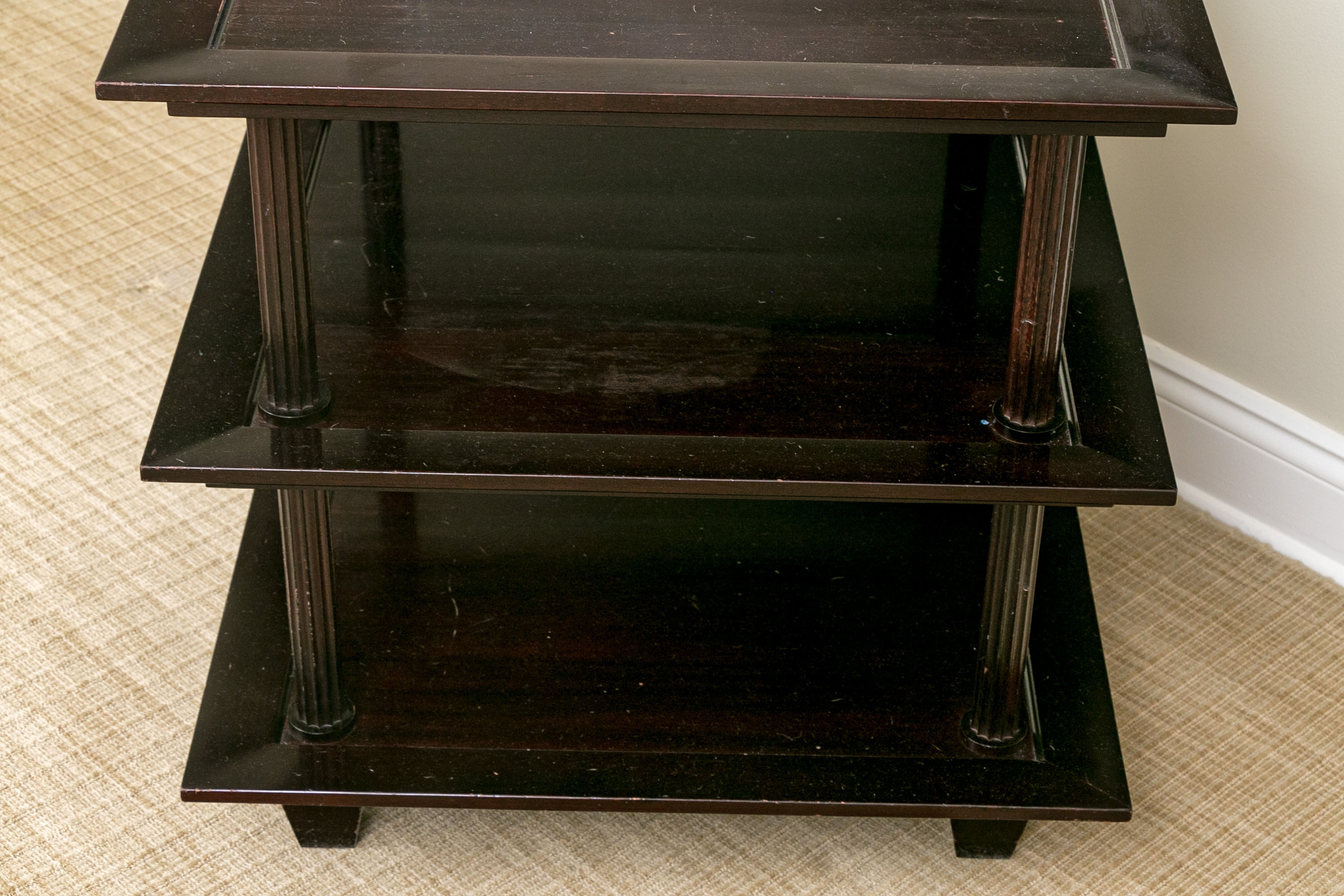 A later and very elegant design from Barbara Barry designed in the 1990’s. A square tiered Table in Barbara Barry’s Classic deep finish with fluted Column supports.