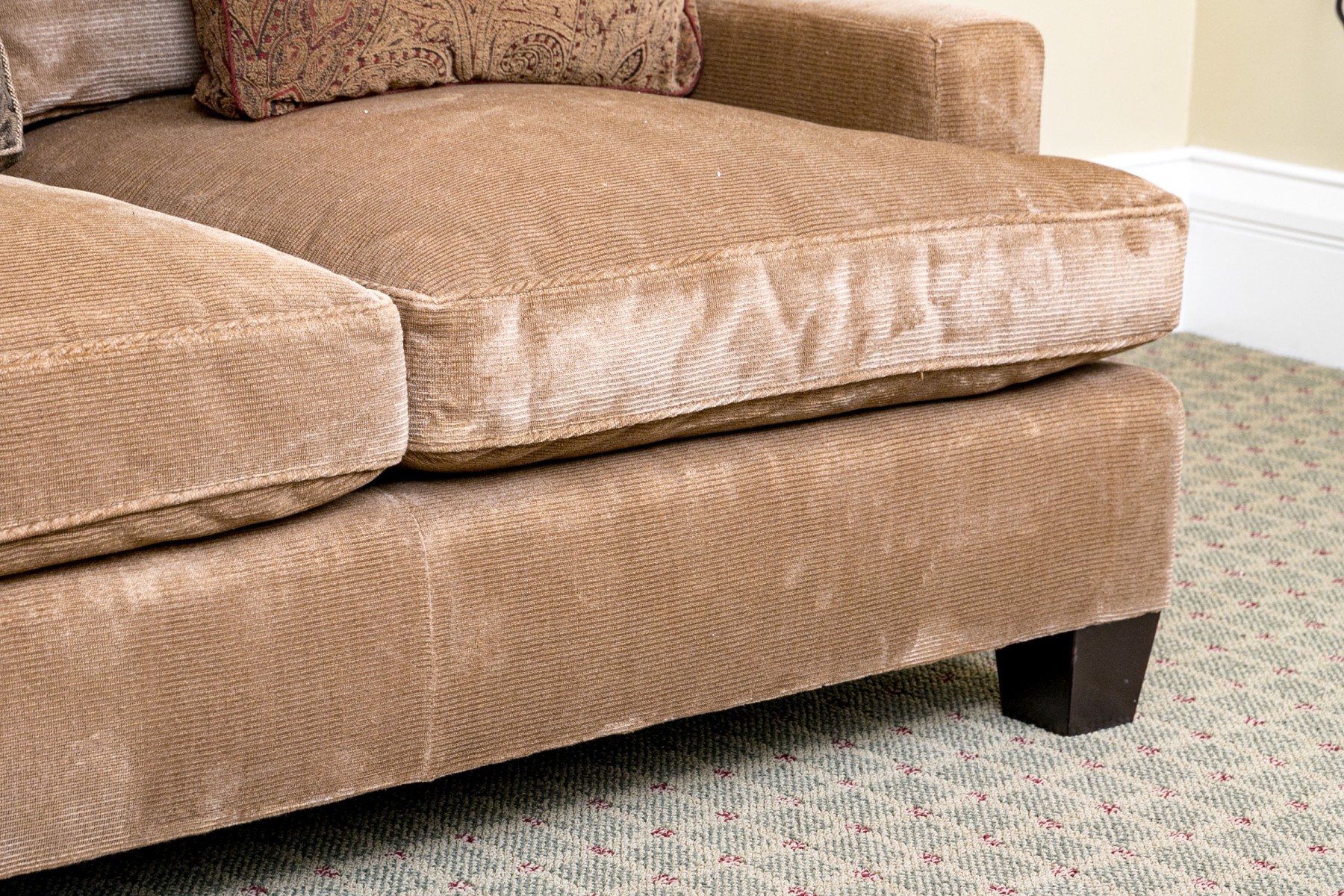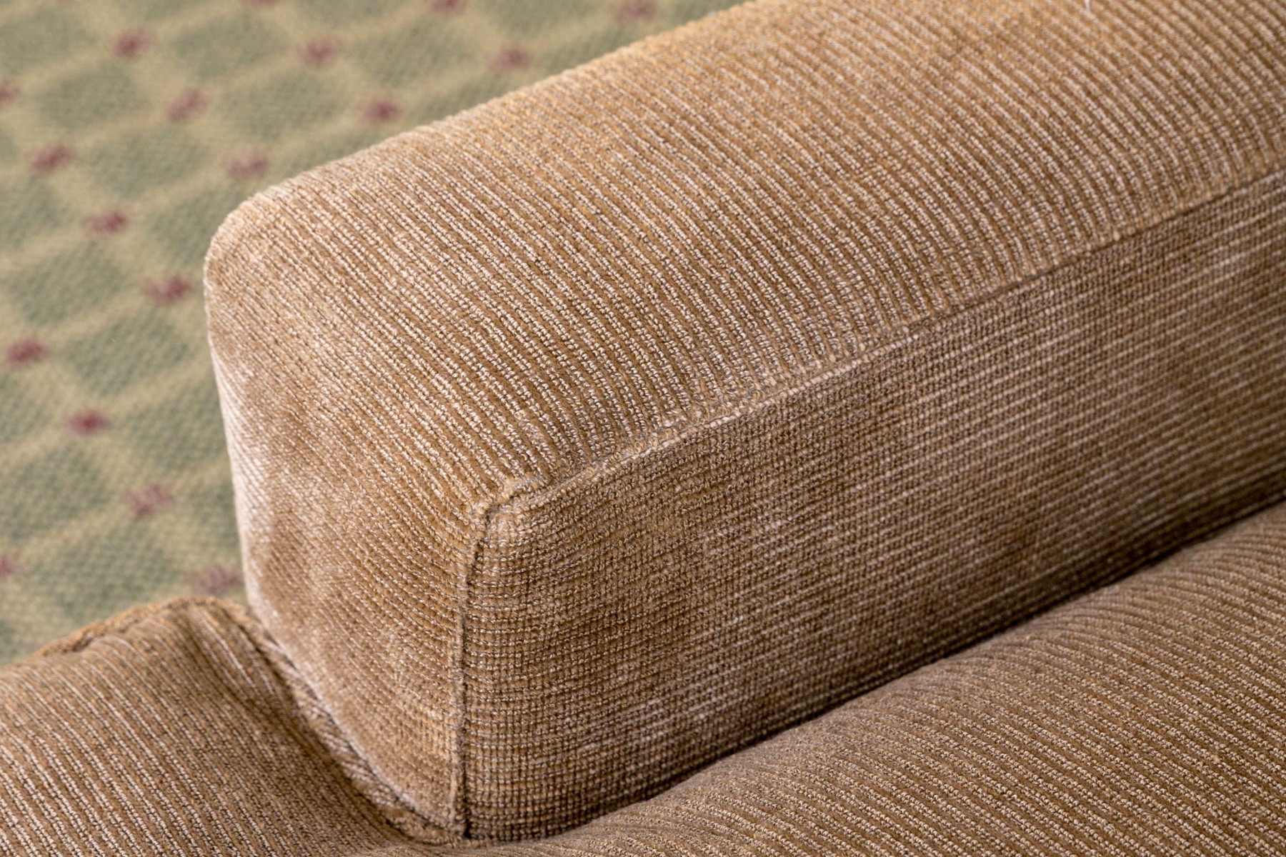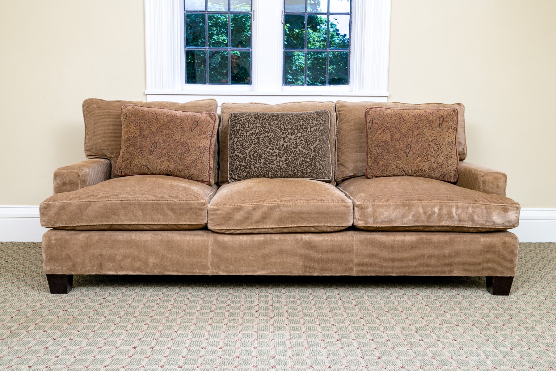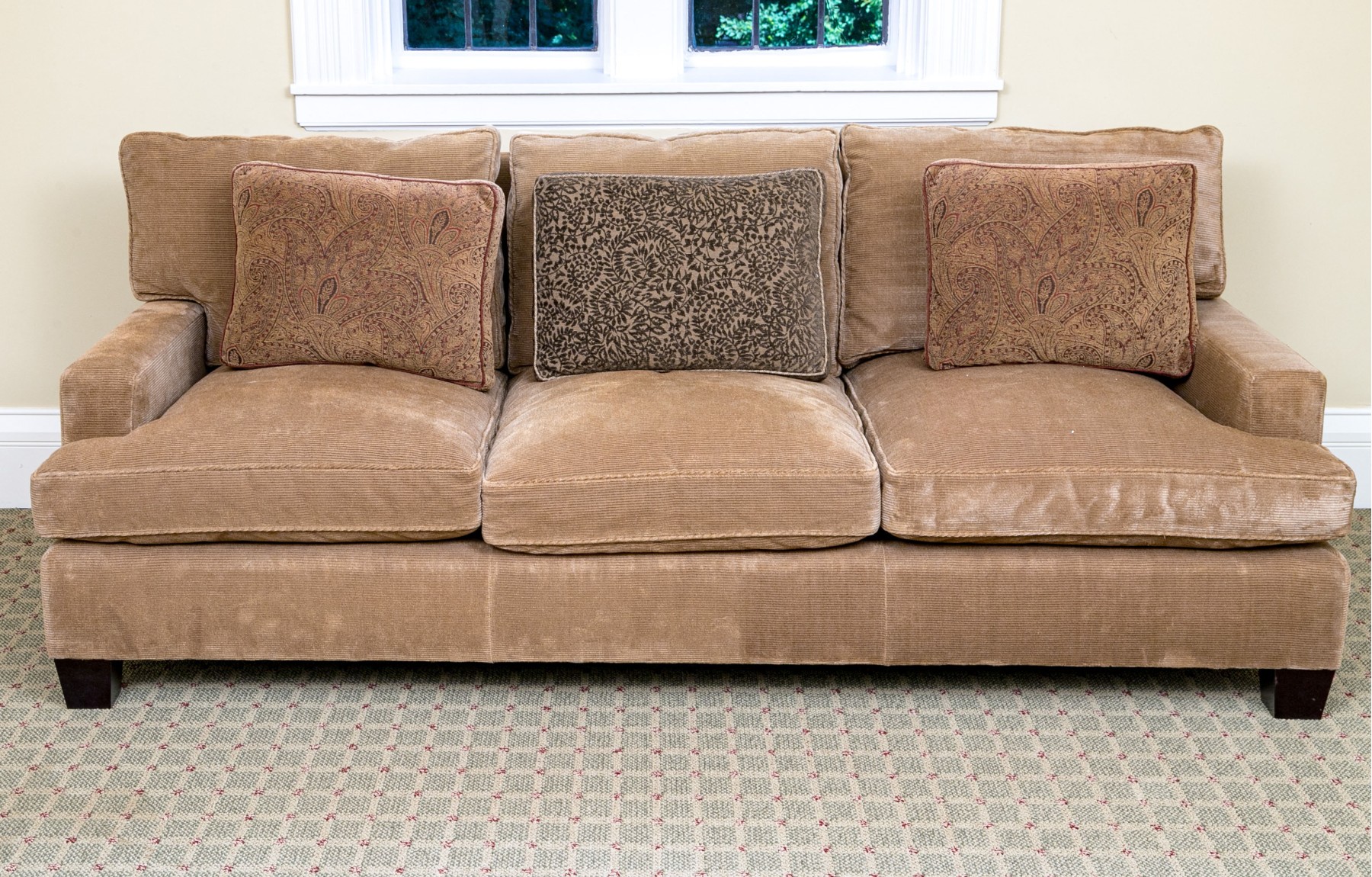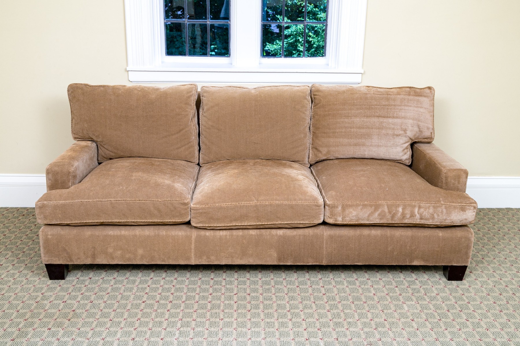 Loose seat and back cushions. Ribbed chenille upholstery. Comfort down fill. Exposed dark mahogany feet. Very good condition. Timeless lines