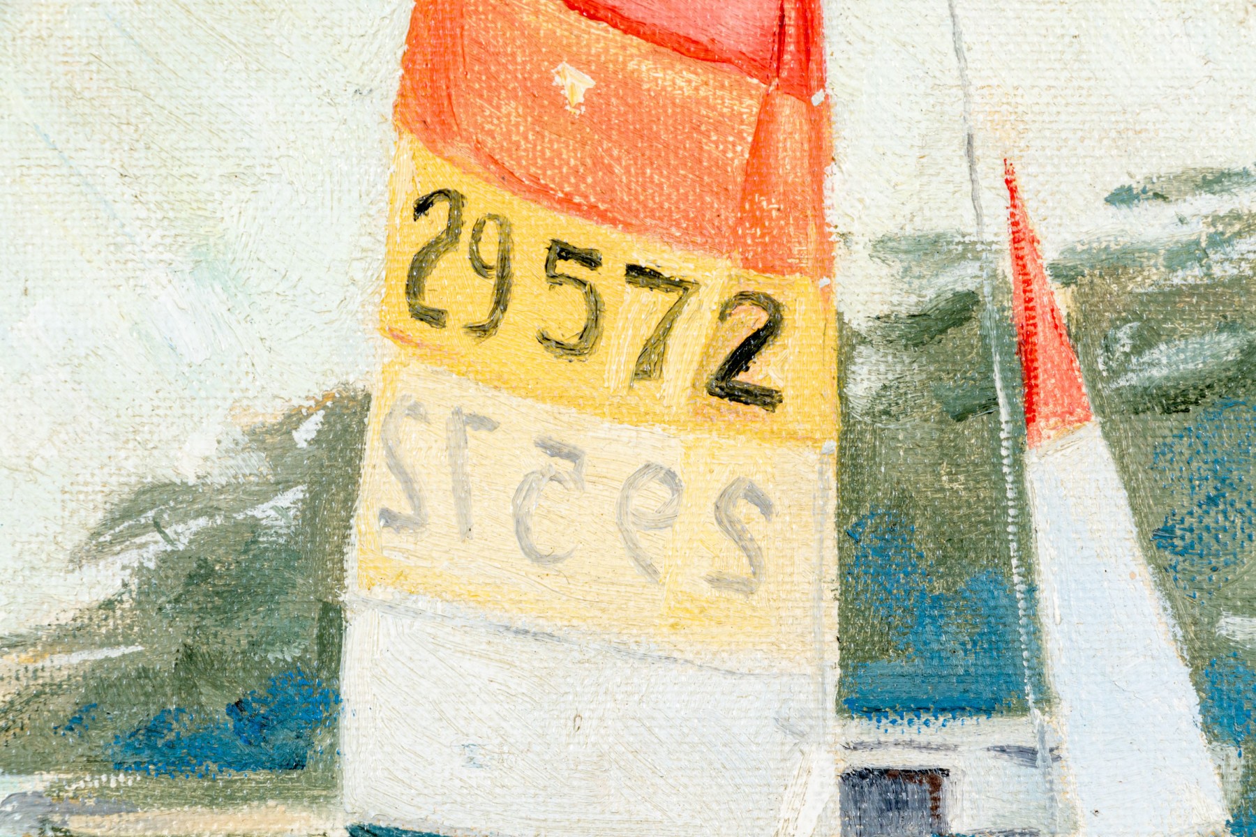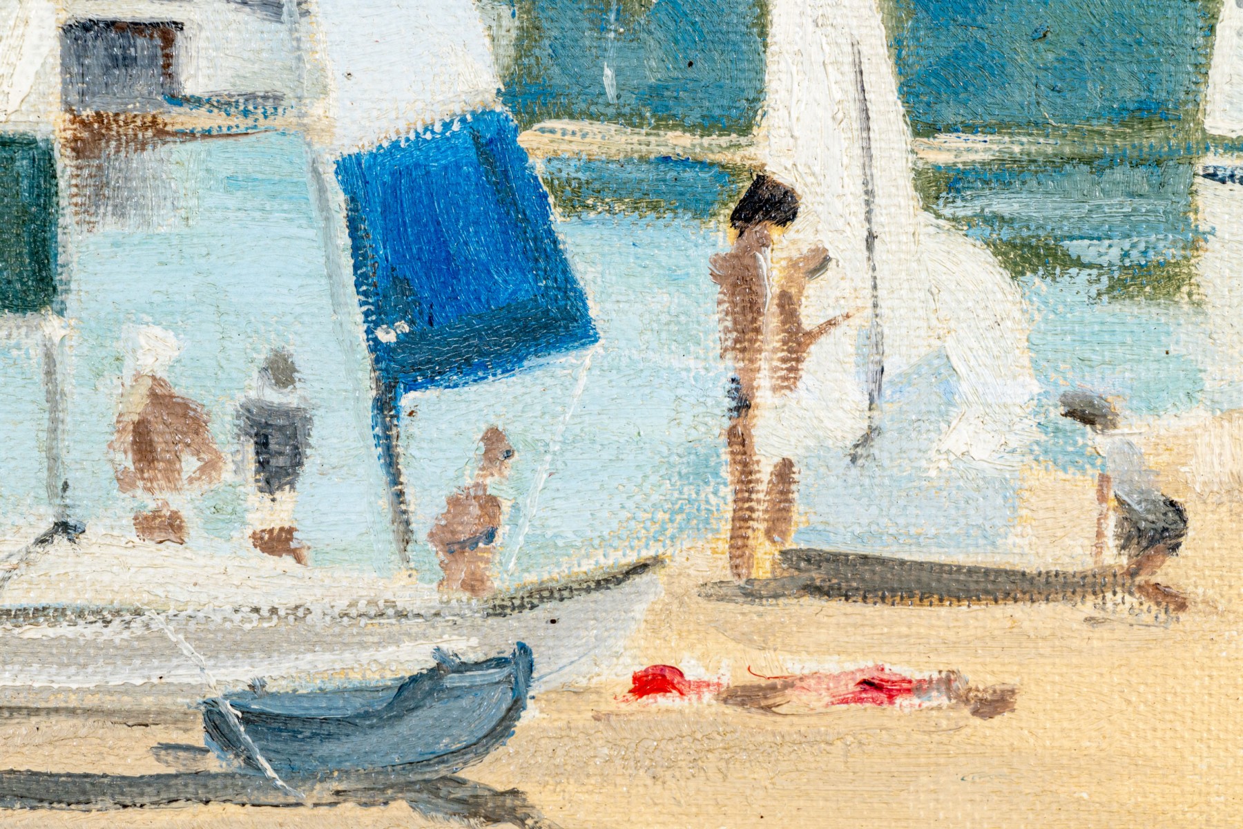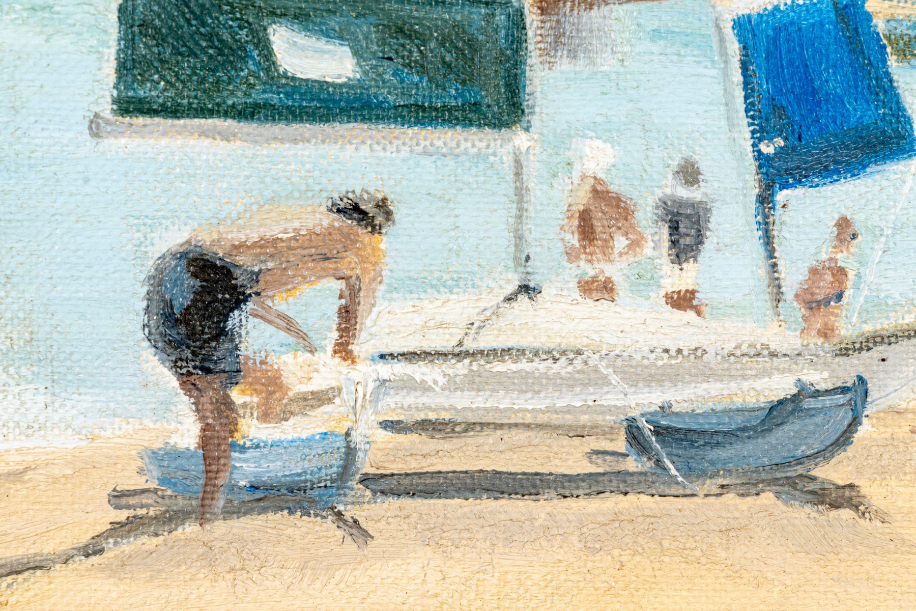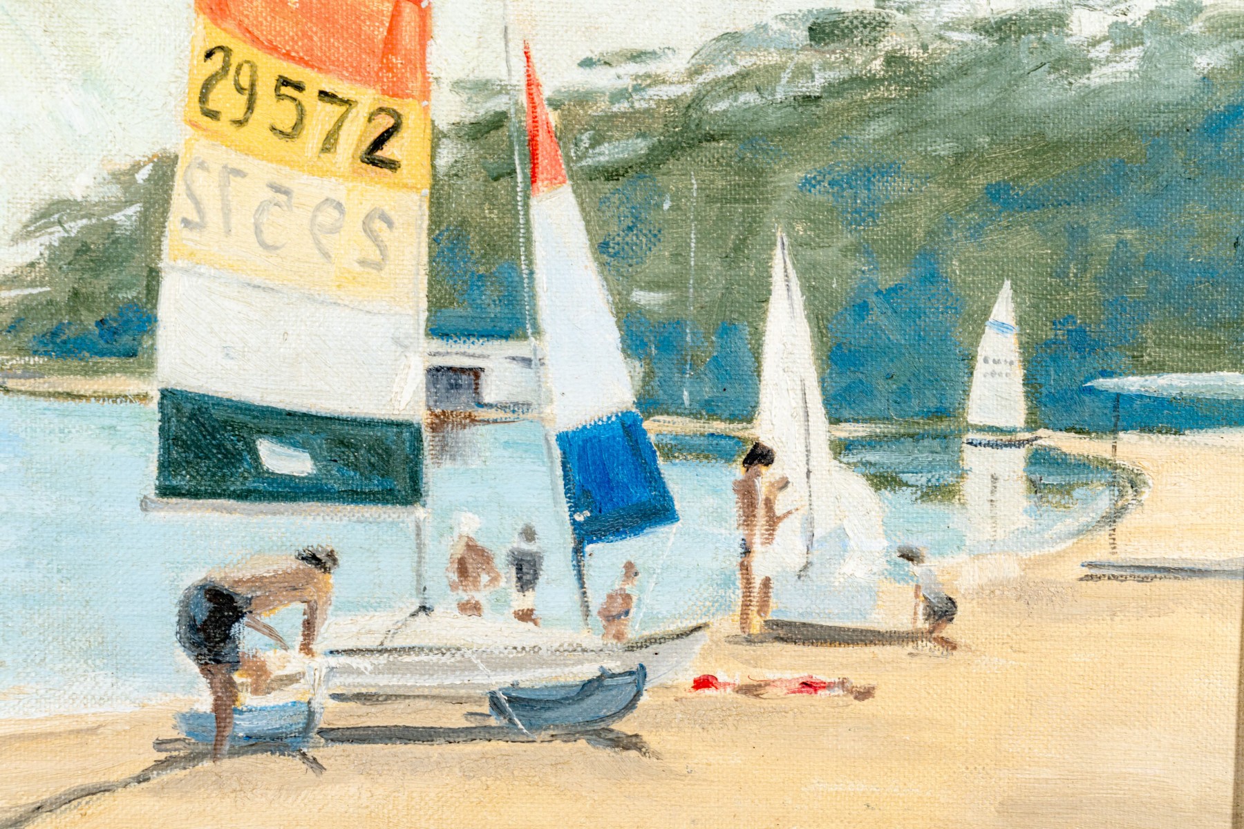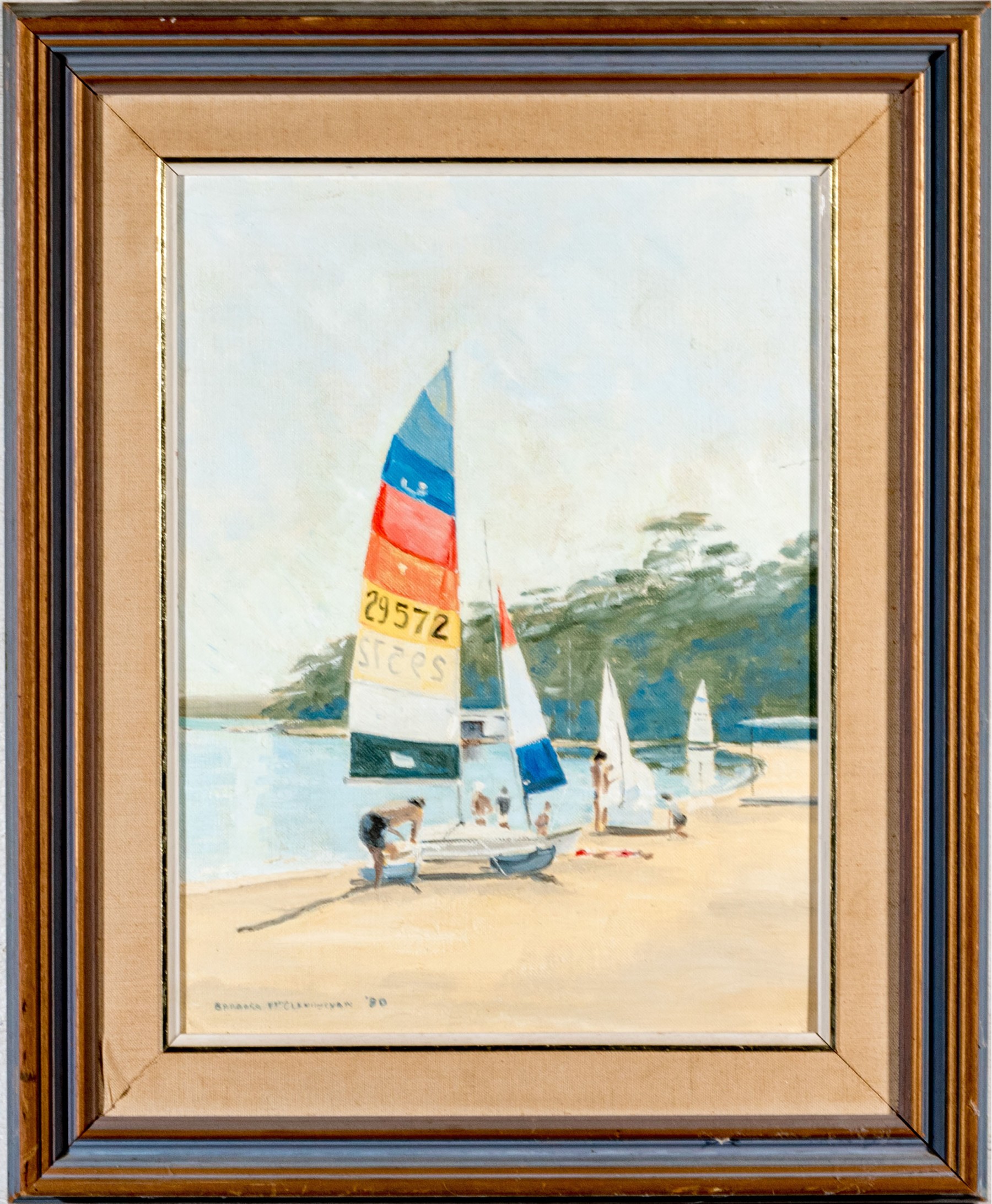 Signed lower left and dated '80, and signed and titled on verso. A sun drenched beach in Australia with several small sailboats near verdant hills. Presented in a painted and gilt wood frame with linen filet.