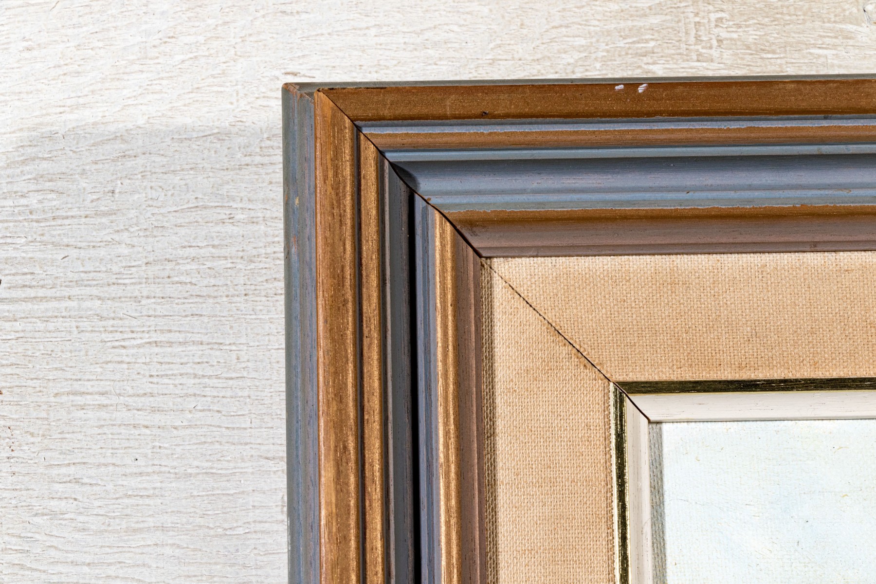 Condition: painting good, rippling to the linen lower left corner and stains upper corners. Please review the photos as they are part of the condition report.