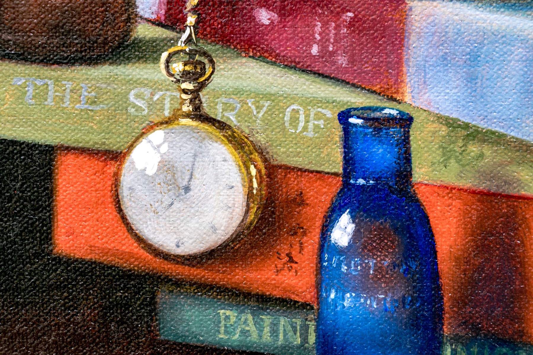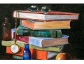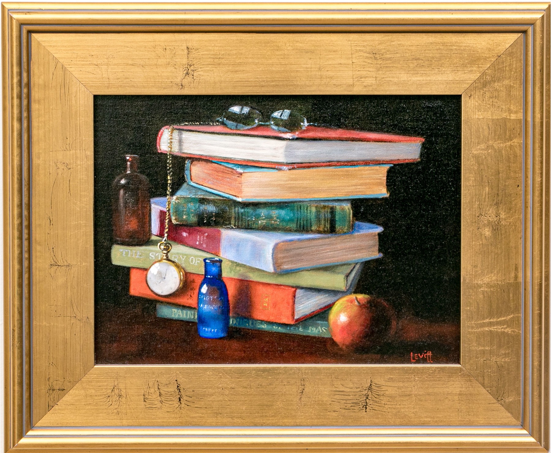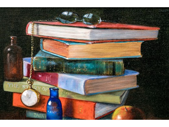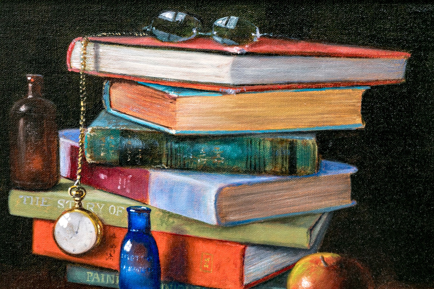A fantastically painted still life scene depicting a table with contents including a stack of 7 books upon which a pair of glasses rests. A pocket watch with chain can also be seen dangling from one end of a book with a red glass bottle placed upon the corner of the third book from the bottom with a second blue glass bottle resting on the table. An apple can be seen placed just in front of the stack of books in the immediate foreground.