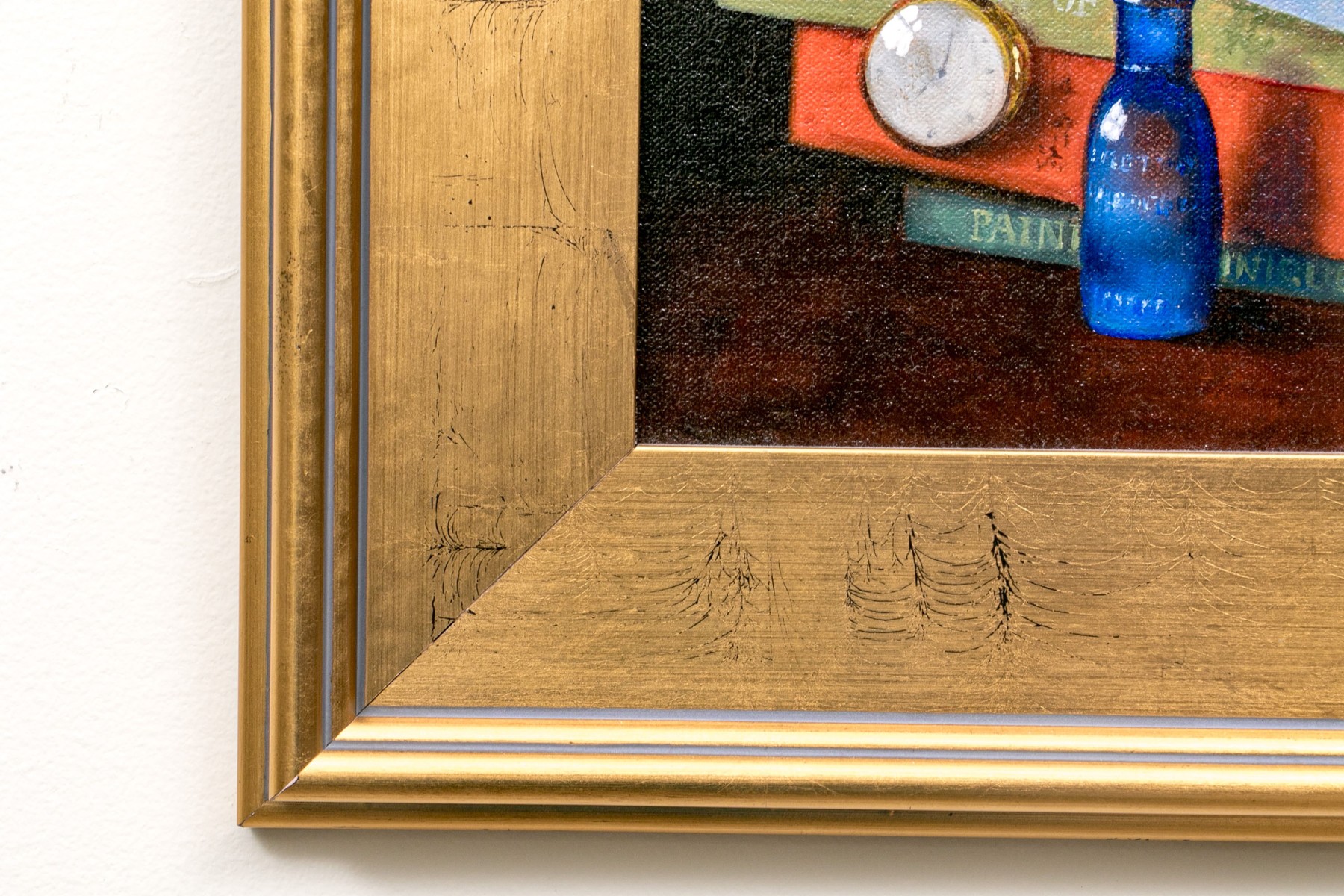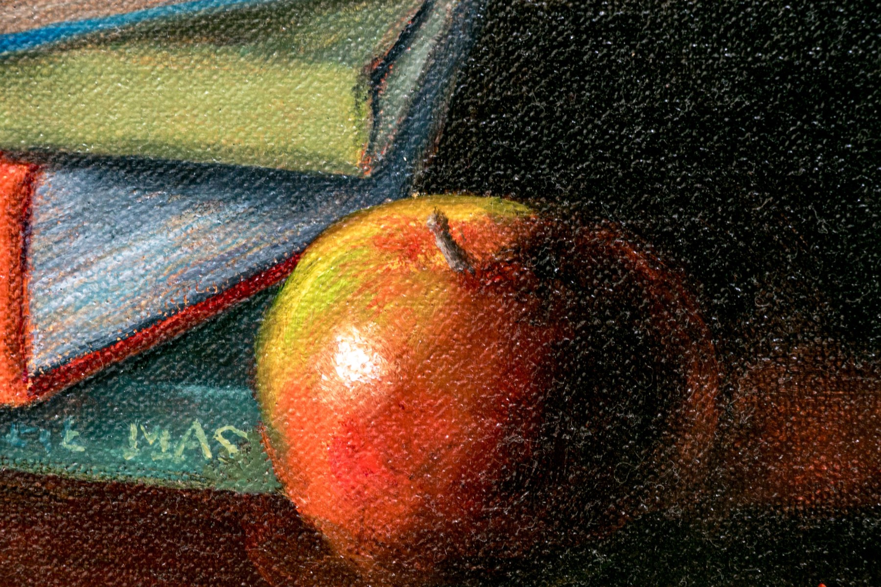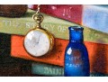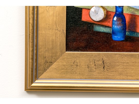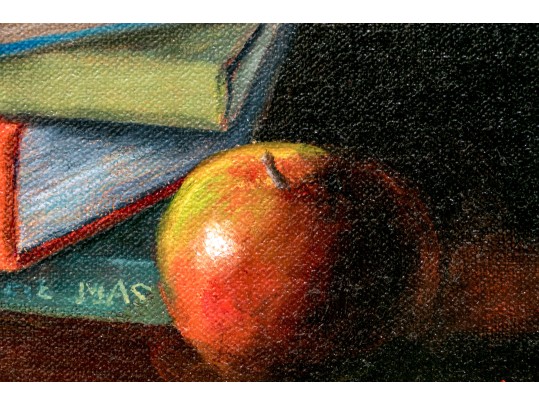 A fantastically painted still life scene depicting a table with contents including a stack of 7 books upon which a pair of glasses rests. A pocket watch with chain can also be seen dangling from one end of a book with a red glass bottle placed upon the corner of the third book from the bottom with a second blue glass bottle resting on the table. An apple can be seen placed just in front of the stack of books in the immediate foreground.