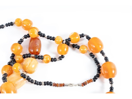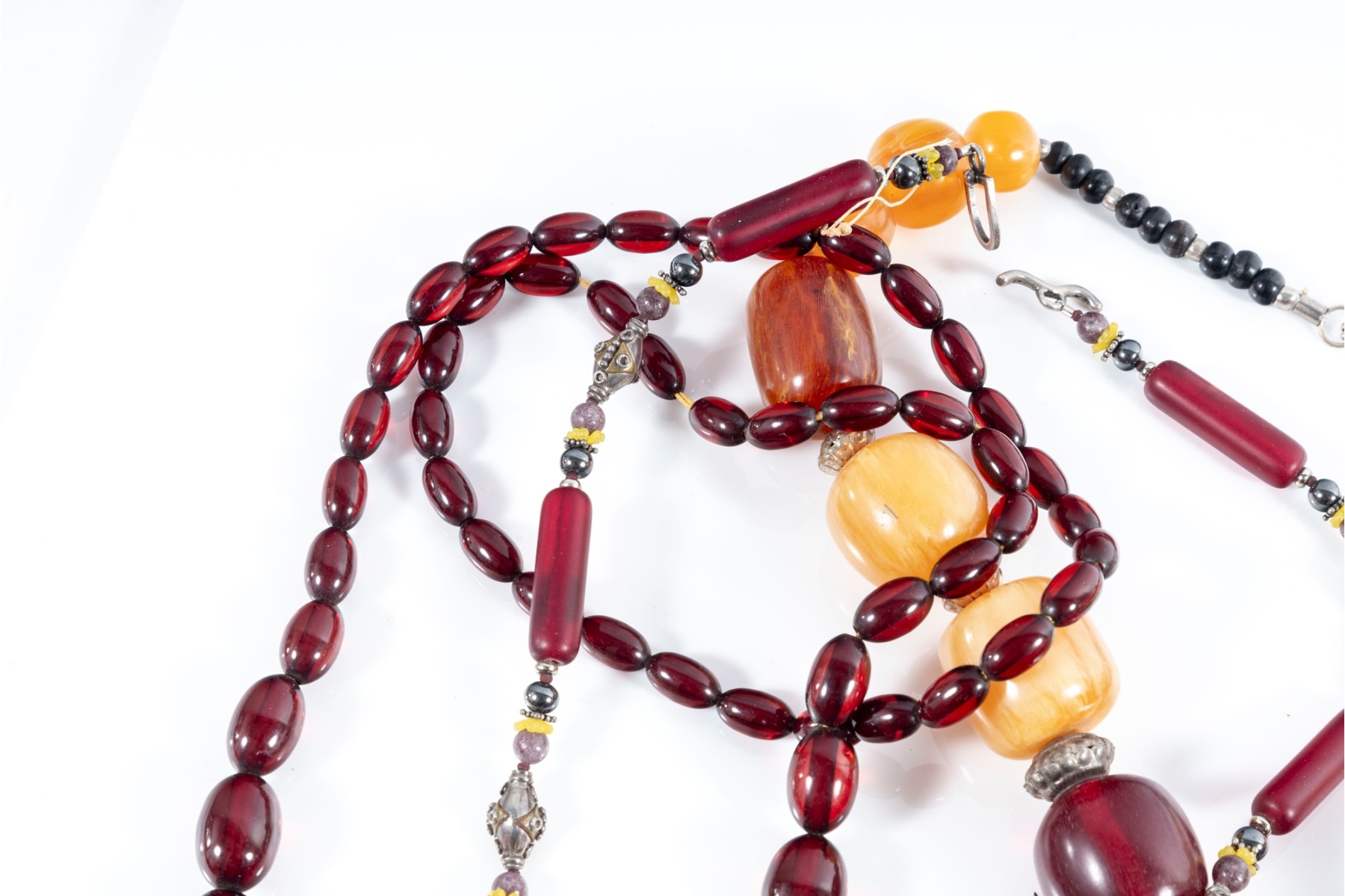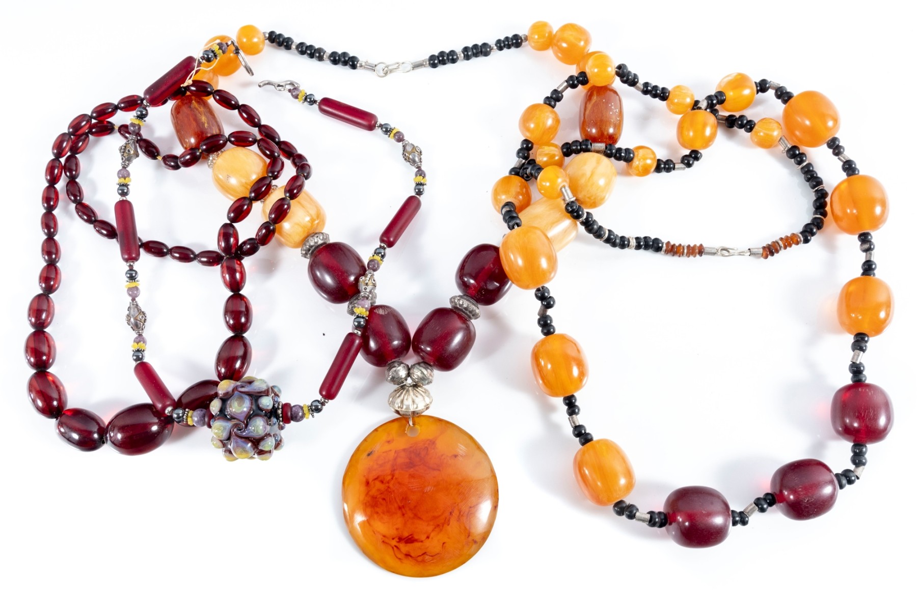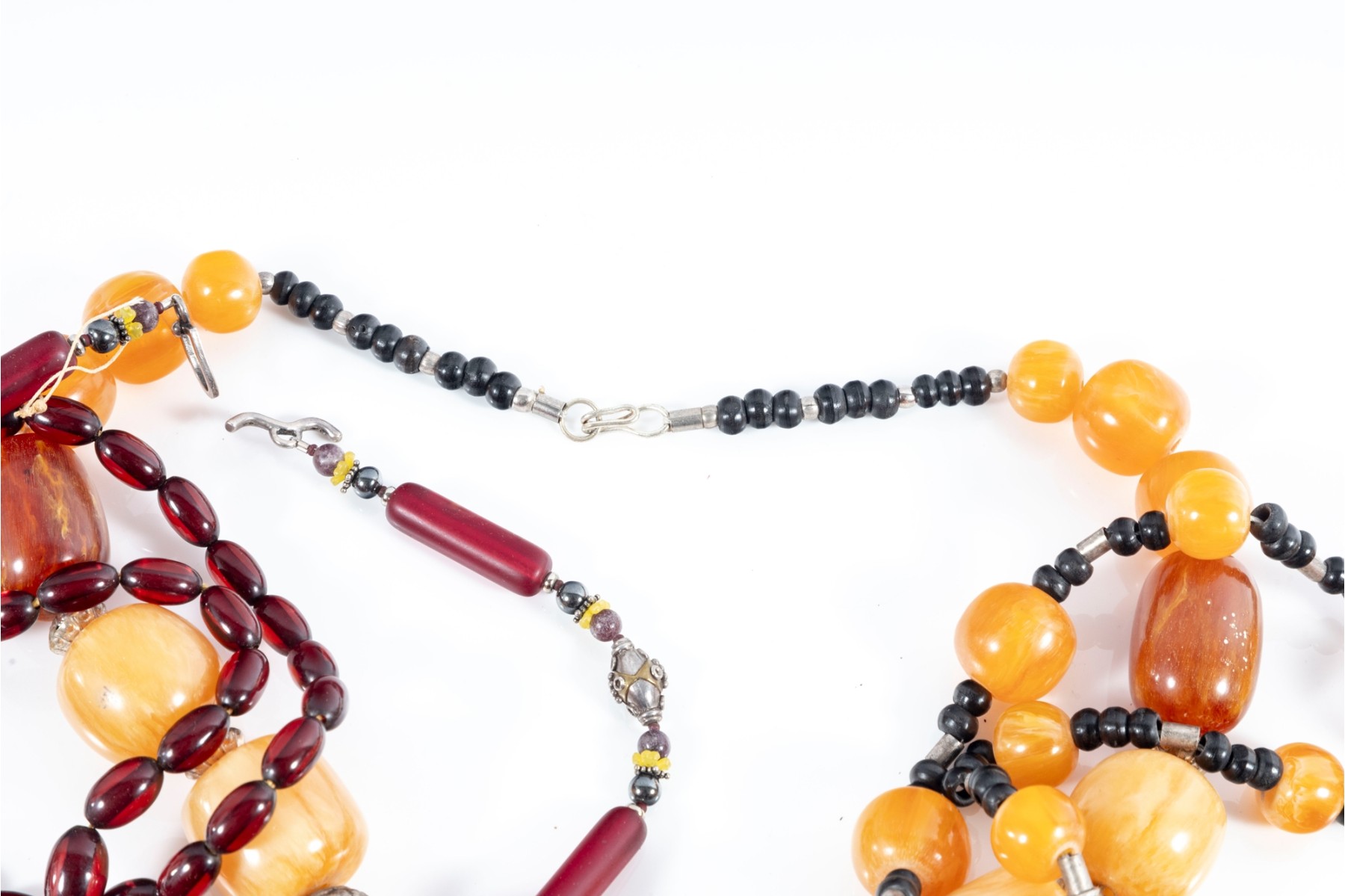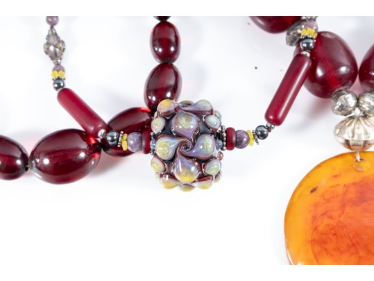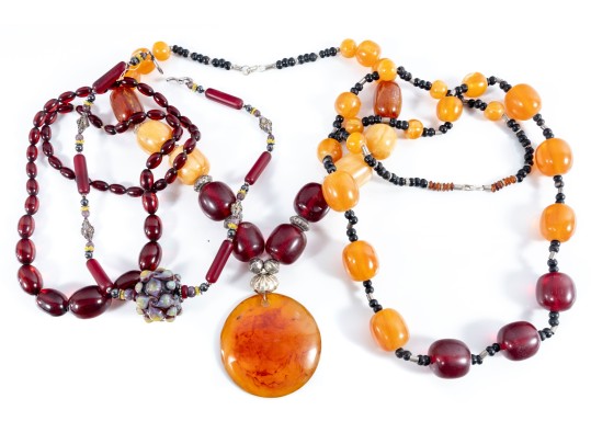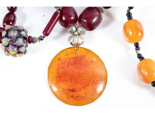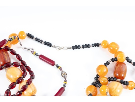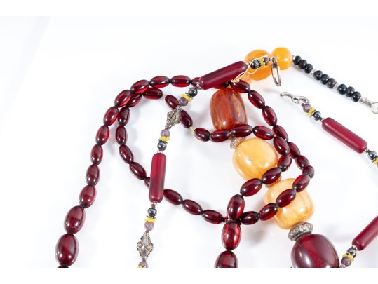 This lot contains a set of four largest string necklaces composed of resin beads. Contents as shown and sold as is, see photos for details.