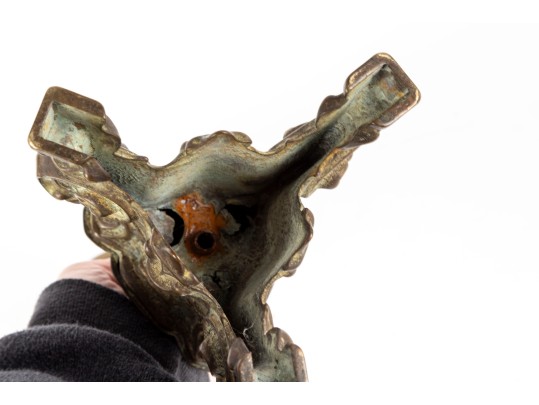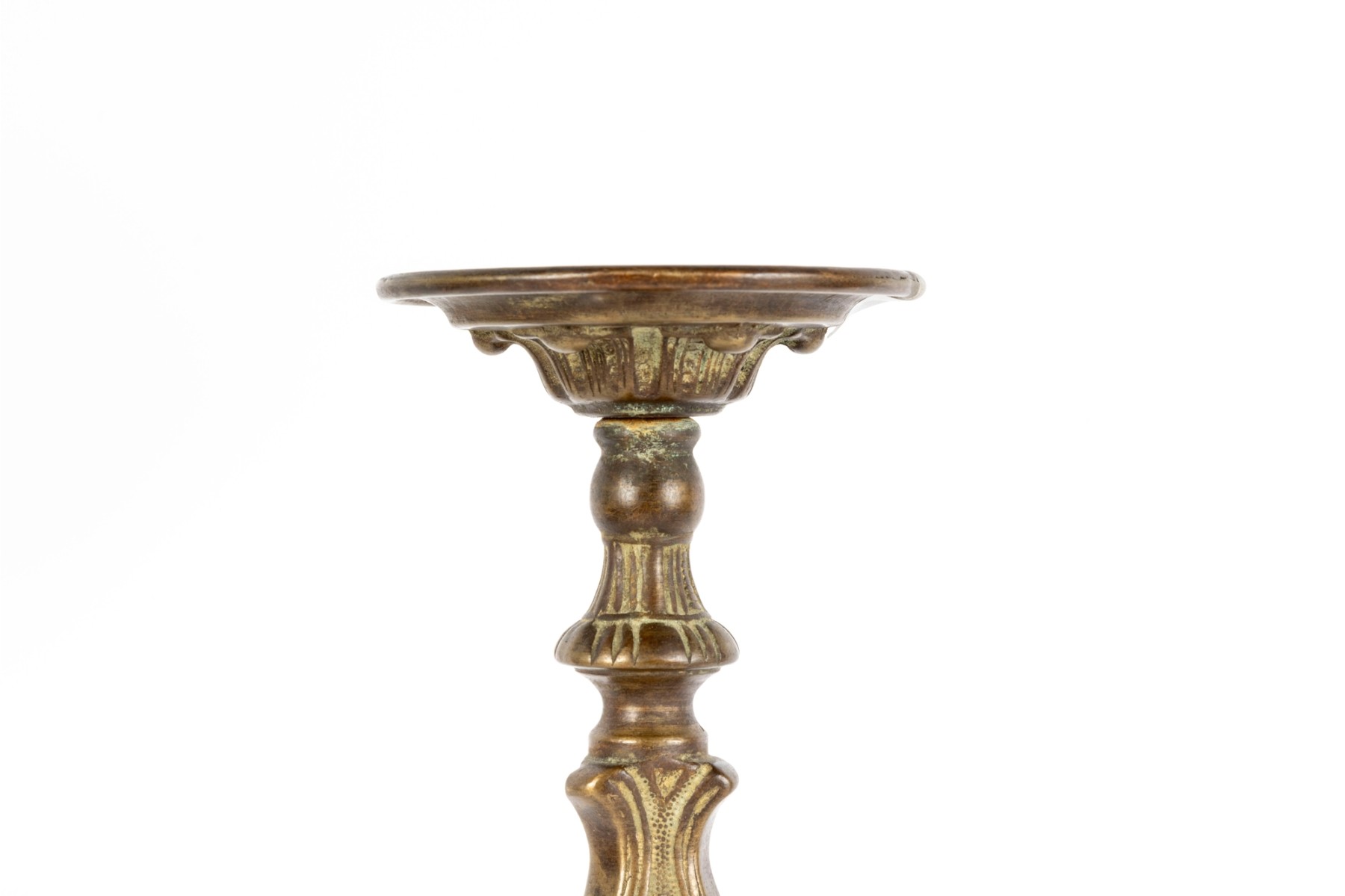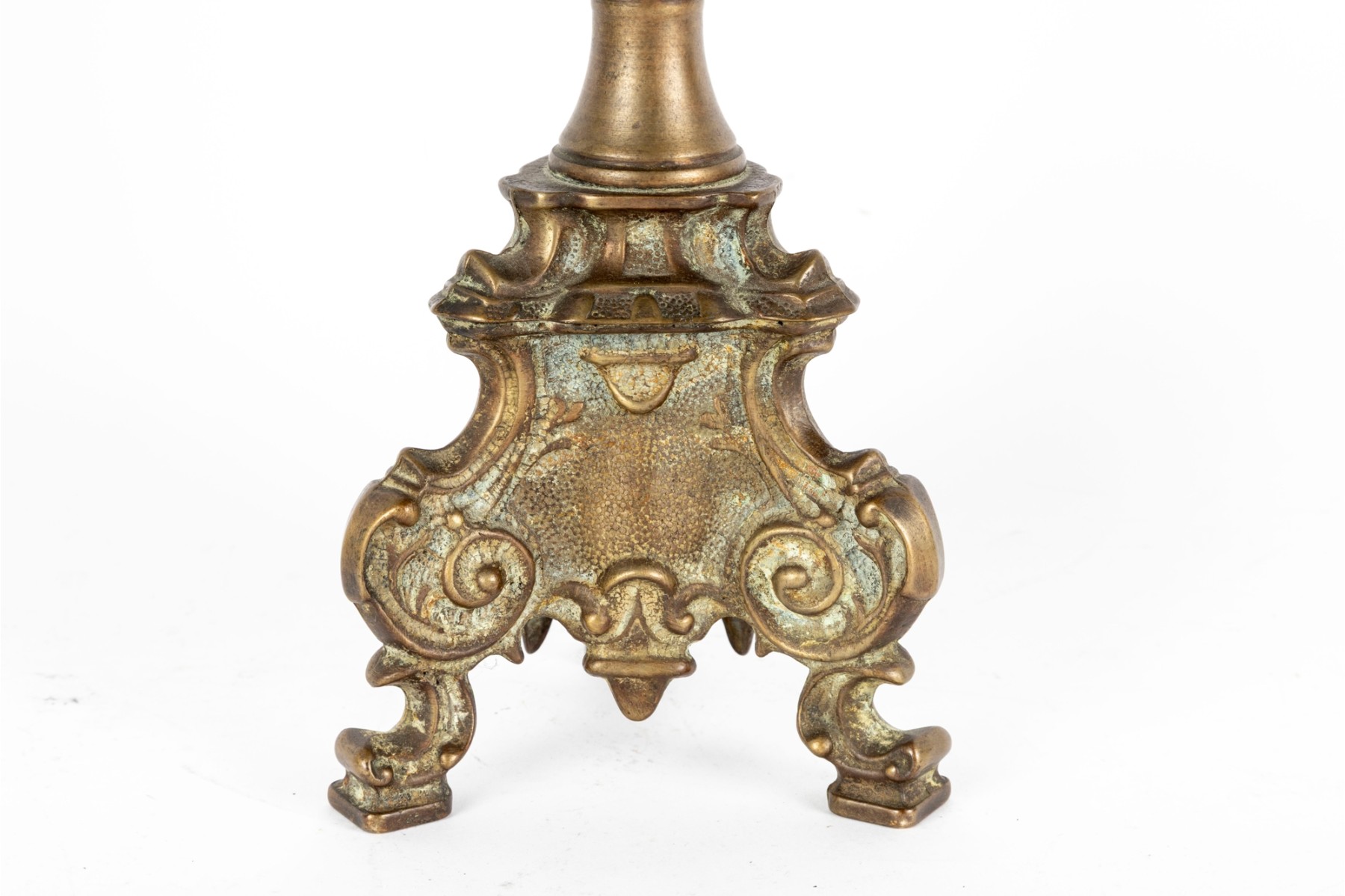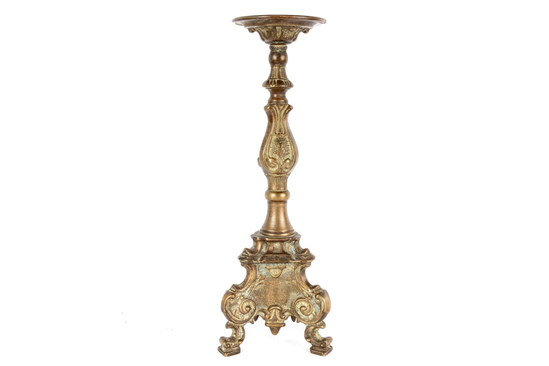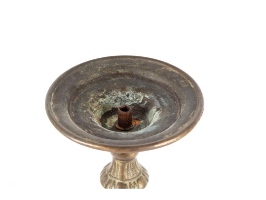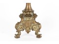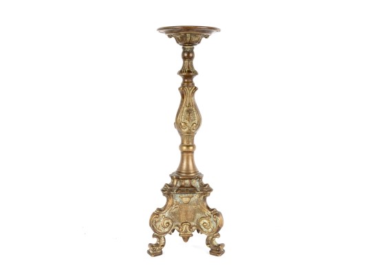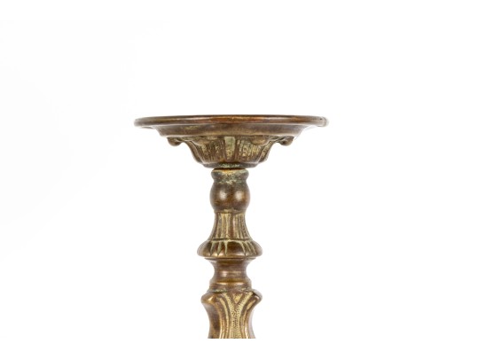 A beautiful antique brass altar candlestick designed with distinguished Rococo/Baroque elegance, showcasing a cylindrical tube at the center perhaps for a thin candlestick or to mount a pricket. The column is elaborately decorated with scrolled relief along a baluster form supported by a trefoil base with scrolled knees and flared square feet.