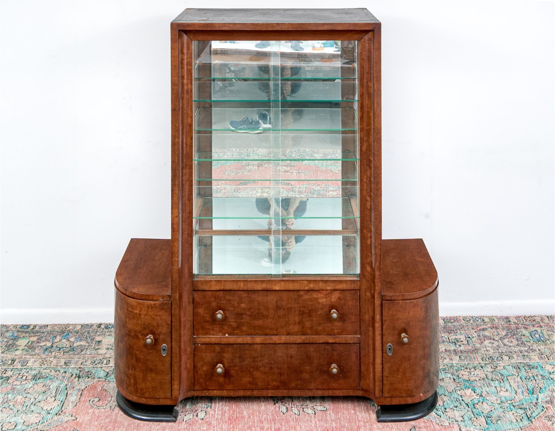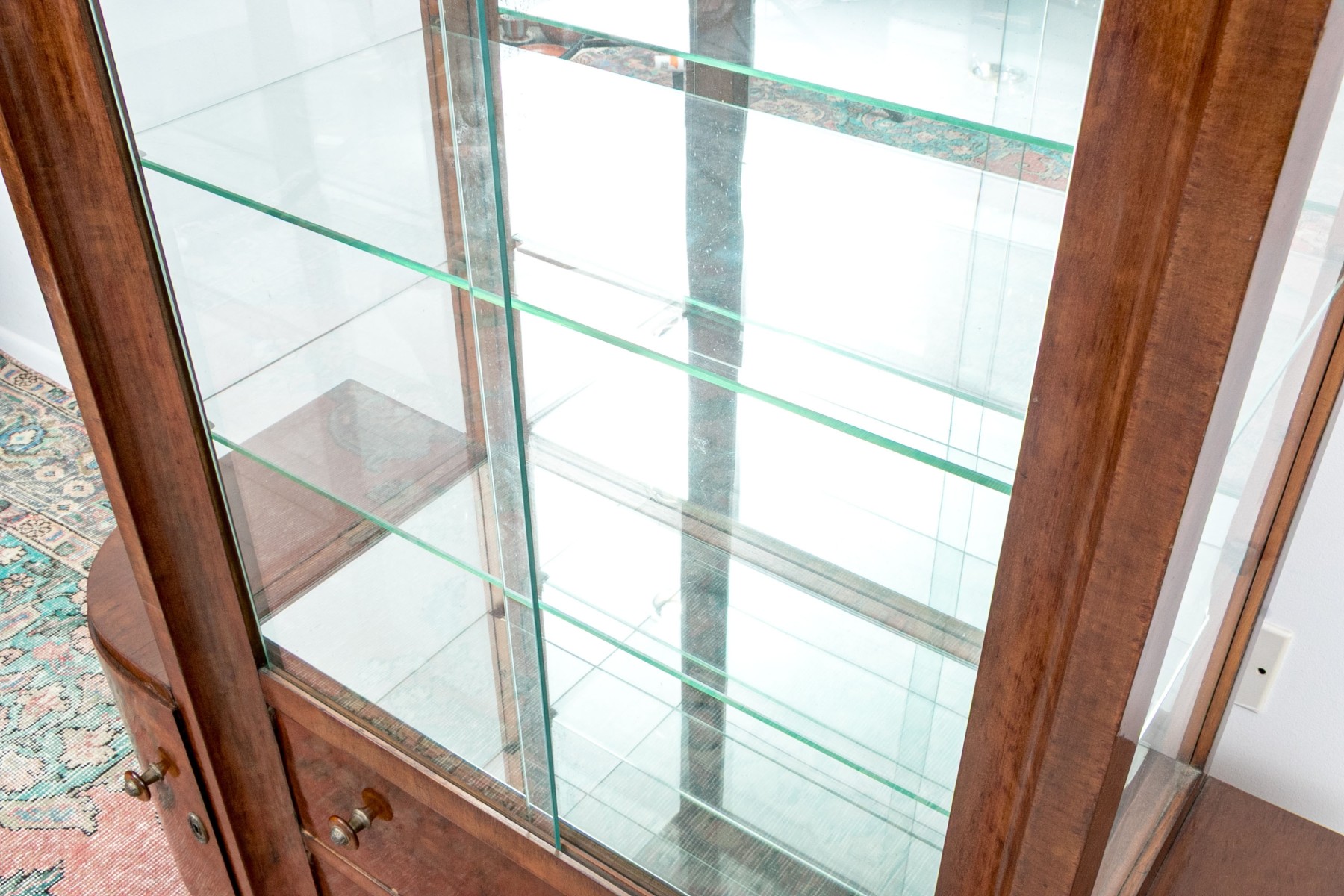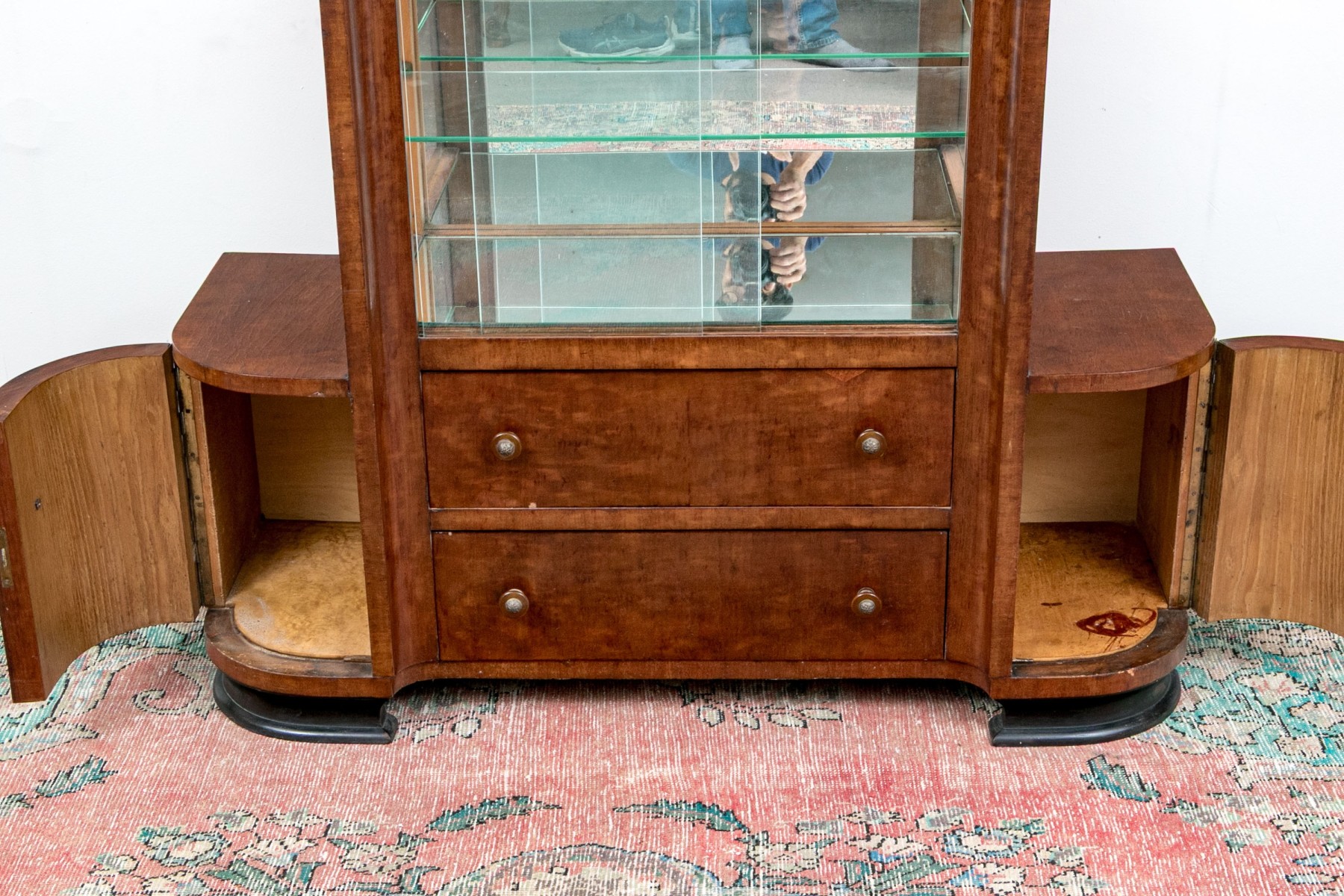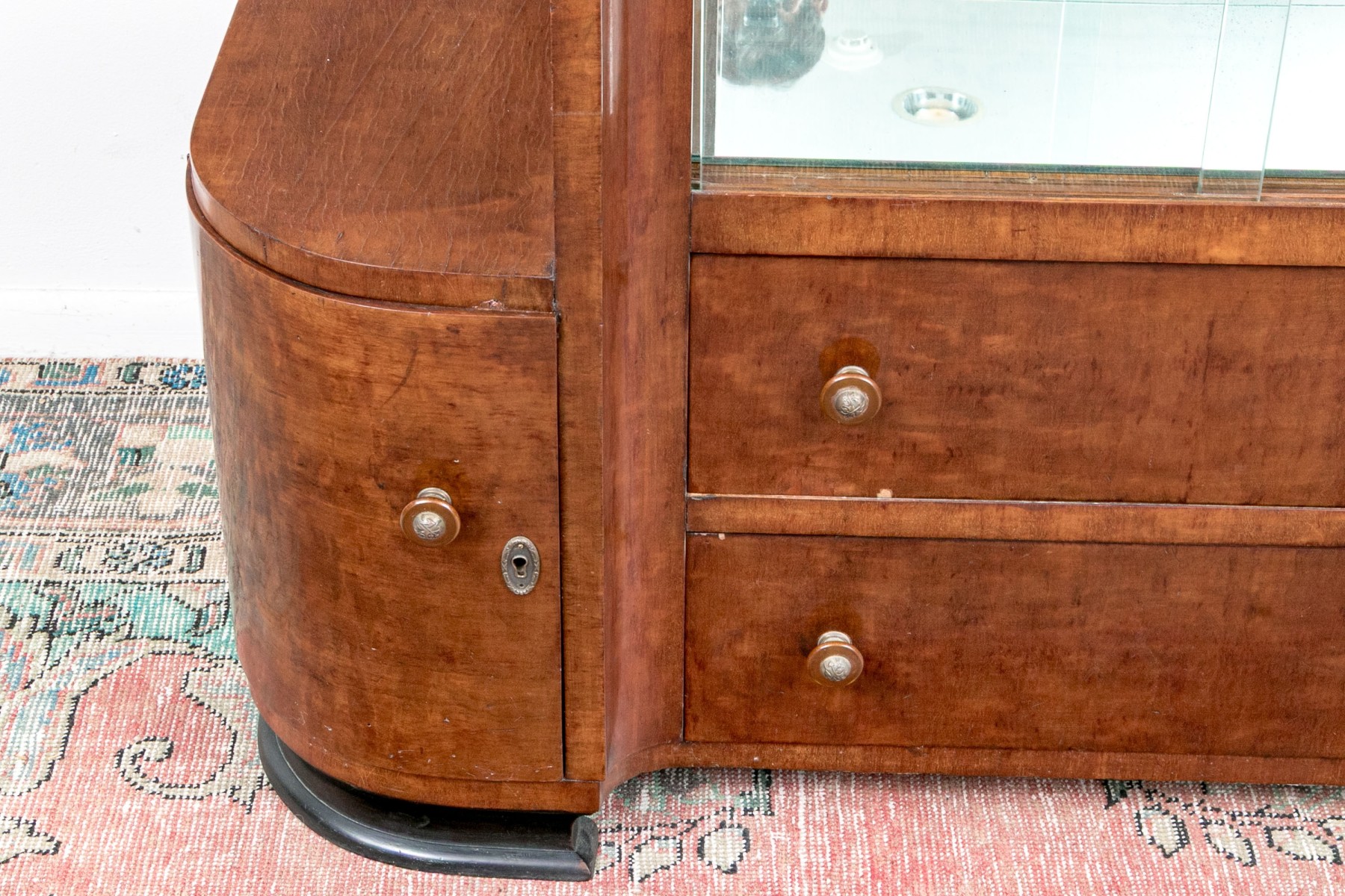 A gorgeous Art Deco display cabinet showcasing beautiful, warm-toned brown veneers and a rectangular case with a sliding door opening to three glass shelves against a mirrored back and ground. The case leads down to two dovetail drawers below with double knobs and curved cabinets to the sides appearing to float over a black base.