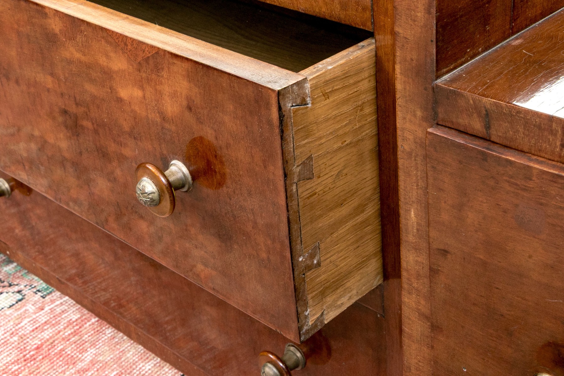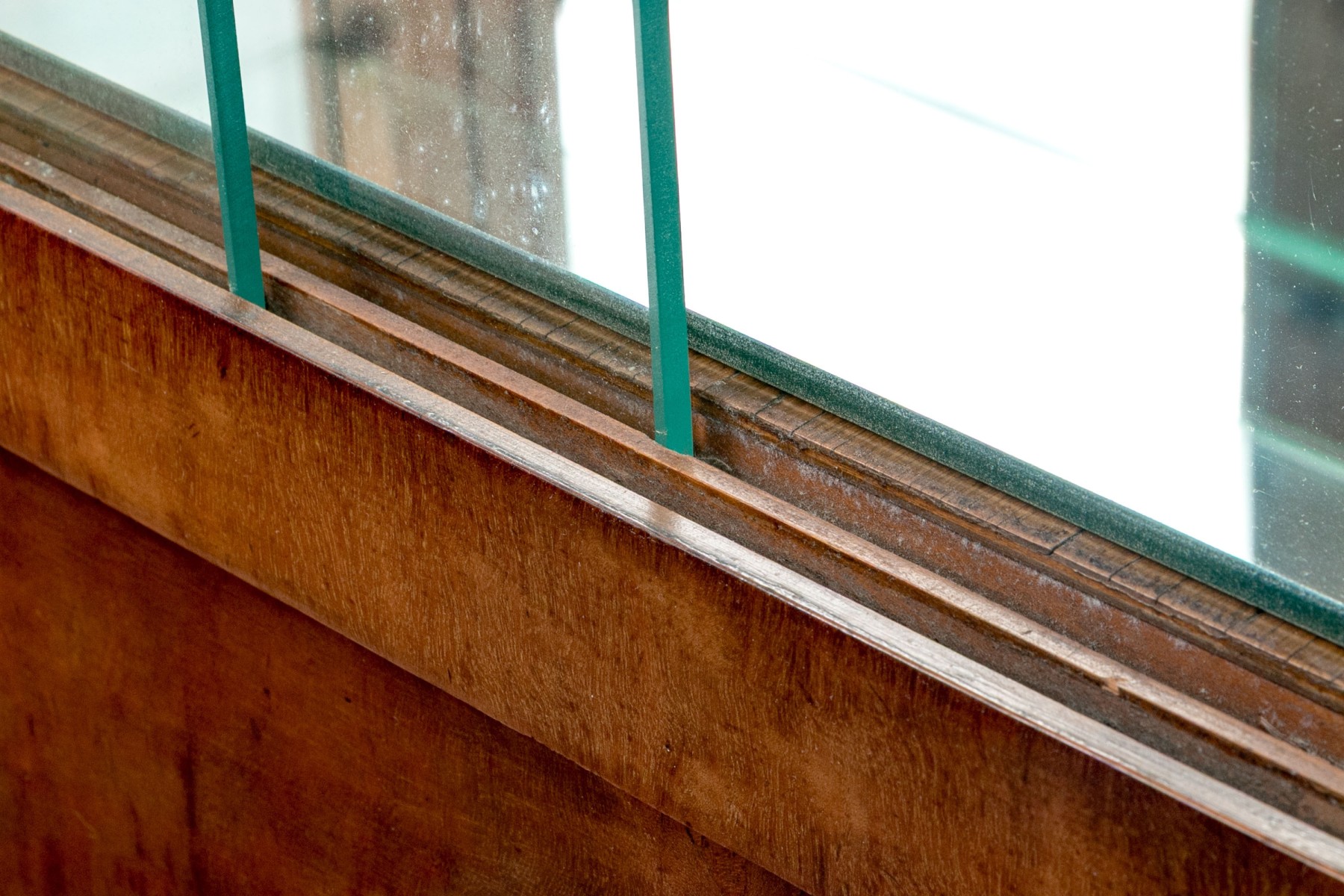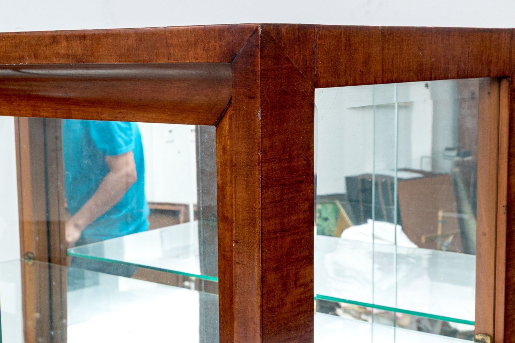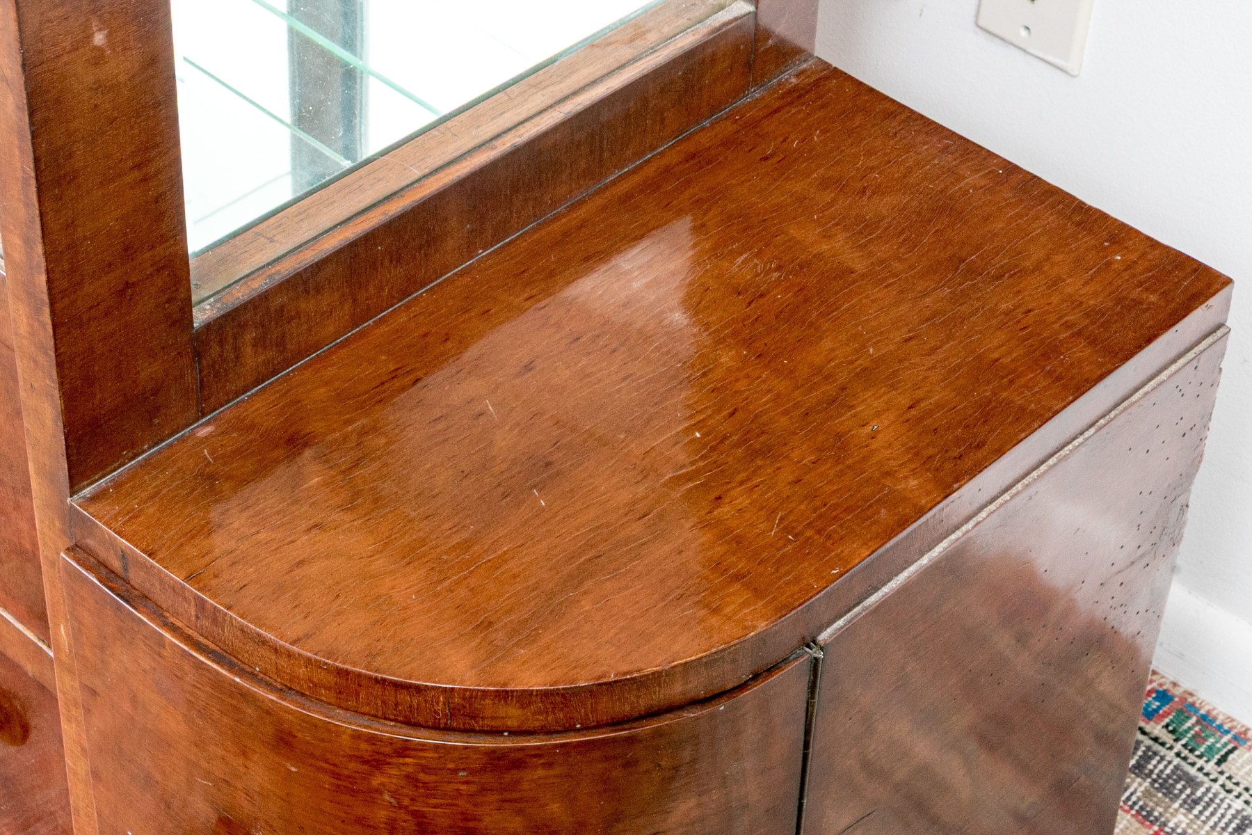 A gorgeous Art Deco display cabinet showcasing beautiful, warm-toned brown veneers and a rectangular case with a sliding door opening to three glass shelves against a mirrored back and ground. The case leads down to two dovetail drawers below with double knobs and curved cabinets to the sides appearing to float over a black base.