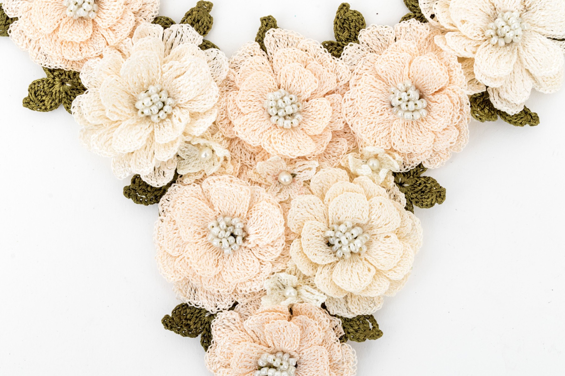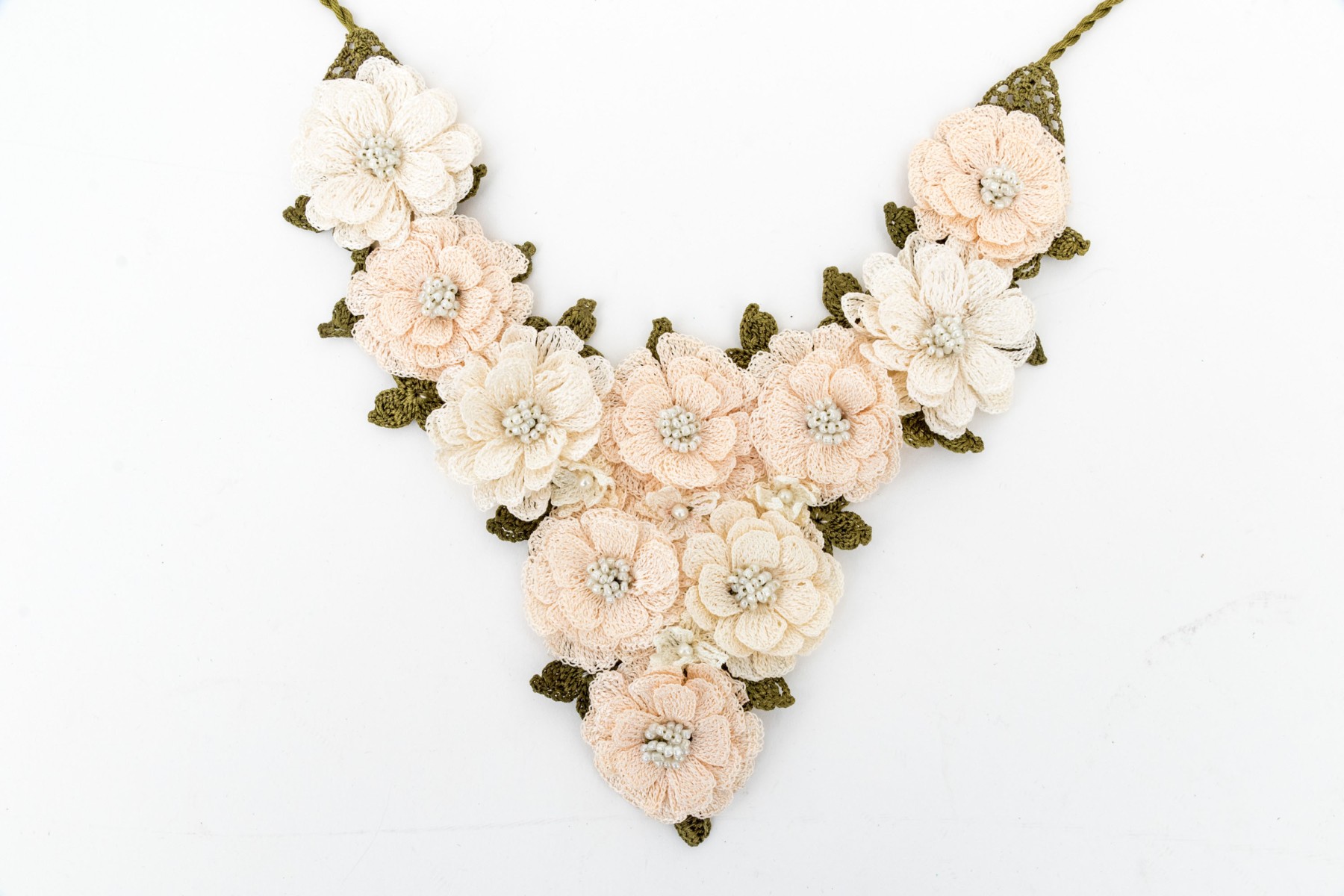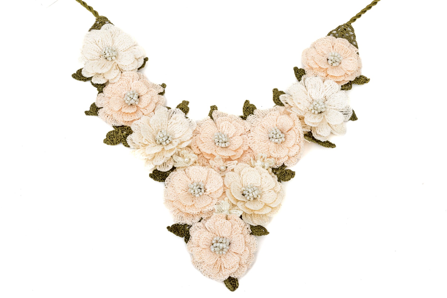 Soft pink-toned flowers with beaded centers on a green-toned necklace.