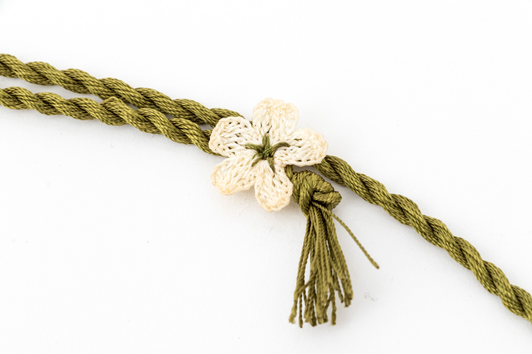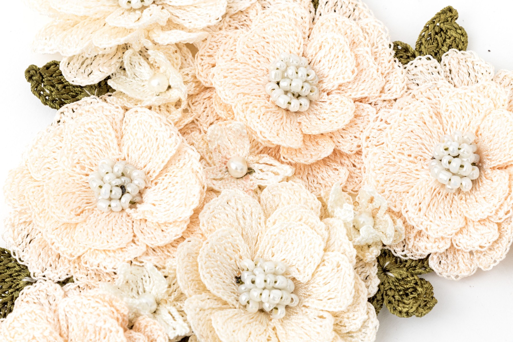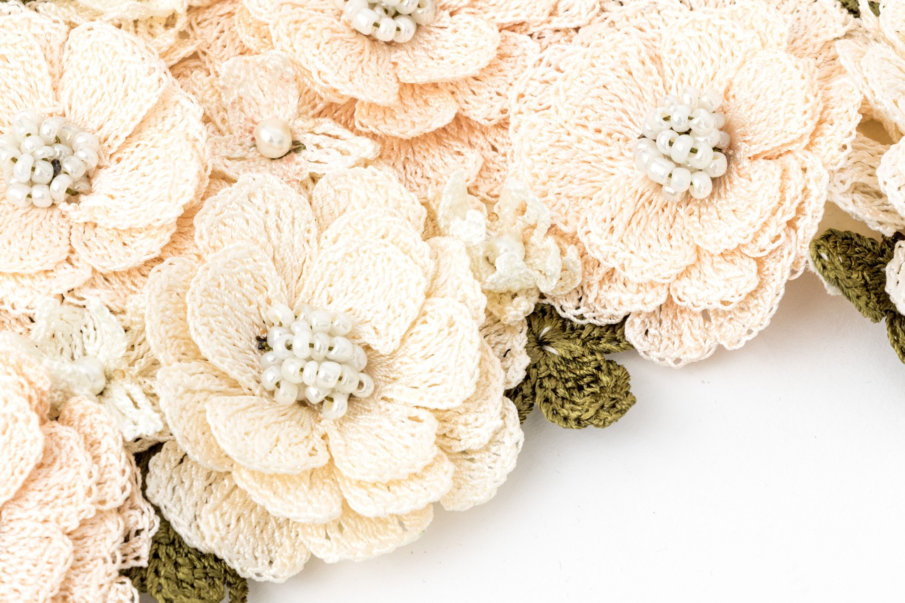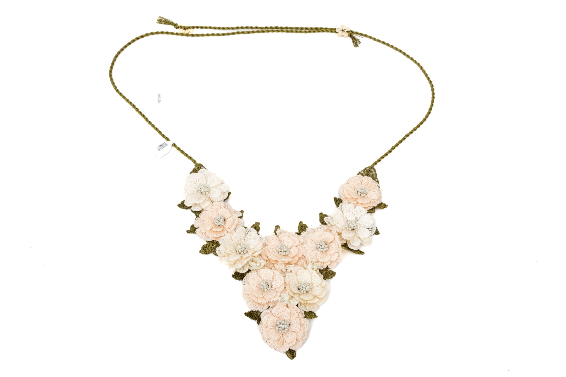 Soft pink-toned flowers with beaded centers on a green-toned necklace.