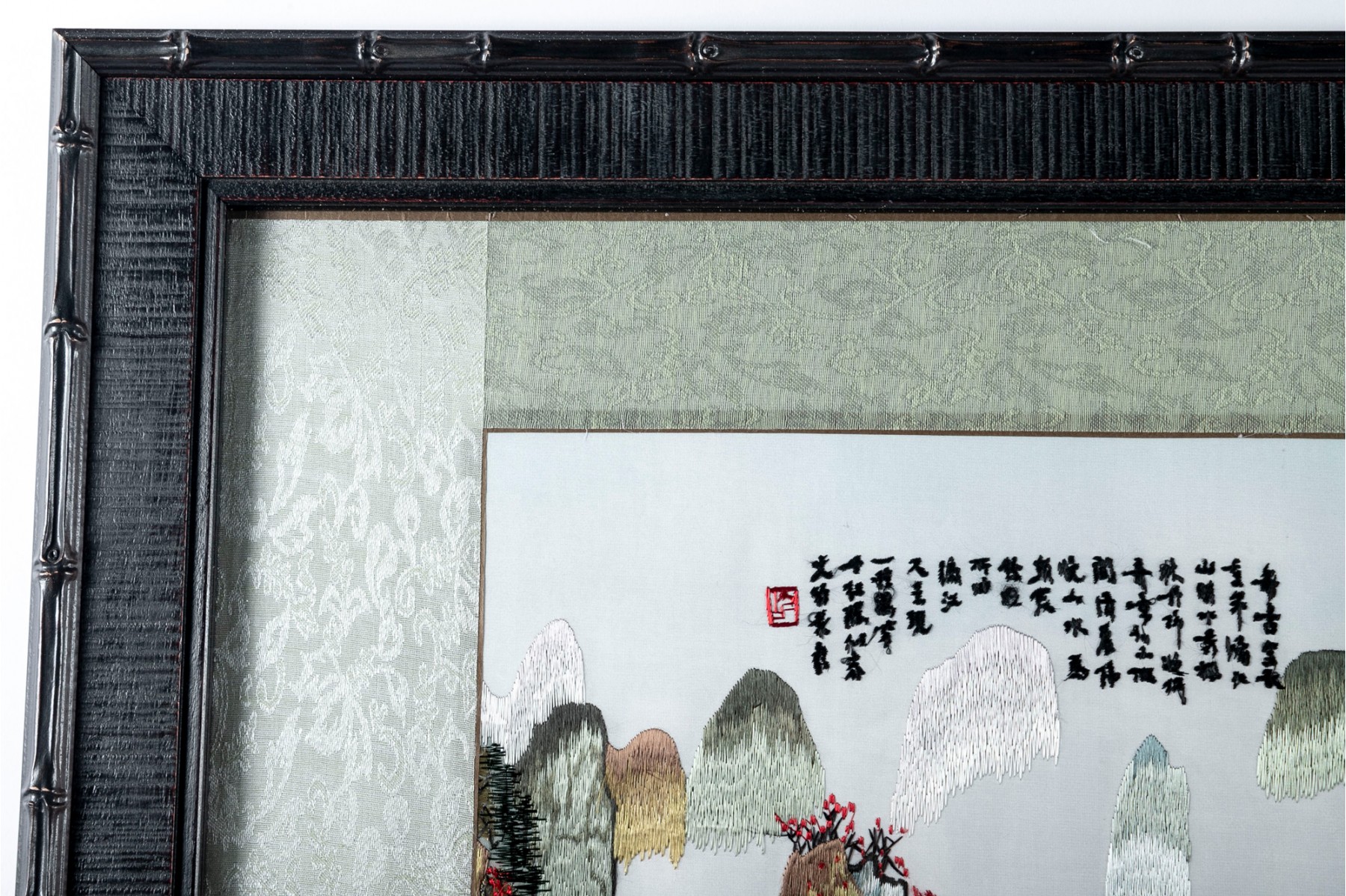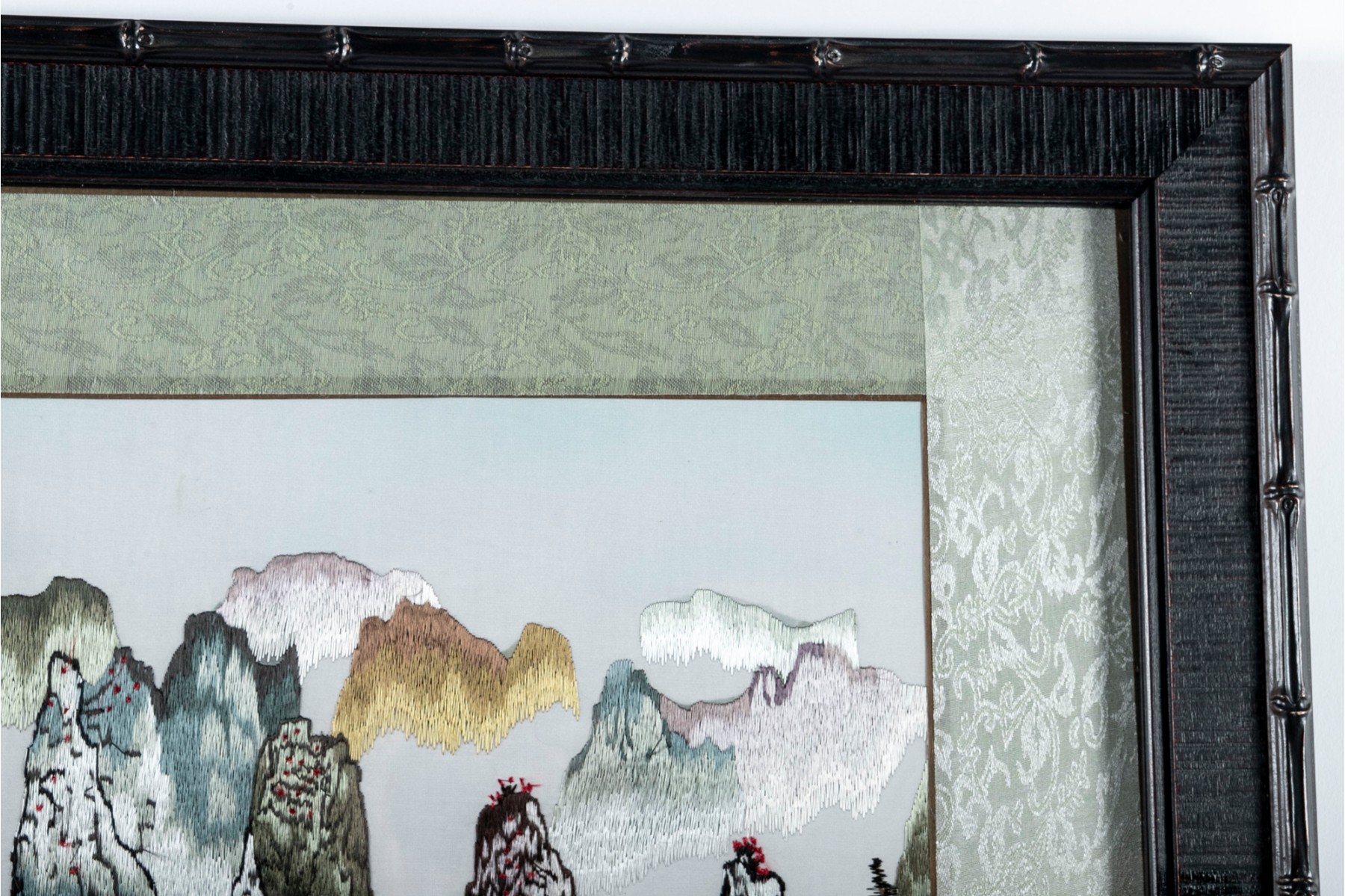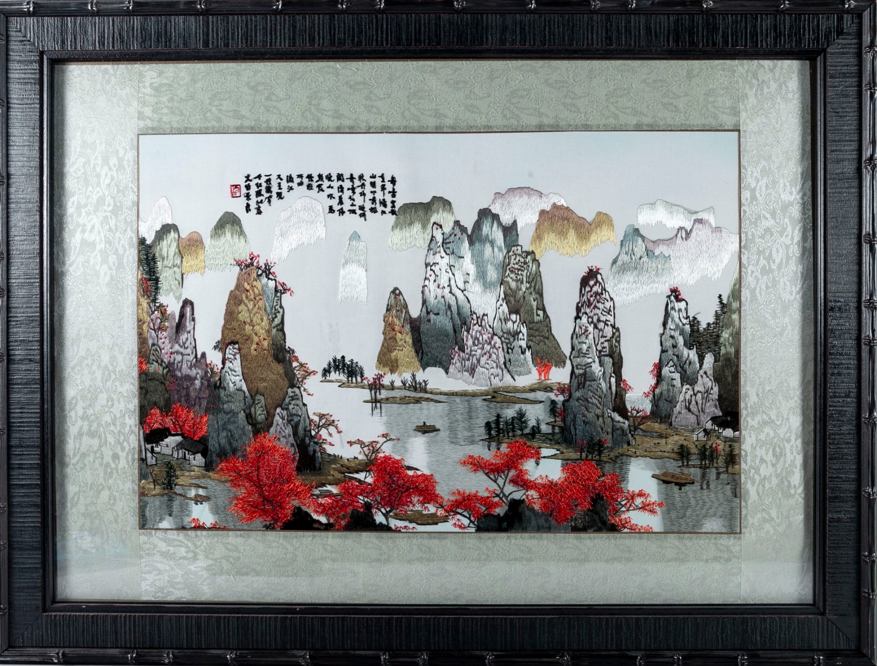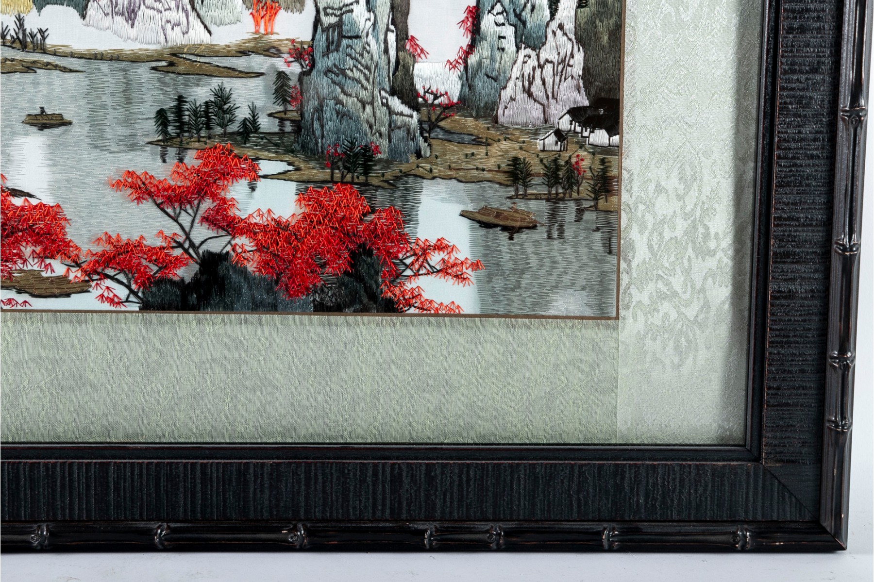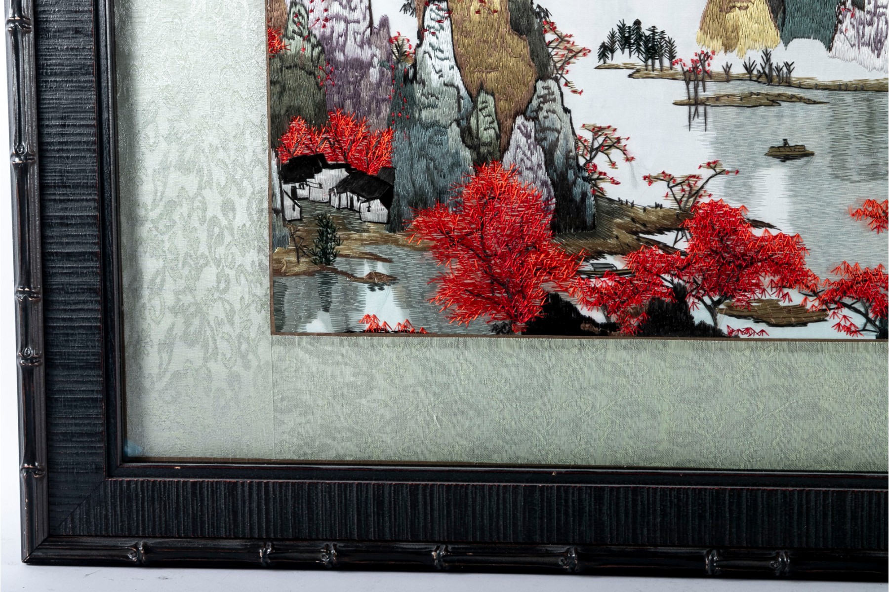 A beautiful Asian embroidery depicting towering mountains along a calm, pale blue lake surrounded by striking red maple trees. Displayed behind glass with a light sage green jacquard border, within a black frame with hints of warm undertones and a faux bamboo design.