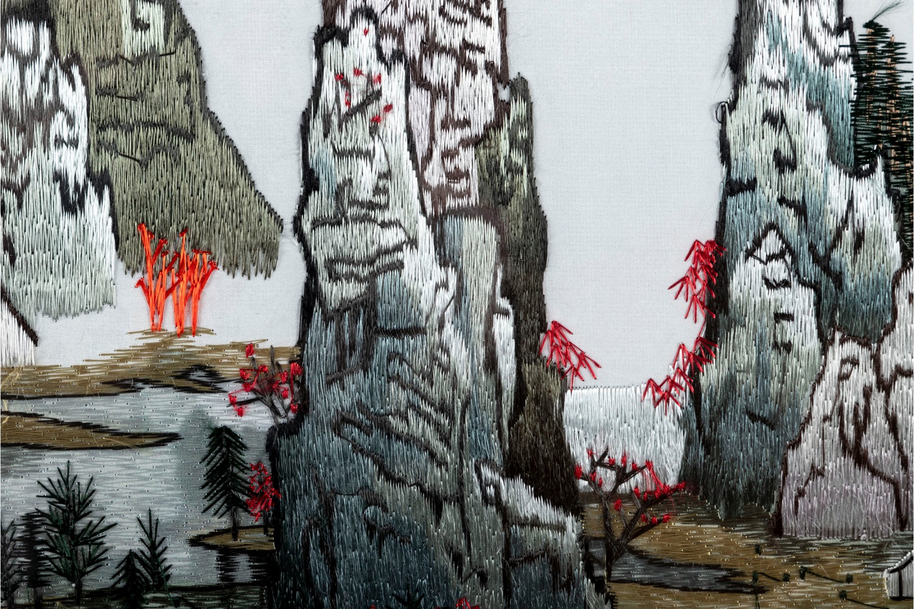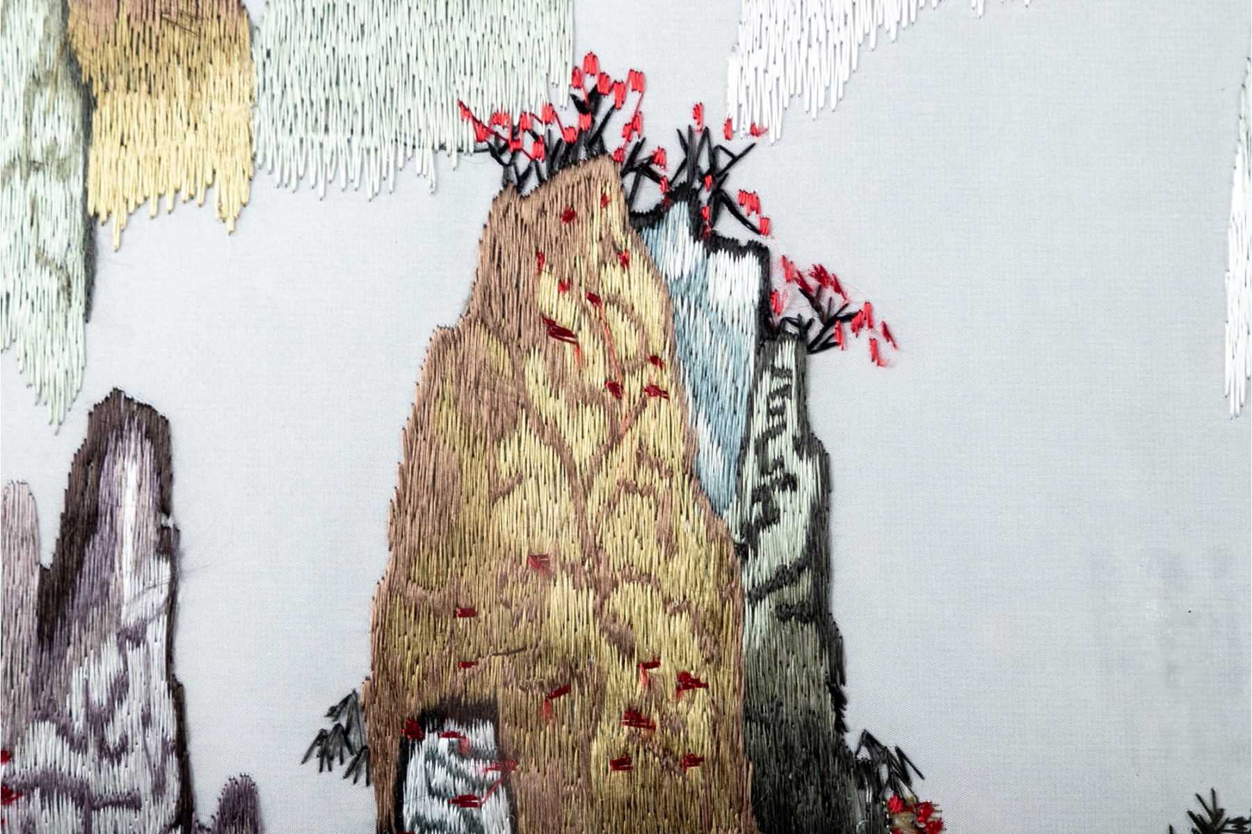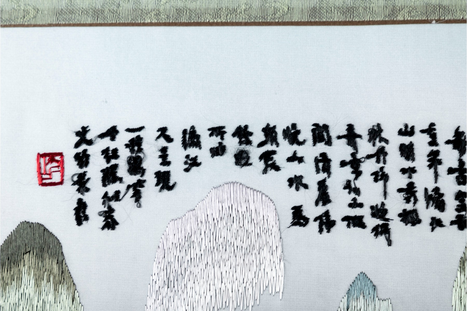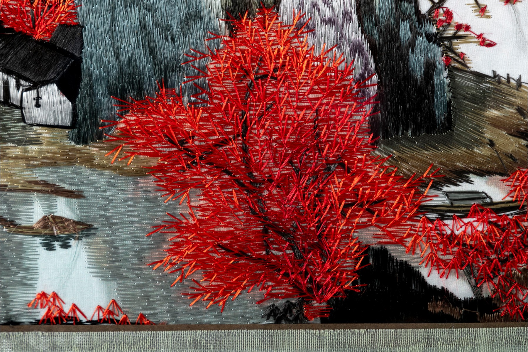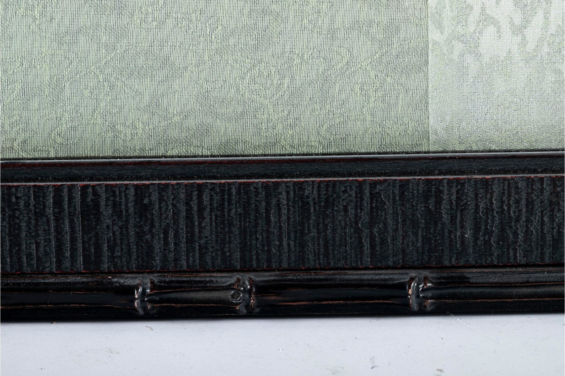 A beautiful Asian embroidery depicting towering mountains along a calm, pale blue lake surrounded by striking red maple trees. Displayed behind glass with a light sage green jacquard border, within a black frame with hints of warm undertones and a faux bamboo design.