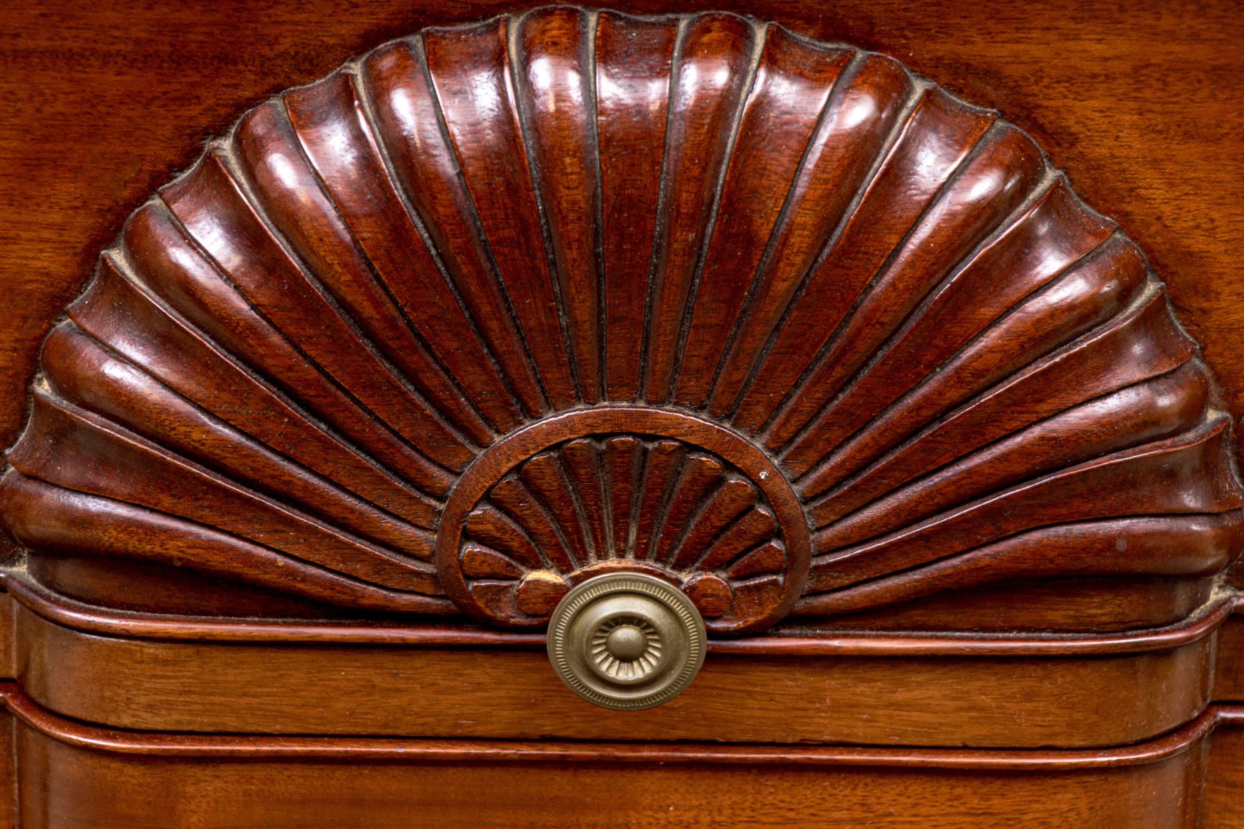 On four short cabriole legs with four drawers, each with brass batwing pulls with the top drawer having three carved shells with a pair of brass knob pulls.