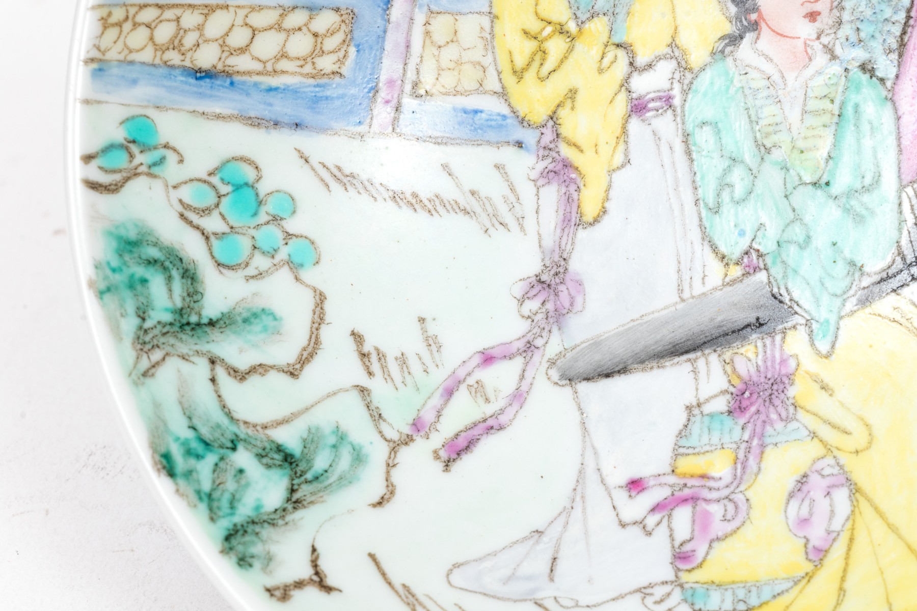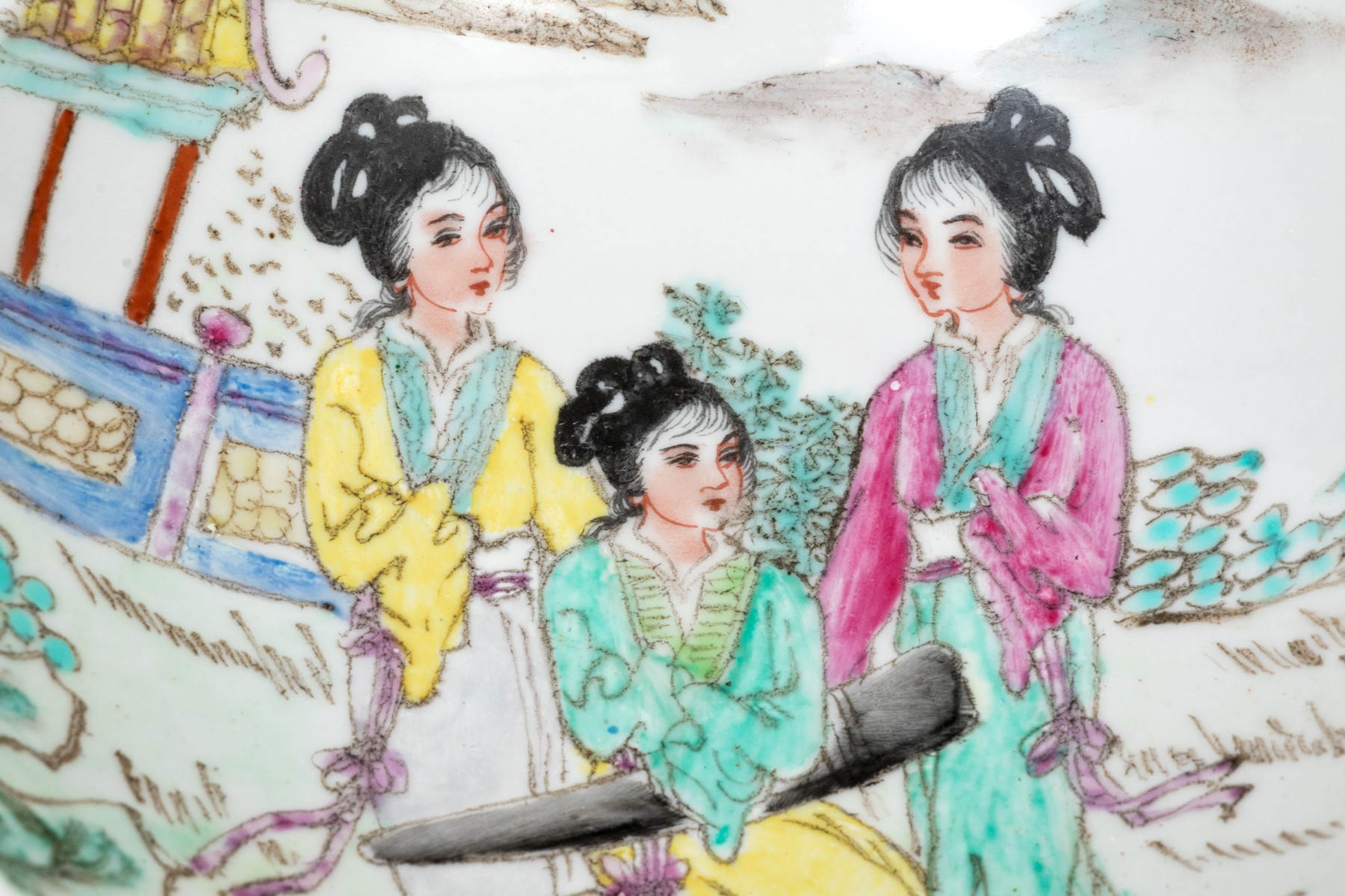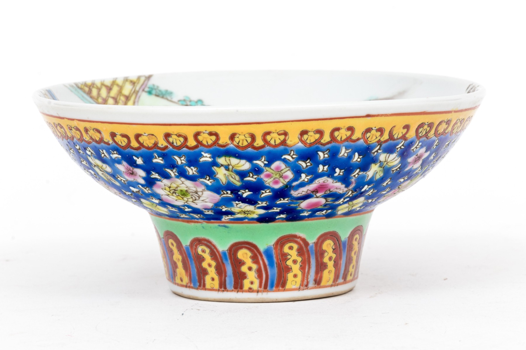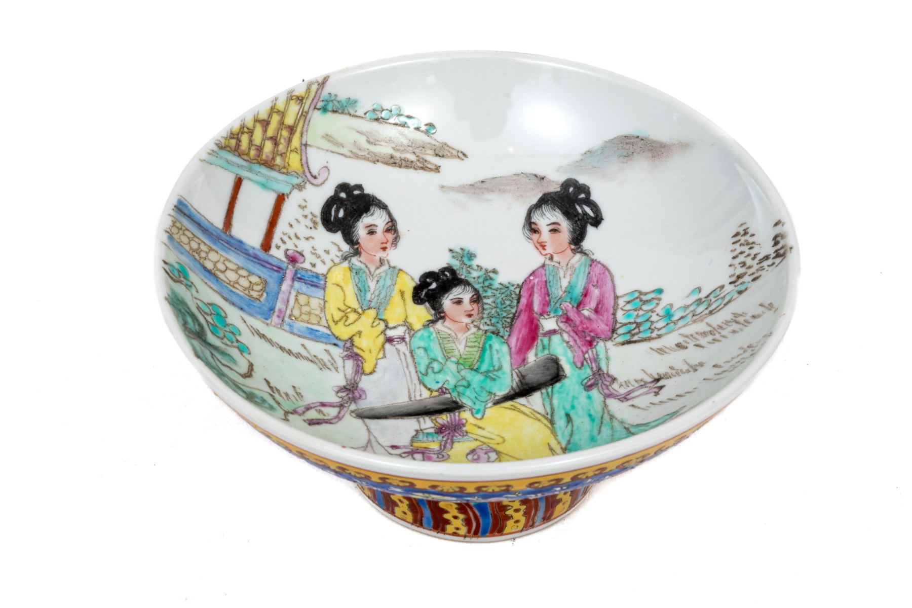 Beautiful famille rose pedestal bowl with maidens in an architectural landscape
