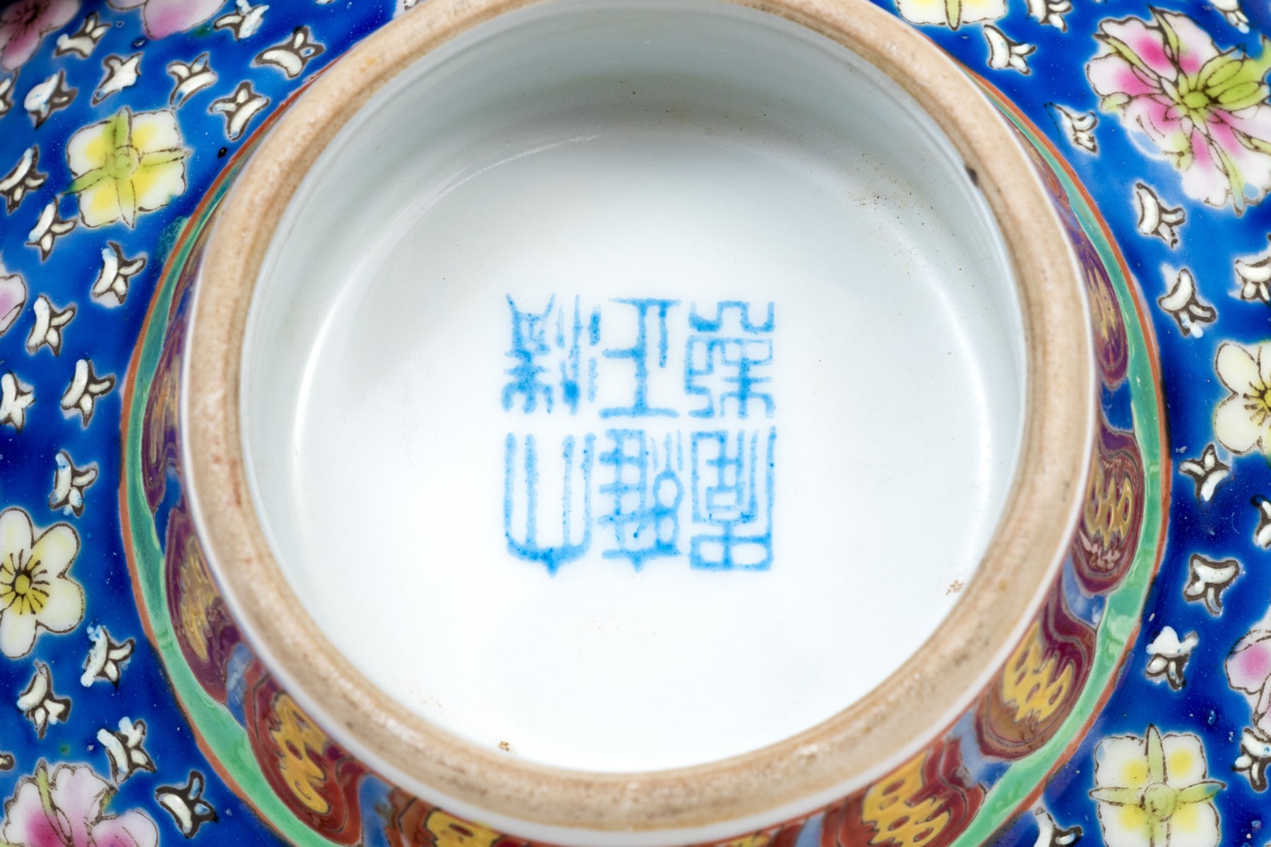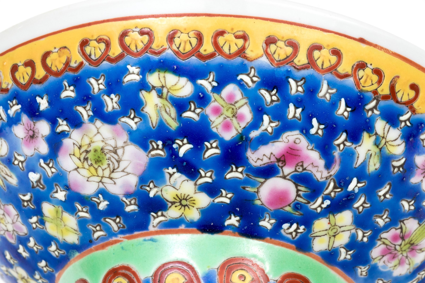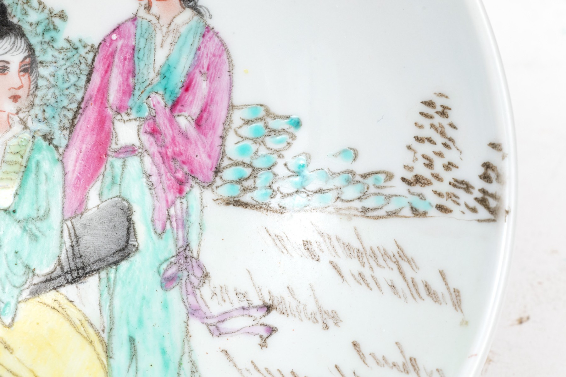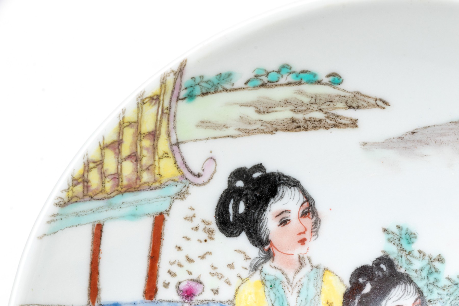 Beautiful famille rose pedestal bowl with maidens in an architectural landscape