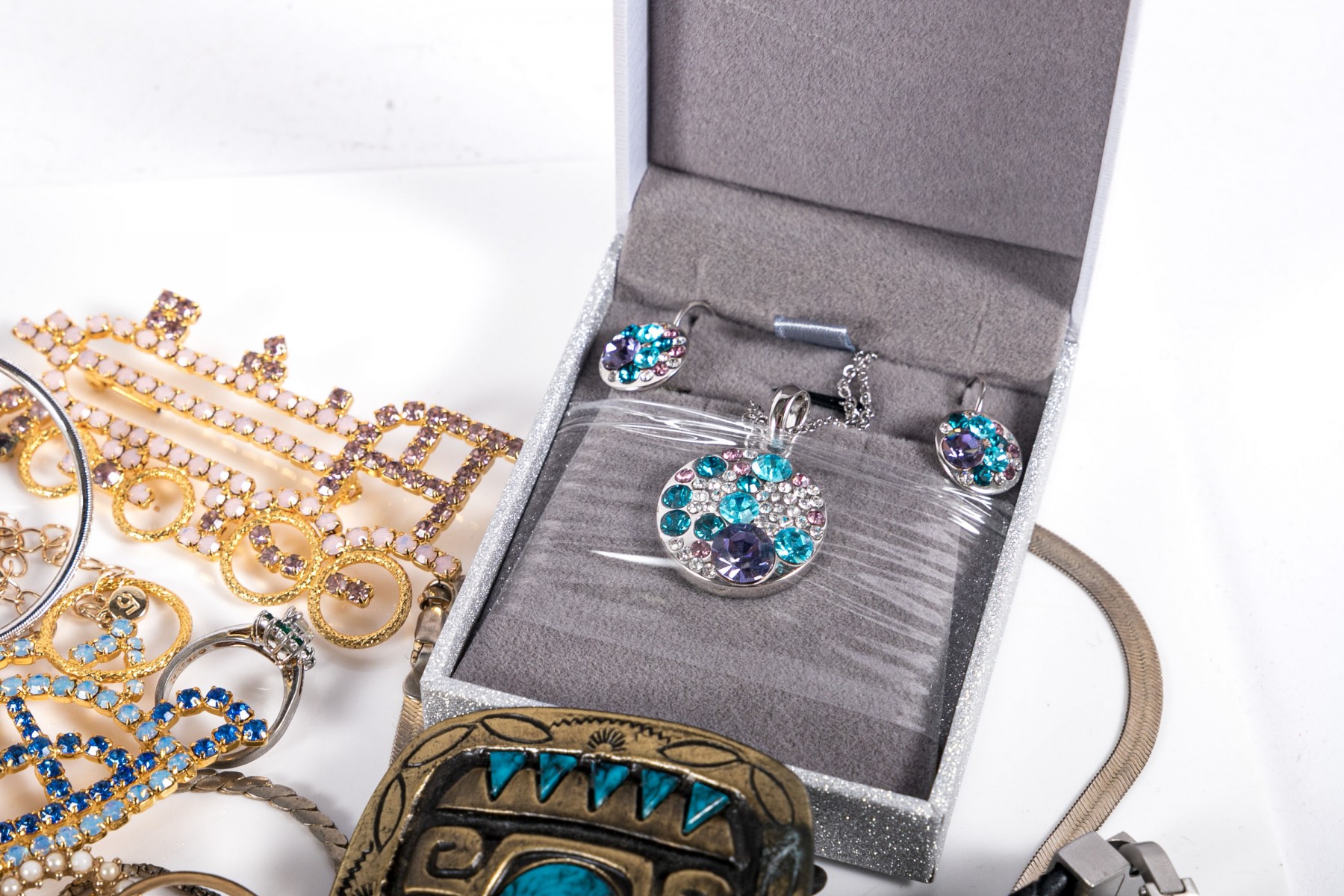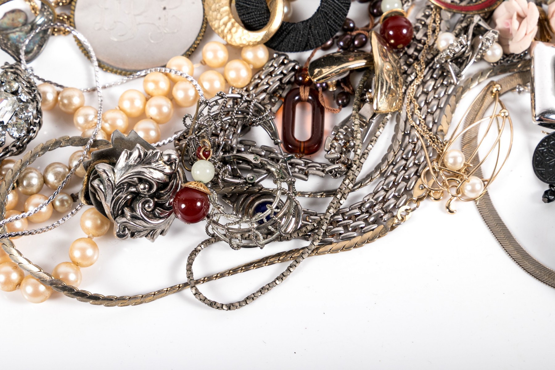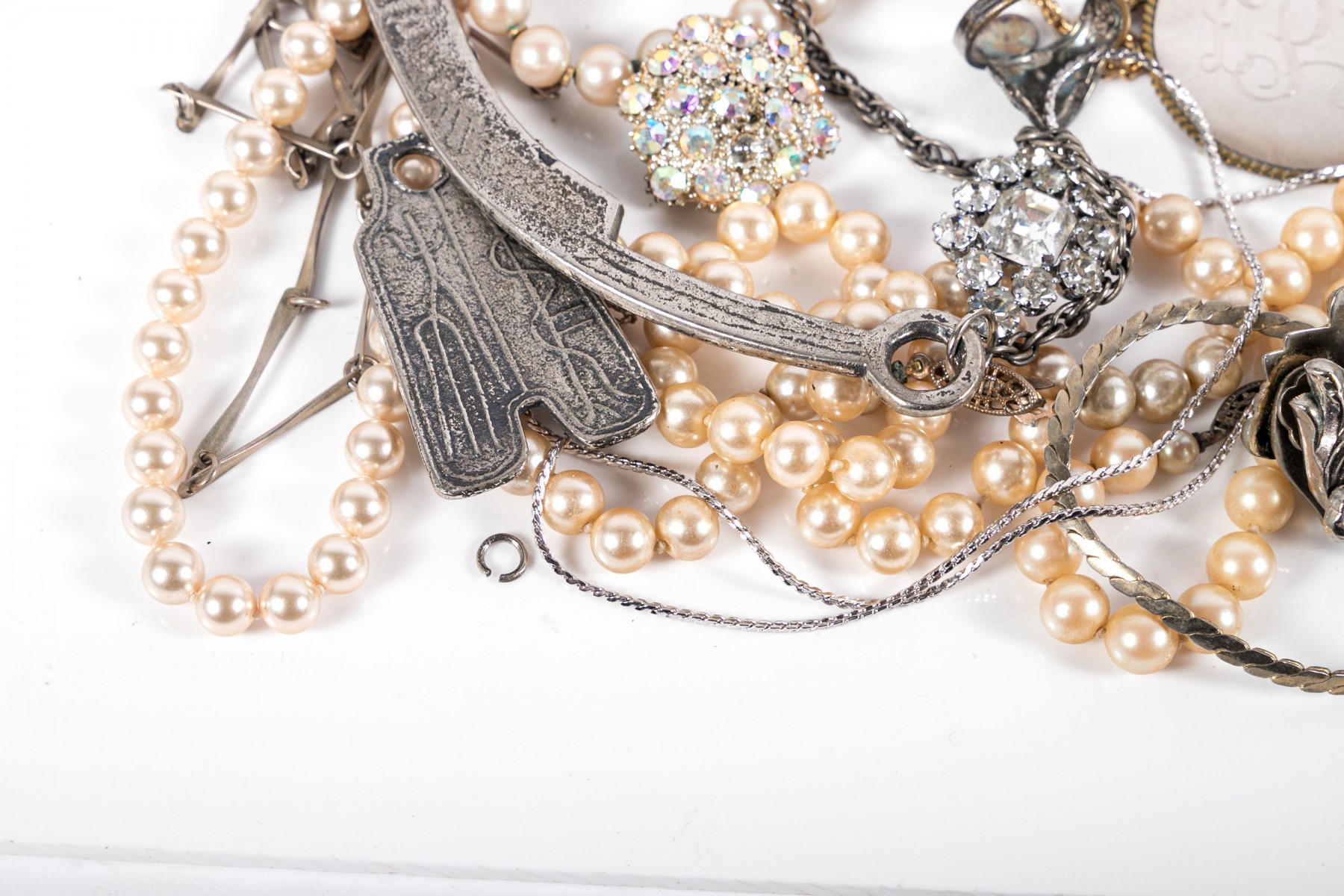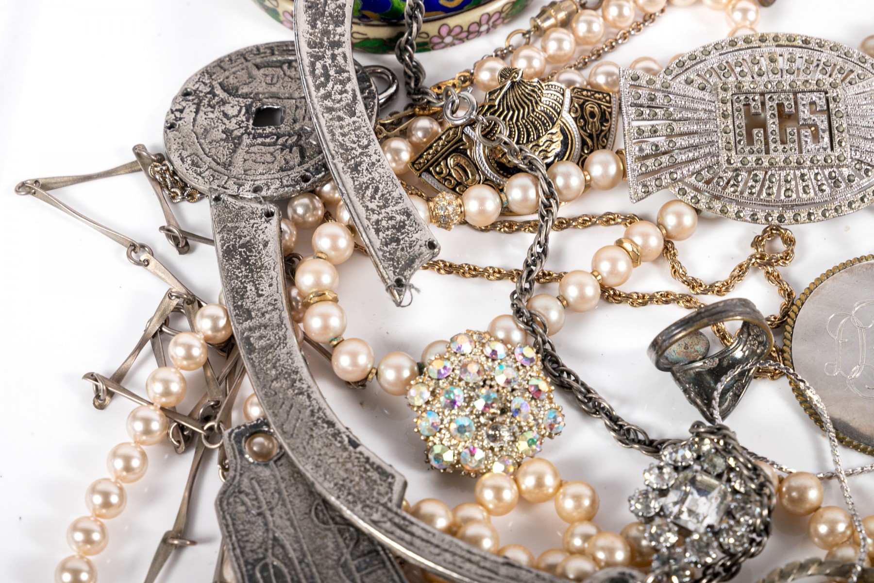 A collection of beautiful fashion jewelry, some sterling. Includes a variety of faux pearl pieces, and one cultured pearl piece with black pearls on brown cord. Includes cloisonne bangles, gray metal chains, and pieces with pretty rhinestone accents.