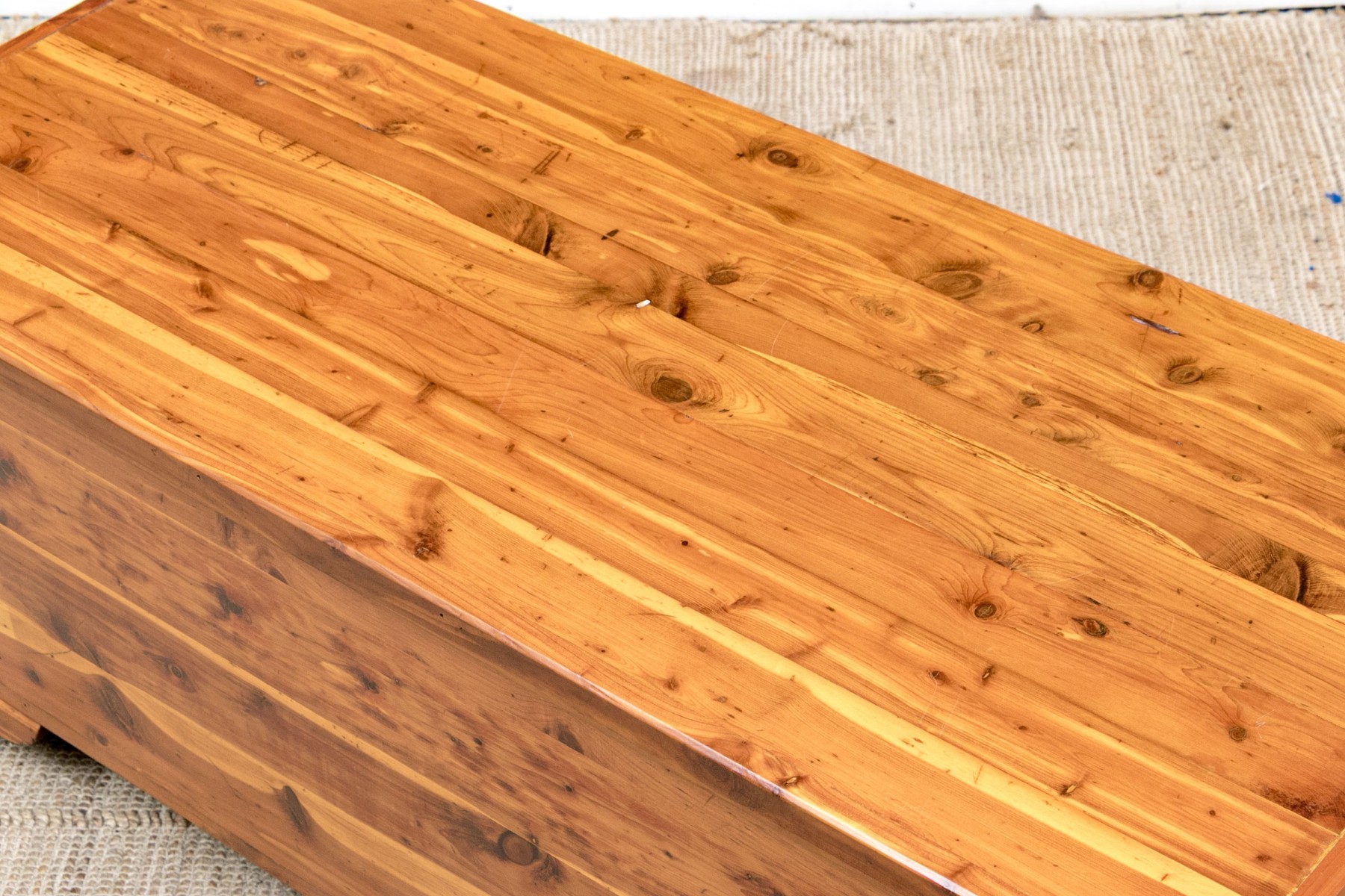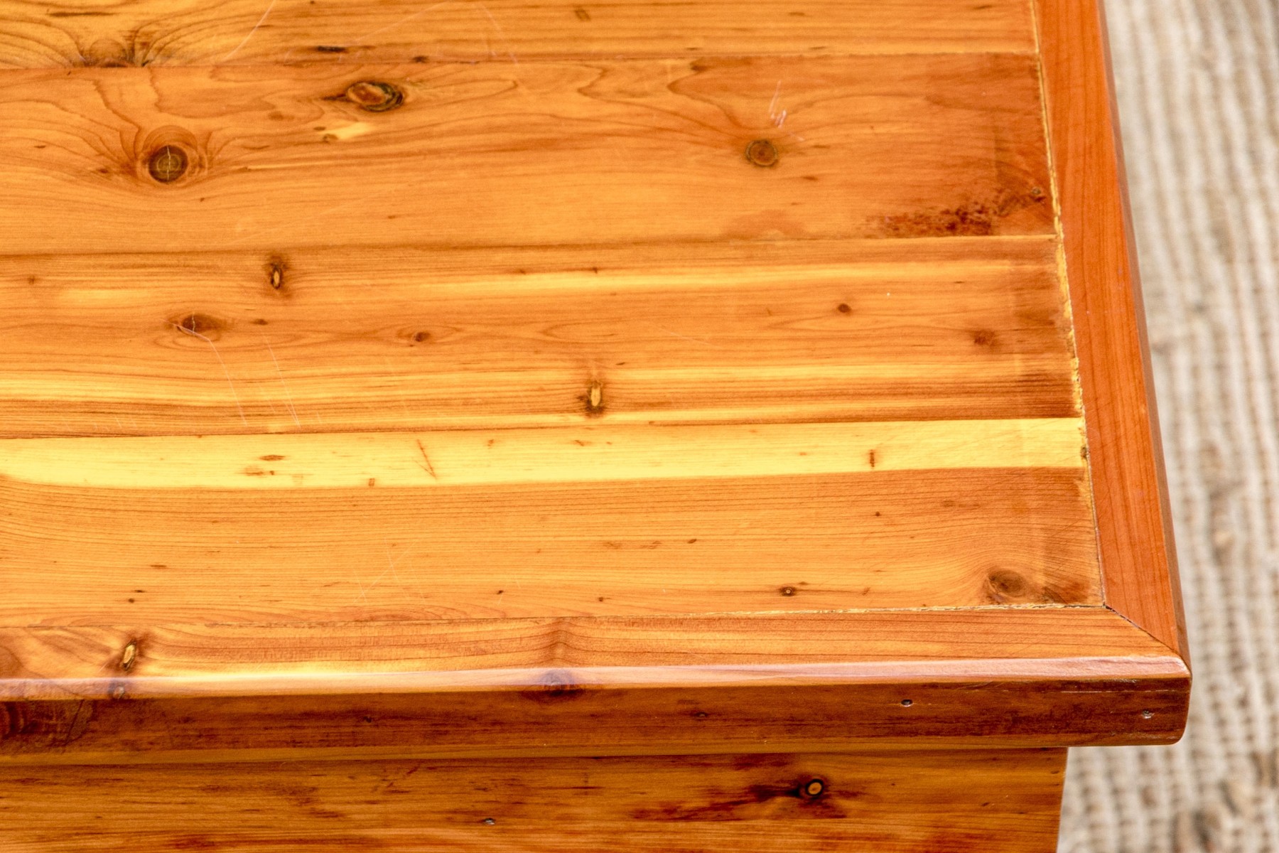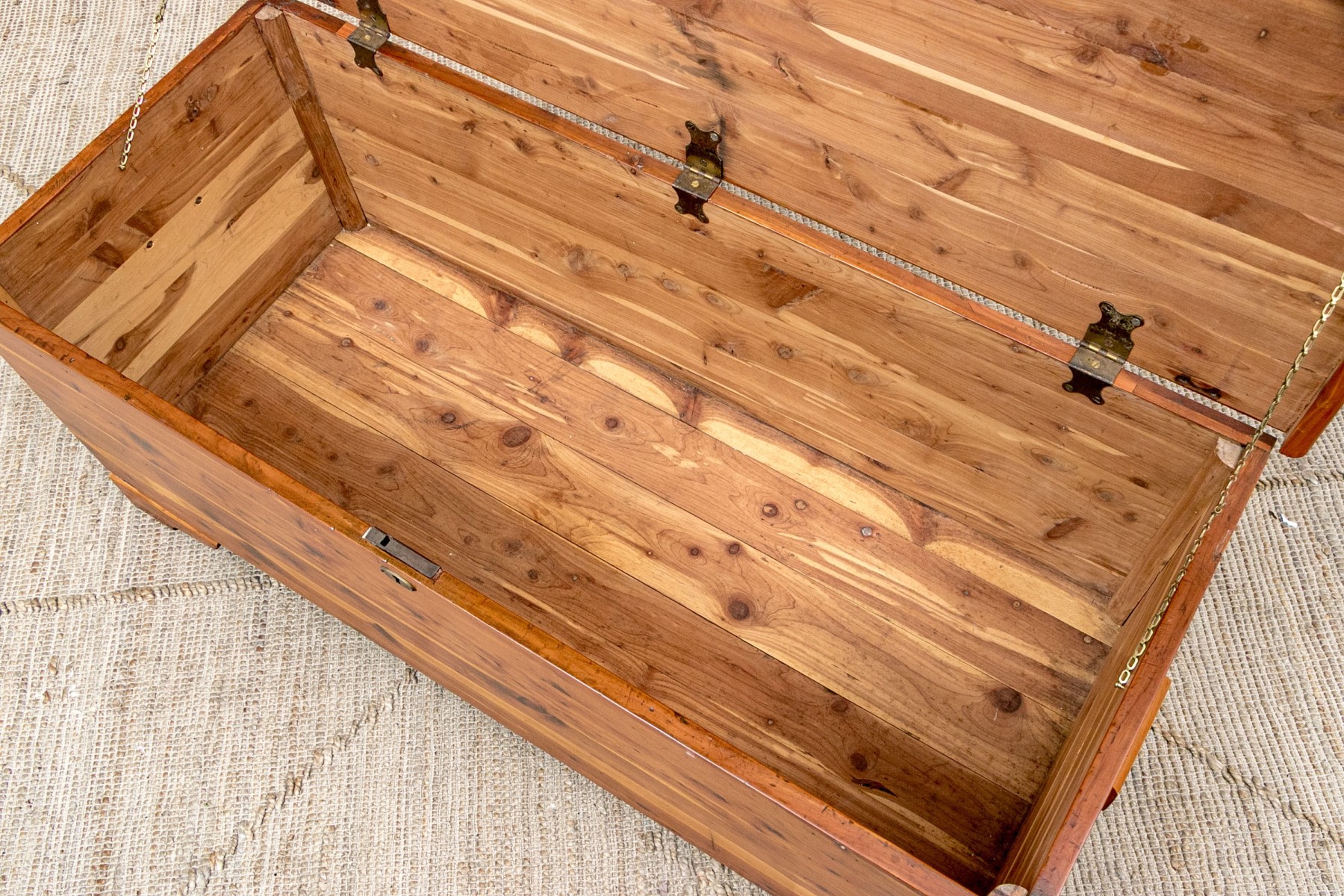It has been professionally restored to a fine finish. The plank constructed top with banded edges and a hinged top held in place with chains,. With twin block form handles and brass escutcheon (lacking a key). Raised on bracket feet.