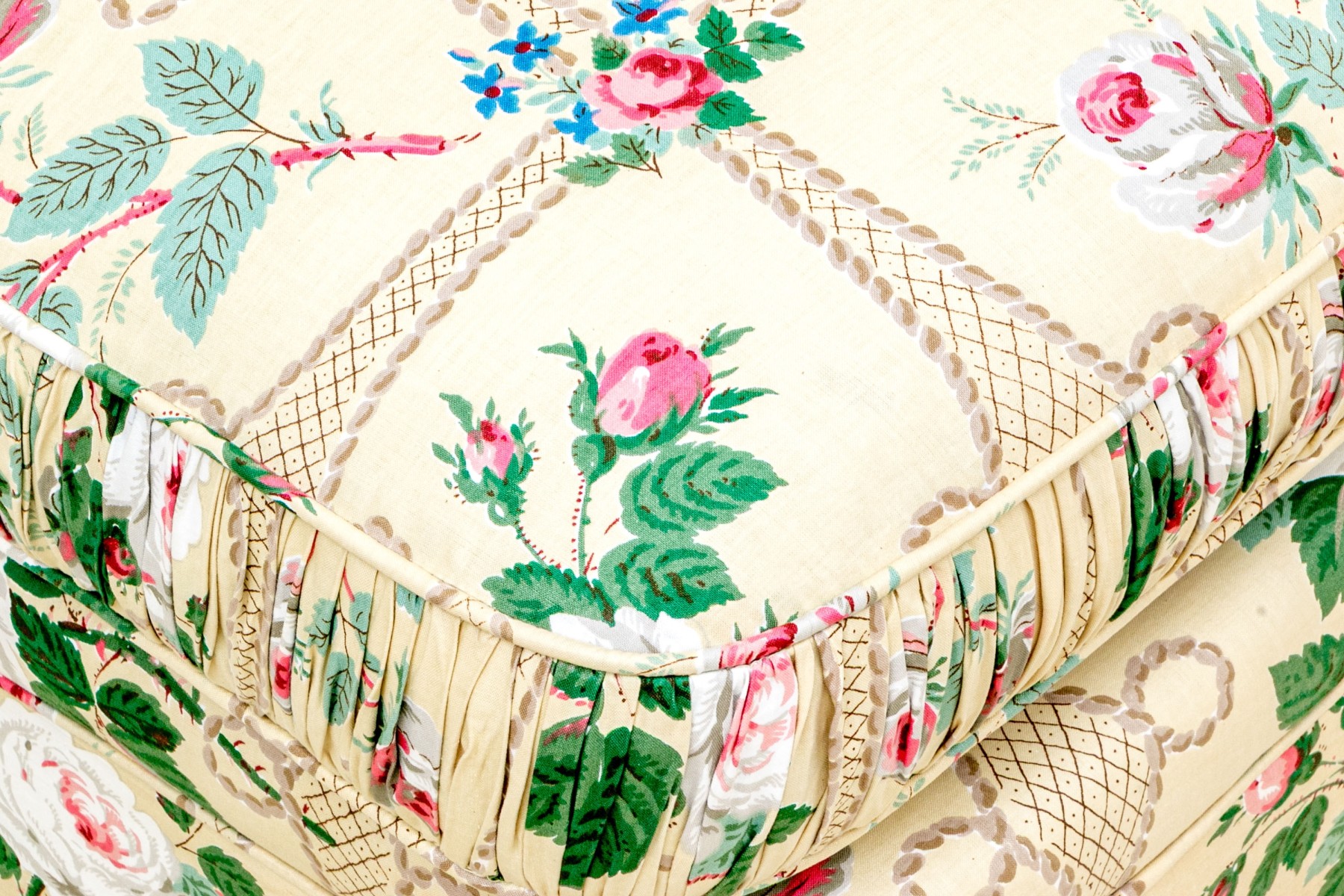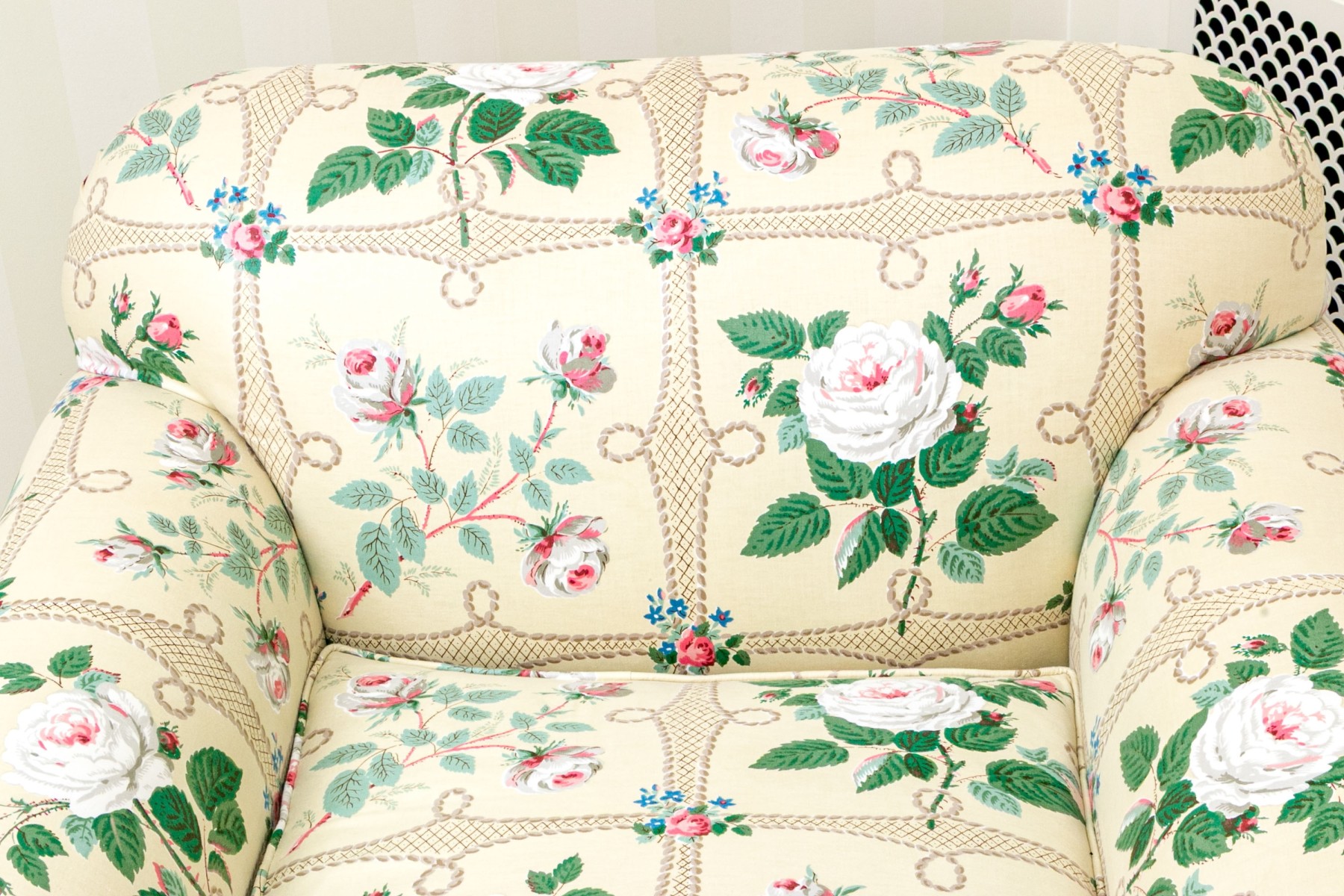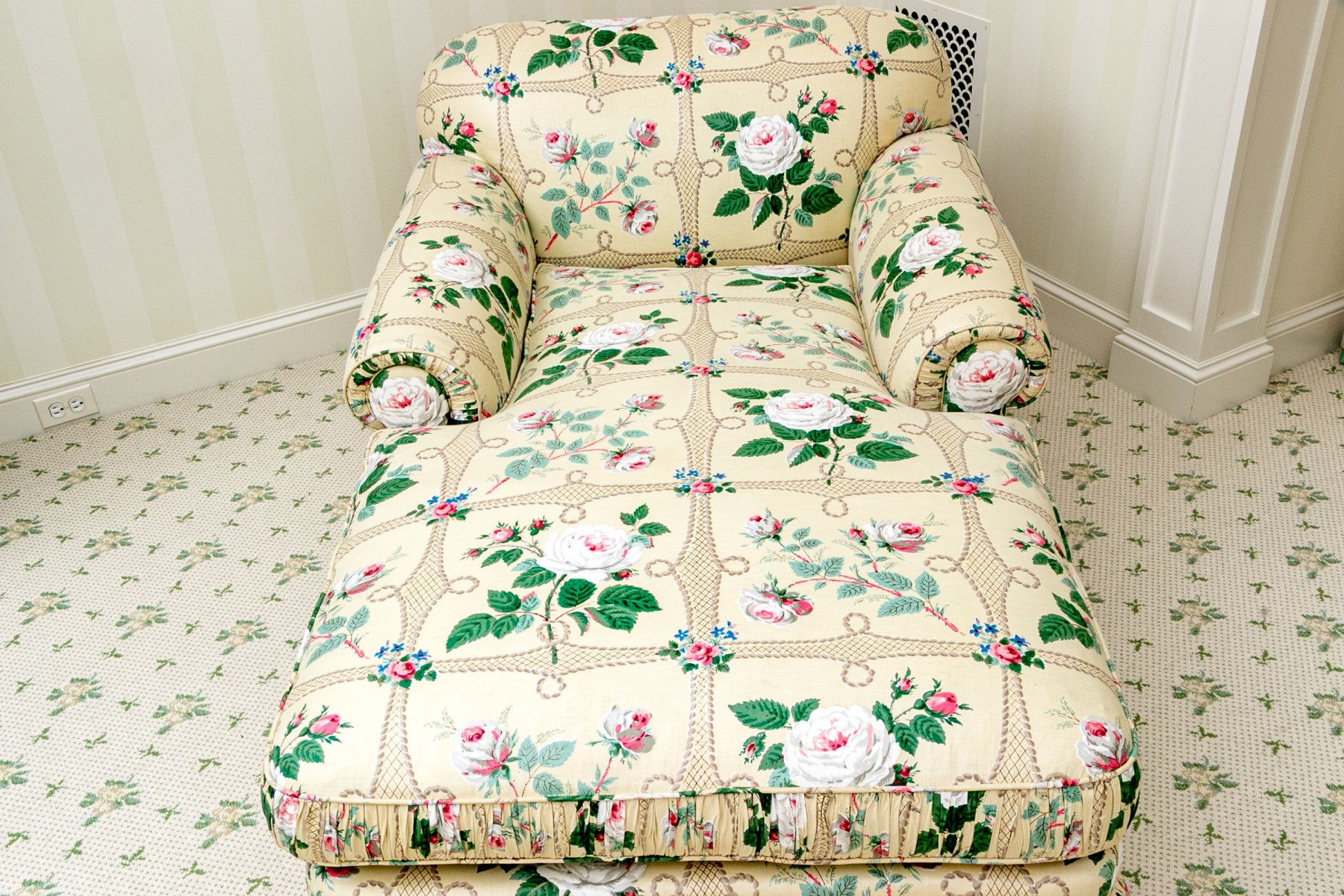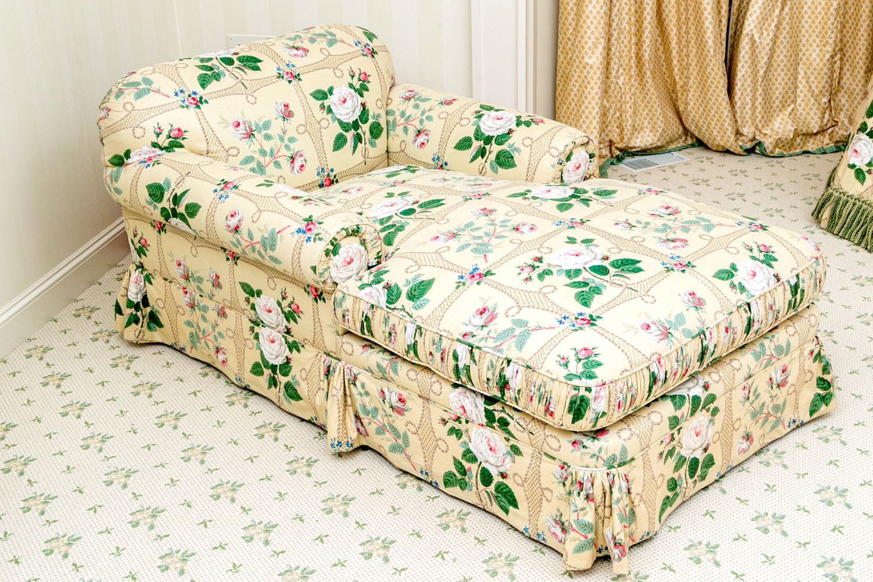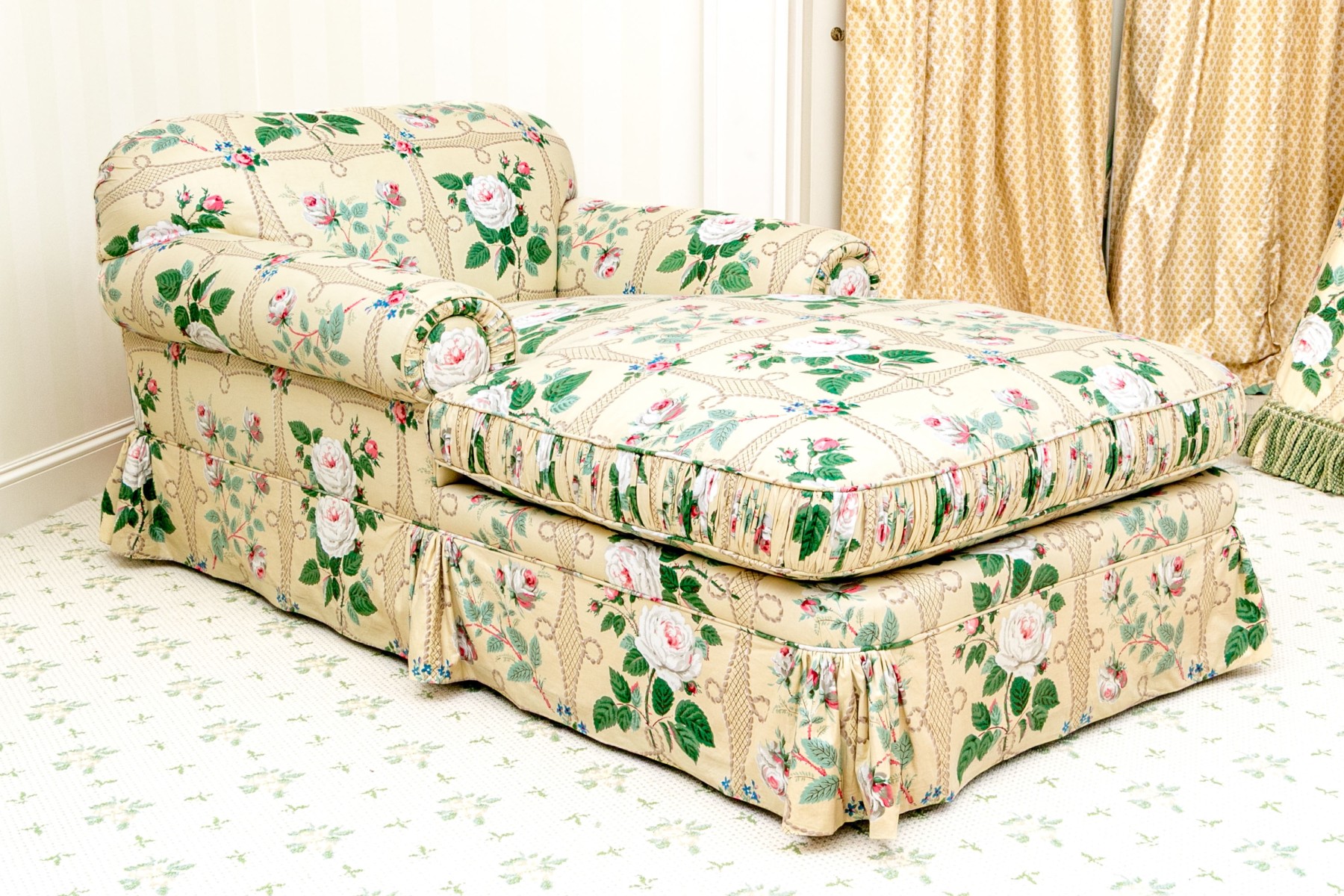 A delightful oversized chaise lounge in classic form with a large, rounded back, rolled arms, and loose seat cushion upholstered in chintzy ecru yellow fabric patterned with large white and pink roses on vibrant green stems alternating between straiged beige navette borders. Finished with piped trims and a skirted apron concealing the legs beneath. Likely upholstered in Nina Campbell Bagatelle floral poplin.