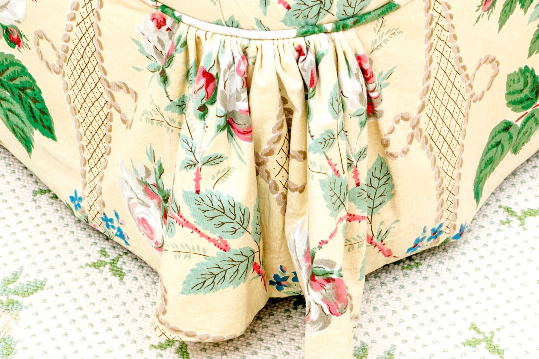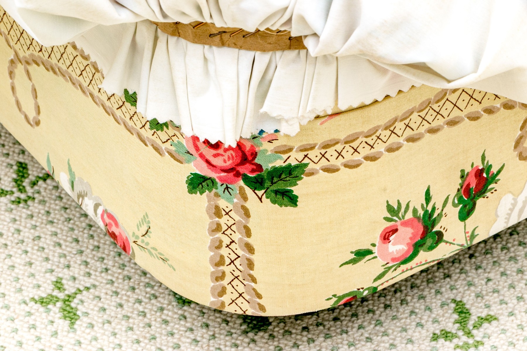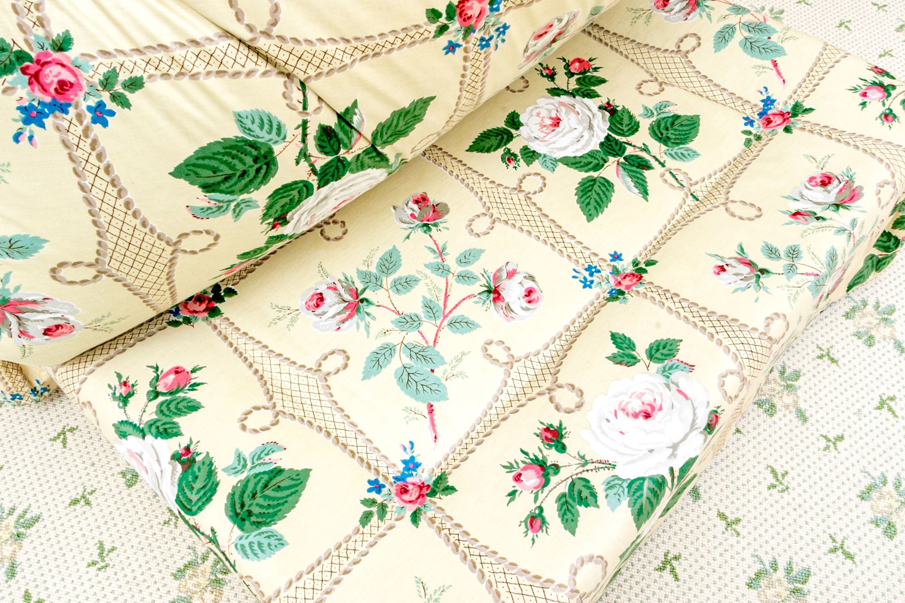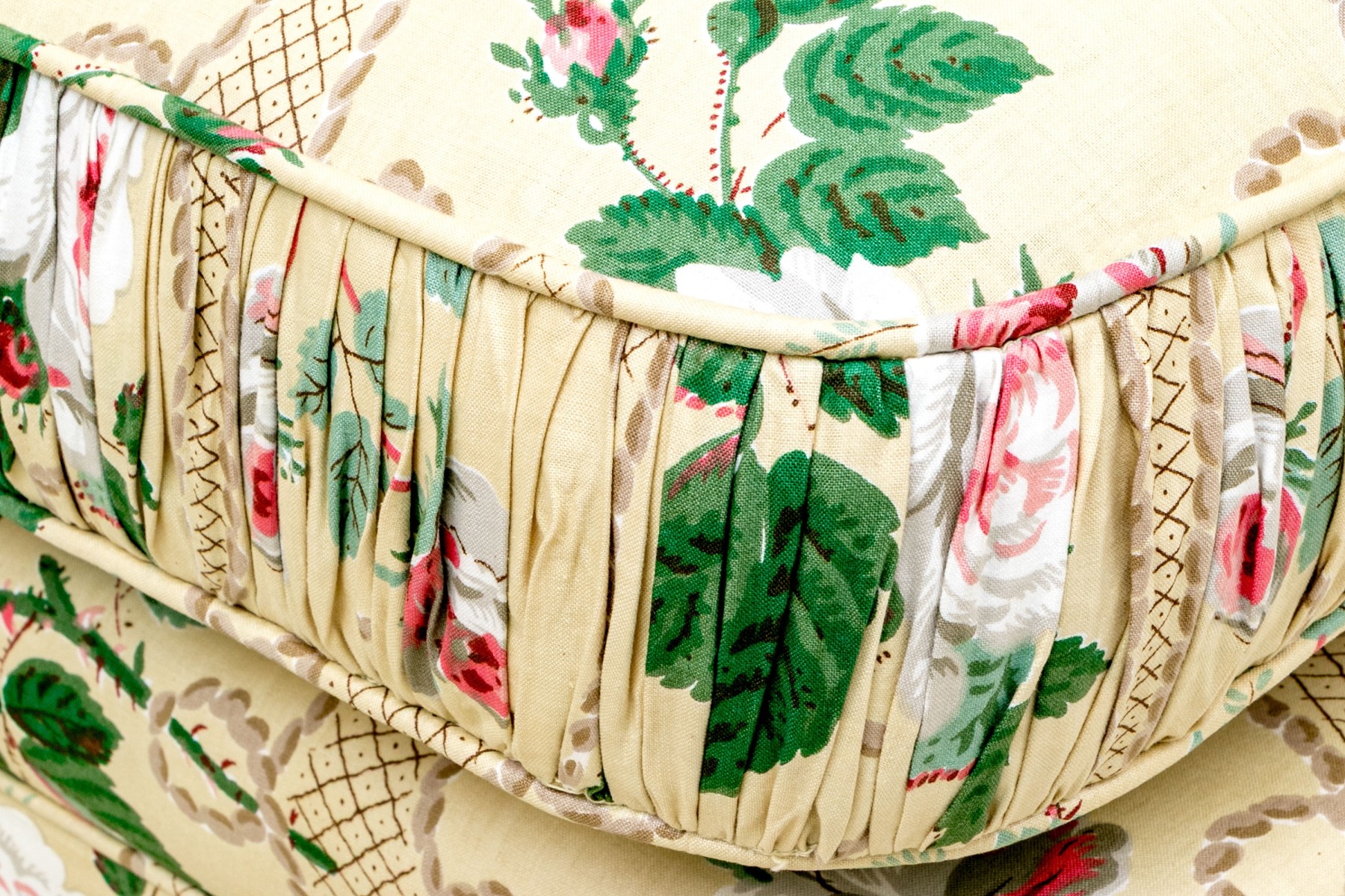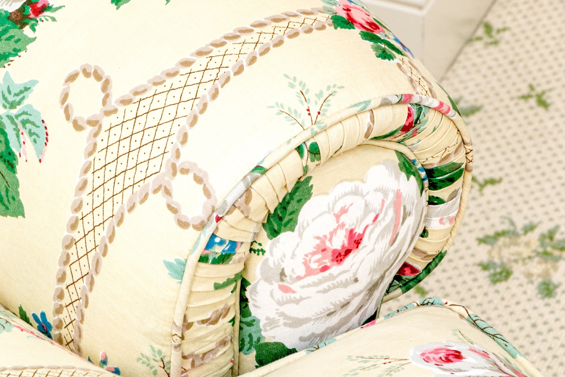 A delightful oversized chaise lounge in classic form with a large, rounded back, rolled arms, and loose seat cushion upholstered in chintzy ecru yellow fabric patterned with large white and pink roses on vibrant green stems alternating between straiged beige navette borders. Finished with piped trims and a skirted apron concealing the legs beneath. Likely upholstered in Nina Campbell Bagatelle floral poplin.