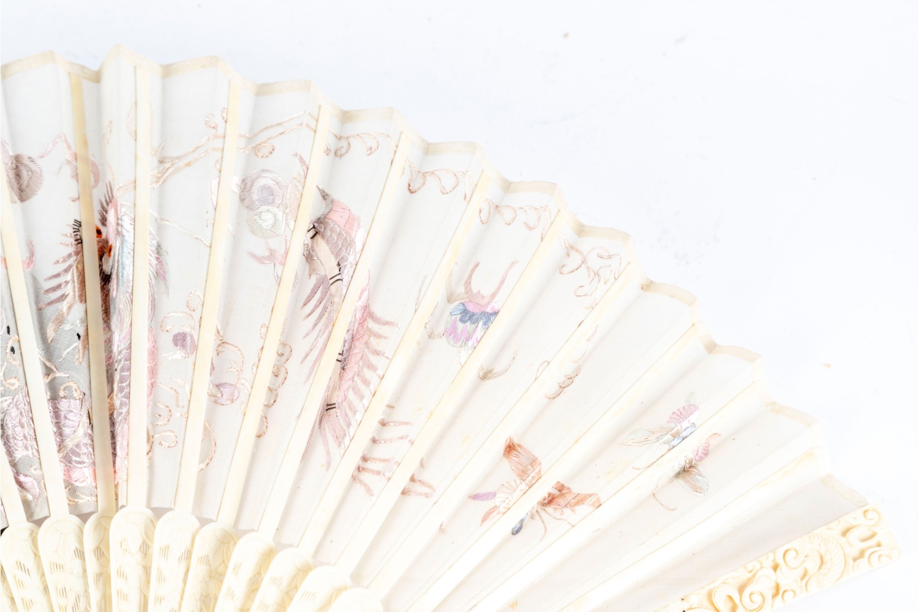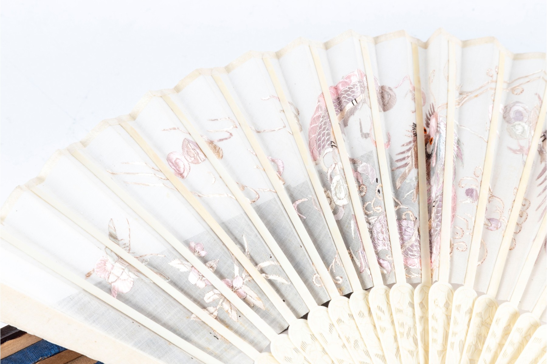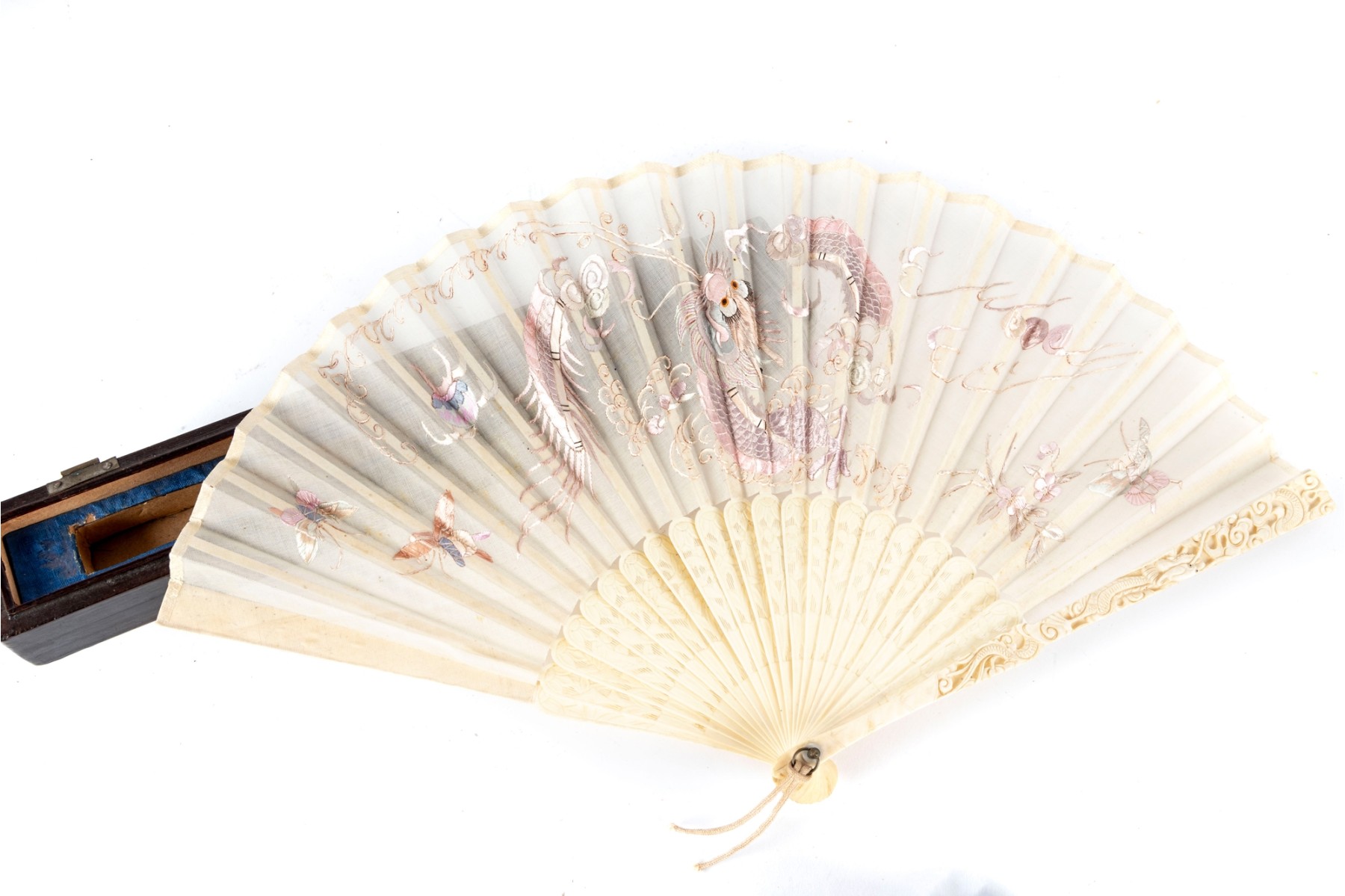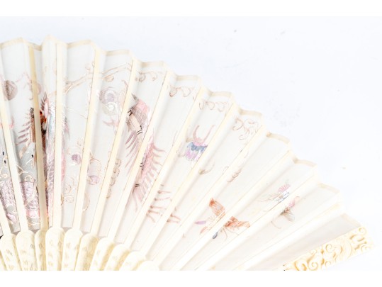 An impressive Asian hand fan in sheer cream white painted with pale pink, white, blue and orange dragons and moths. The sticks are elegantly carved with florals over openwork striations, while the guard follows suit with ornate decorations including swirls and scrolls.