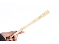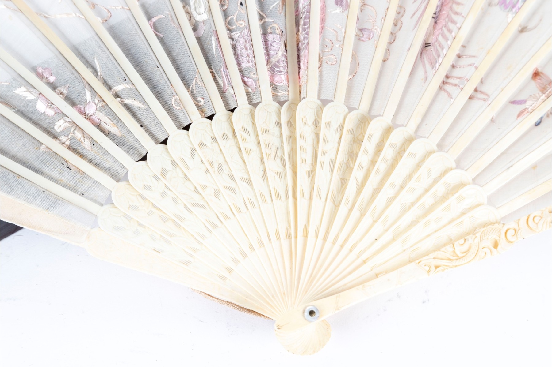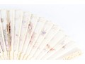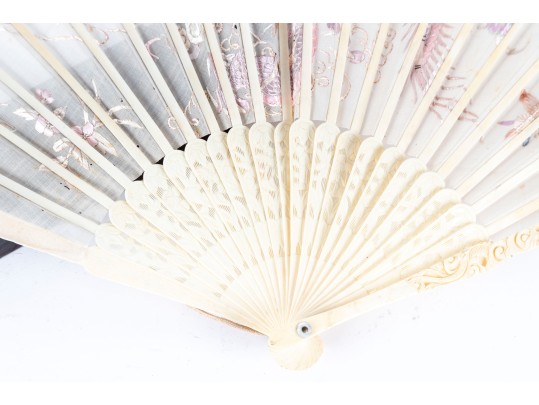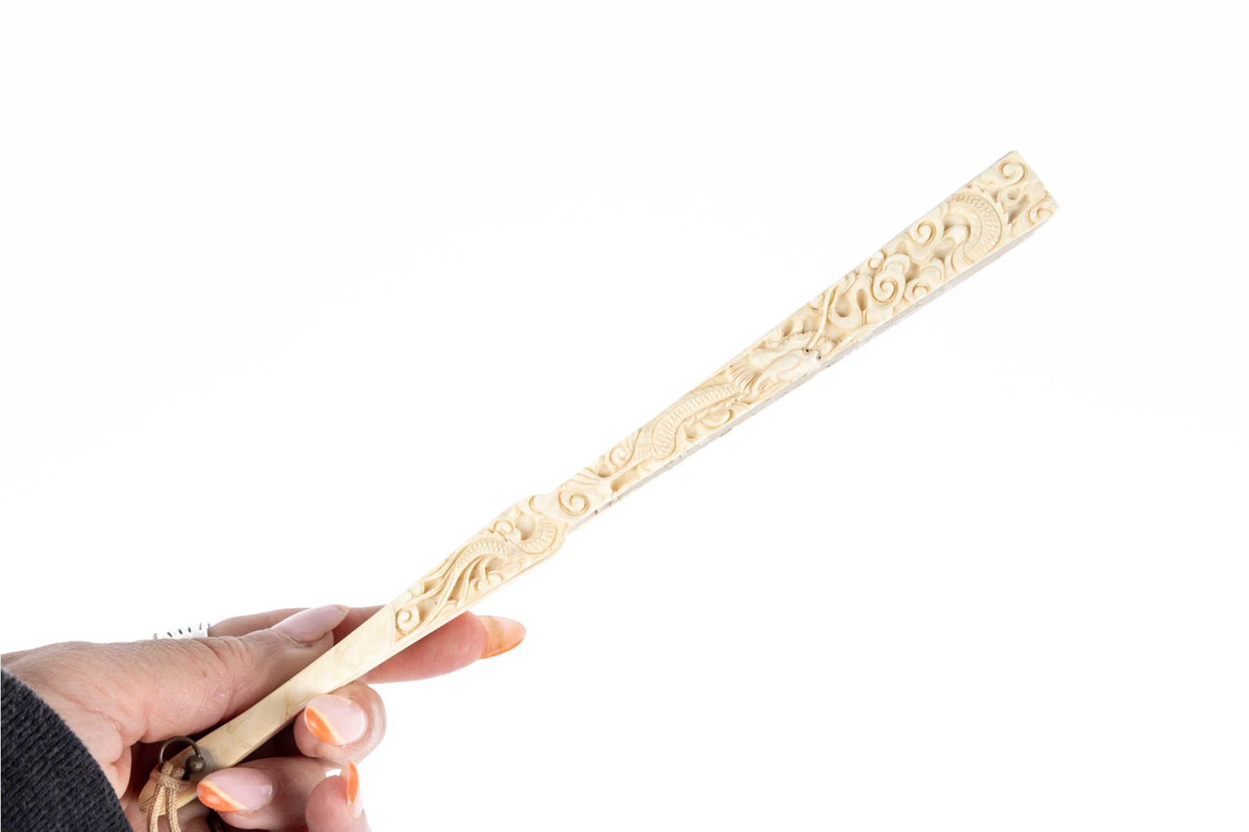 An impressive Asian hand fan in sheer cream white painted with pale pink, white, blue and orange dragons and moths. The sticks are elegantly carved with florals over openwork striations, while the guard follows suit with ornate decorations including swirls and scrolls.