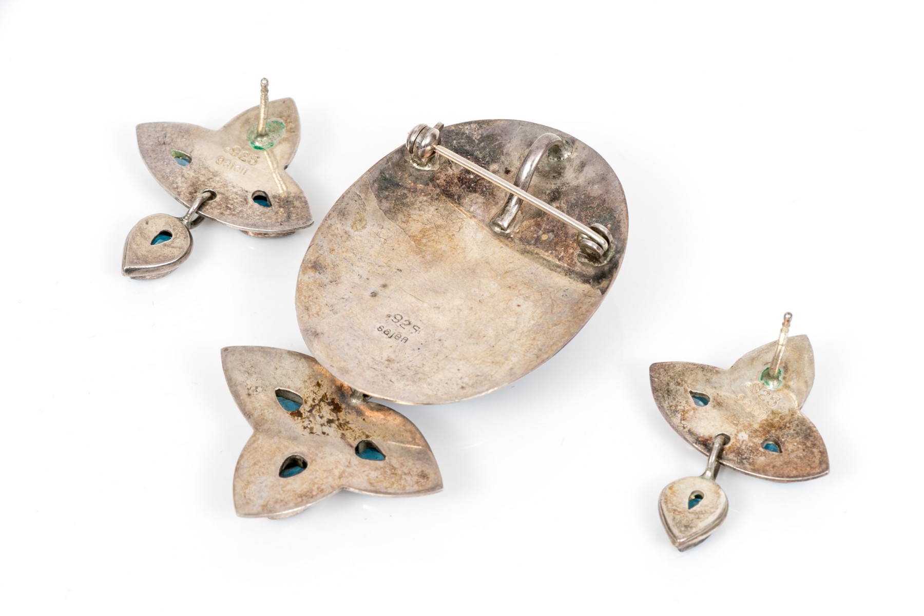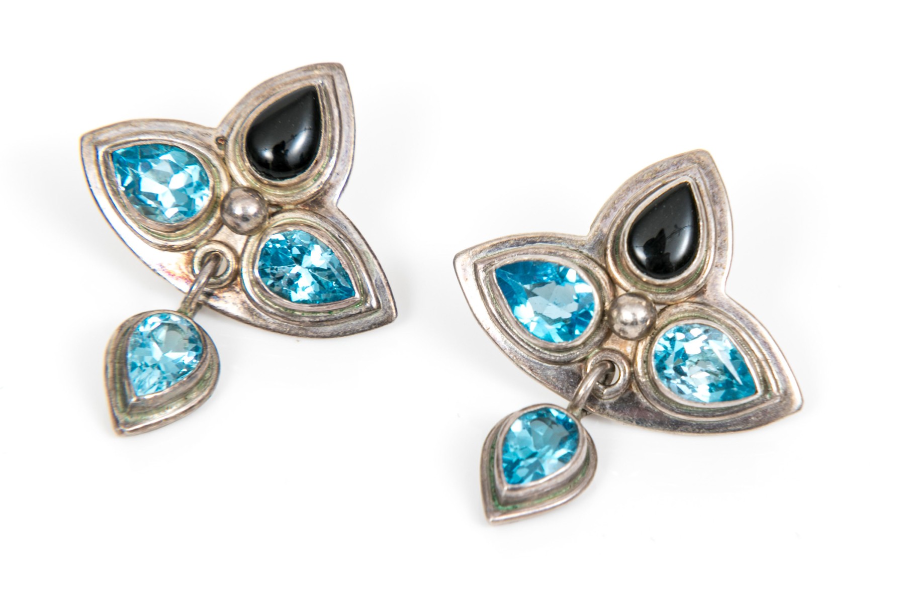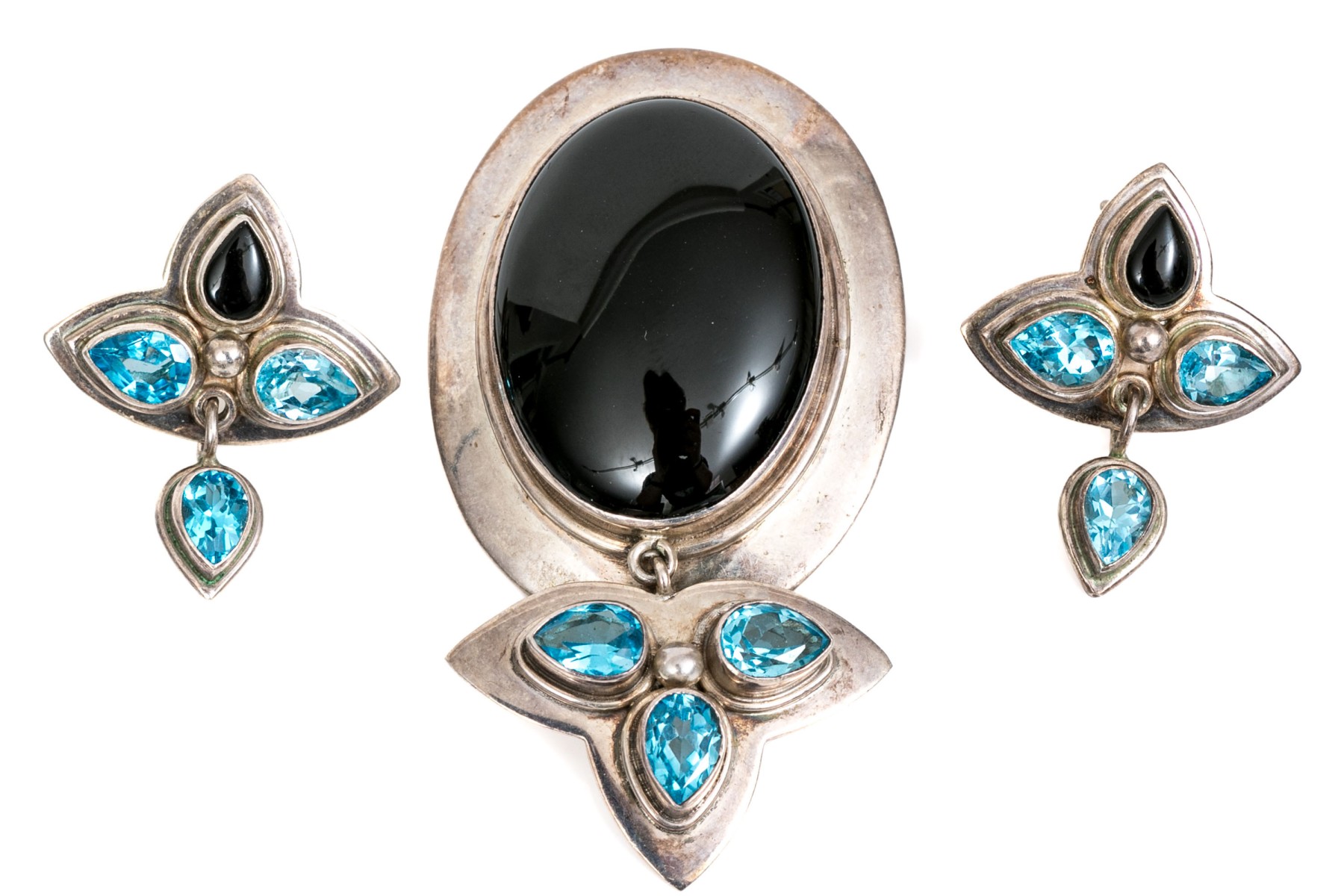 Beautiful sterling silver, blue topaz and black onyx brooch/pendant and earrings set