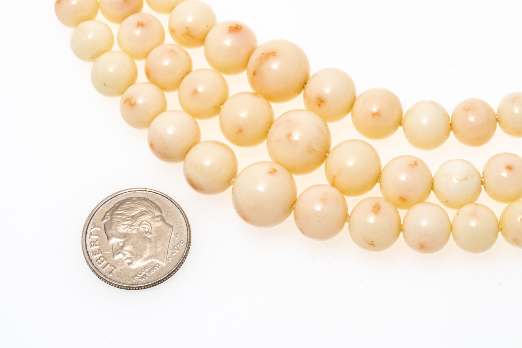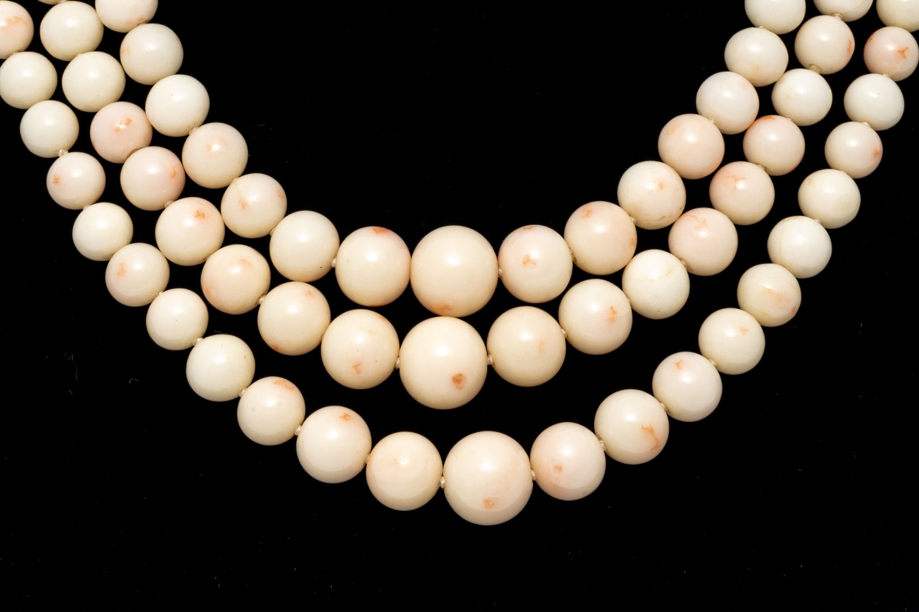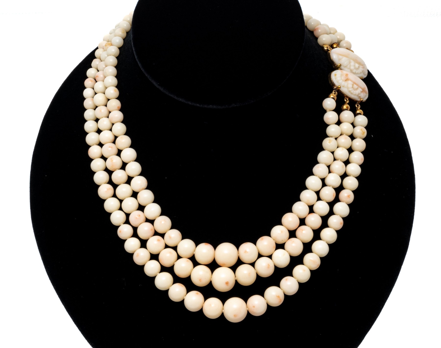 Beautiful triple strand graduated coral necklace, light ivory to light peach toning, 5 1/4 to 10 3/4mm, finished with an 18k yellow gold double floral clasp