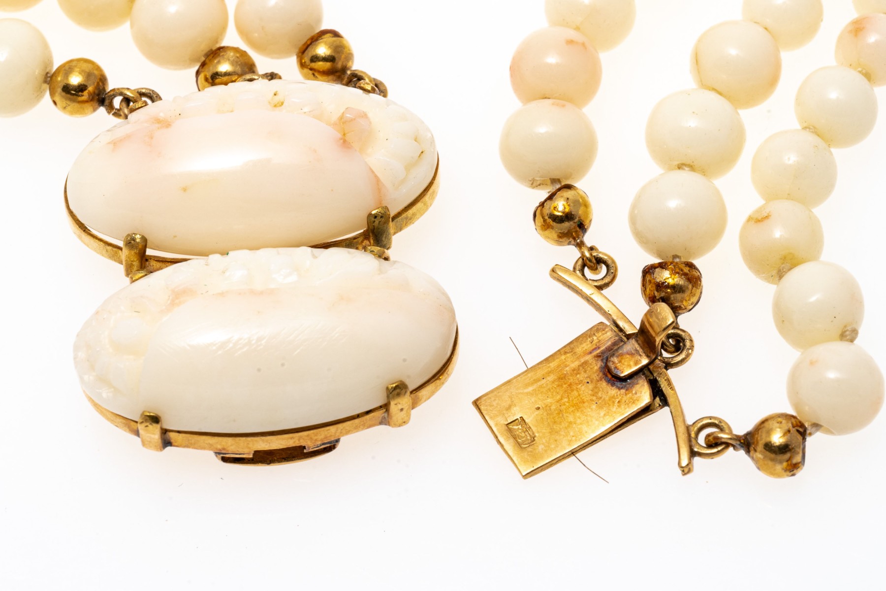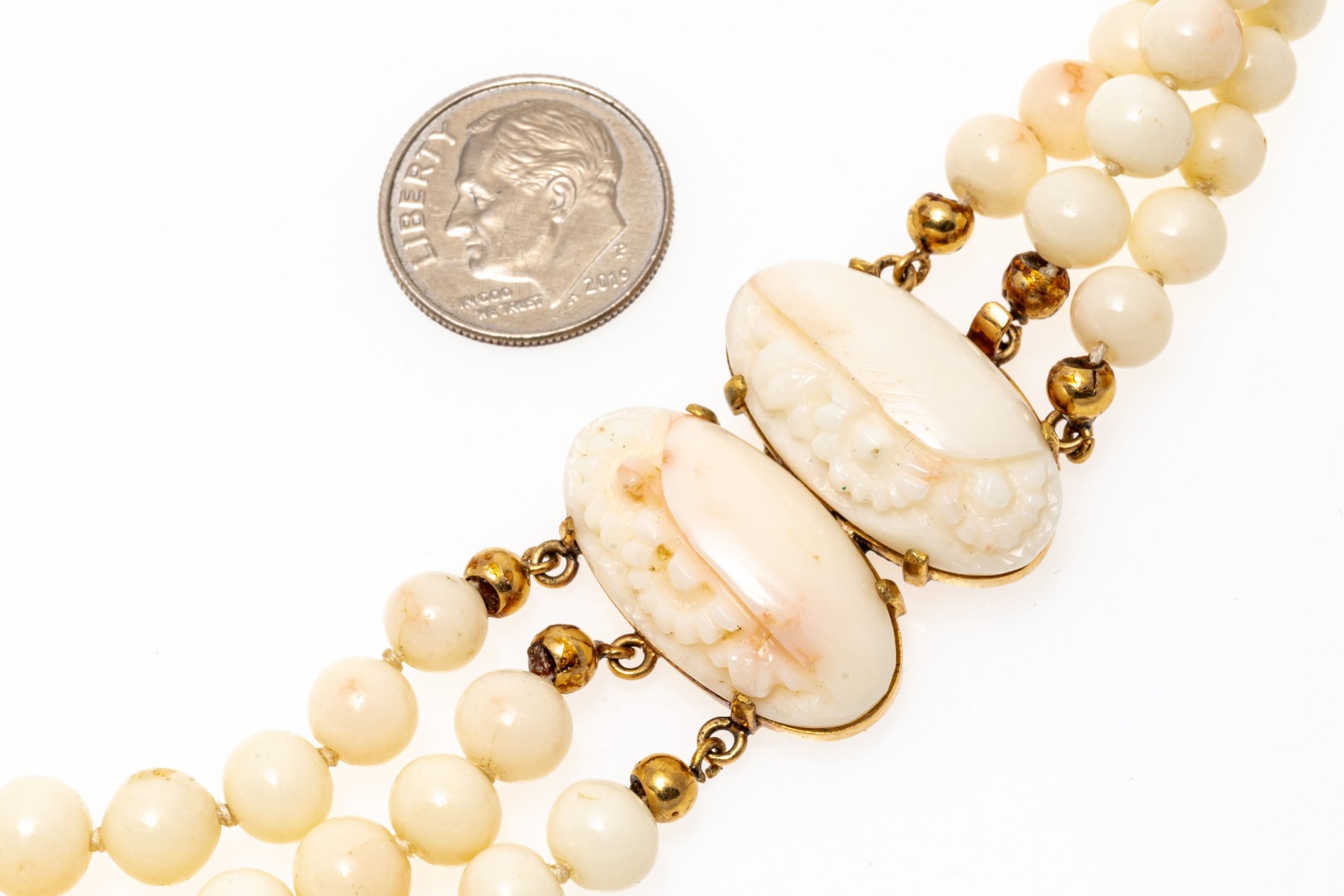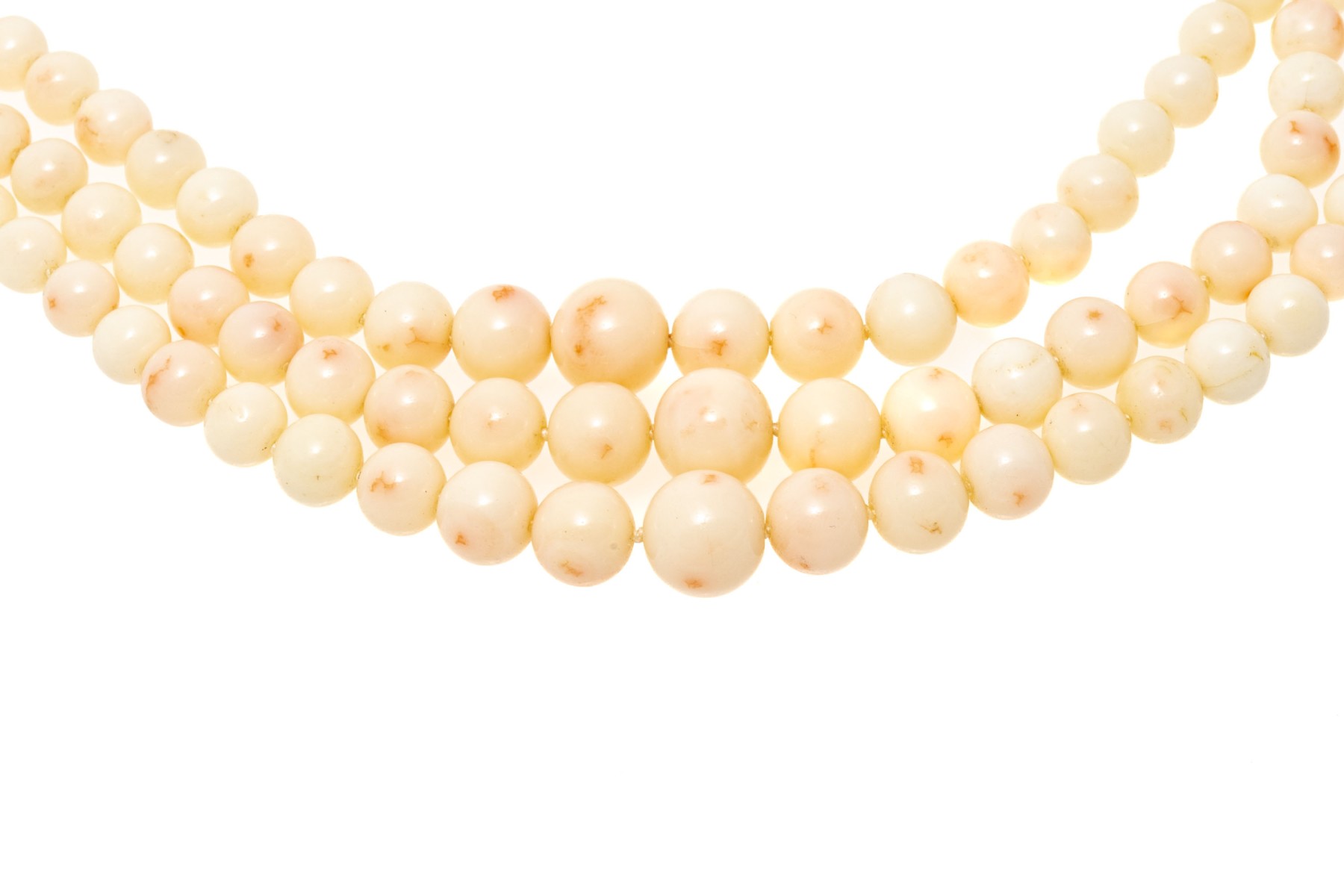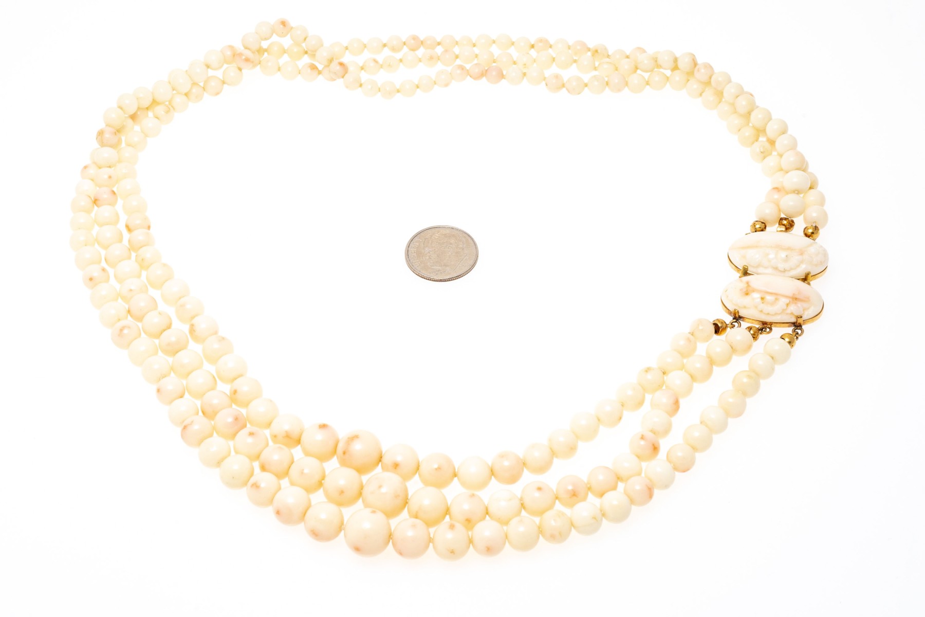 Beautiful triple strand graduated coral necklace, light ivory to light peach toning, 5 1/4 to 10 3/4mm, finished with an 18k yellow gold double floral clasp