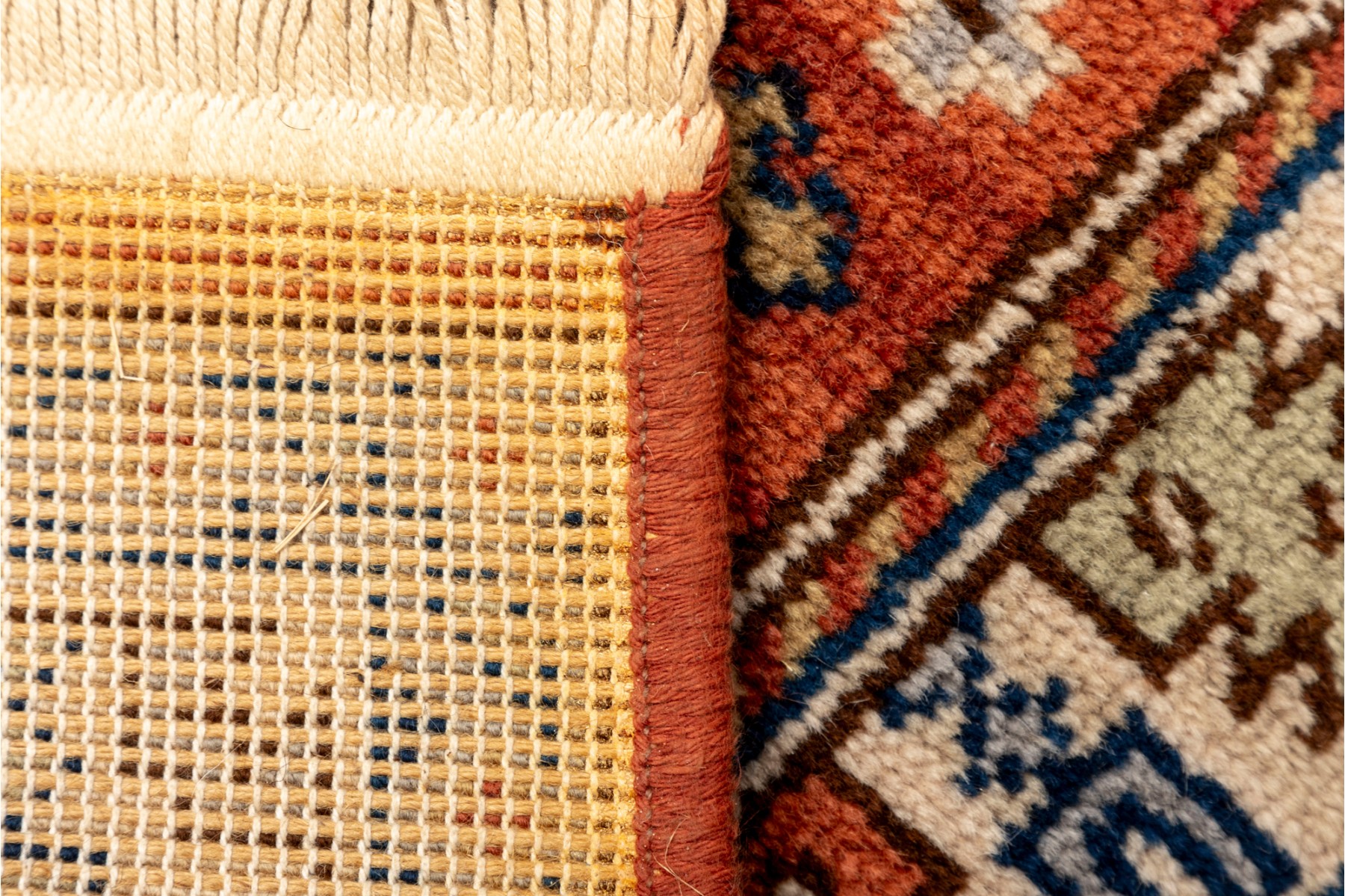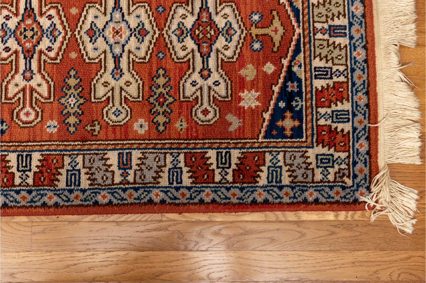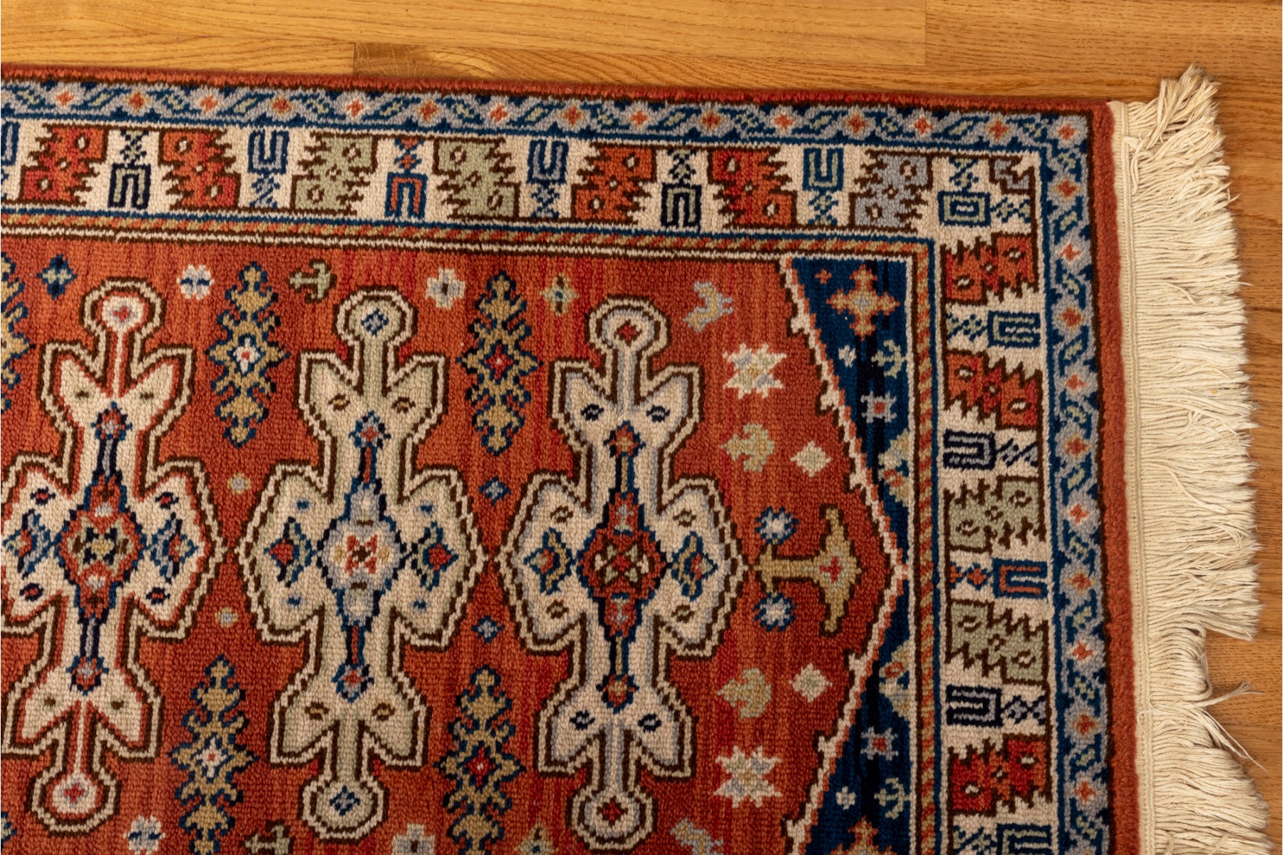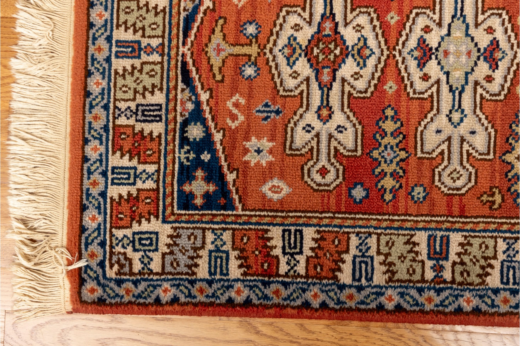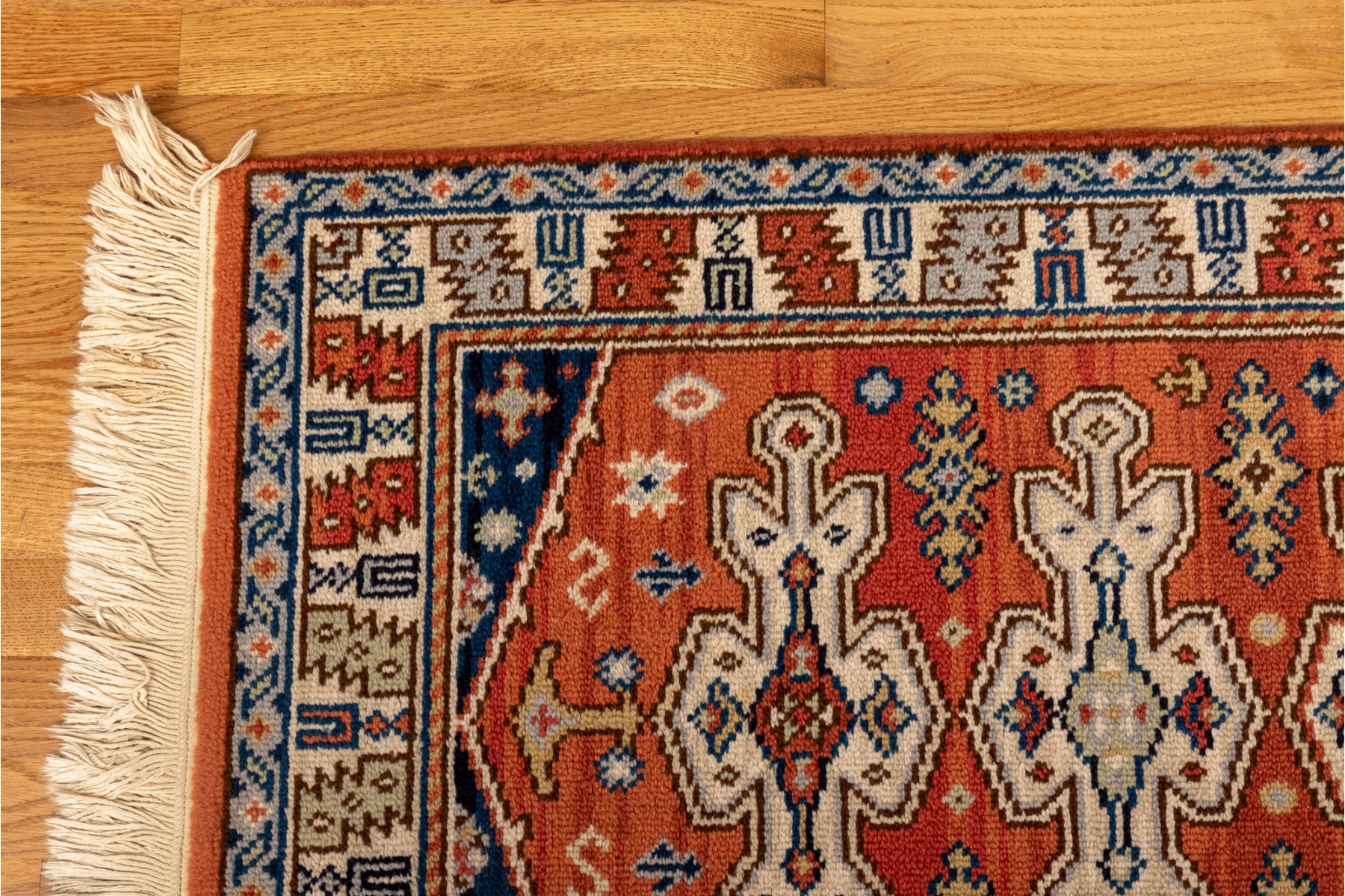 A beautiful wool scatter rug displaying a cream main border with geometric winged motifs flanked by blue guard borders around a red-orange field. The field is adorned with five large petaled medallions surrounded by smaller motifs in yellow, blue, and gray.