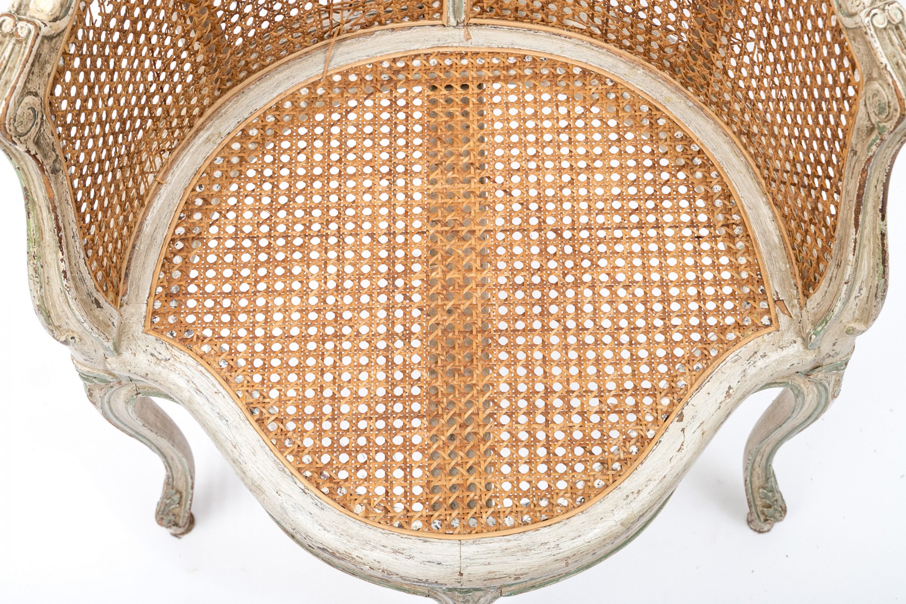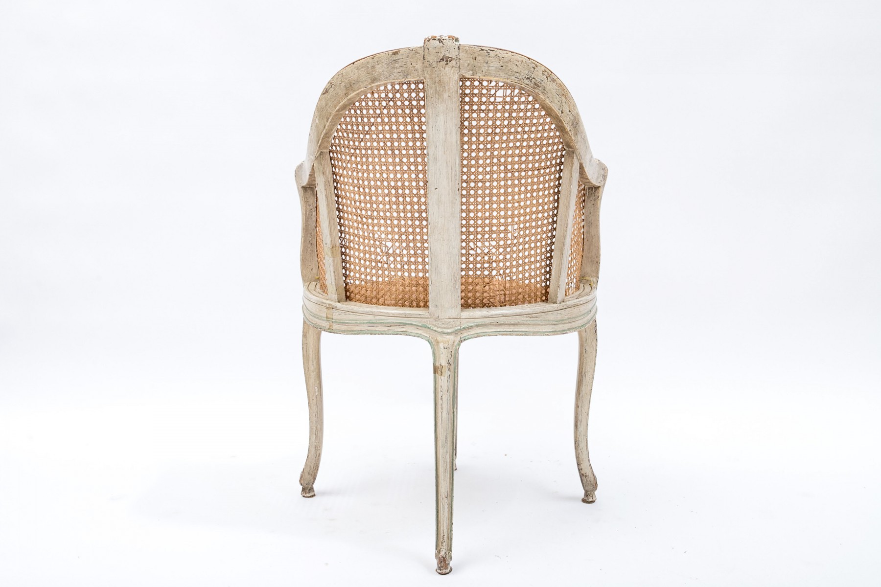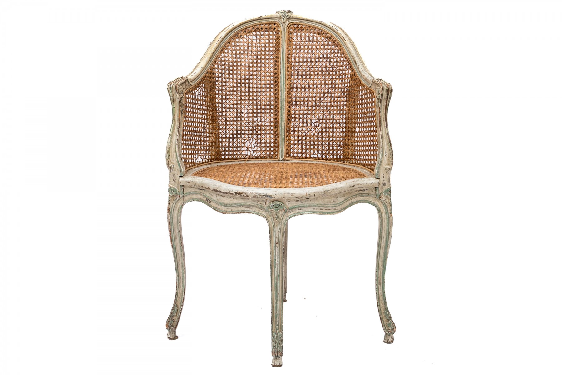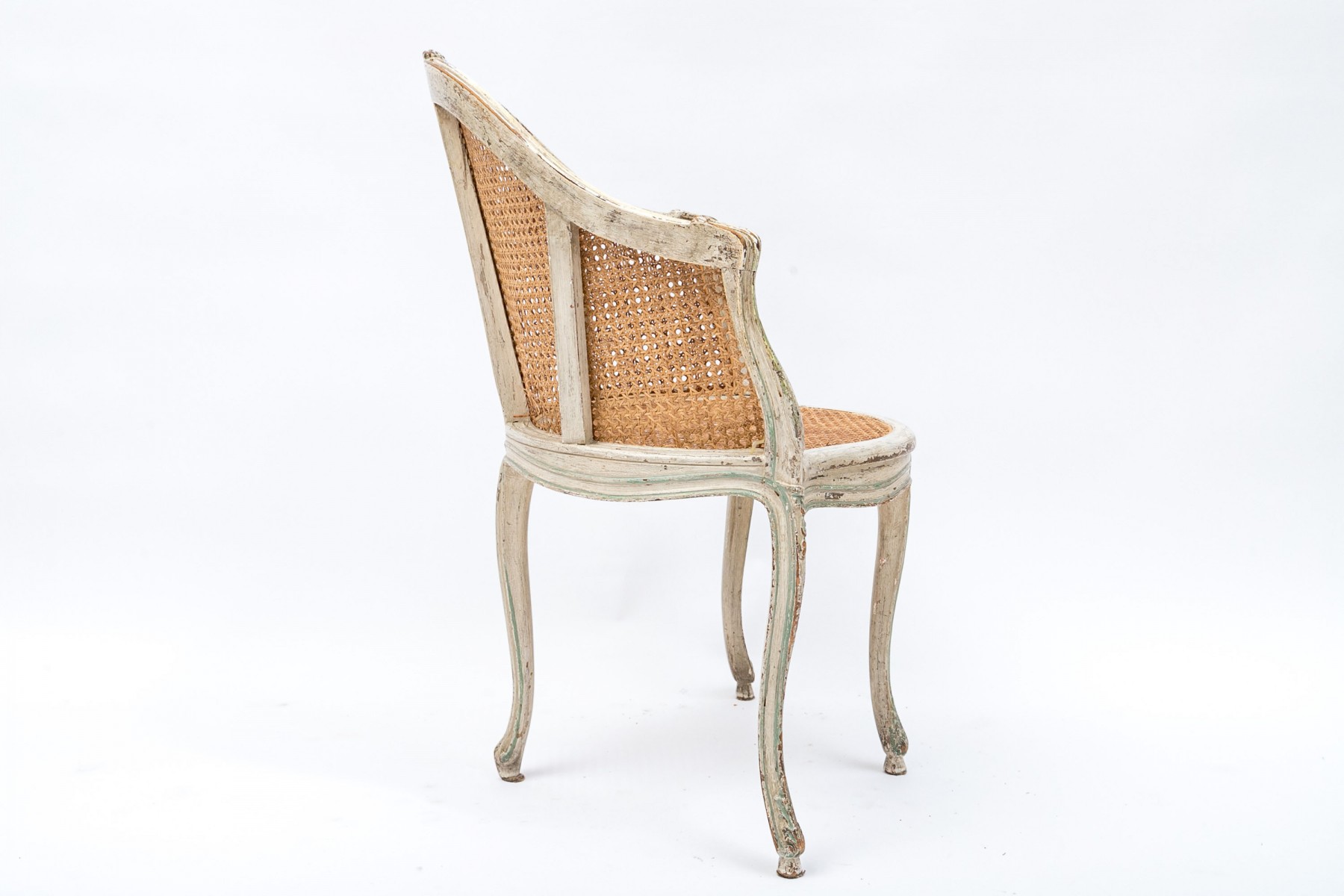 A beautifully aged Louis XV desk chair displaying warm-toned brown caning along the back and seat in a white painted frame with elegant curved forms accented by sage green borders. Scrolled arms lead to a serpentine apron supported by subtly curving cabriole legs on peg feet.