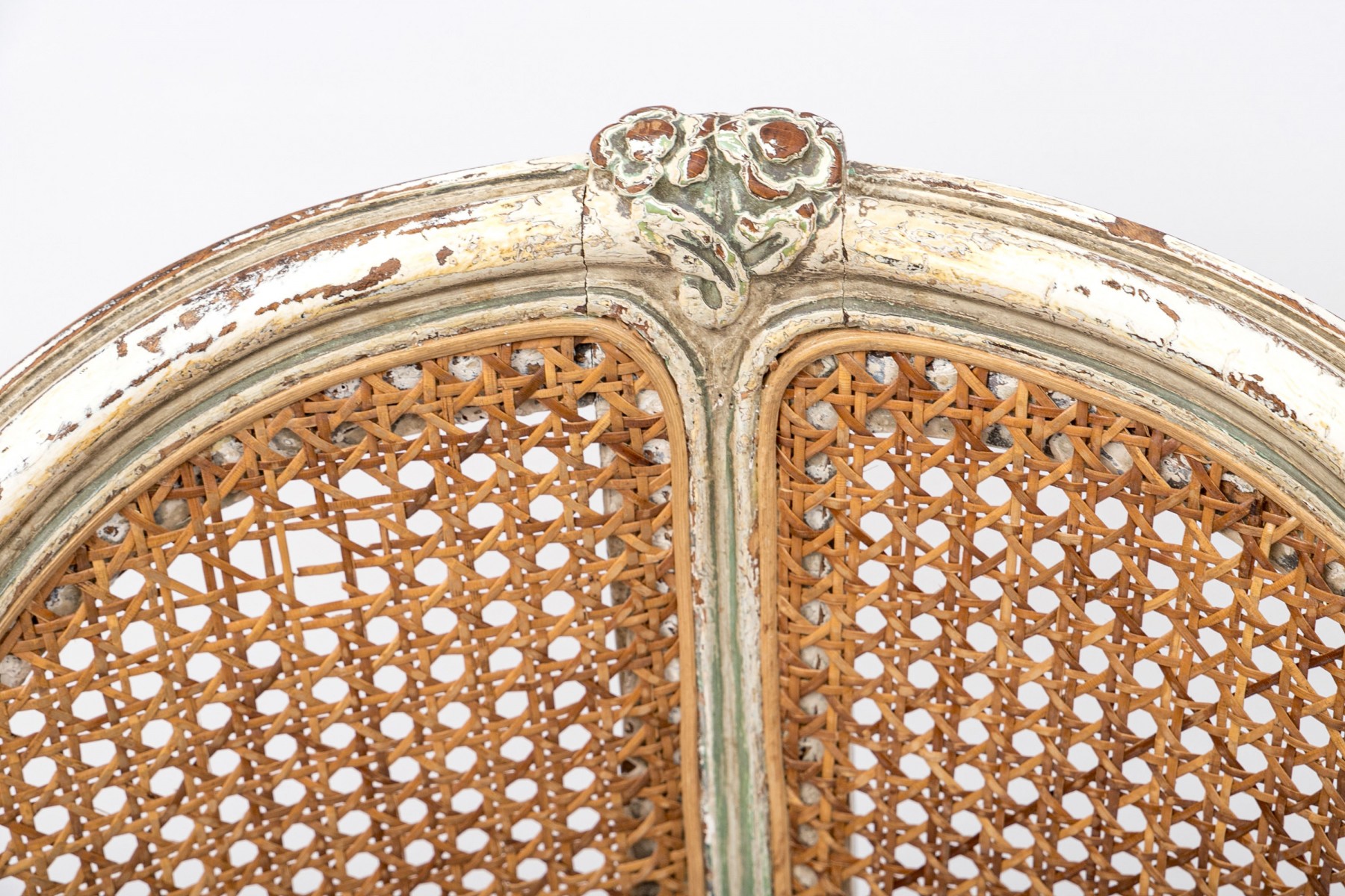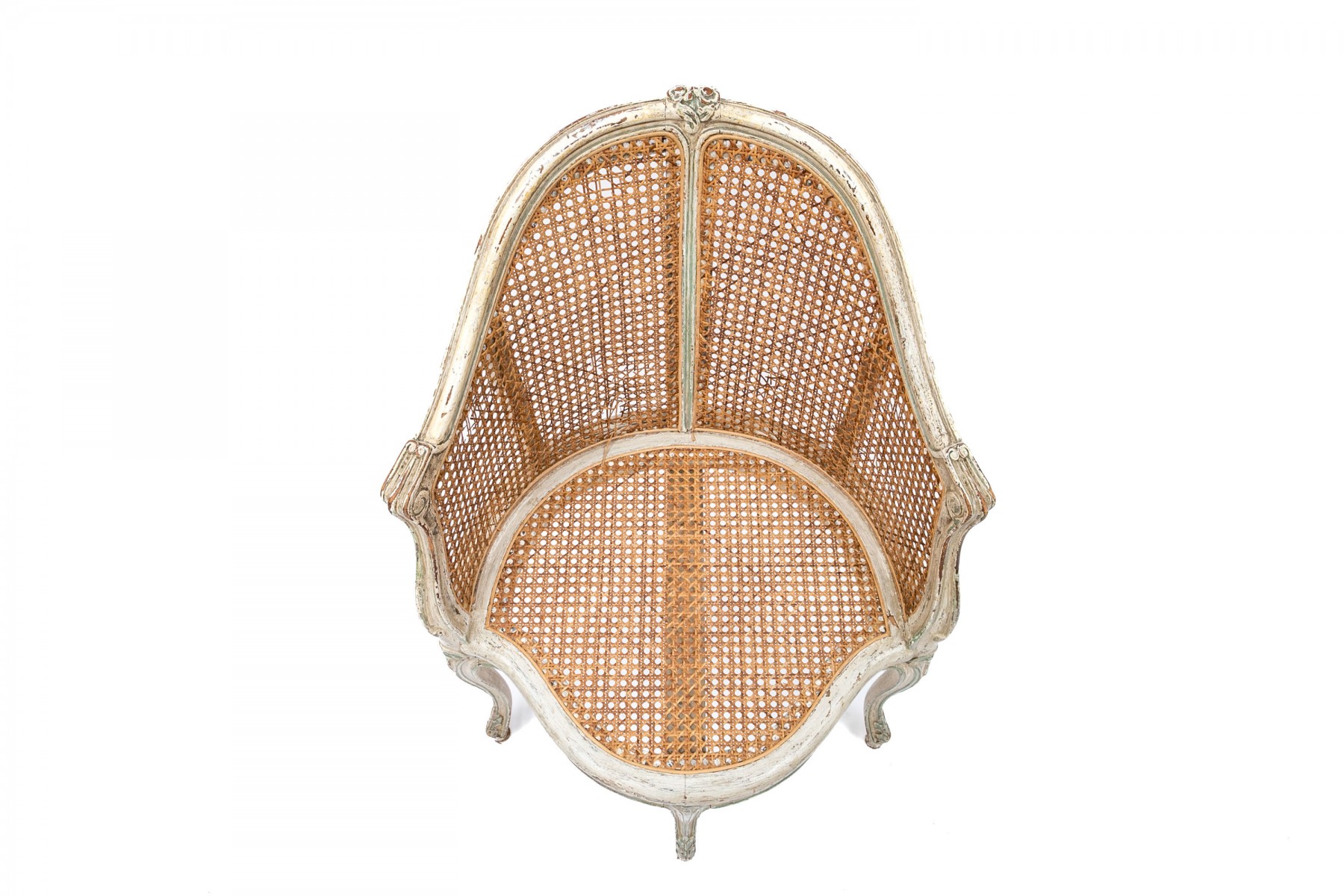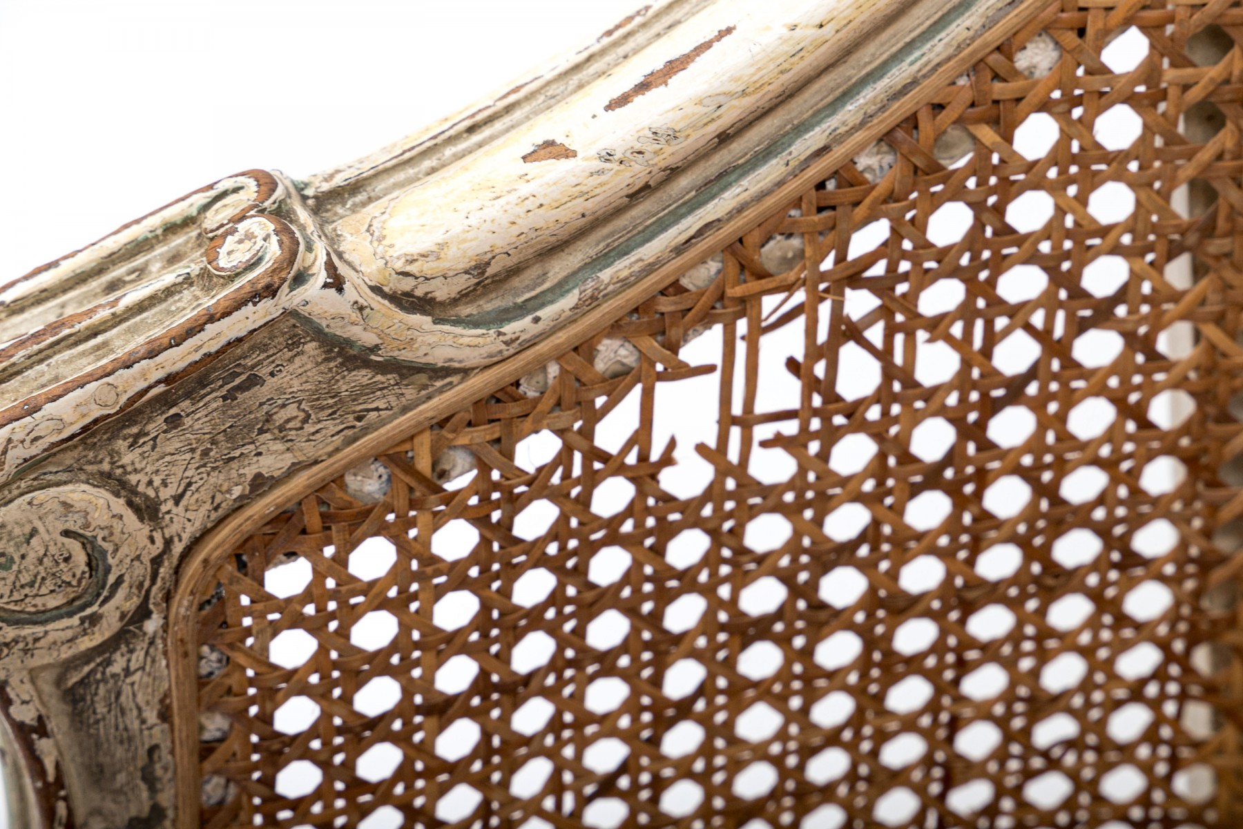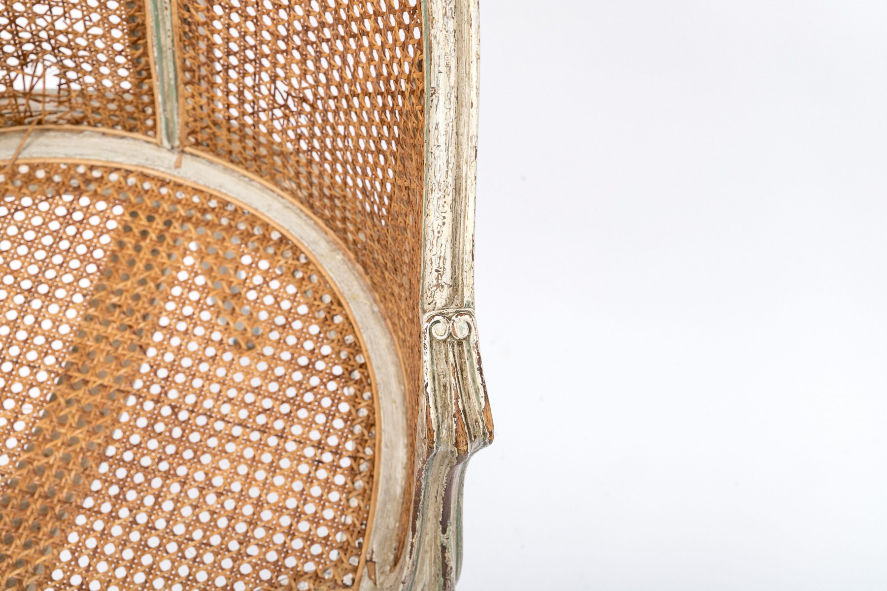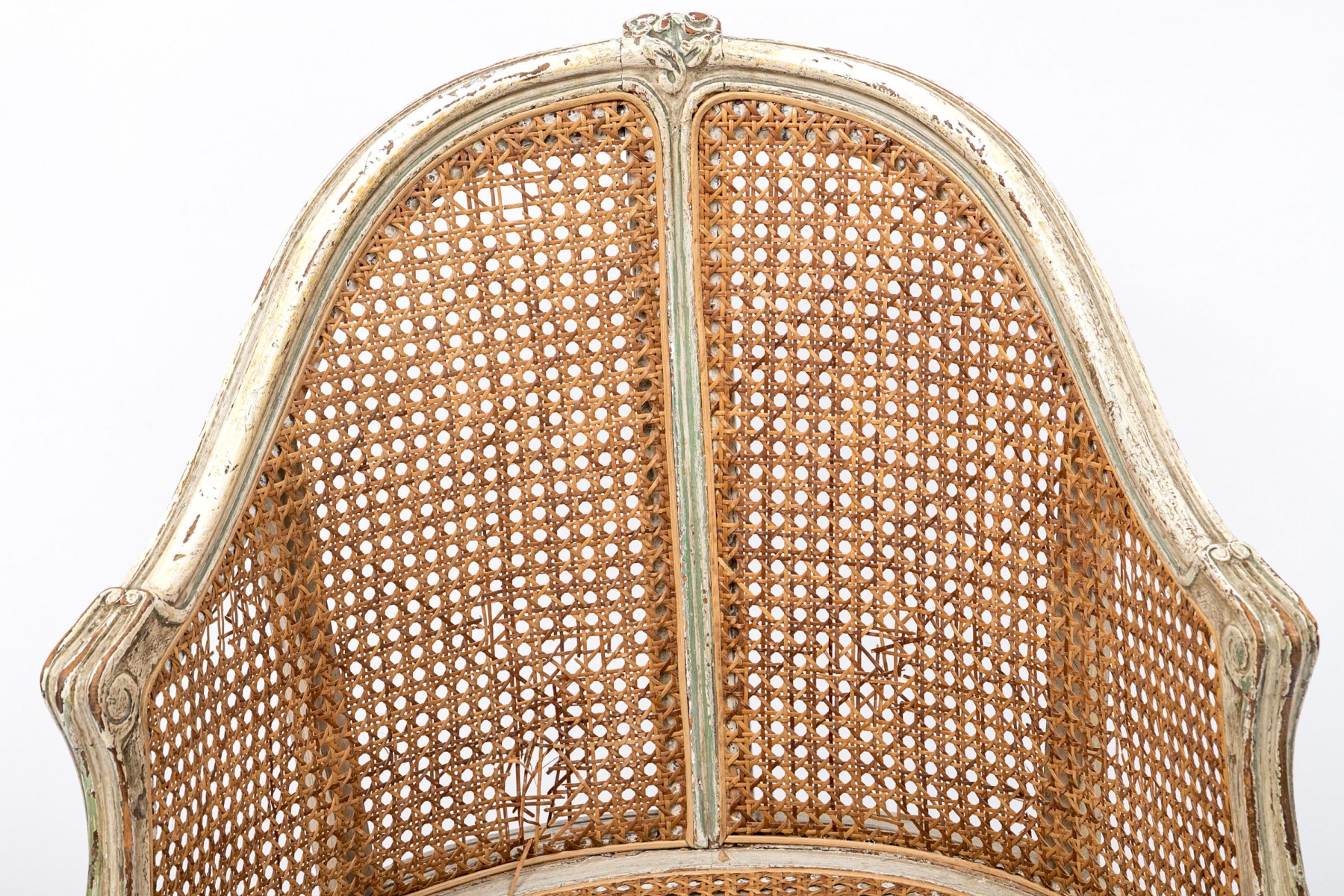 A beautifully aged Louis XV desk chair displaying warm-toned brown caning along the back and seat in a white painted frame with elegant curved forms accented by sage green borders. Scrolled arms lead to a serpentine apron supported by subtly curving cabriole legs on peg feet.
