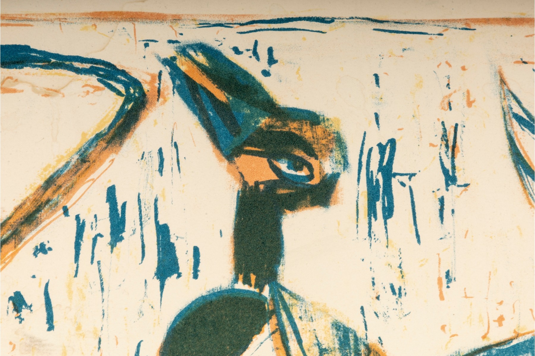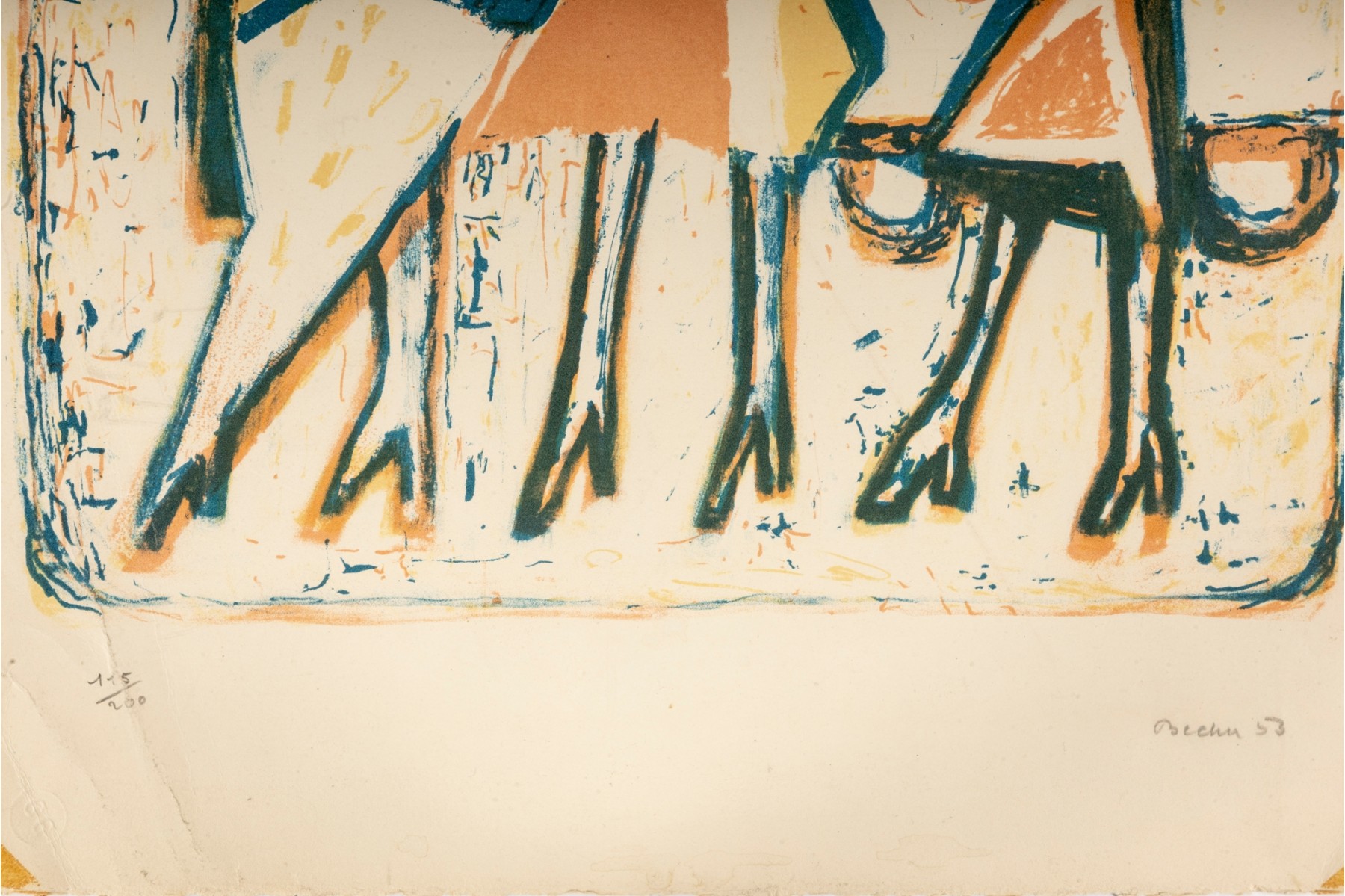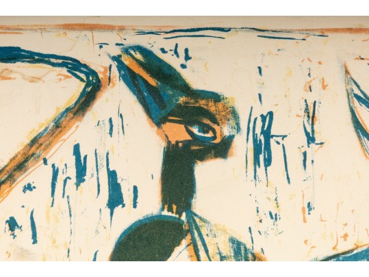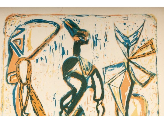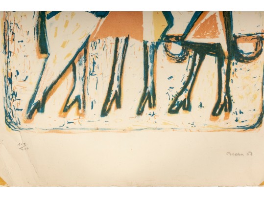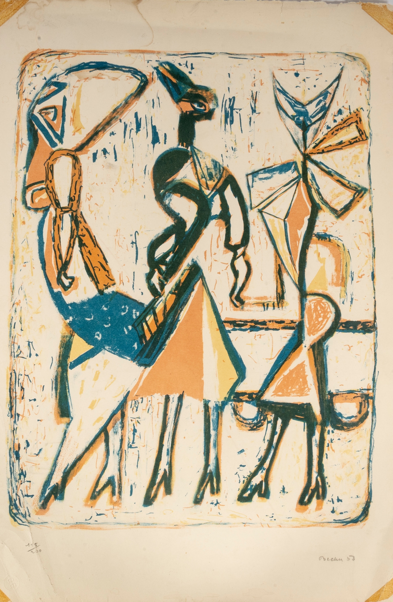 Walter Becker (German, 1883-1985) "Trois Femmes" lithograph depicting three abstract female figures with animalistic heads wearing fashionable outfits with skirts. Beautifully detailed with gestural linework and rendered in vibrant orange, blue, and yellow. Pencil signed and dated '53 lower right, numbered 115/200 lower left. Presented loose, unframed.