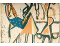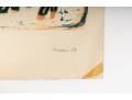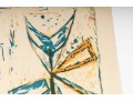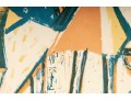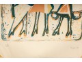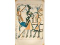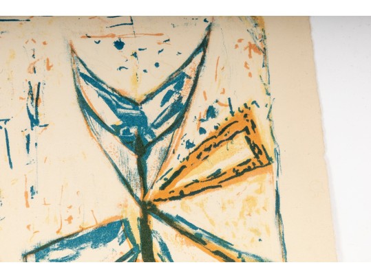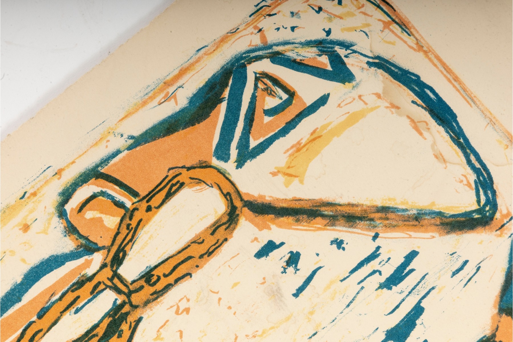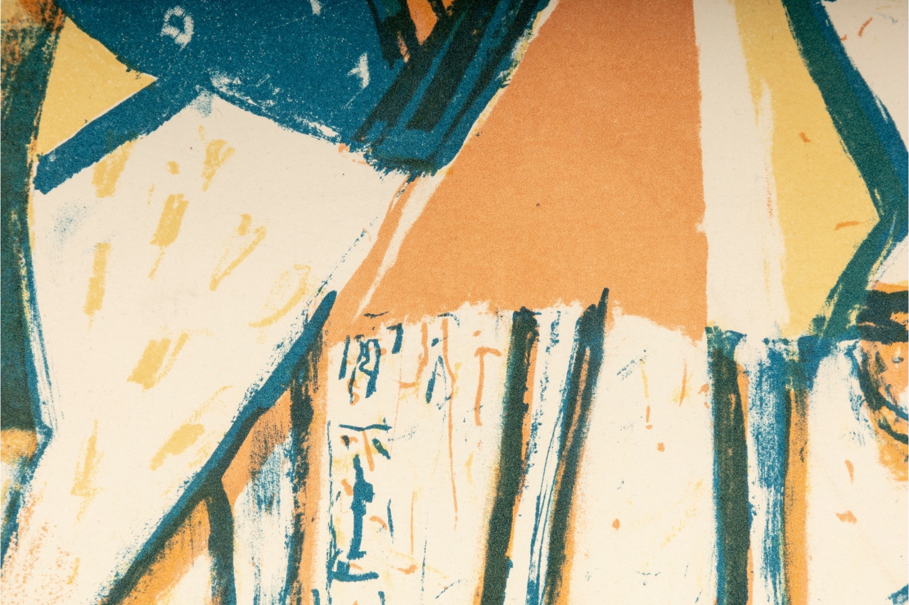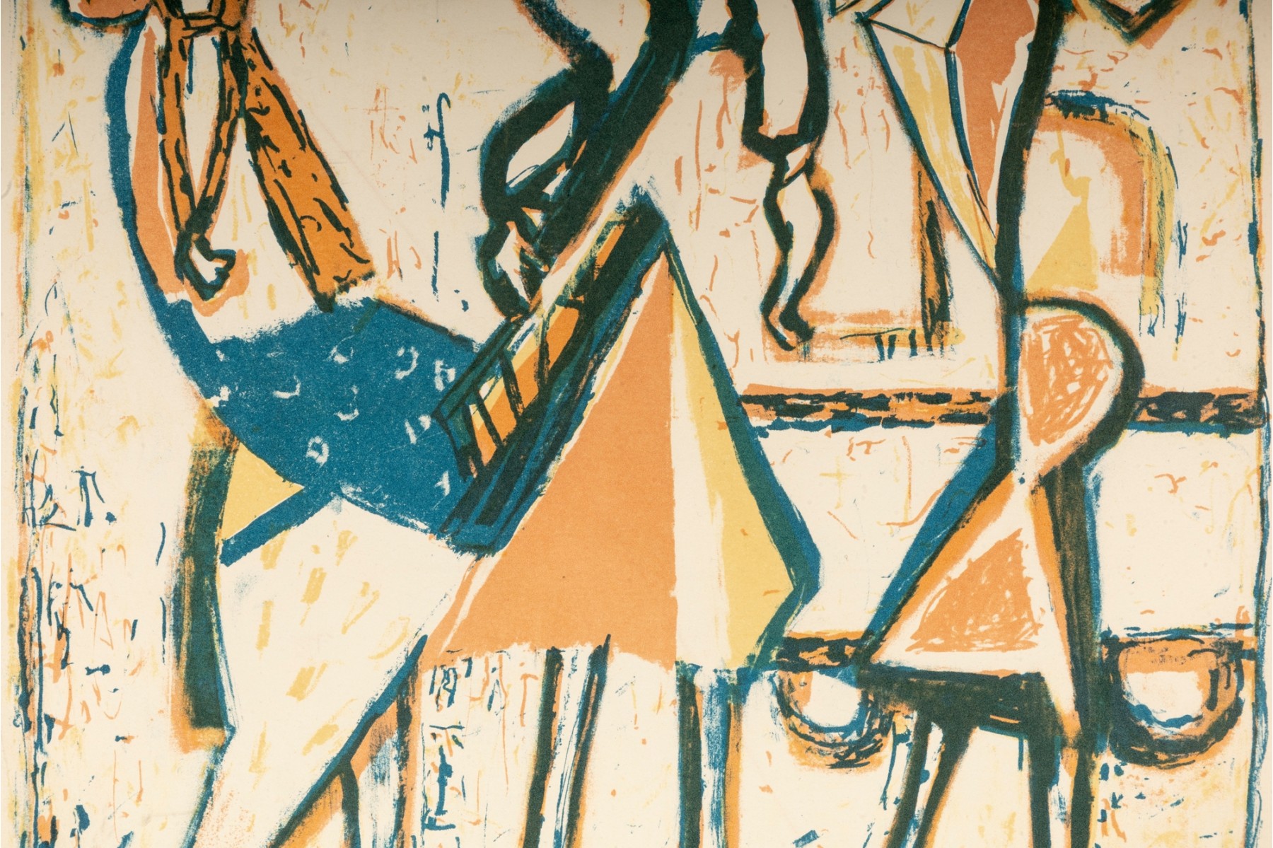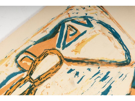 Walter Becker (German, 1883-1985) "Trois Femmes" lithograph depicting three abstract female figures with animalistic heads wearing fashionable outfits with skirts. Beautifully detailed with gestural linework and rendered in vibrant orange, blue, and yellow. Pencil signed and dated '53 lower right, numbered 115/200 lower left. Presented loose, unframed.