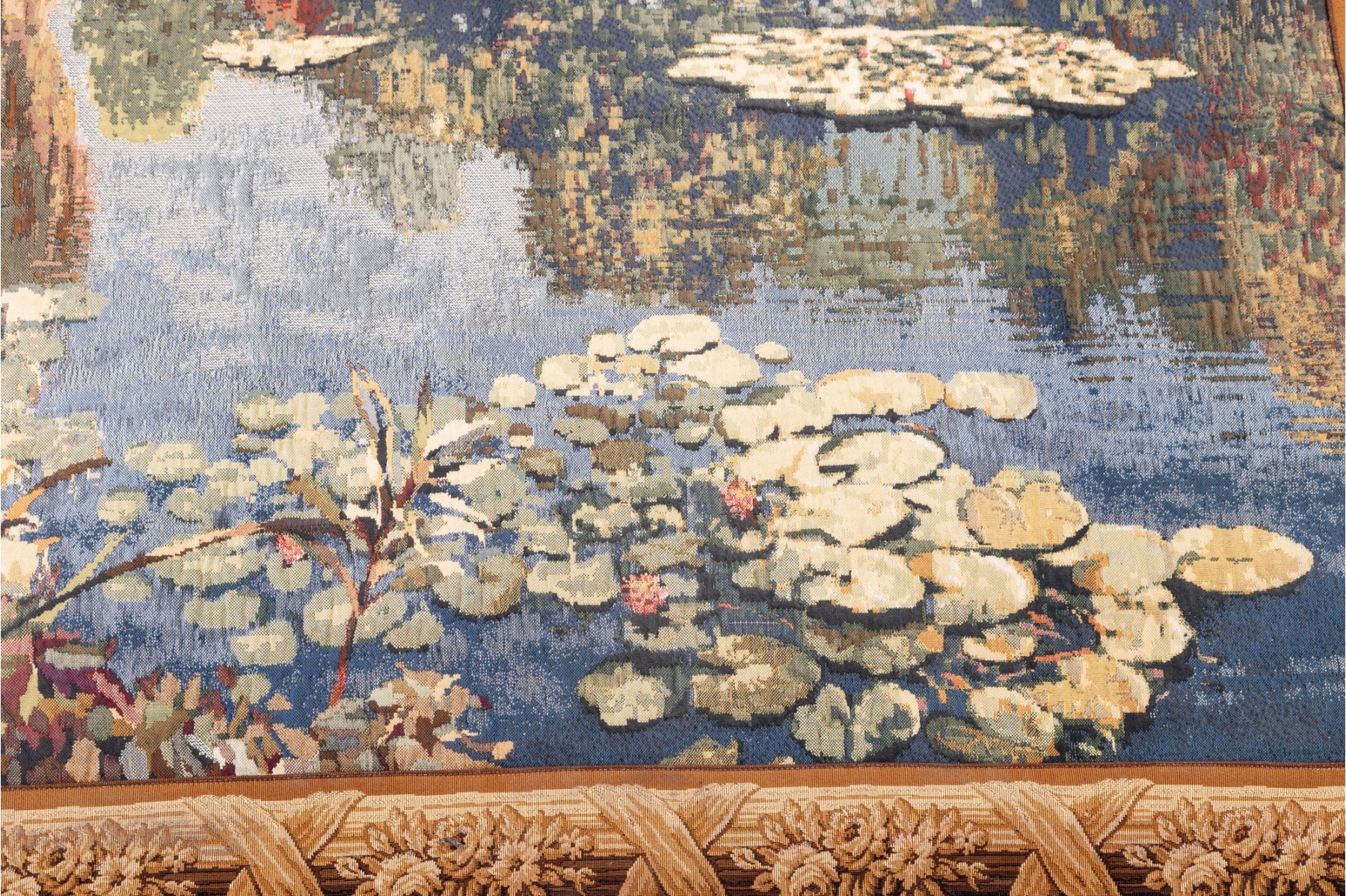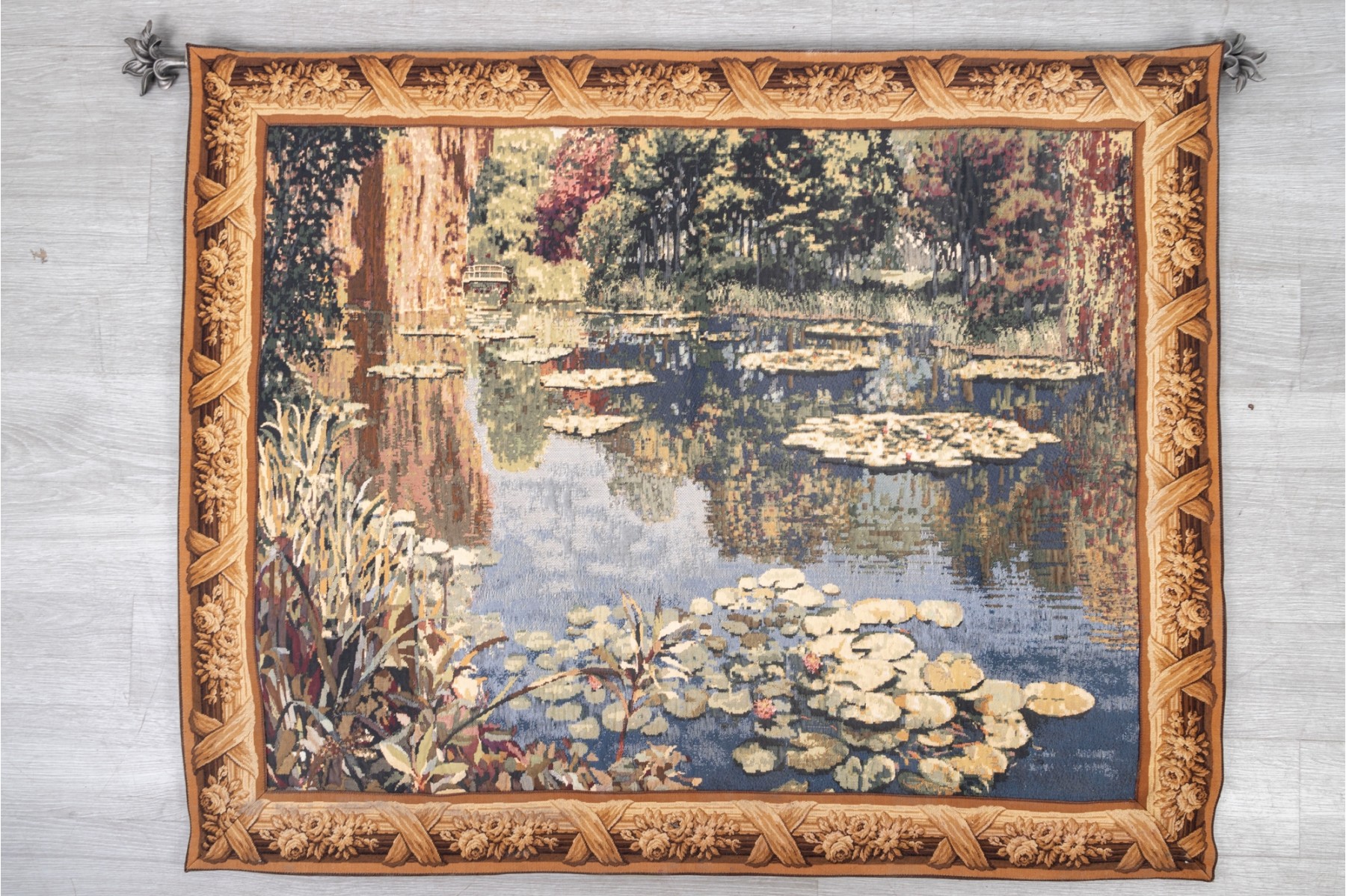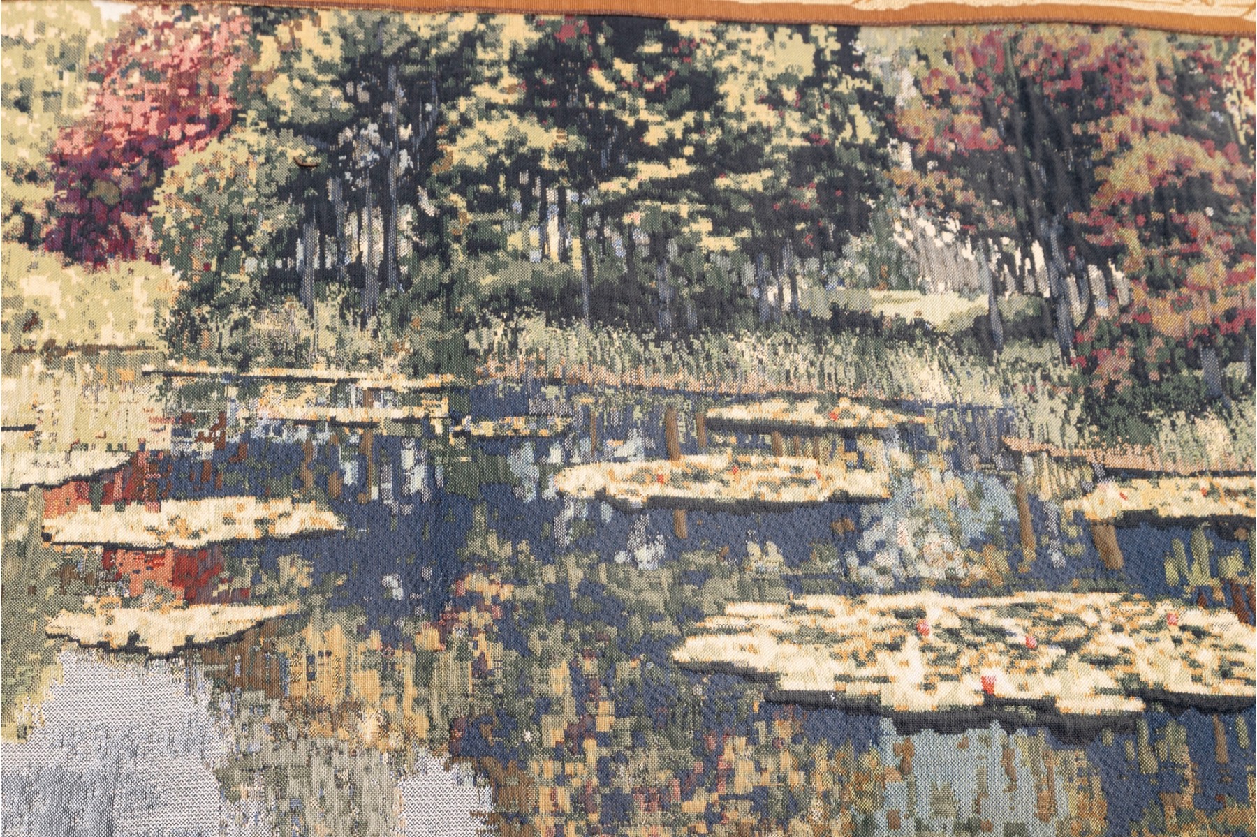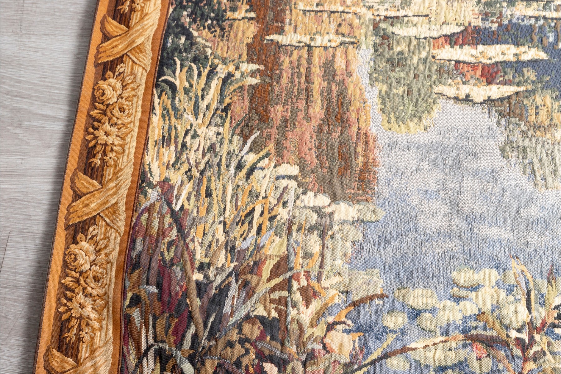 A gorgeous Belgian tapestry of Lake Giverny showcasing calm water reflecting vibrant autumnal foliage overlaid with lily pads. The scene is surrounded by a brown border of florals alternating with crossed X-motifs. Includes a gray pole for hanging finished with foliate finials.
