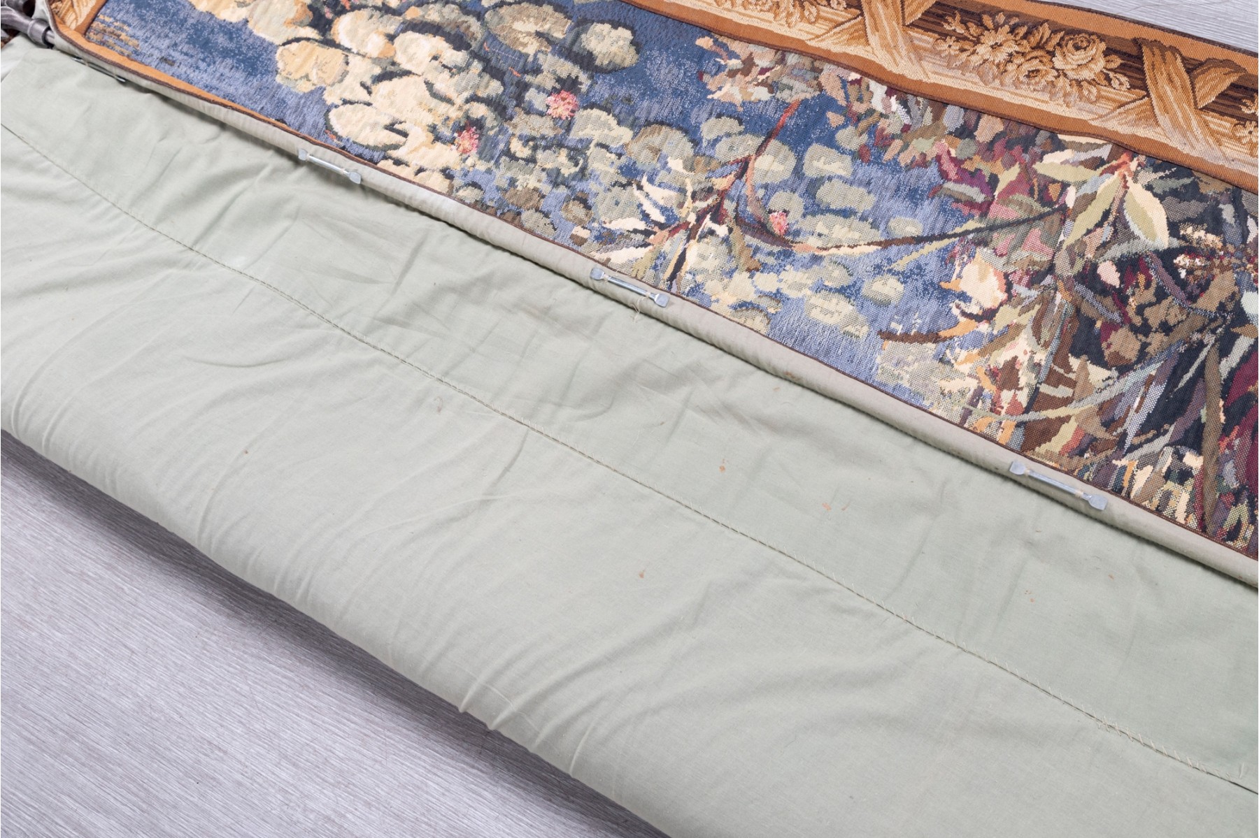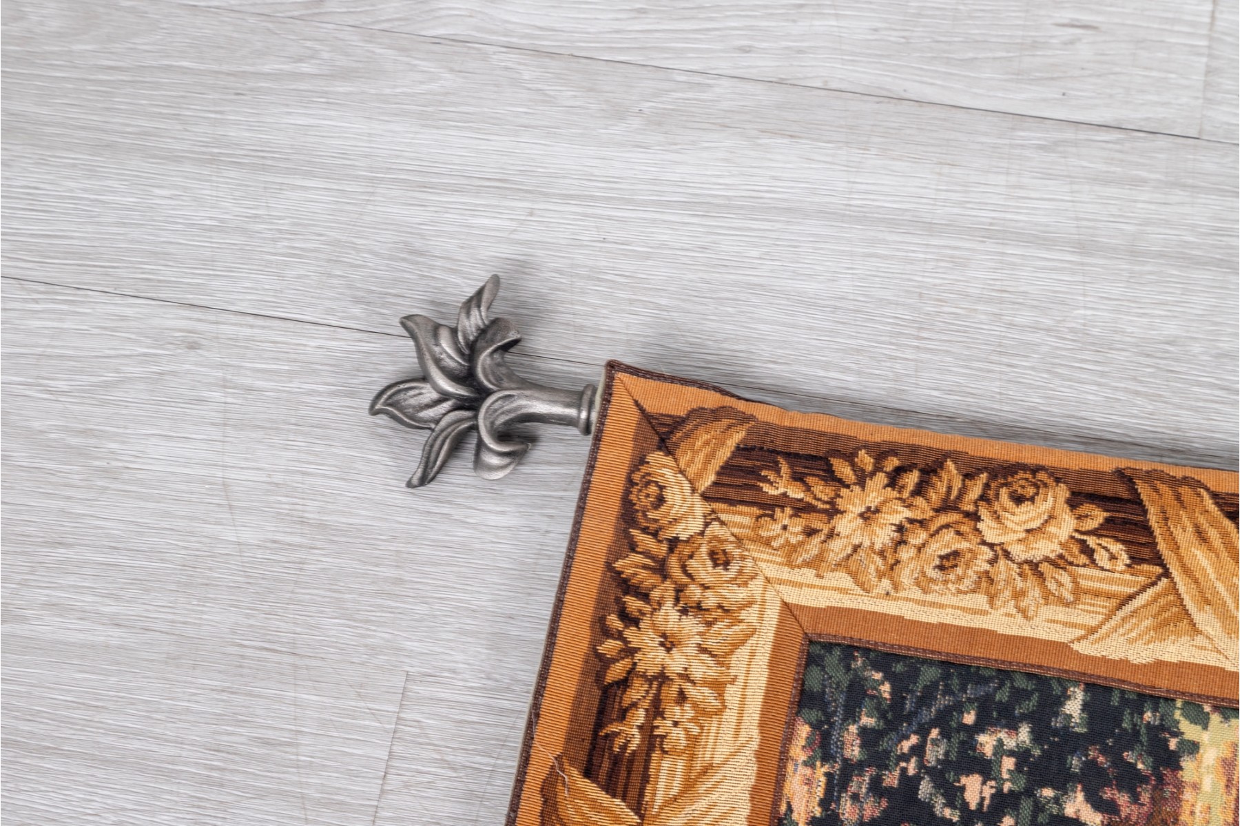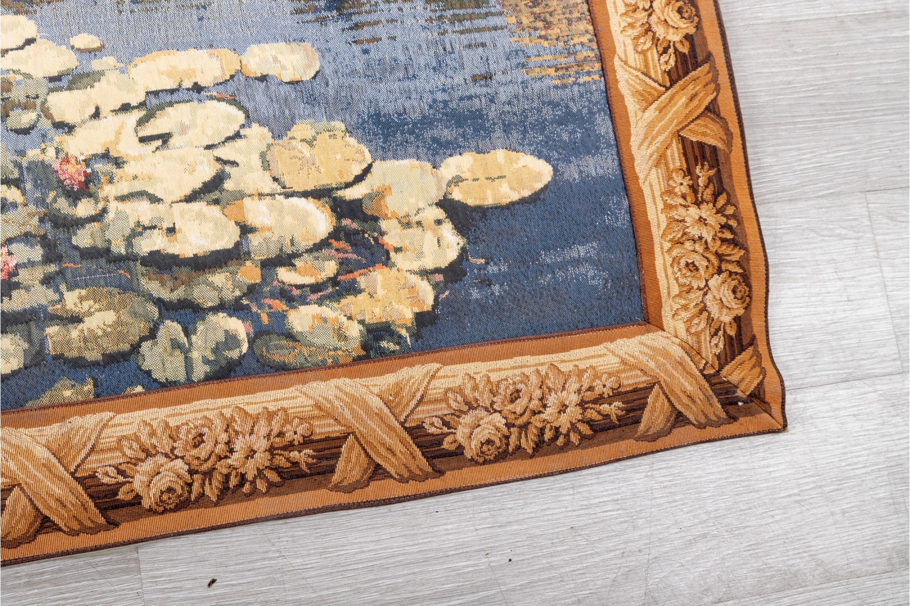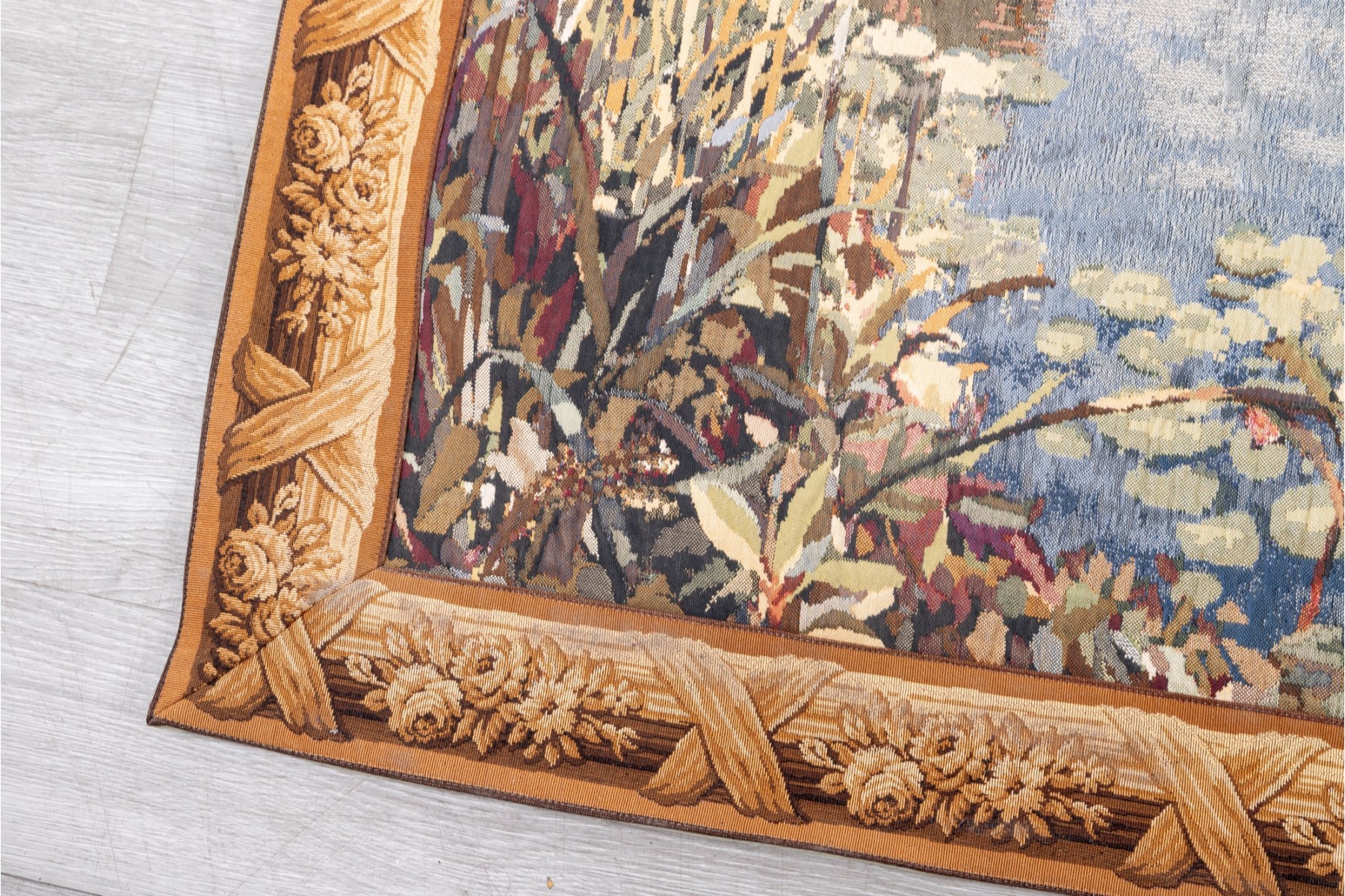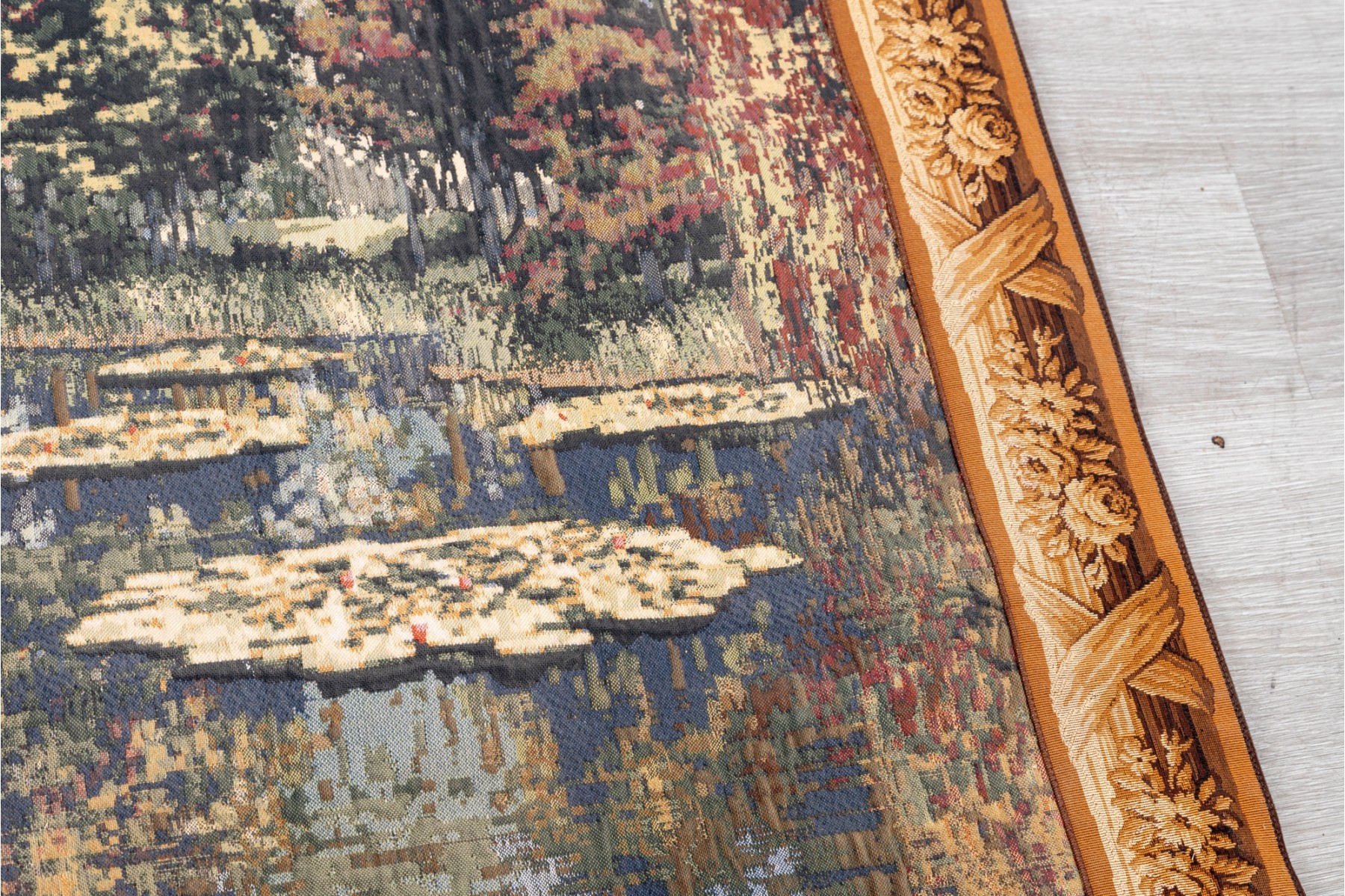 A gorgeous Belgian tapestry of Lake Giverny showcasing calm water reflecting vibrant autumnal foliage overlaid with lily pads. The scene is surrounded by a brown border of florals alternating with crossed X-motifs. Includes a gray pole for hanging finished with foliate finials.