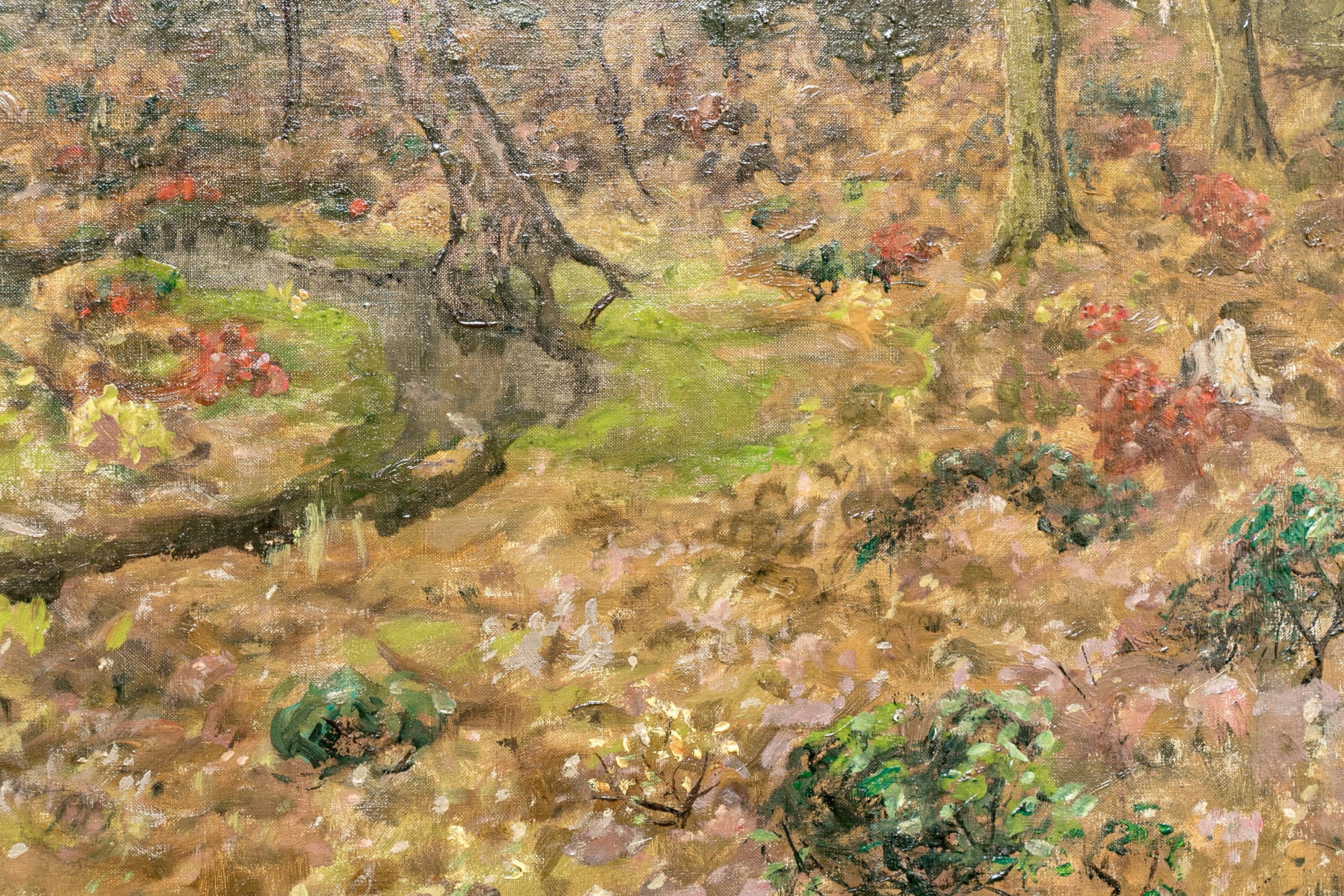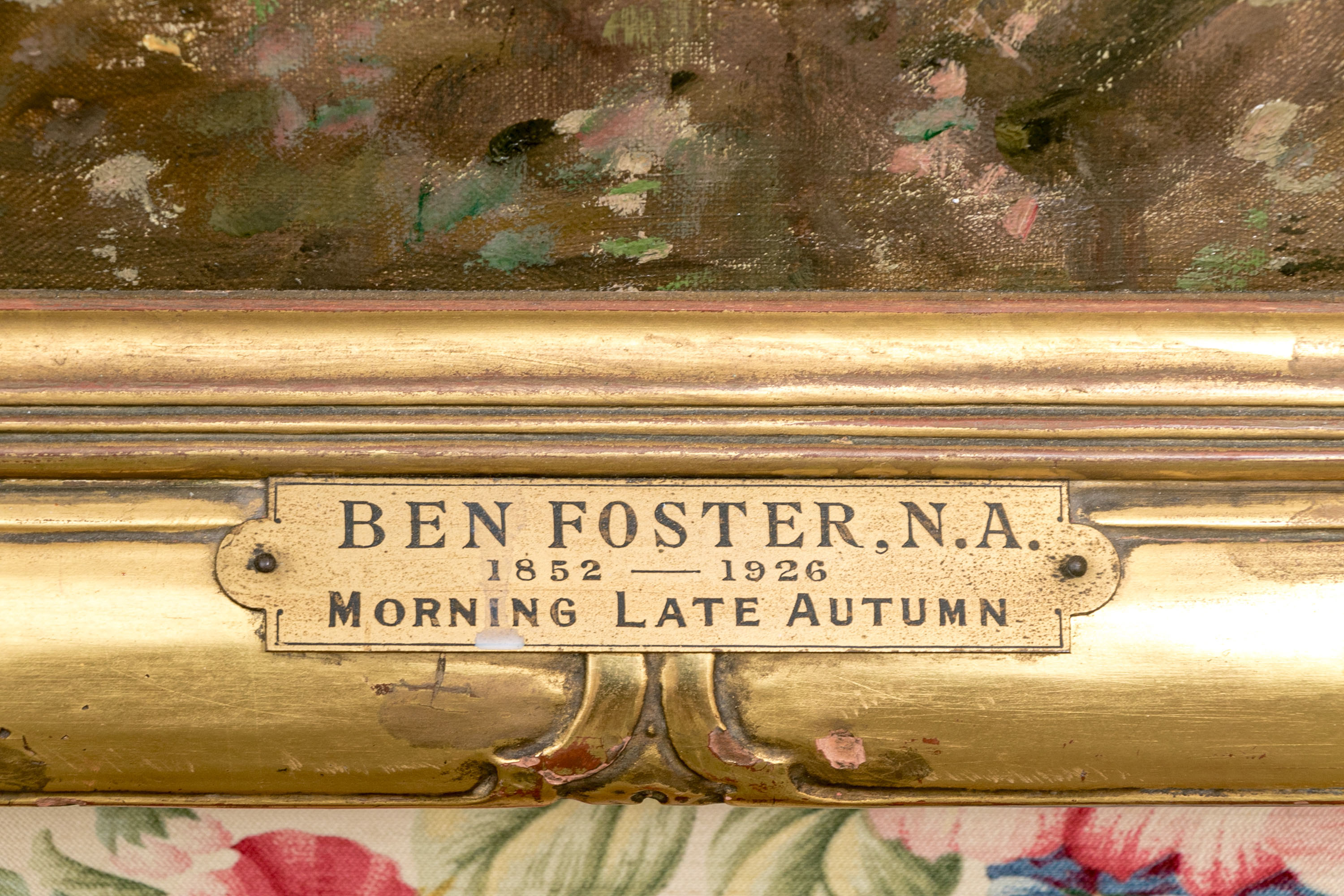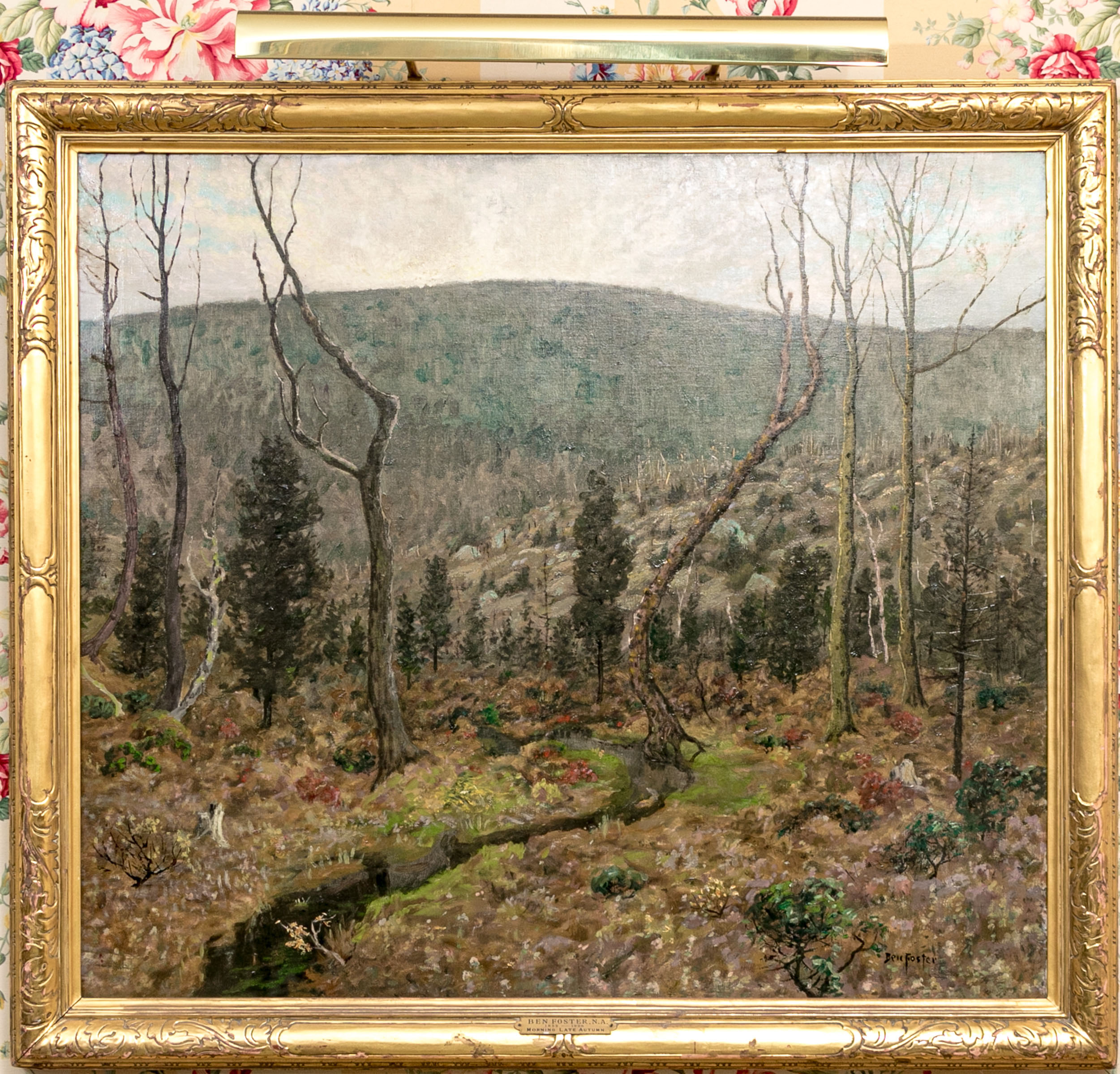 Ben Foster (American, 1852-1926) "Morning Late Autumn" oil on canvas depicting a tonalist landscape with a winding creek bisecting a field with lush brown foliage dotted with vibrant red and green tufts. A forest stretches along a hill on the horizon, displaying a mixture of bare branched and dark green canopied trees. Signed lower right.