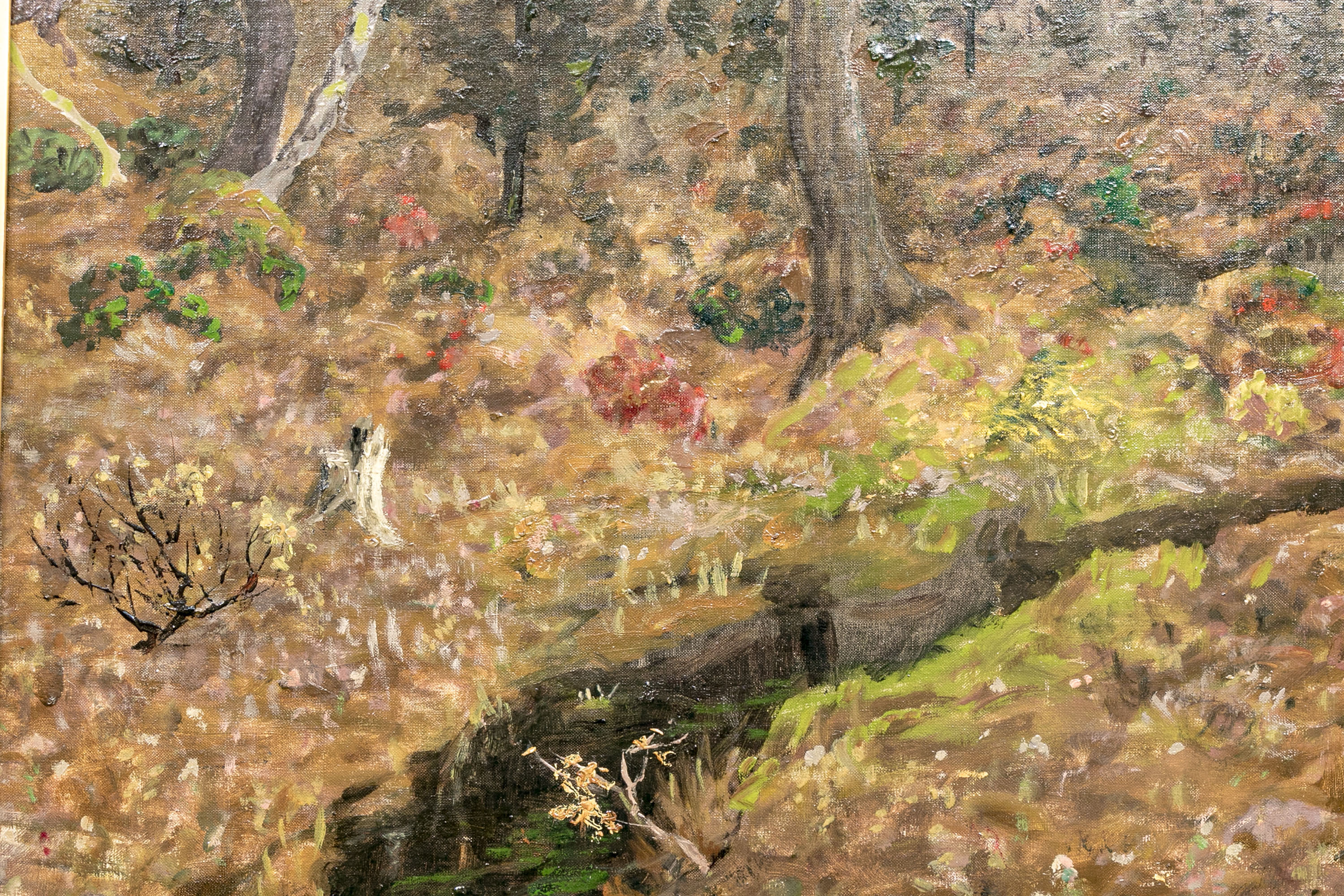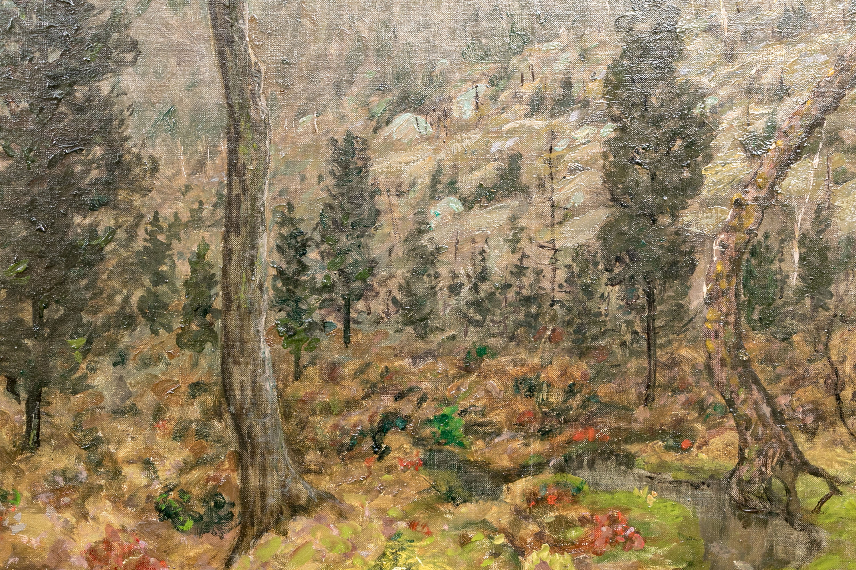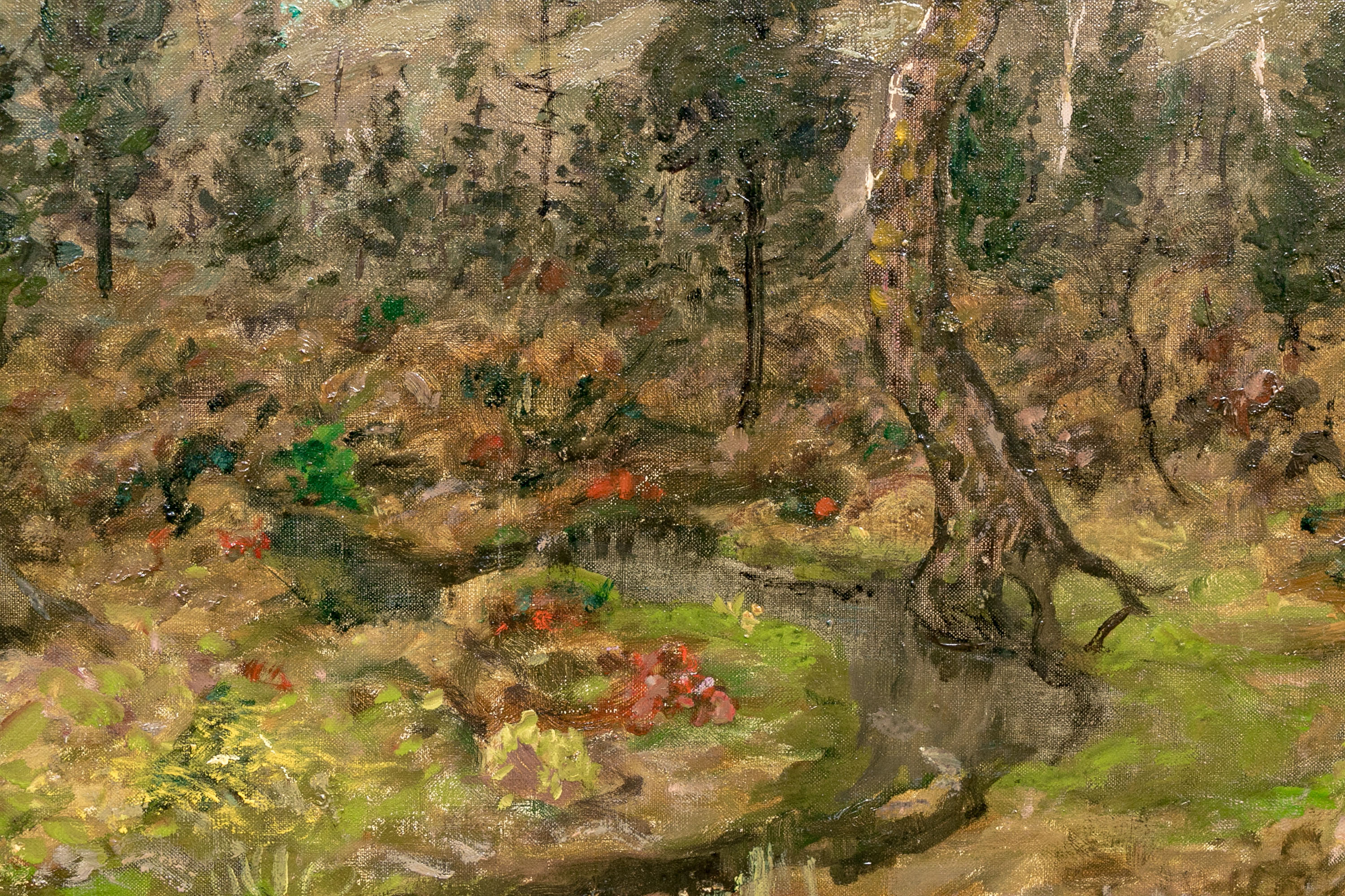 Ben Foster (American, 1852-1926) "Morning Late Autumn" oil on canvas depicting a tonalist landscape with a winding creek bisecting a field with lush brown foliage dotted with vibrant red and green tufts. A forest stretches along a hill on the horizon, displaying a mixture of bare branched and dark green canopied trees. Signed lower right.