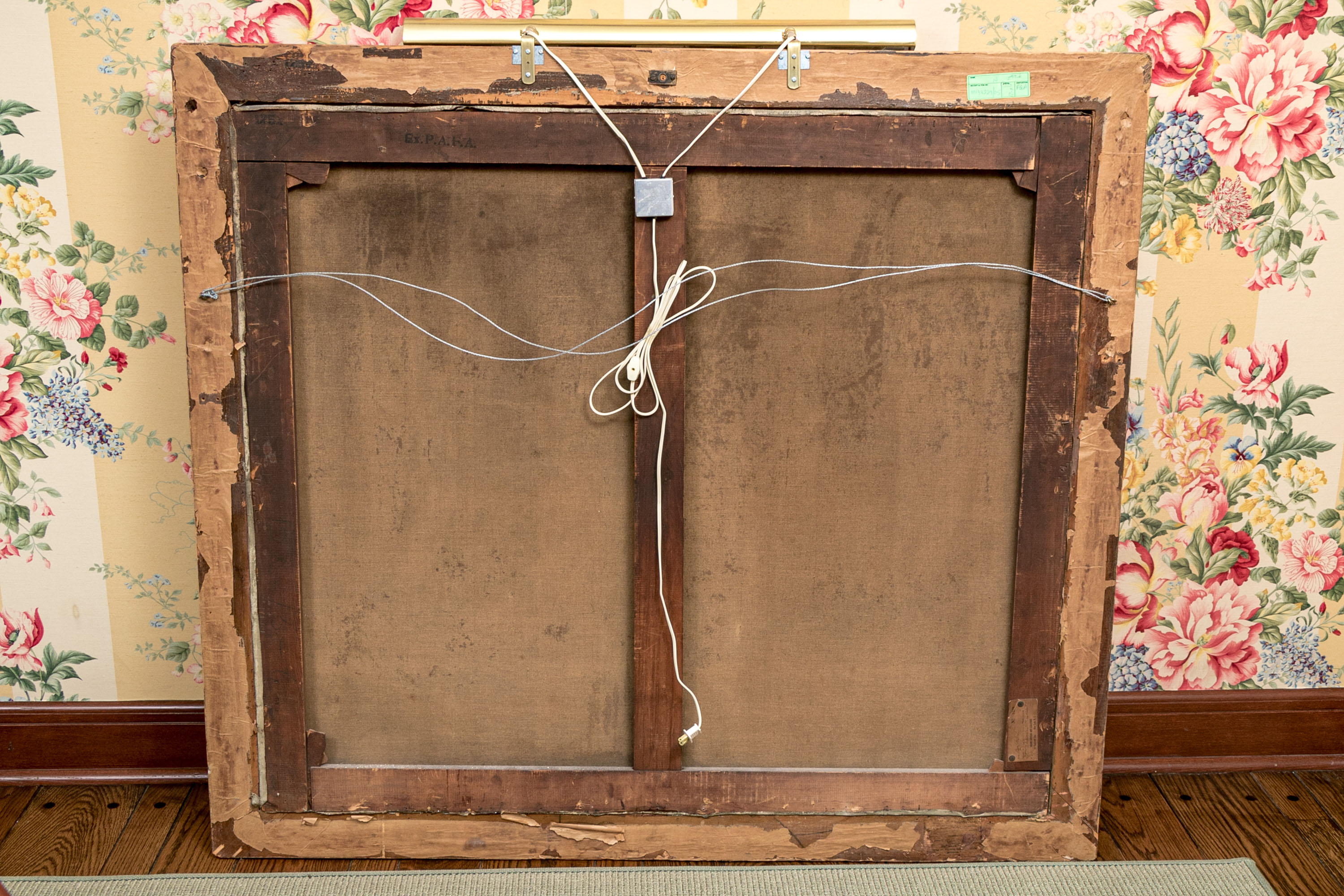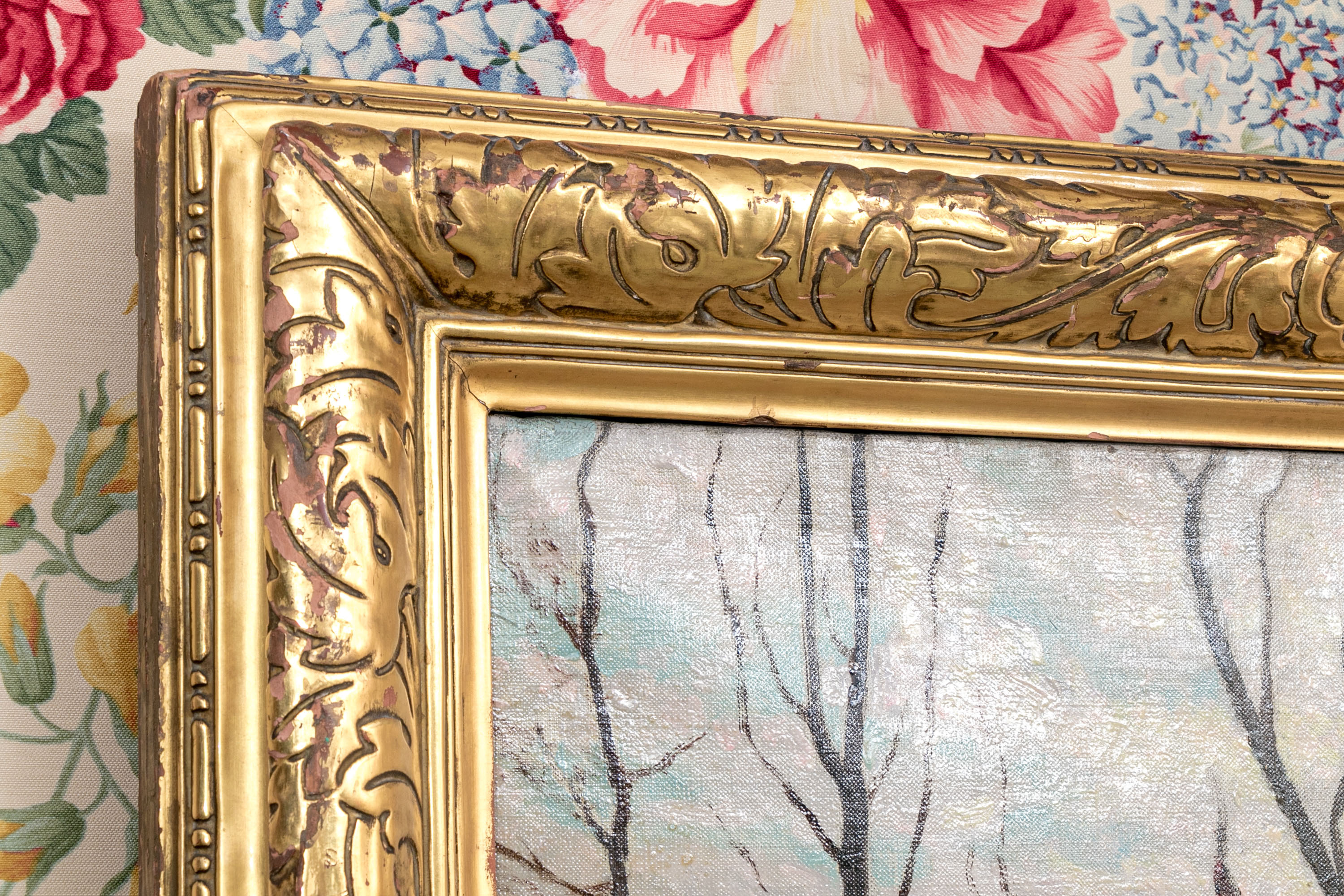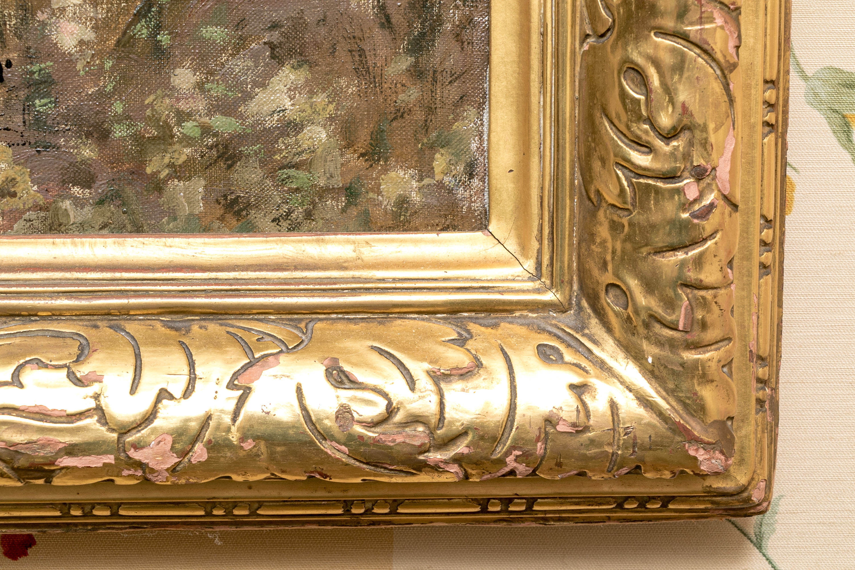 Displayed in a handsome gilt frame with foliate relief at the corners topped with a picture light.