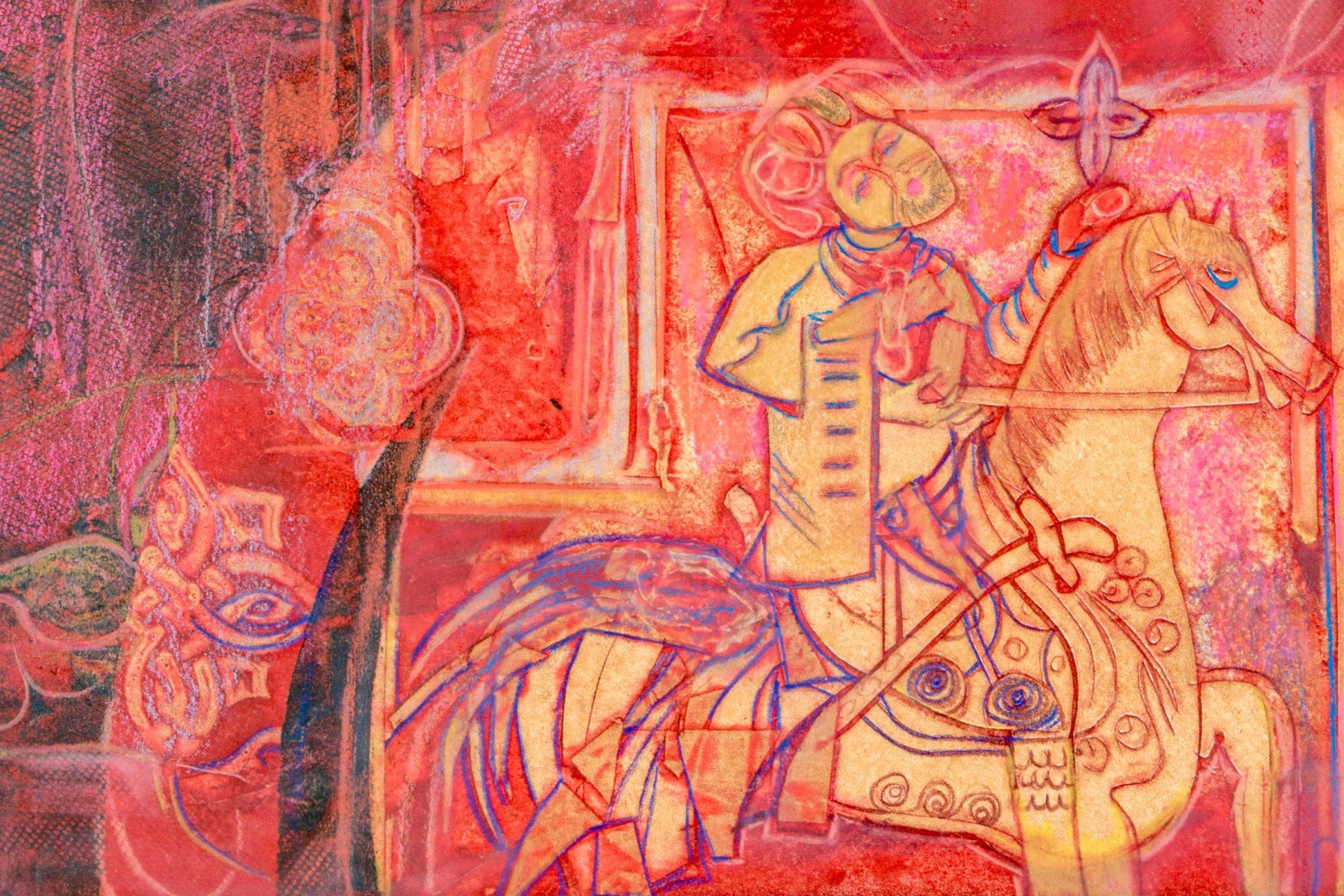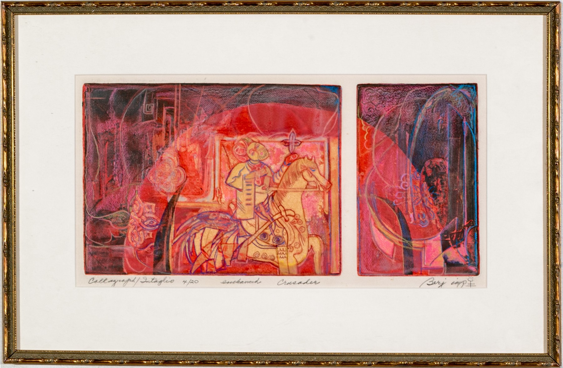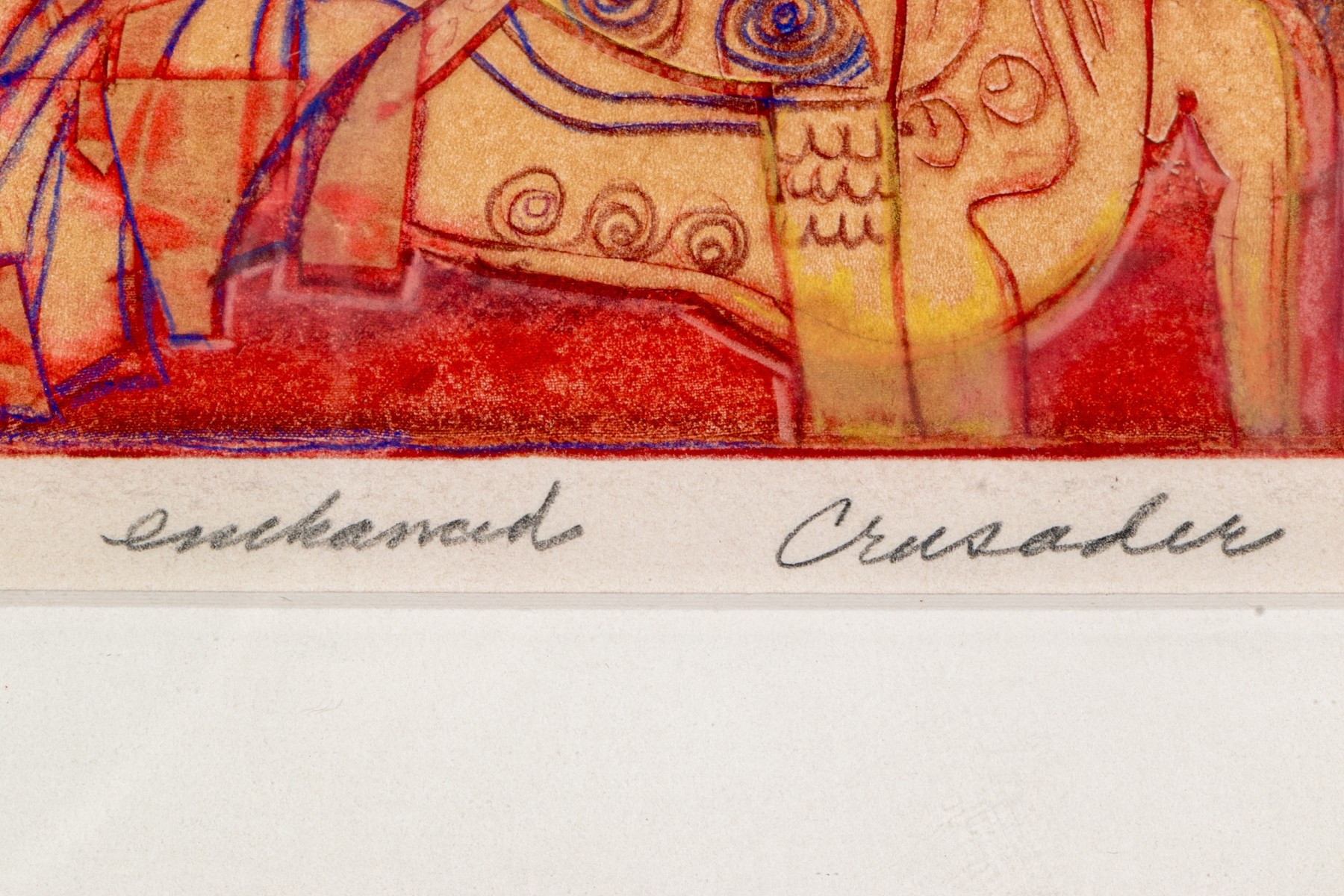 A colorful triptych artwork featuring a crusader on horseback approaching an abstract entity at the right, both on decorative grounds. Rendered in beautiful, eye-catching detail with vibrant hues in red, yellow, and blue. Signed imp. lower right, labeled collagraph/intaglio and numbered "4/20 enhanced" lower left, and titled "Crusader" lower center.