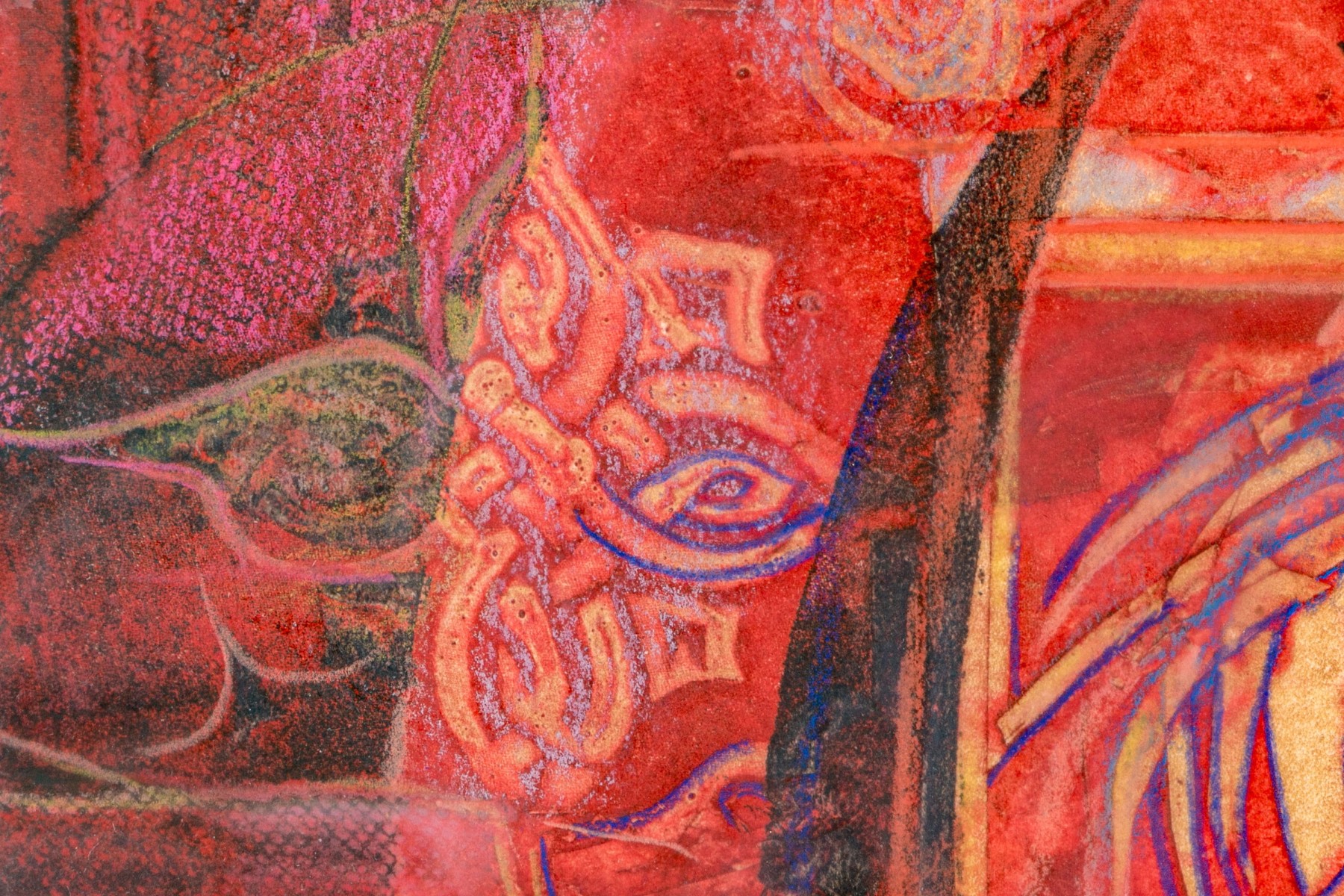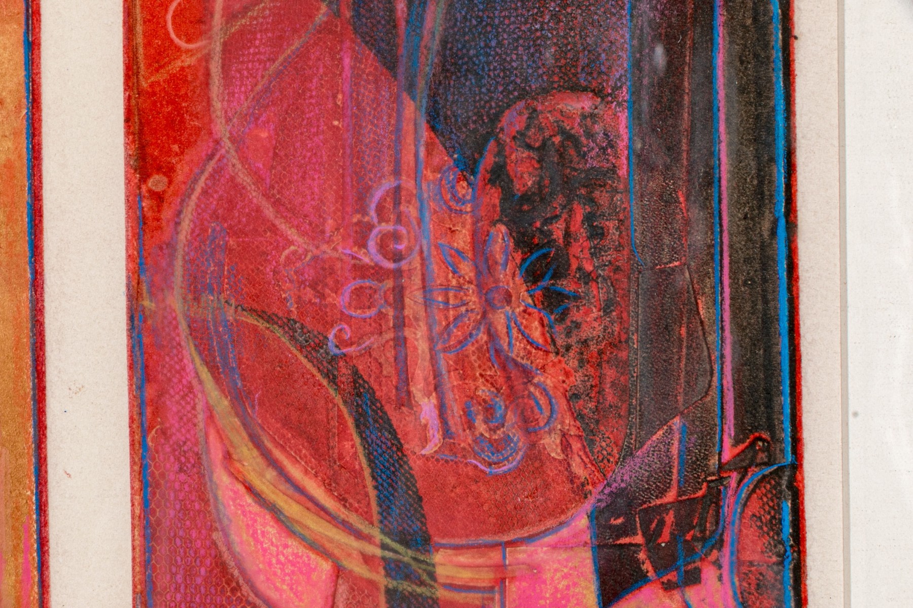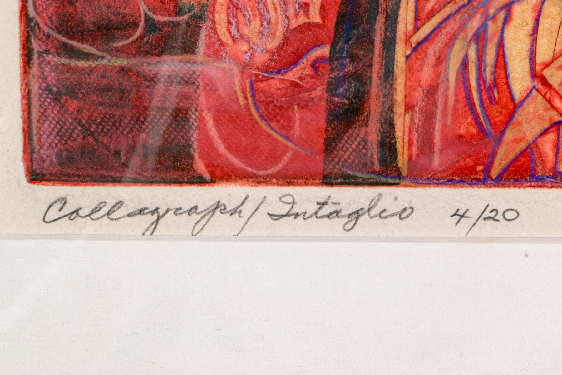 A colorful triptych artwork featuring a crusader on horseback approaching an abstract entity at the right, both on decorative grounds. Rendered in beautiful, eye-catching detail with vibrant hues in red, yellow, and blue. Signed imp. lower right, labeled collagraph/intaglio and numbered "4/20 enhanced" lower left, and titled "Crusader" lower center.