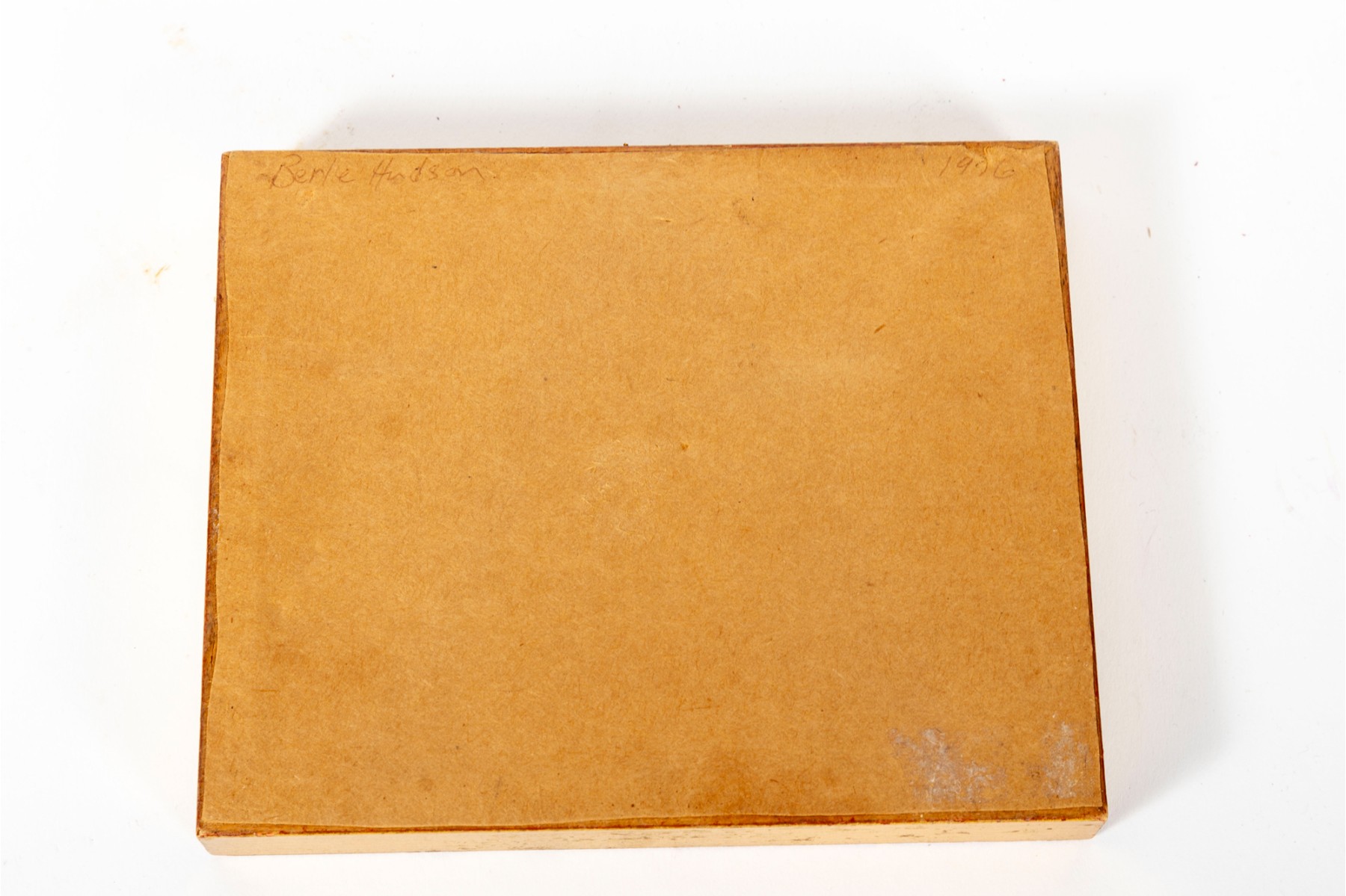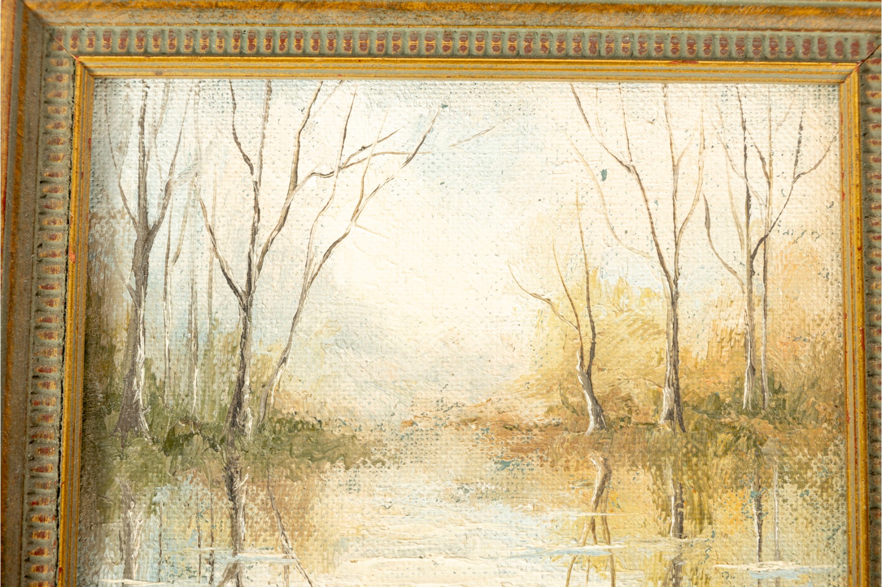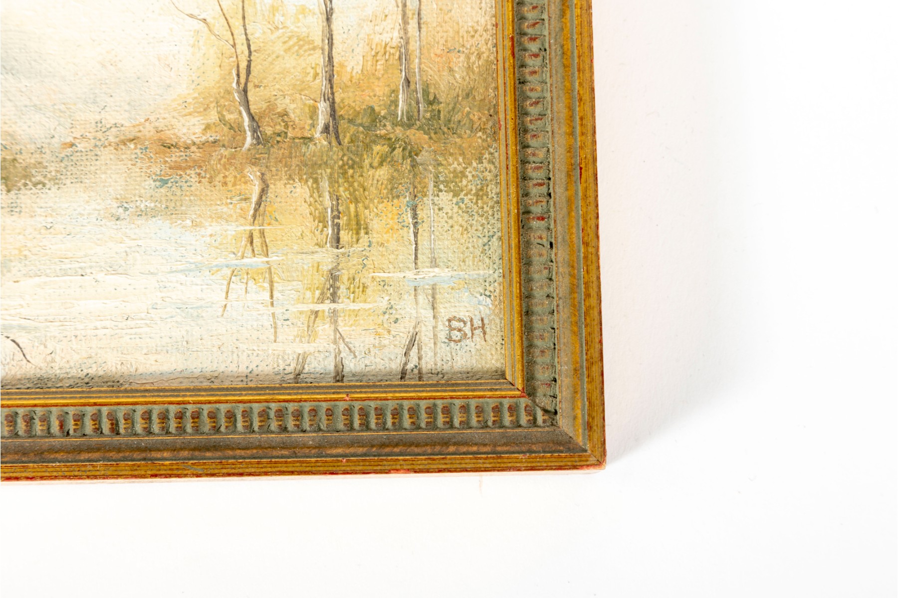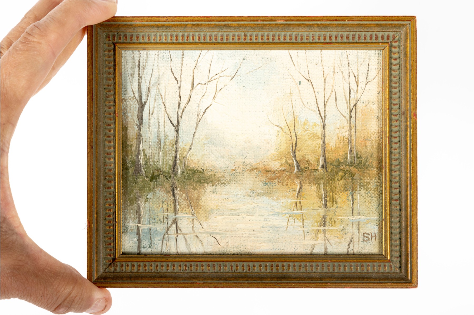 A miniature 6x5" oil on board landscape painting signed by American artist Berle Hudson. His initials reside on the bottom right corner of the painting, but is additionally signed in pencil over the backing paper. The painting is presented openly in an ornate gold-tone wood frame.