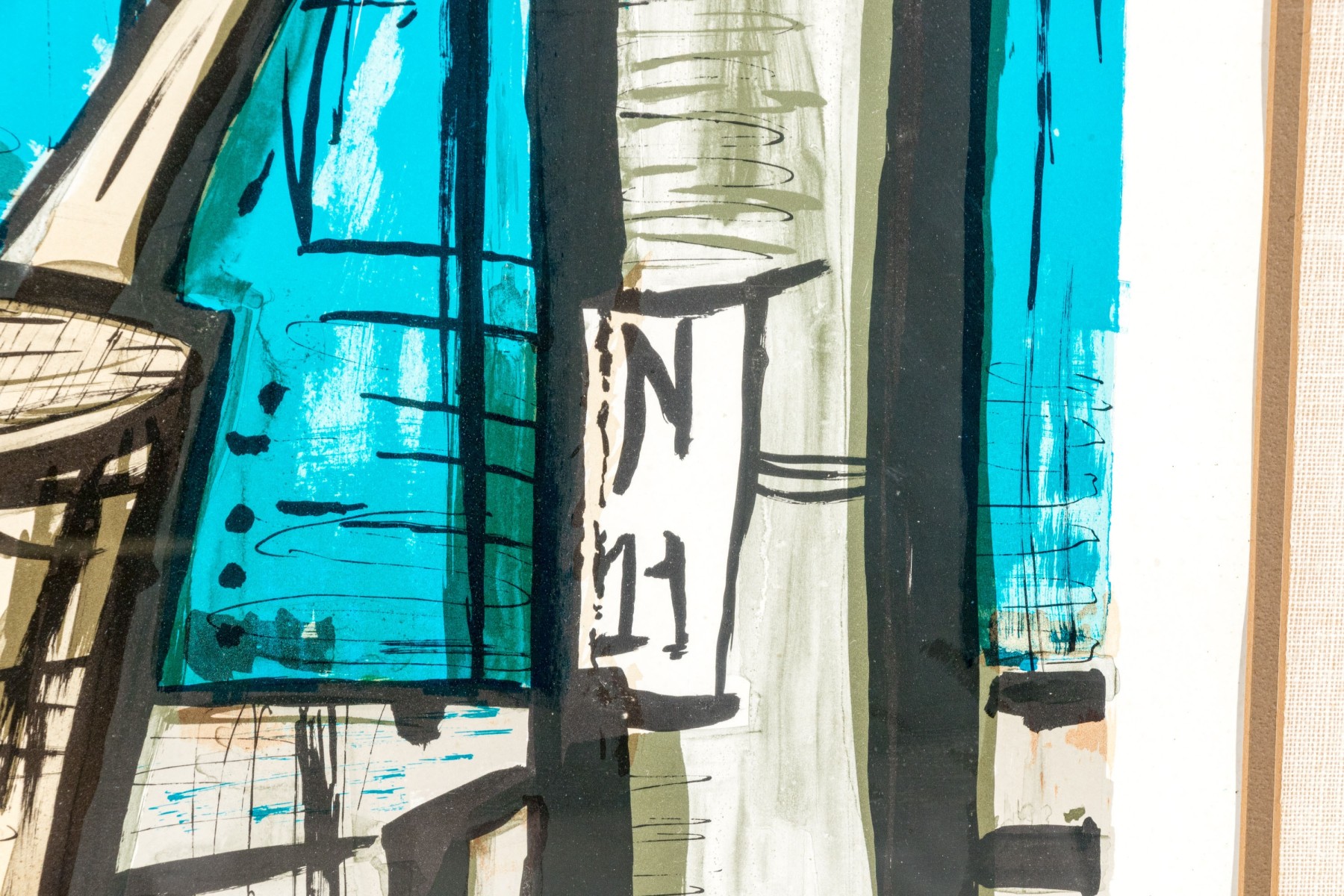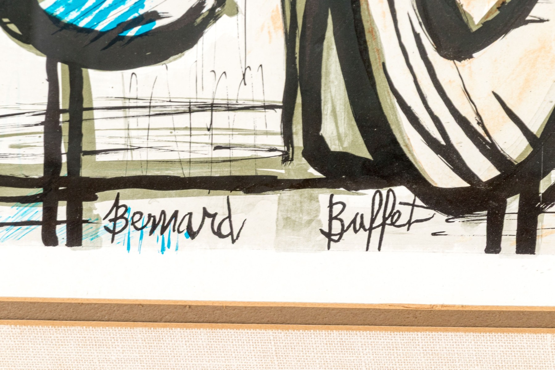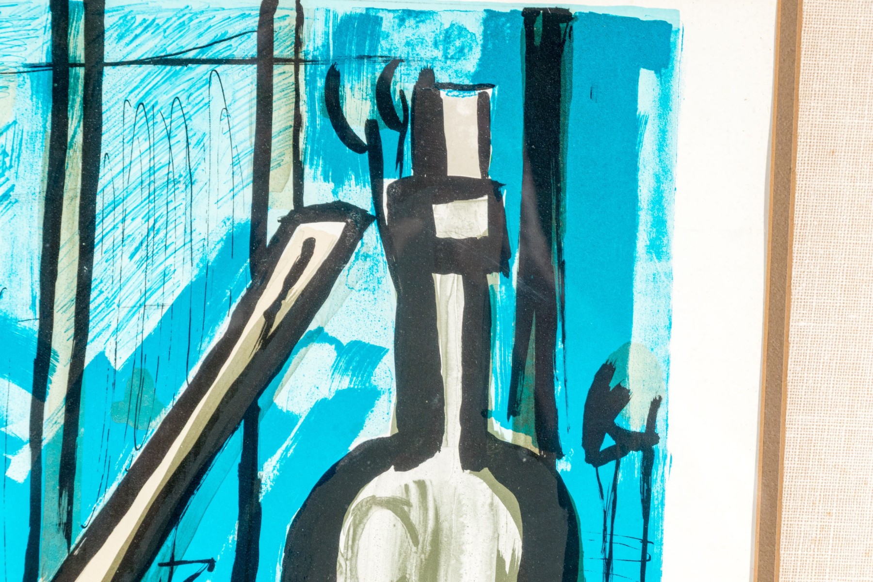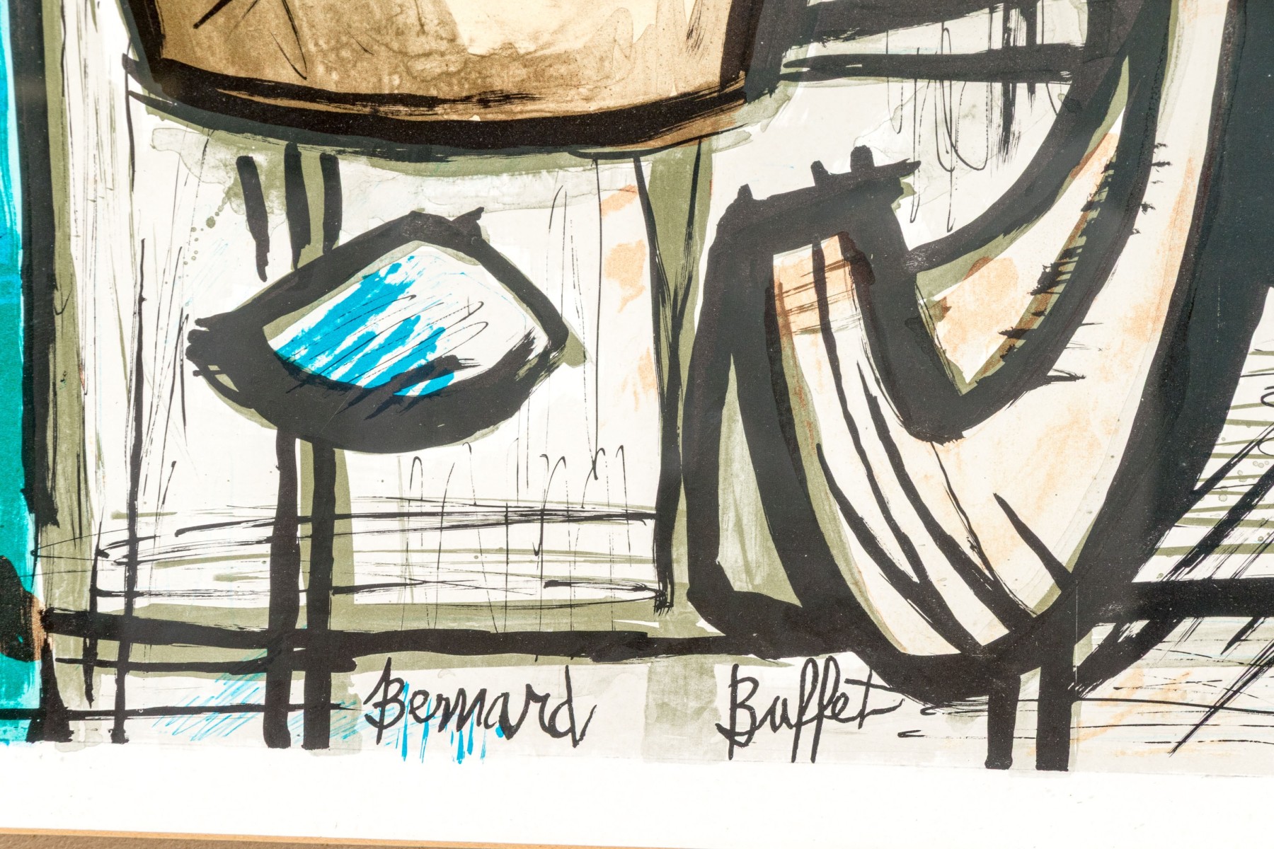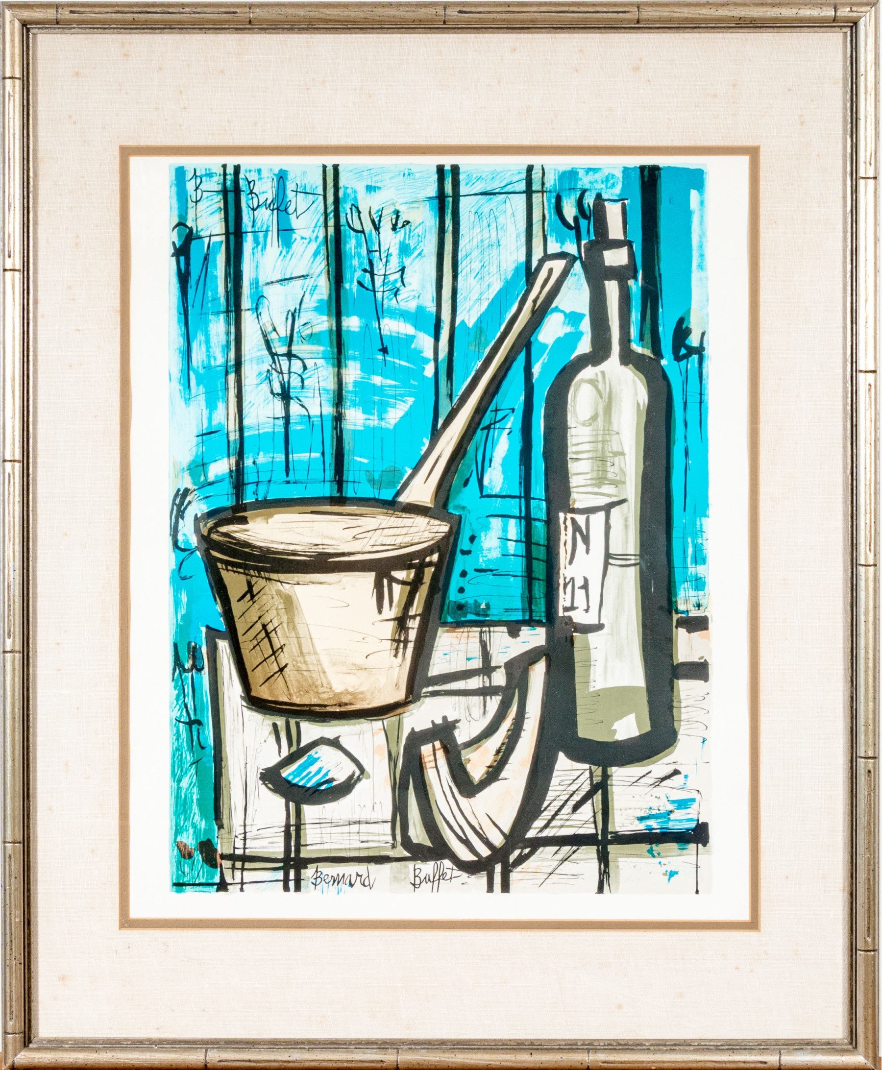 Signed in plate lower center. Depicting a bottle of wine and cooking pot on stove. Custom matted and framed. Dimensions: 24 x 19 1/2" W