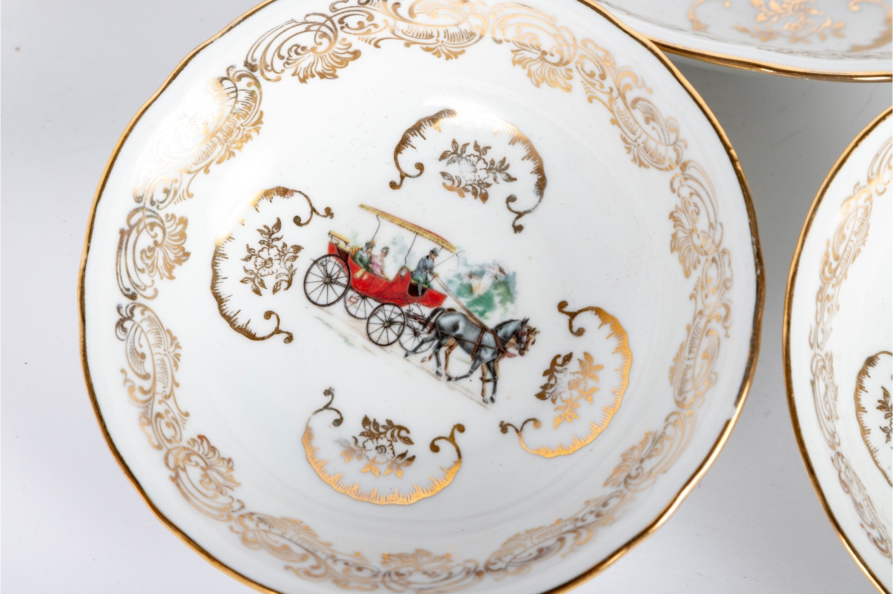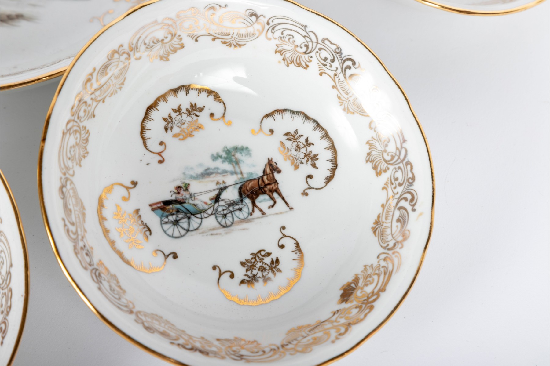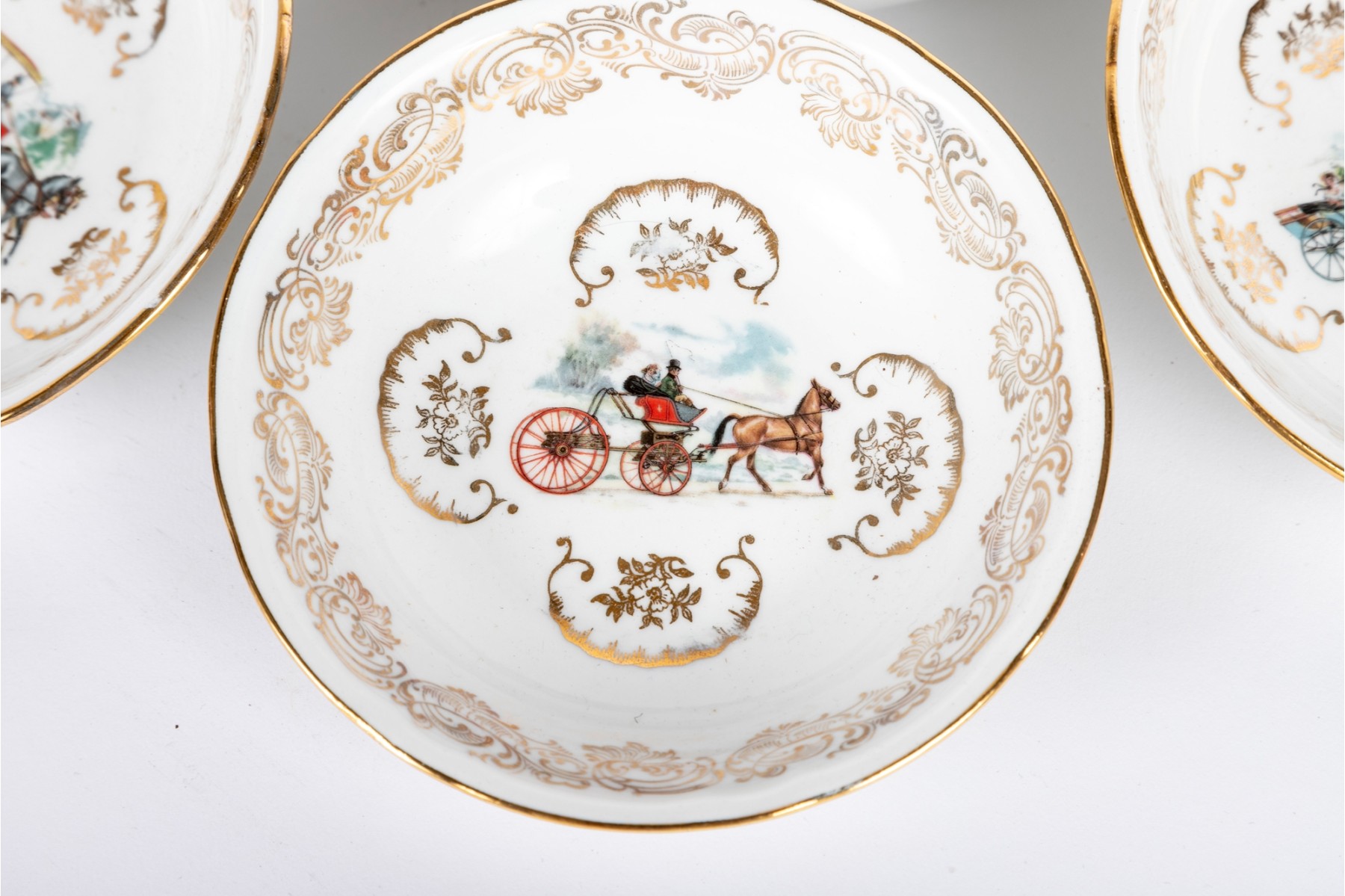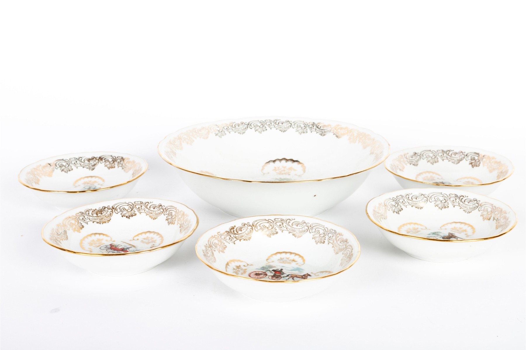 A set of Berry Haute porcelains -- bowls with gold trim representing elegant 19th century carriages and elegant couples and carriage scenes.
